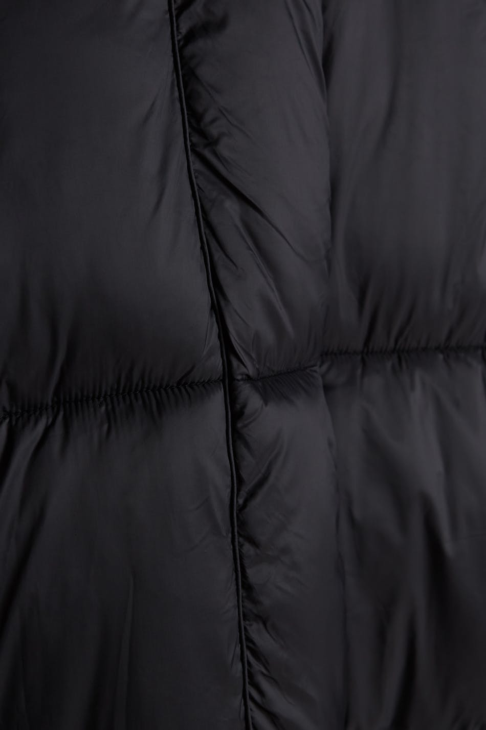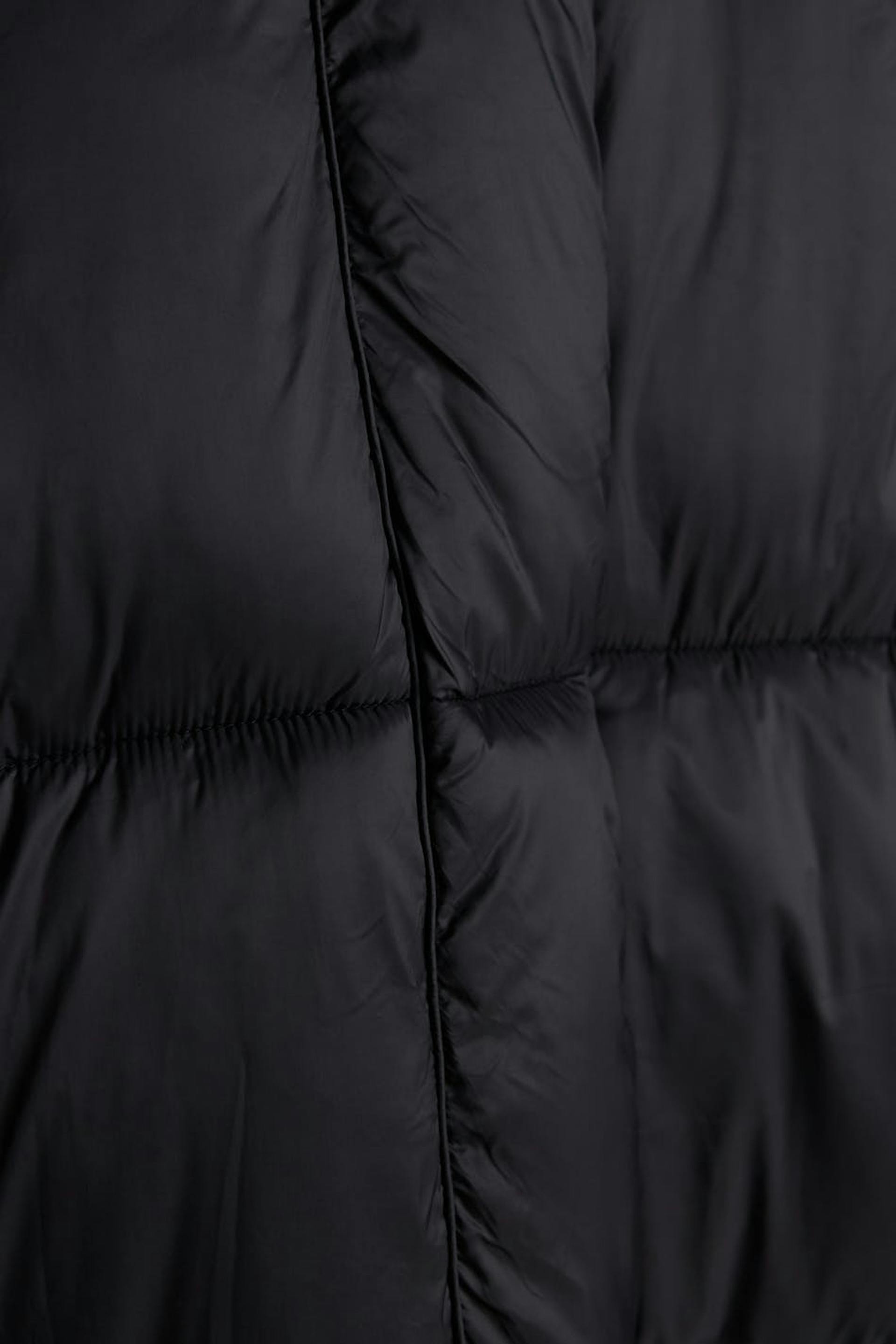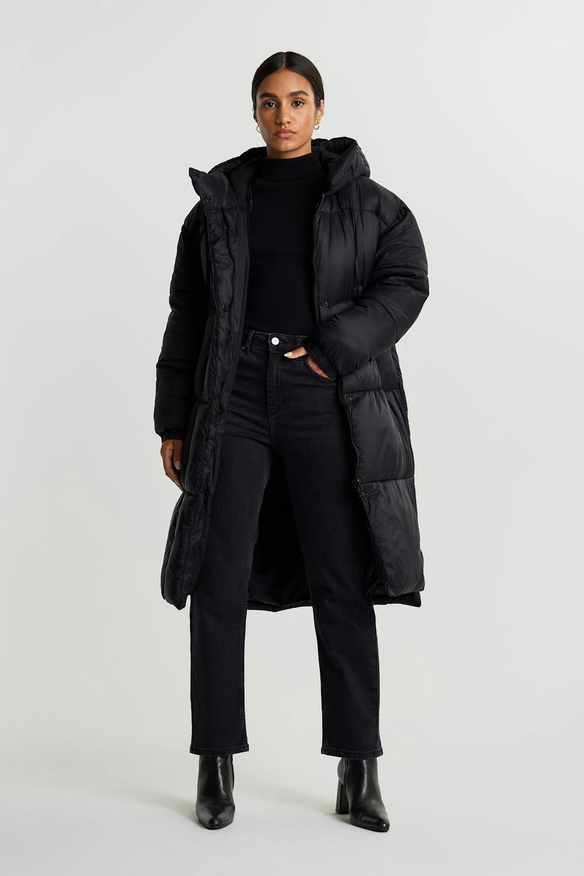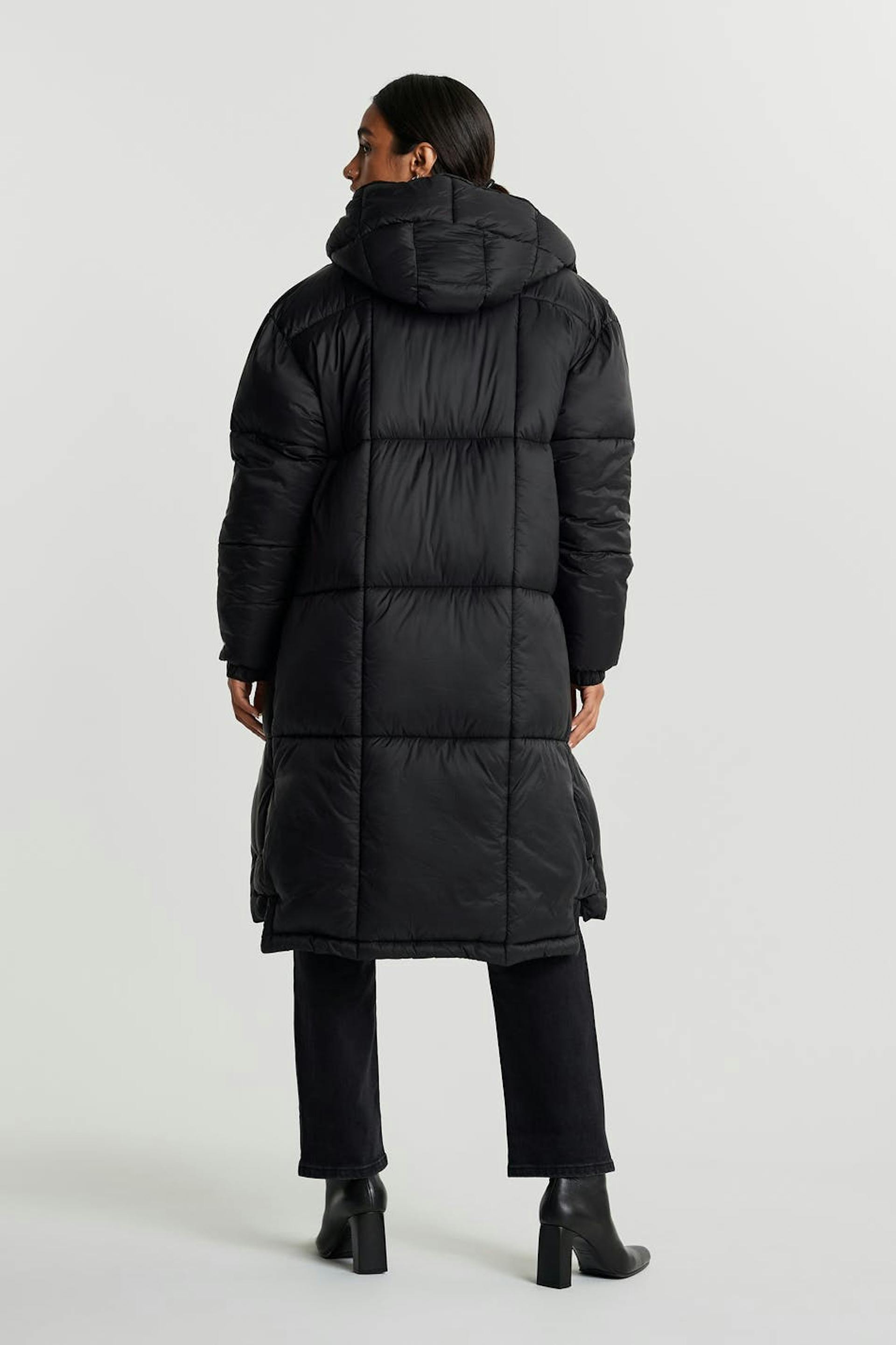 Long coat with a puffer model. The coat is black and has a non removable hood with a drawstring. It has pockets on the sides, an elastic band on the sleeve ends and buttons on the sides and to the neck.
