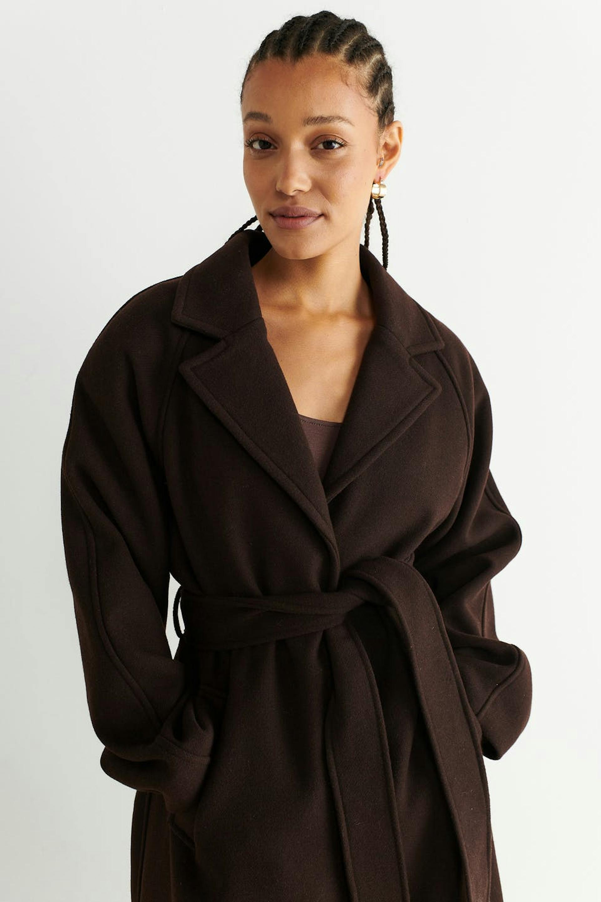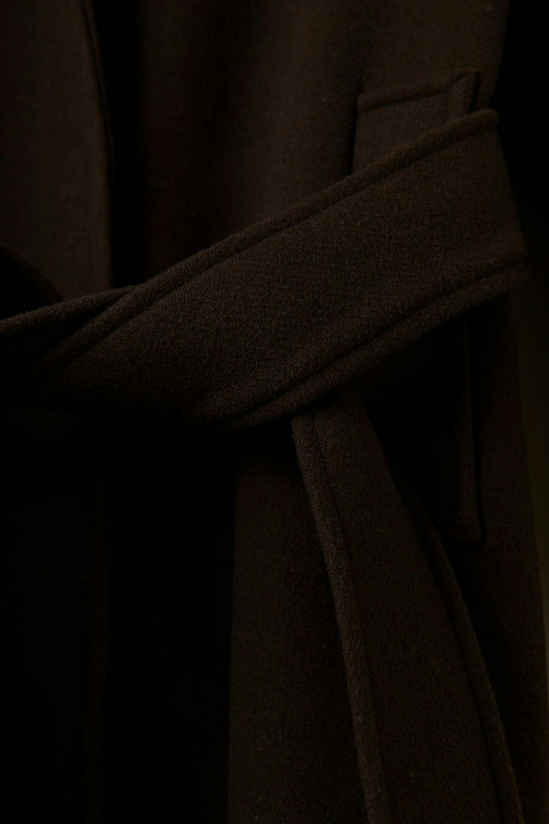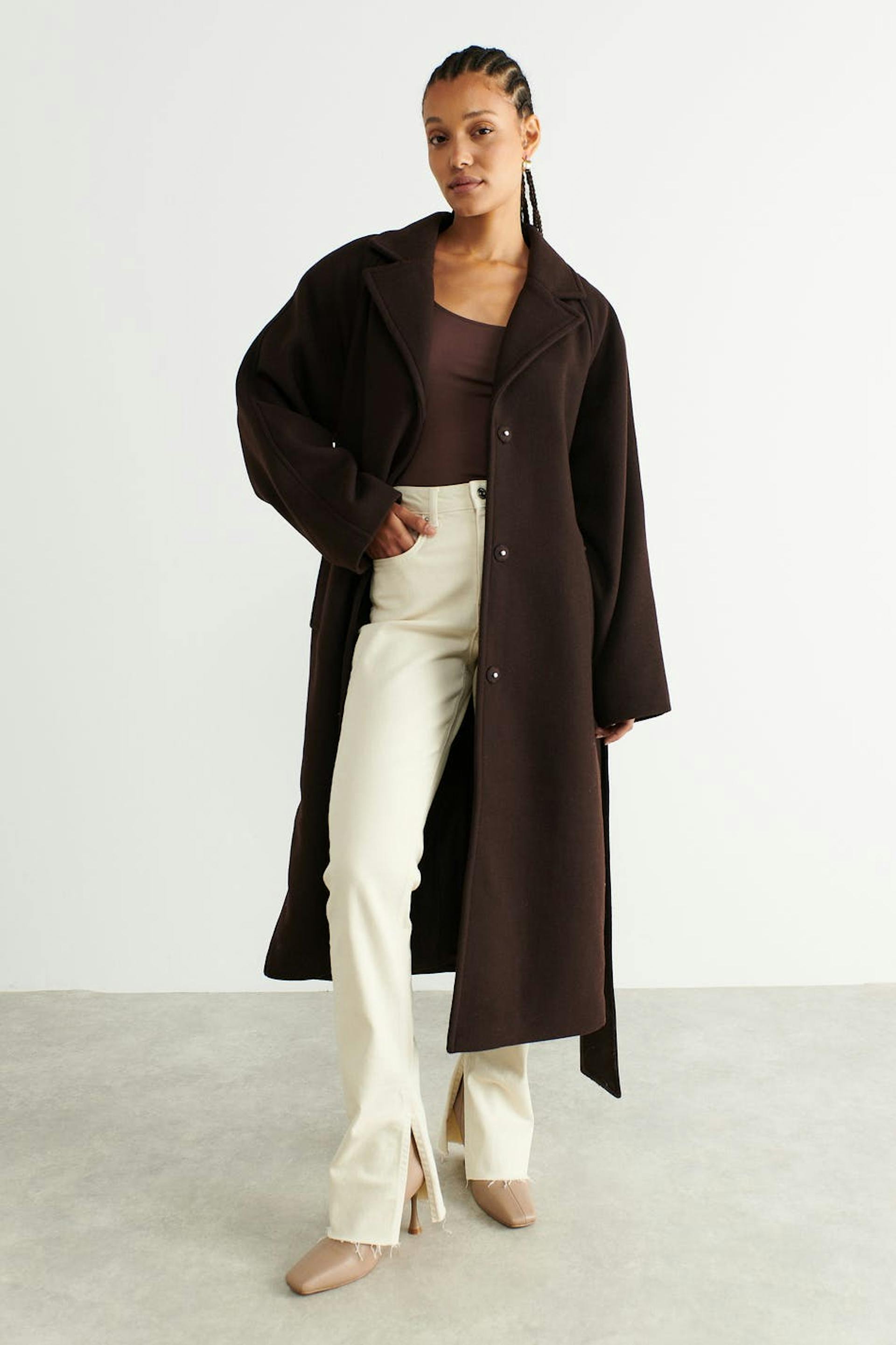 Straight coat with belt tie at the waist. The coat is brown and has relaxed fit. It has concealed snap fastener in front, pockets in the sides, collar with lapels and midi length.