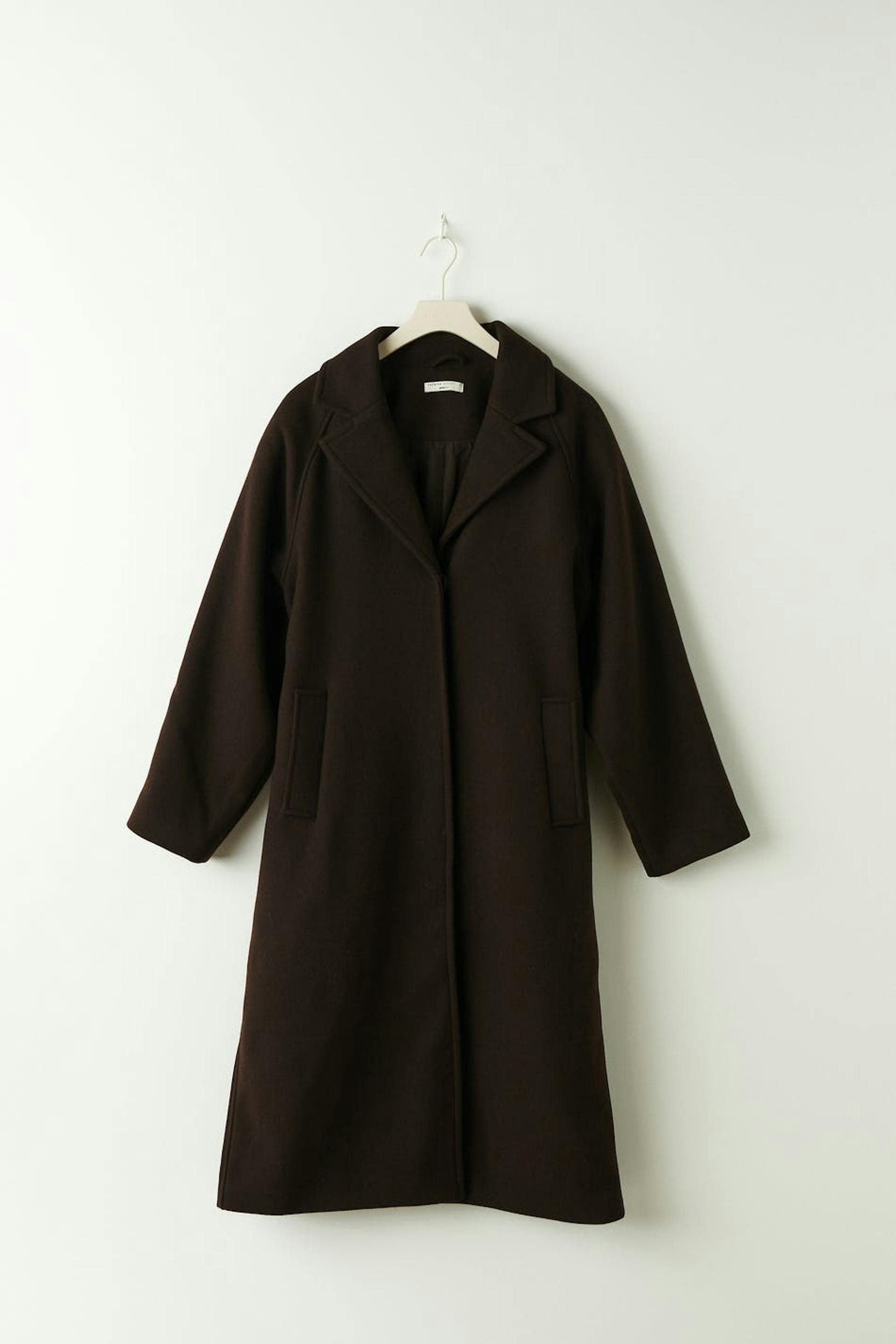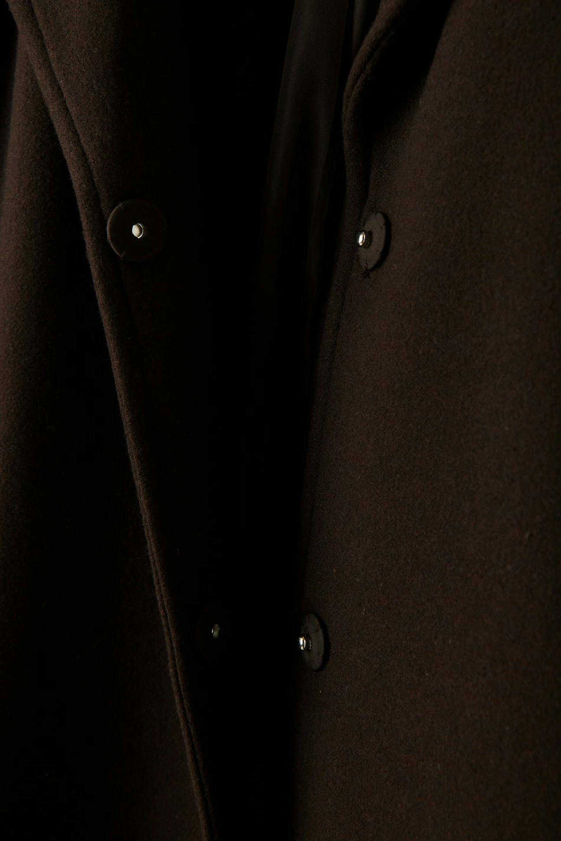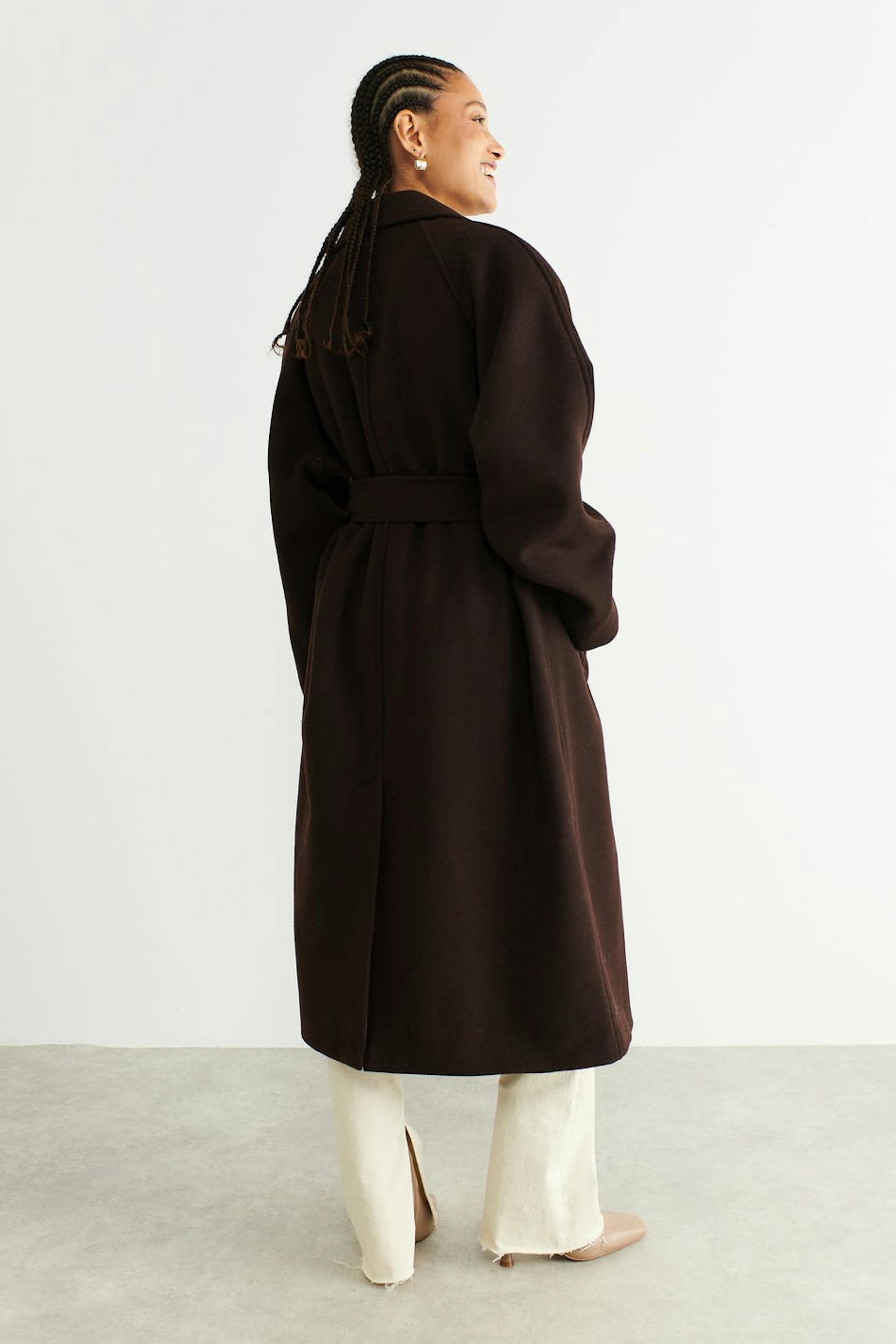 Straight coat with belt tie at the waist. The coat is brown and has relaxed fit. It has concealed snap fastener in front, pockets in the sides, collar with lapels and midi length.