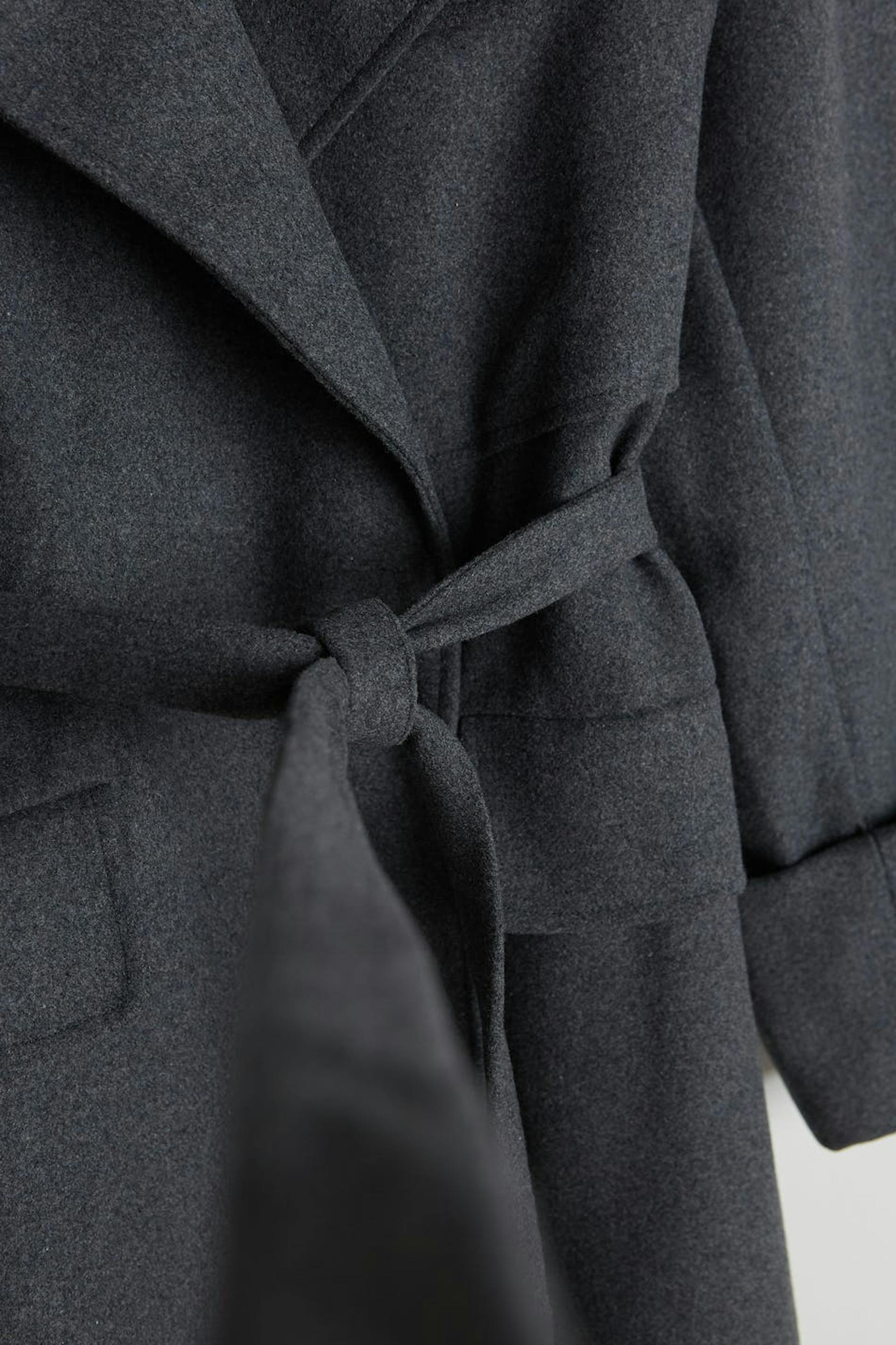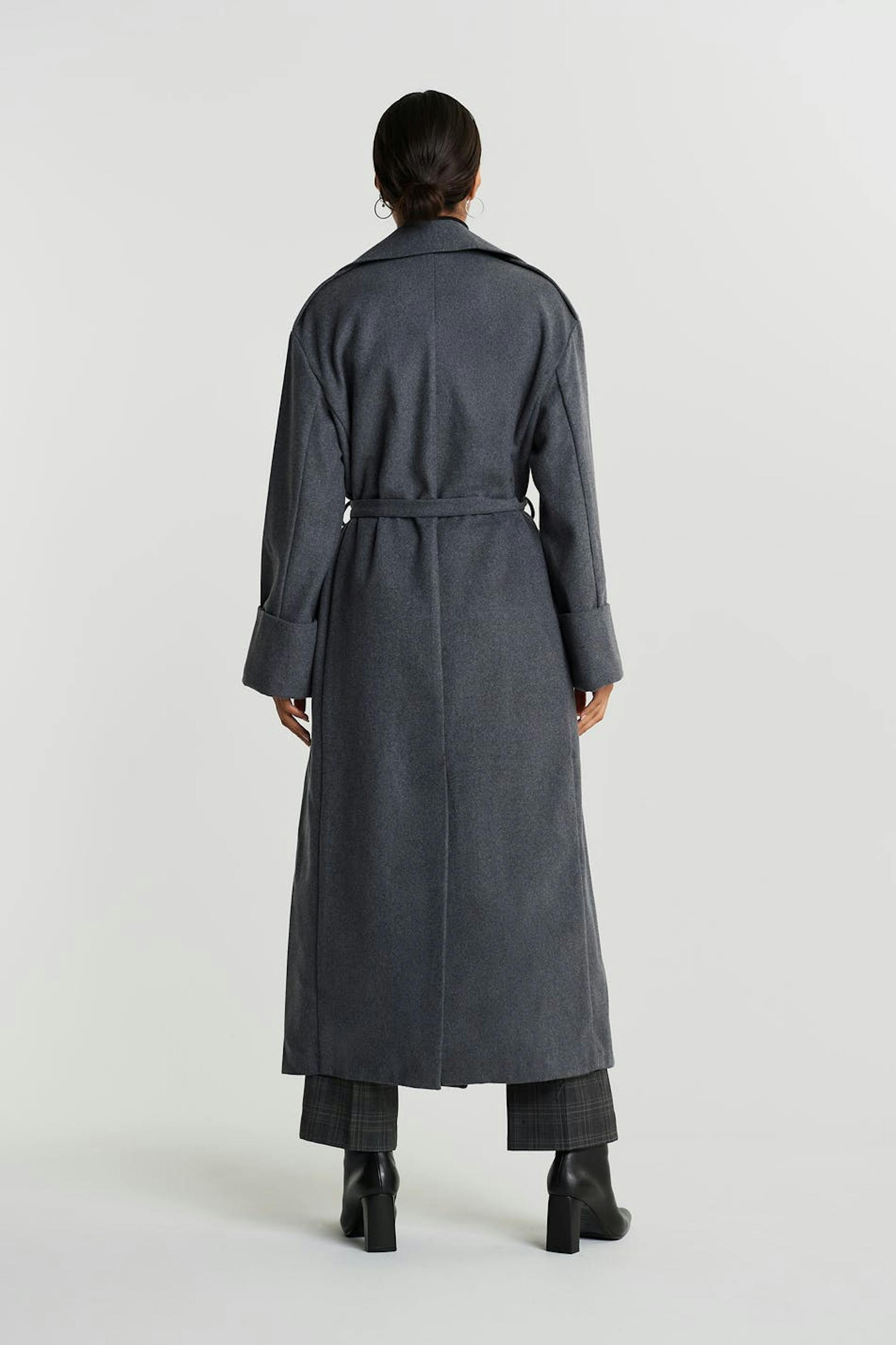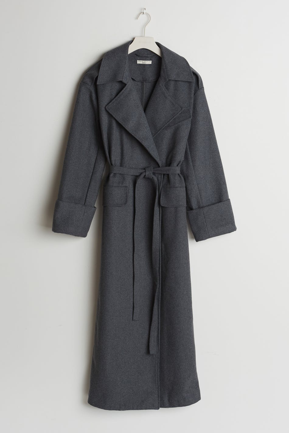 Long coat with a lapel. The coat is grey and has a belt tie at the waist. It has pockets at the front, a chest pocket and turn-up on the sleeve ends.