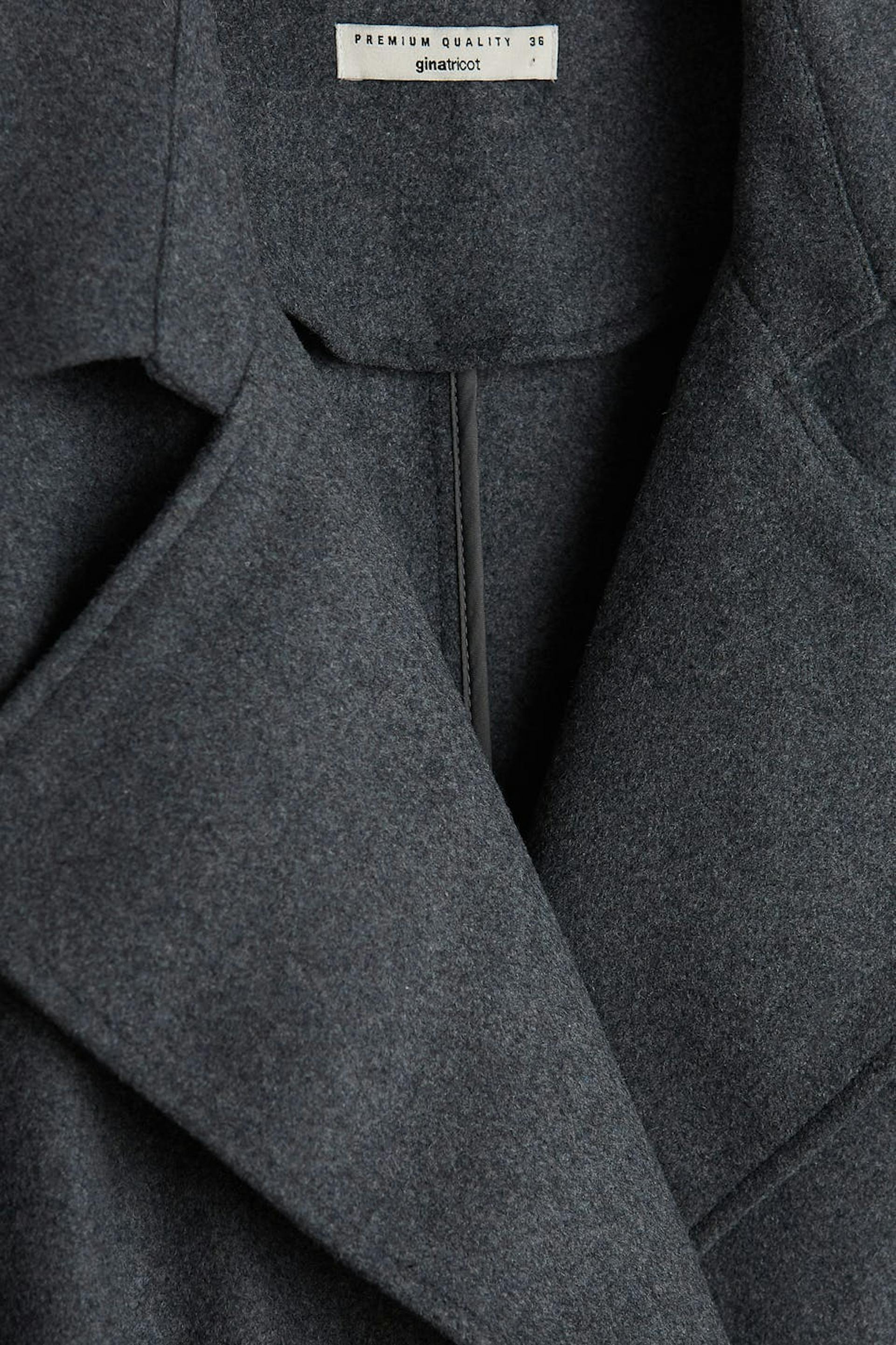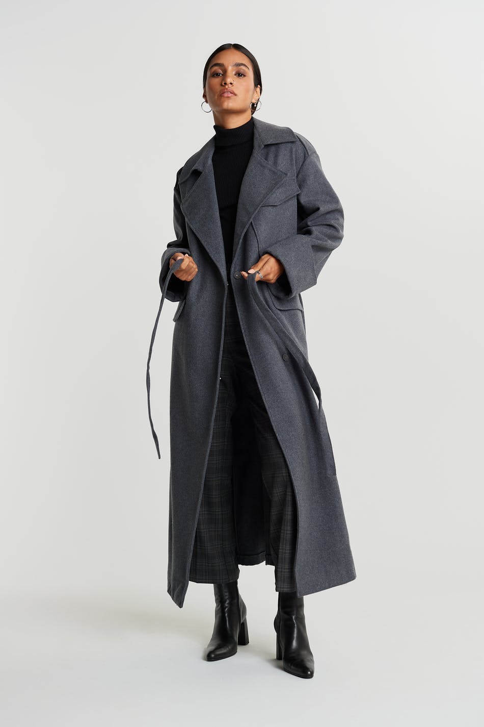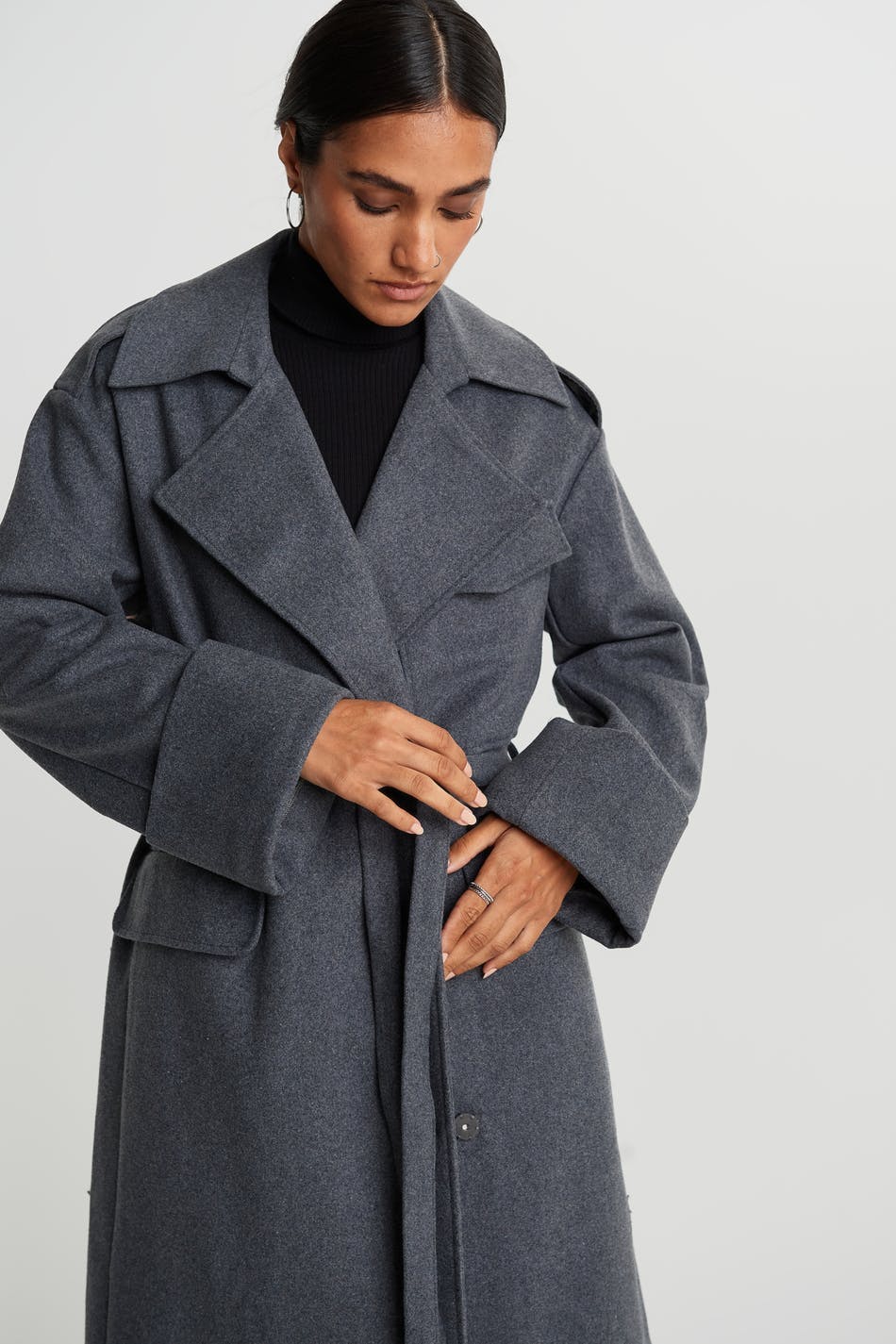 Long coat with a lapel. The coat is grey and has a belt tie at the waist. It has pockets at the front, a chest pocket and turn-up on the sleeve ends.