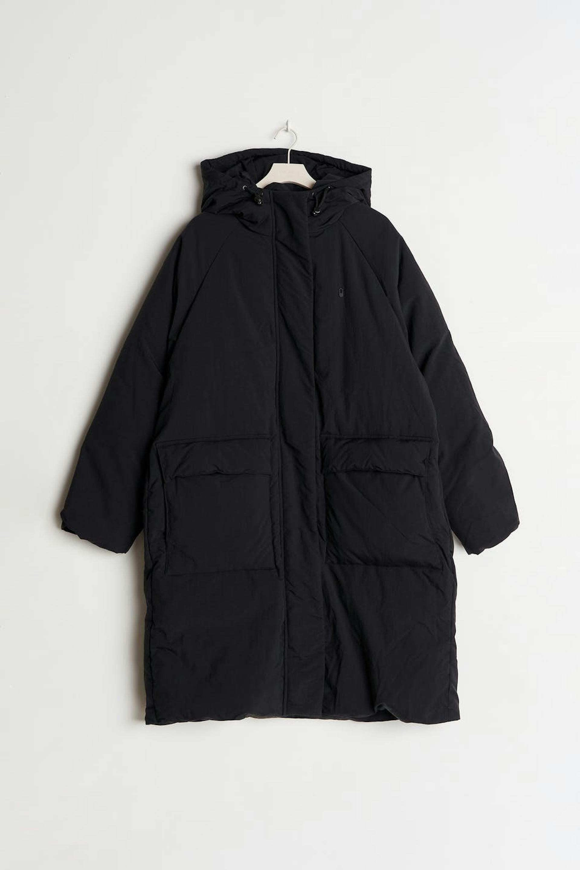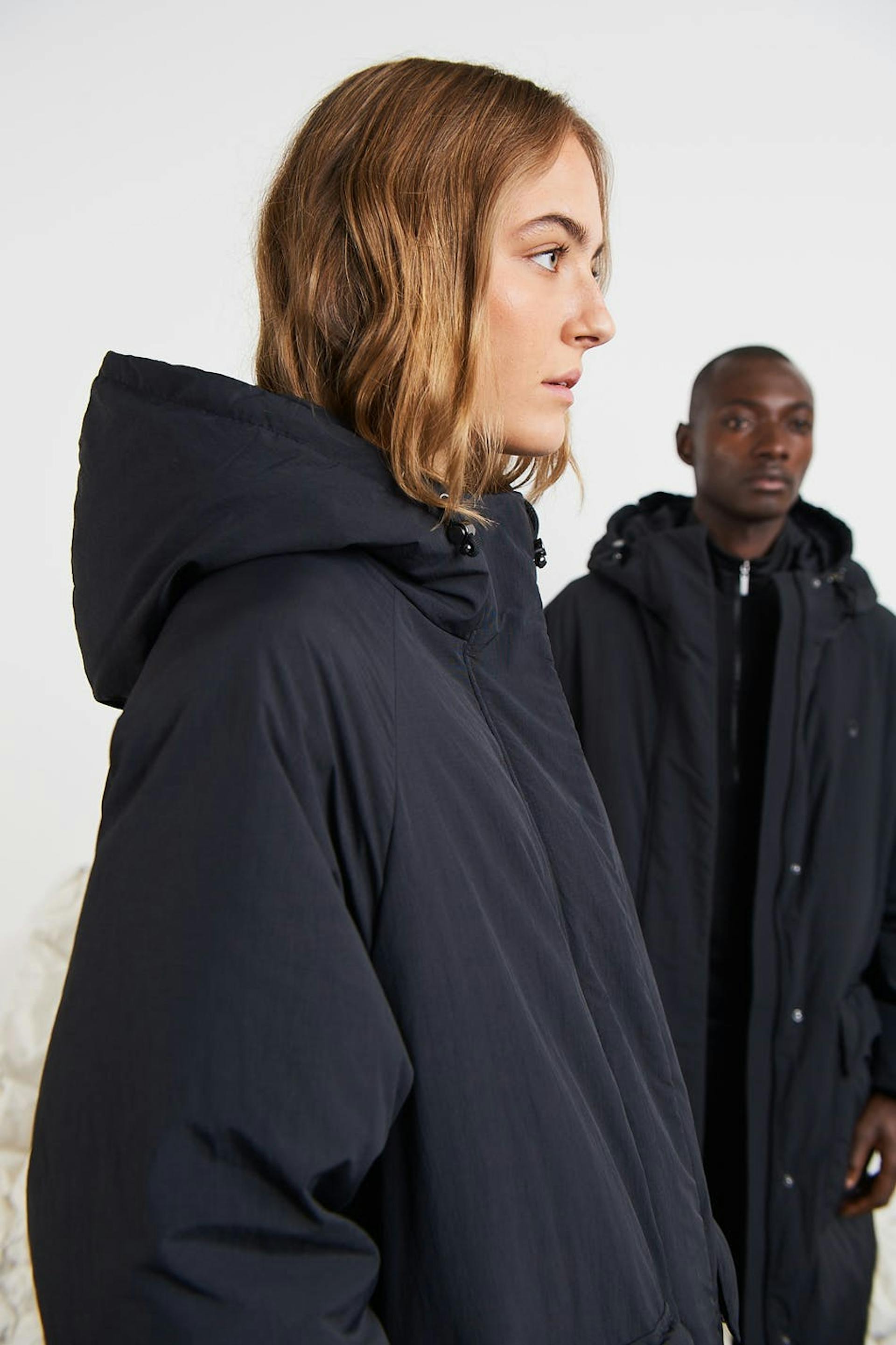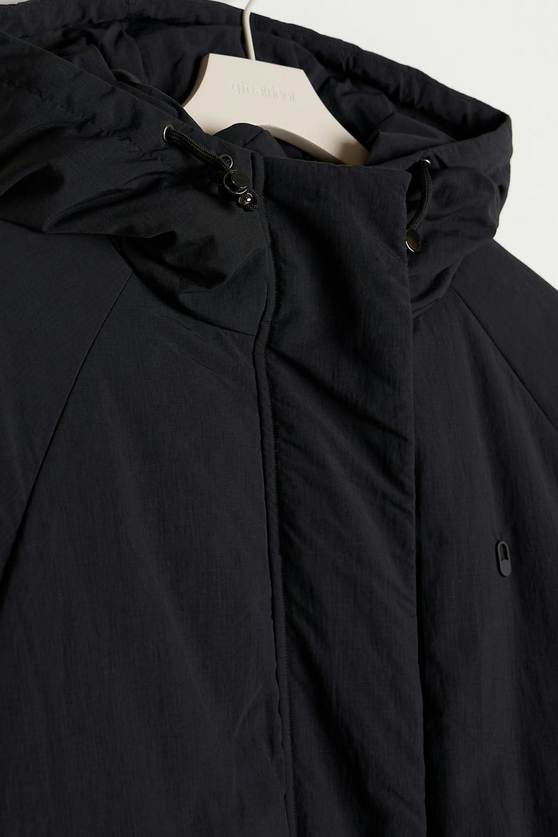 Puffer jacket by Gina Lab with boxy fit. The jacket is black and has a material in recycled polyamide. It has a water repellent function, two big pockets on the sides, a zip and button closure at the front, a hood and filling in recycled down.
