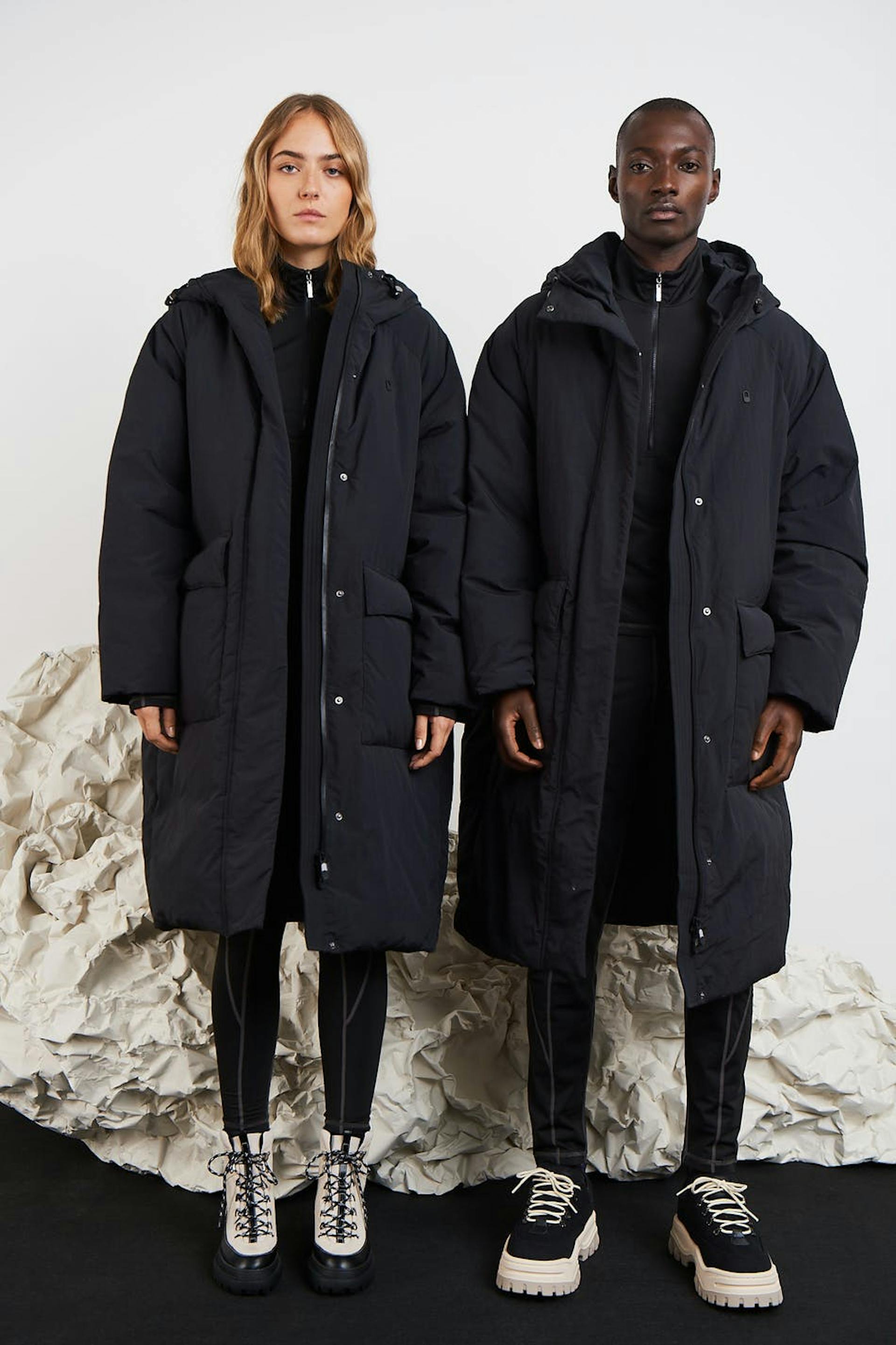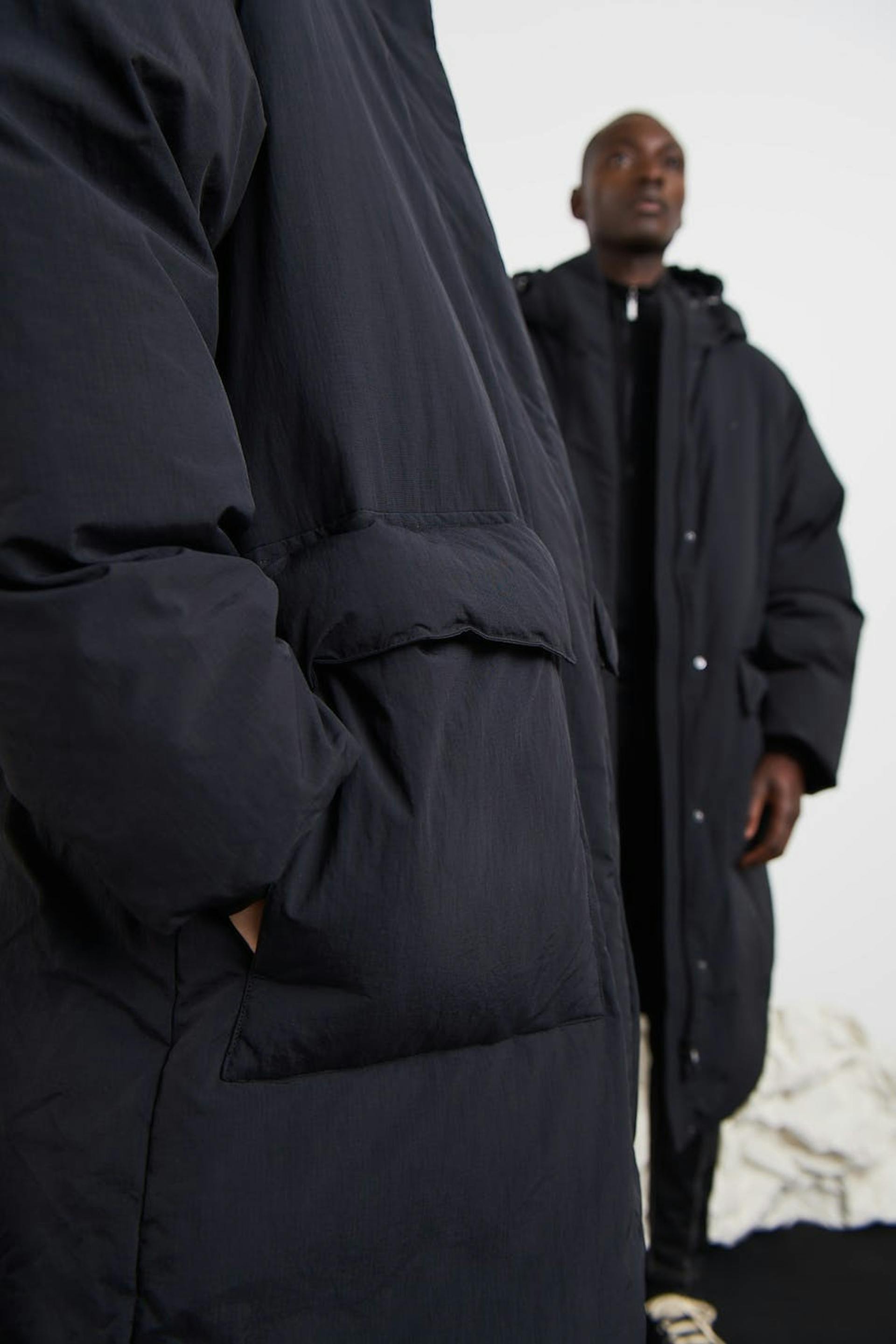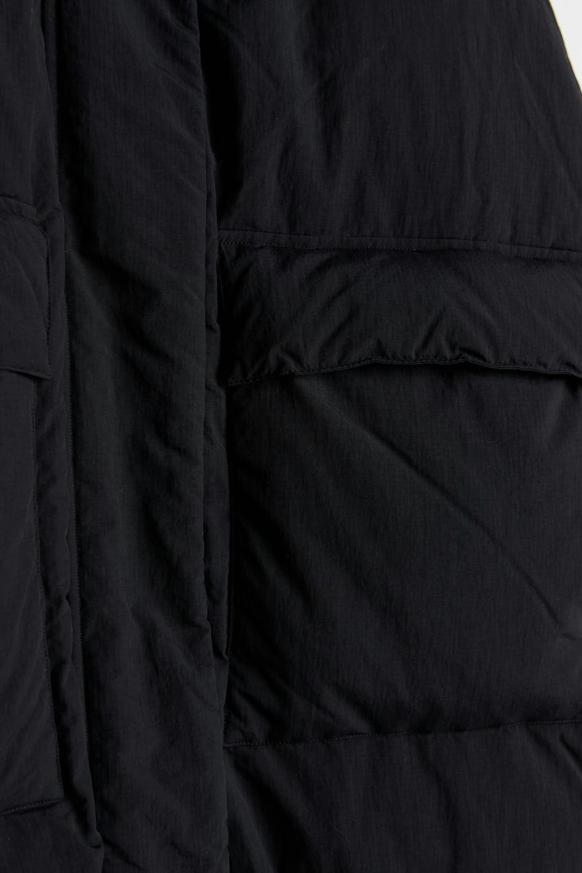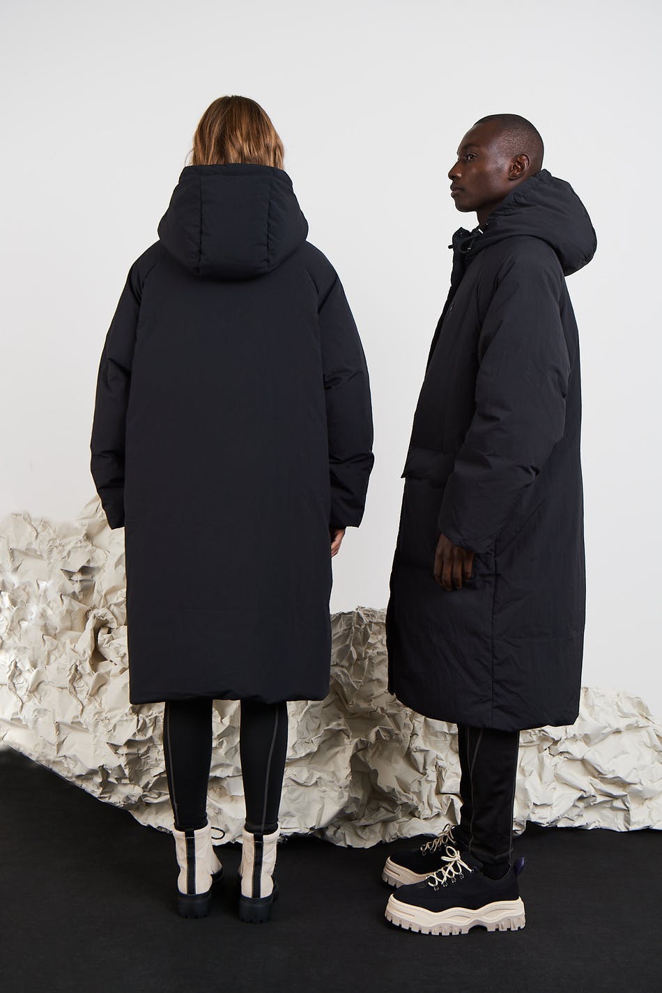 Puffer jacket by Gina Lab with boxy fit. The jacket is black and has a material in recycled polyamide. It has a water repellent function, two big pockets on the sides, a zip and button closure at the front, a hood and filling in recycled down.