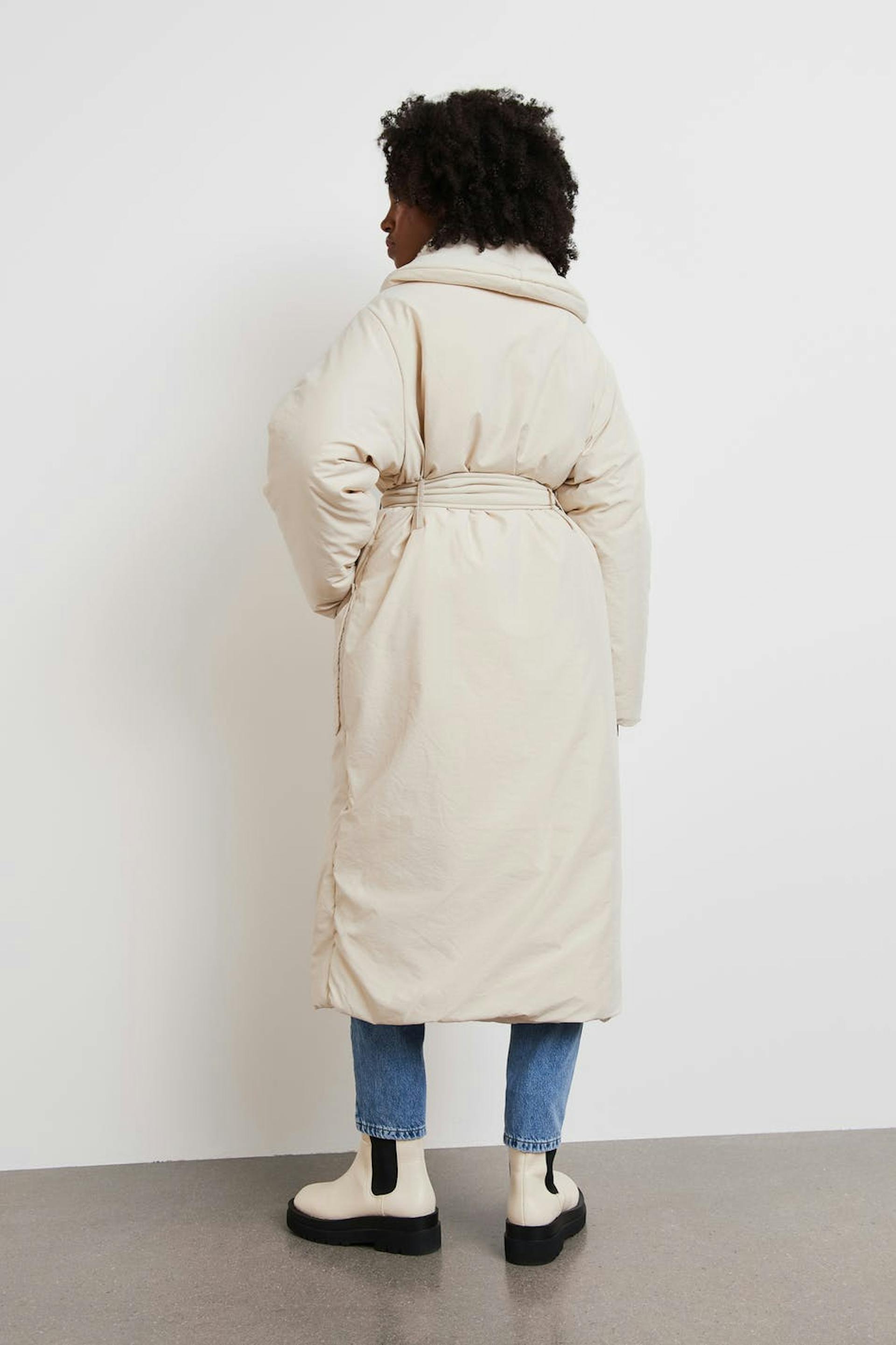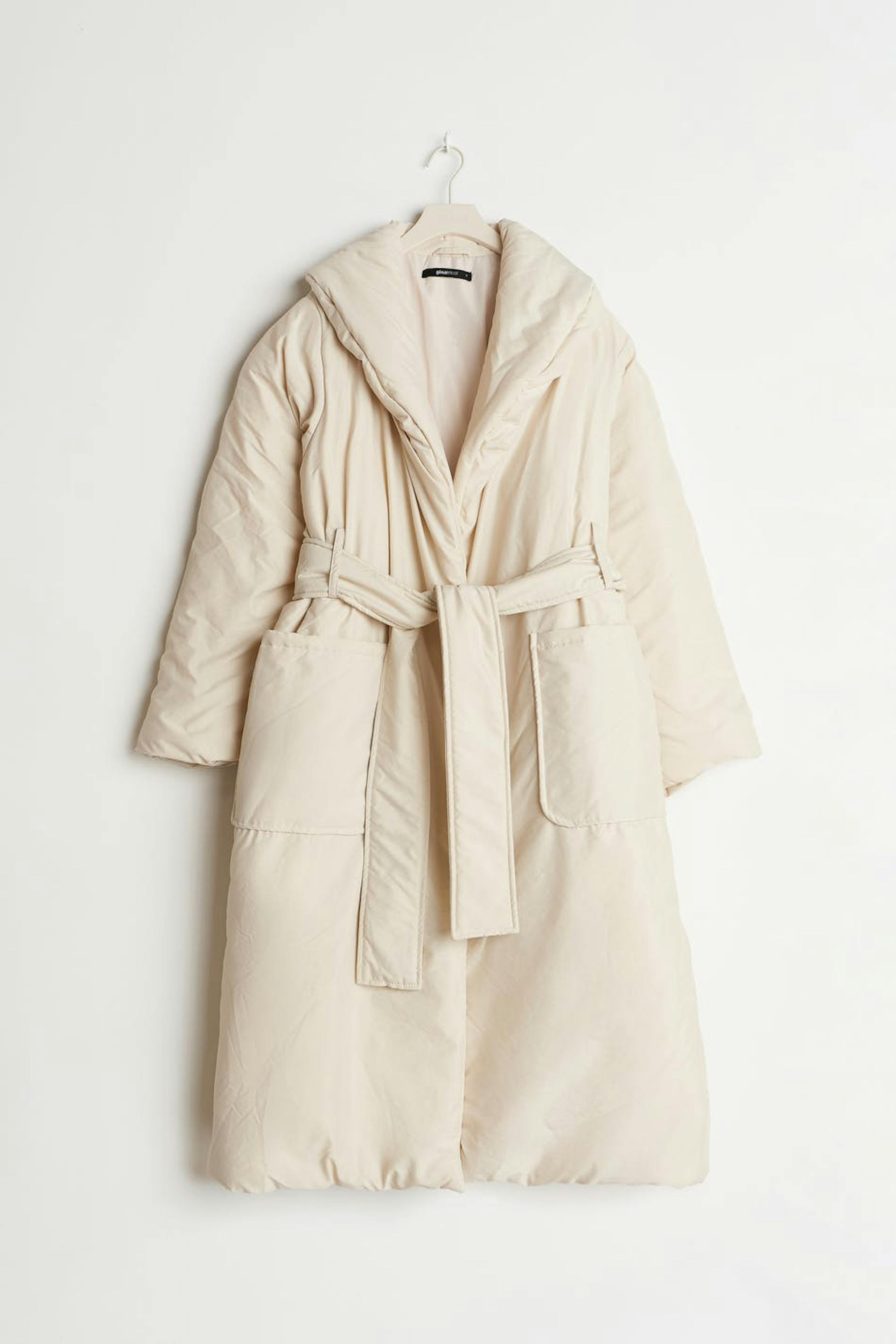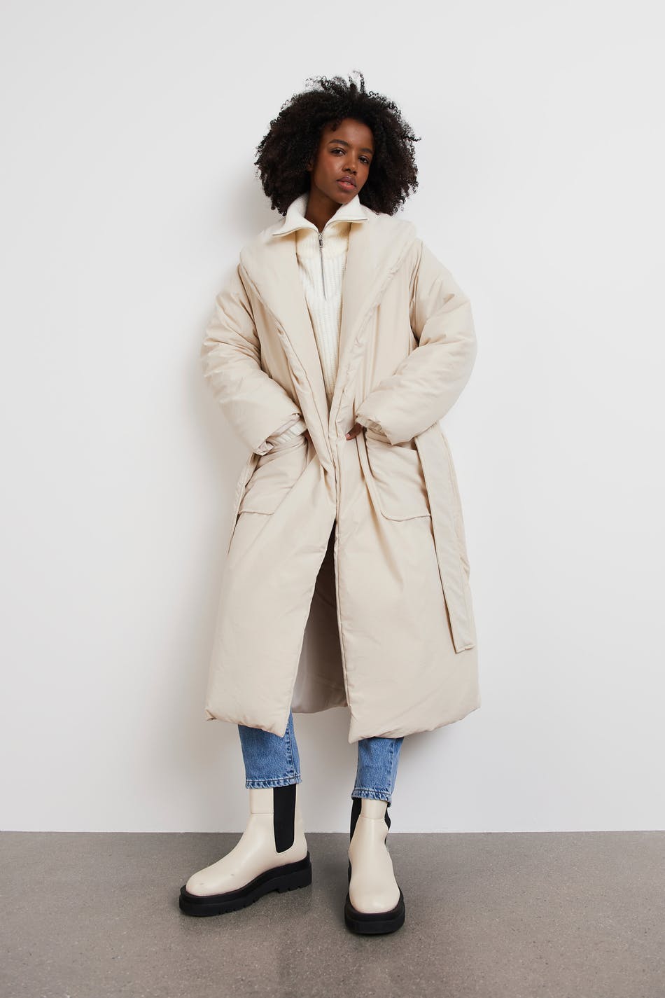 Coat with an oversize fit. The coat is beige and has a padded quality. It has a big shawl collar, a tie strap at the waist and two big pockets at the front.