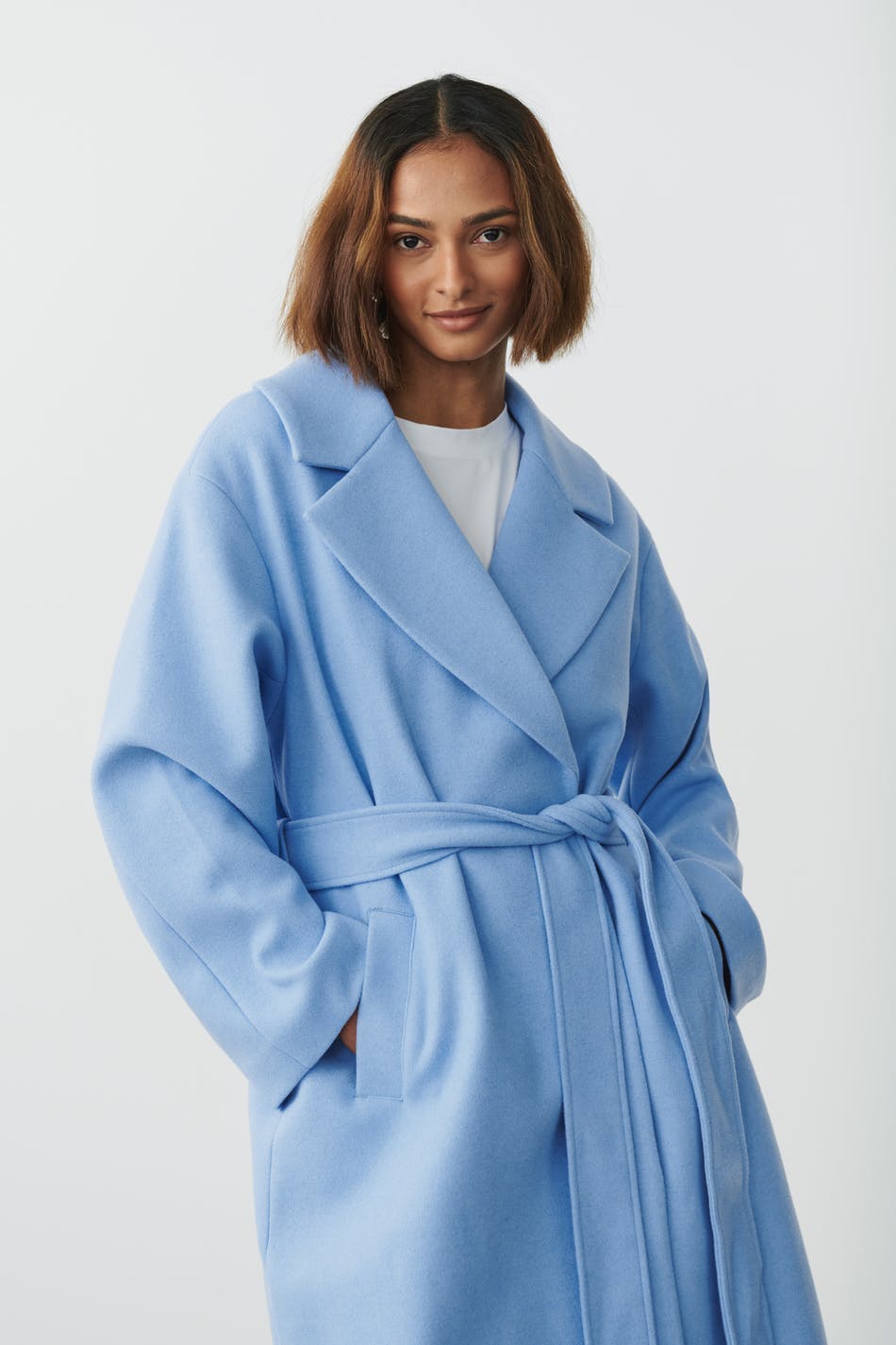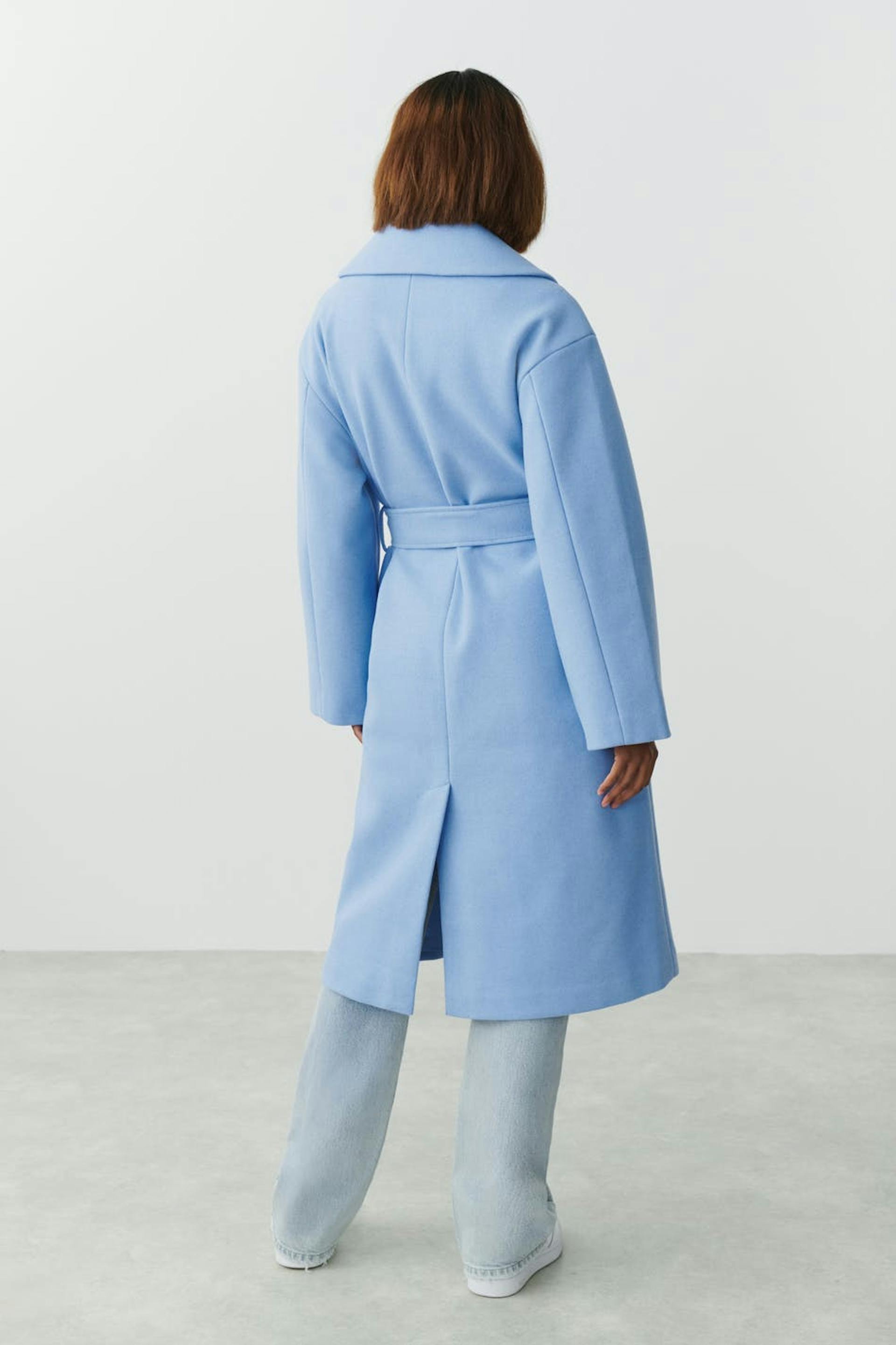 Long coat with self-tie belt at the waist. The coat is straight, woven and blue. It has oversize fit, wool-like quality, side pockets, slit at the back, belt loops and collar with notch lapel.