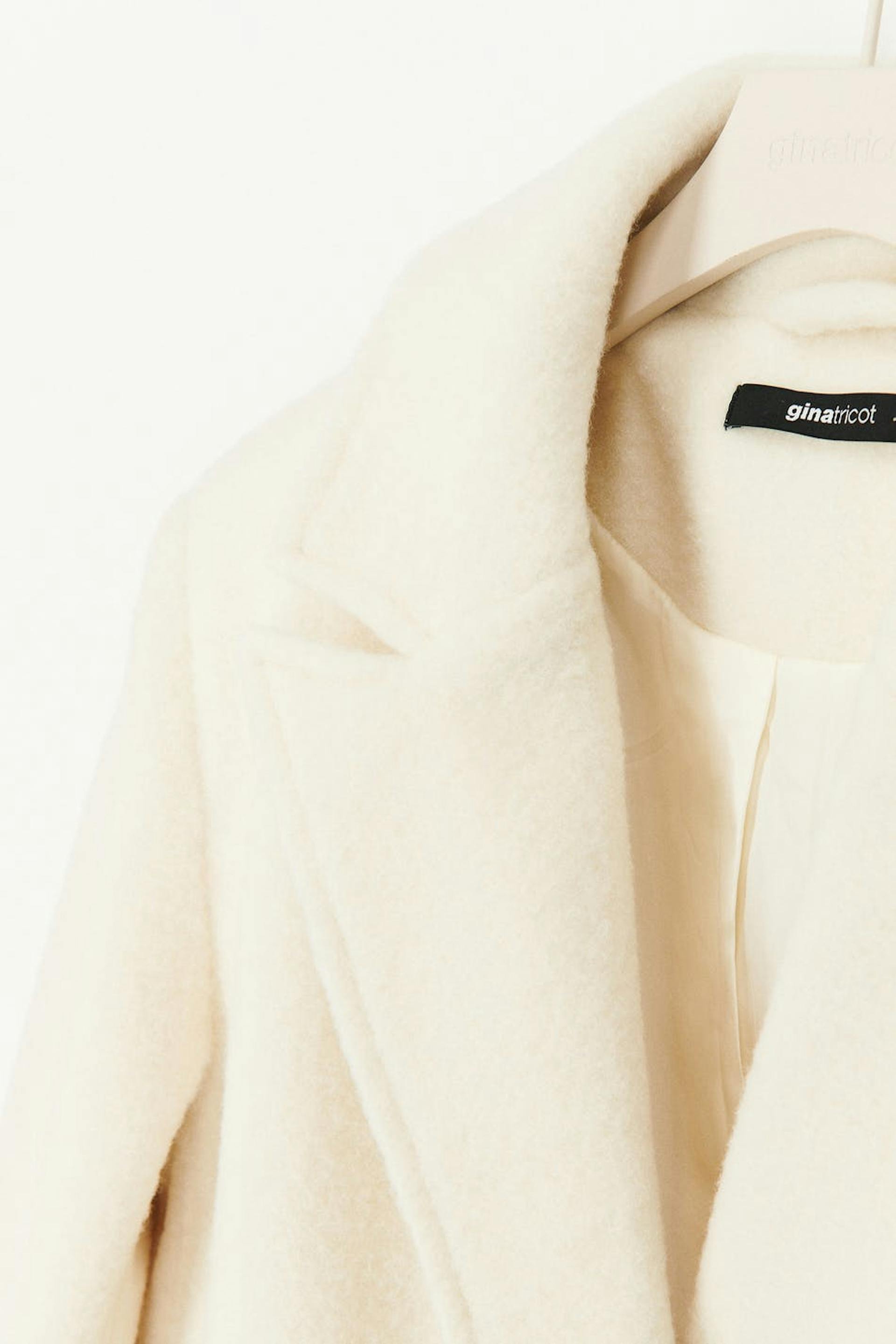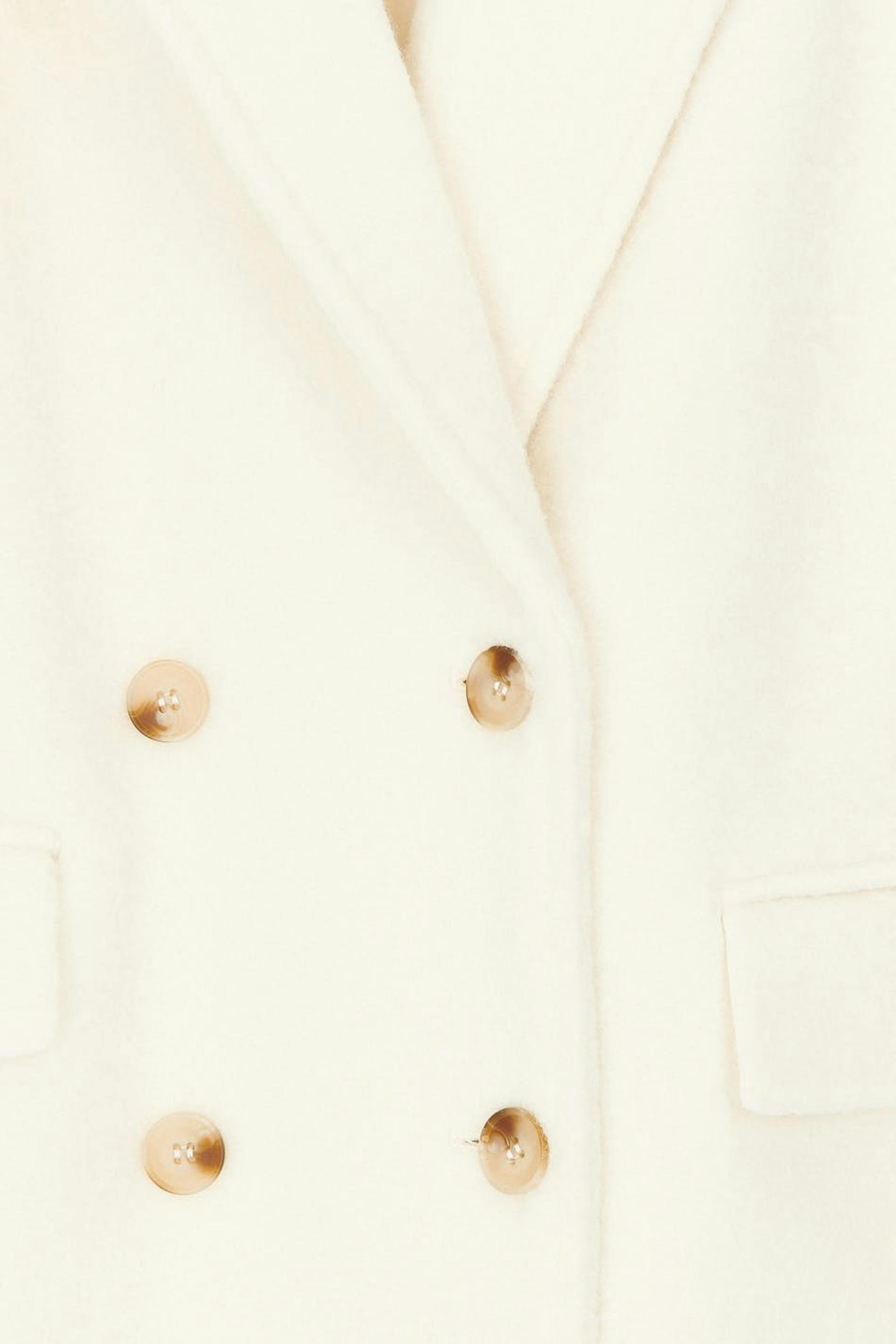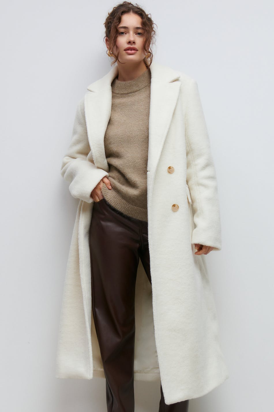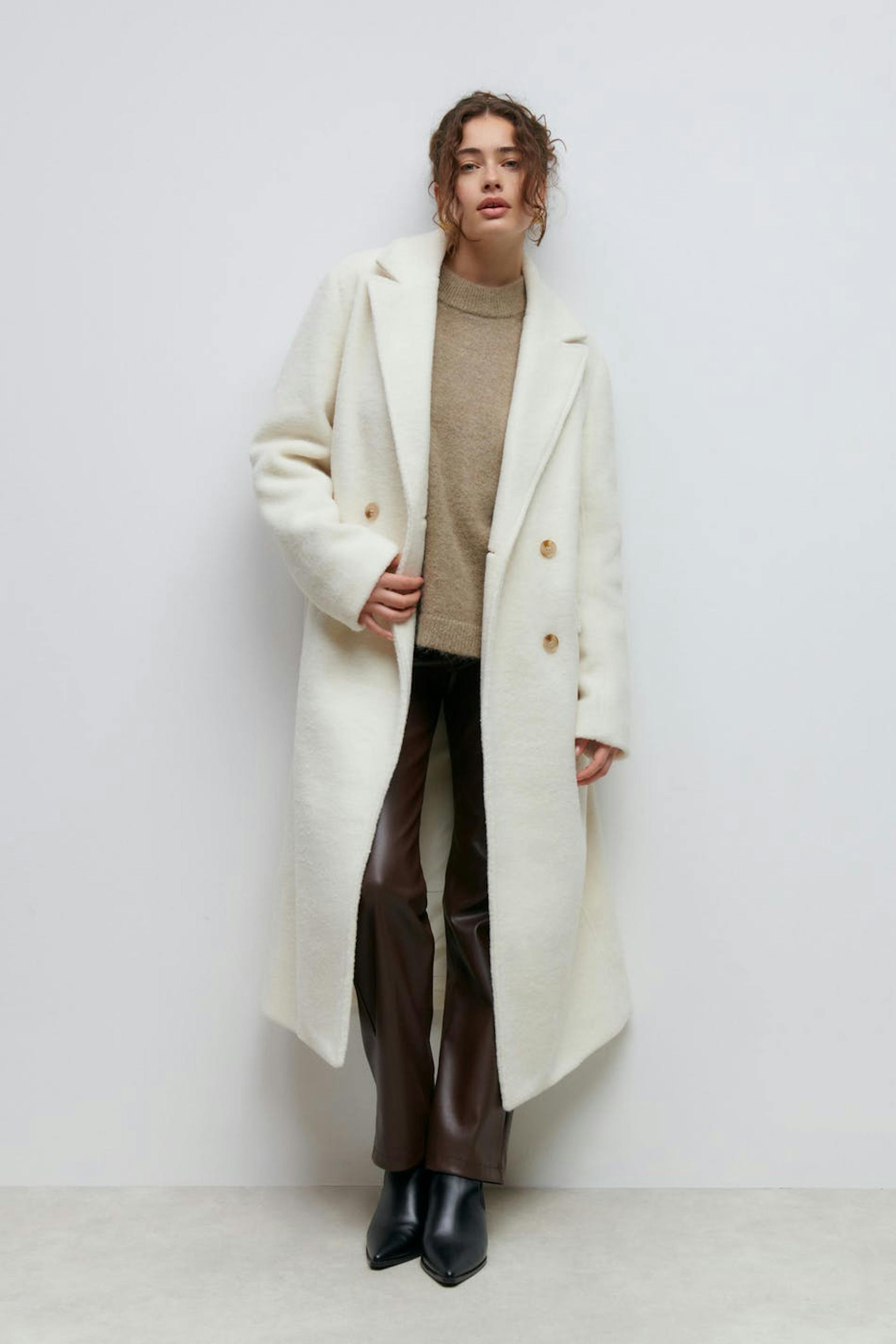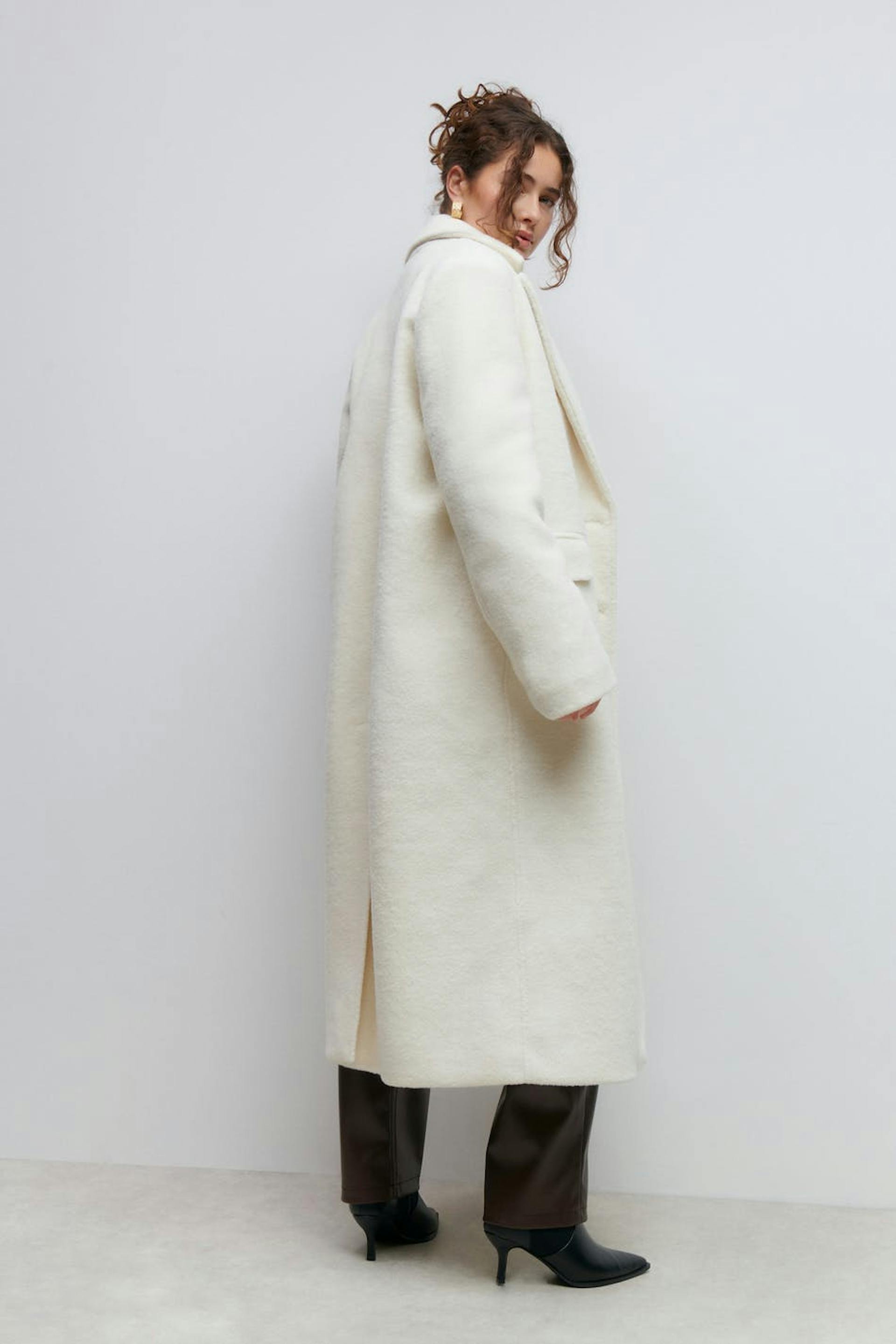 Long coat in men's style with oversize fit. The coat is white, straight and double-breasted. It has flap pocket at the front, vent at the back and collar with lapel.