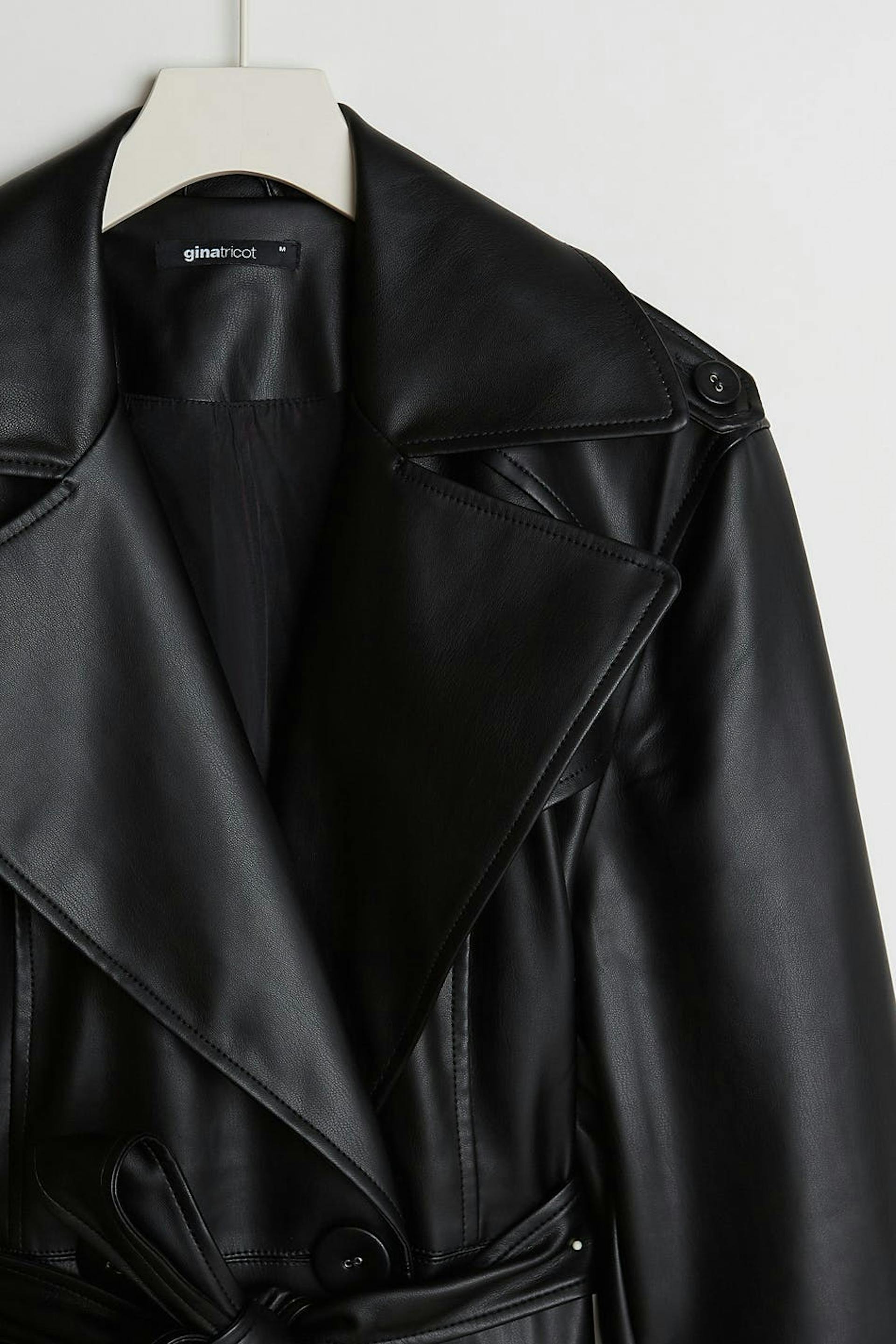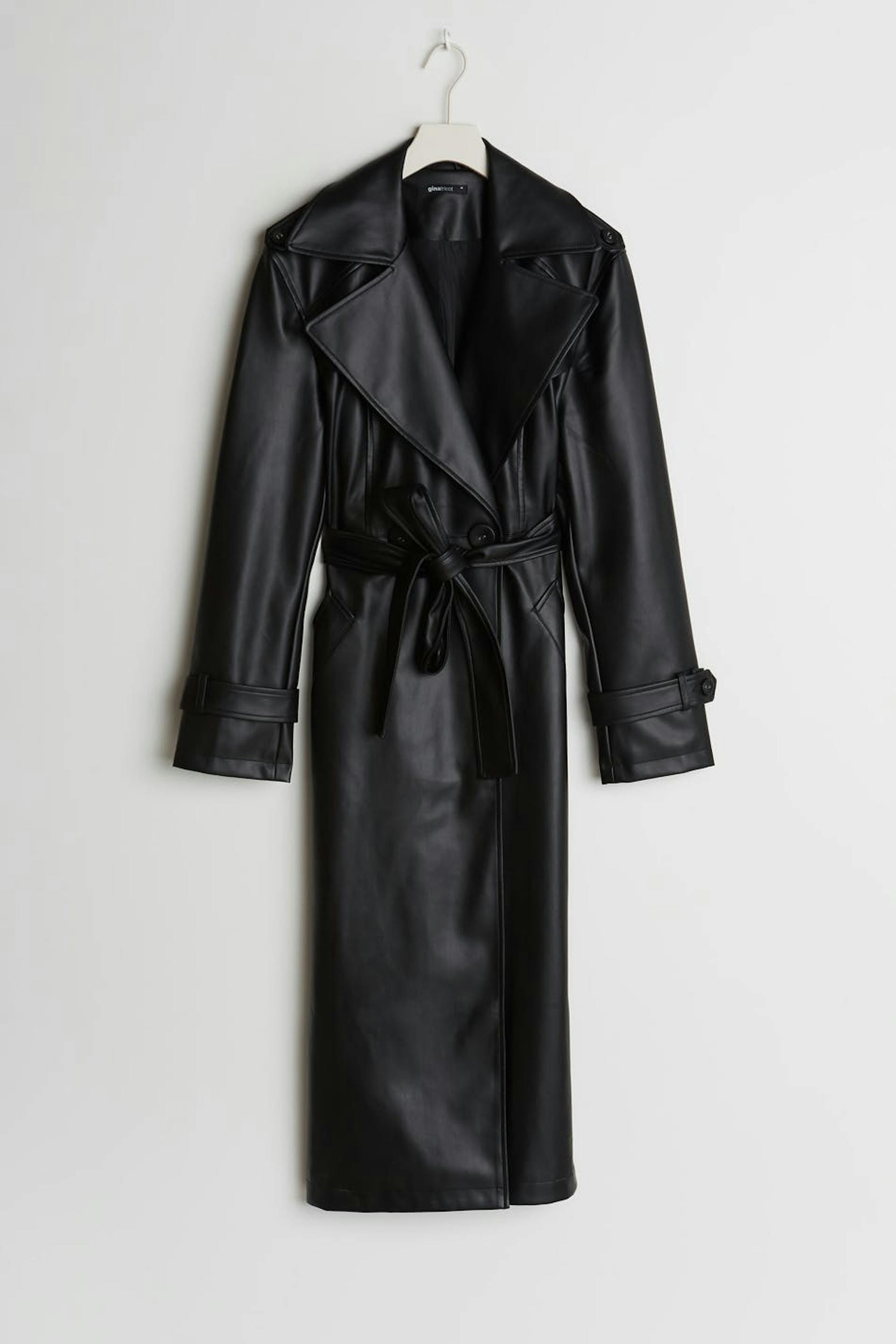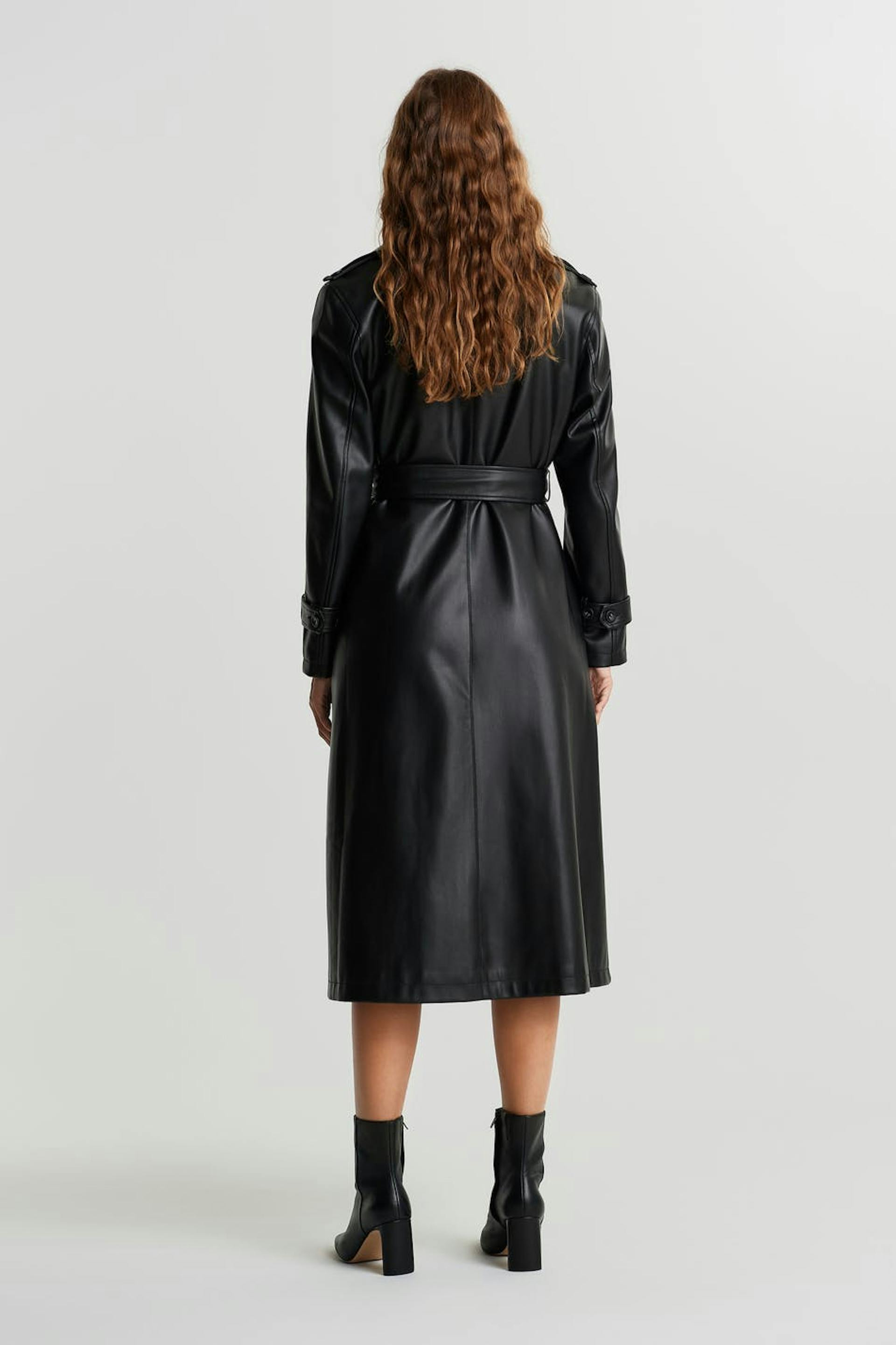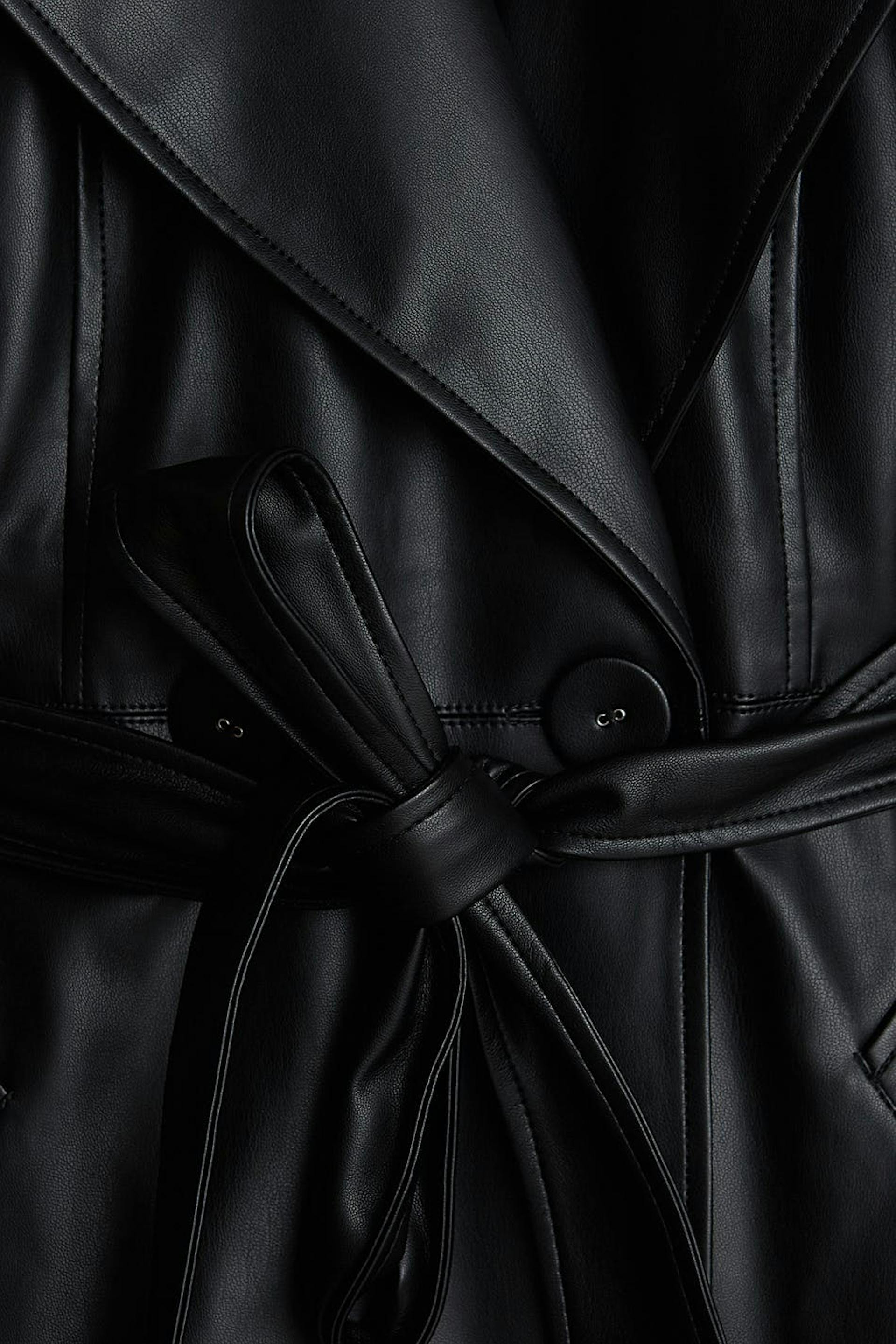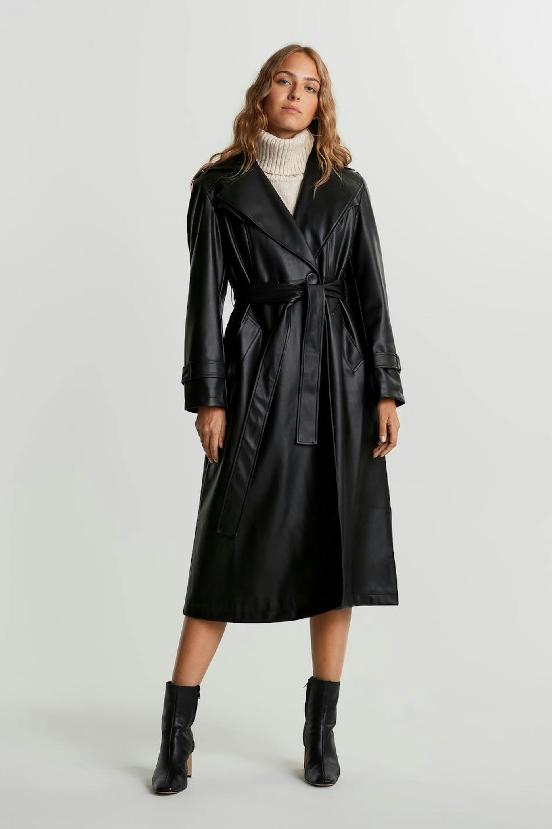 Double-breasted coat with an oversize fit. The coat is black and has a belt at the waist. It is made of PU.