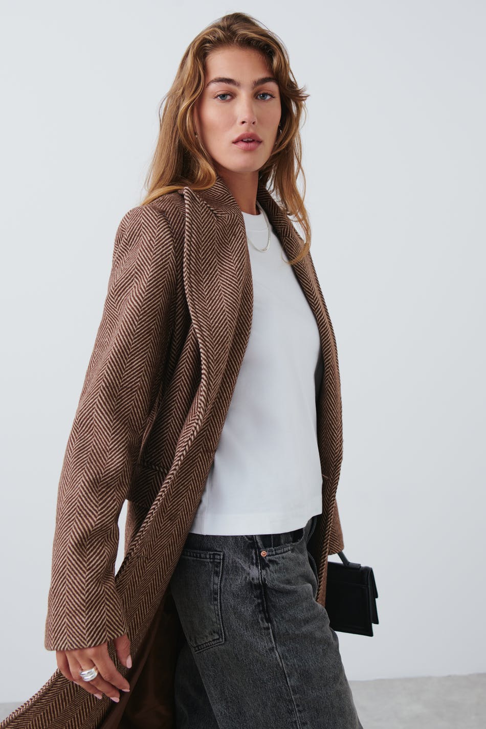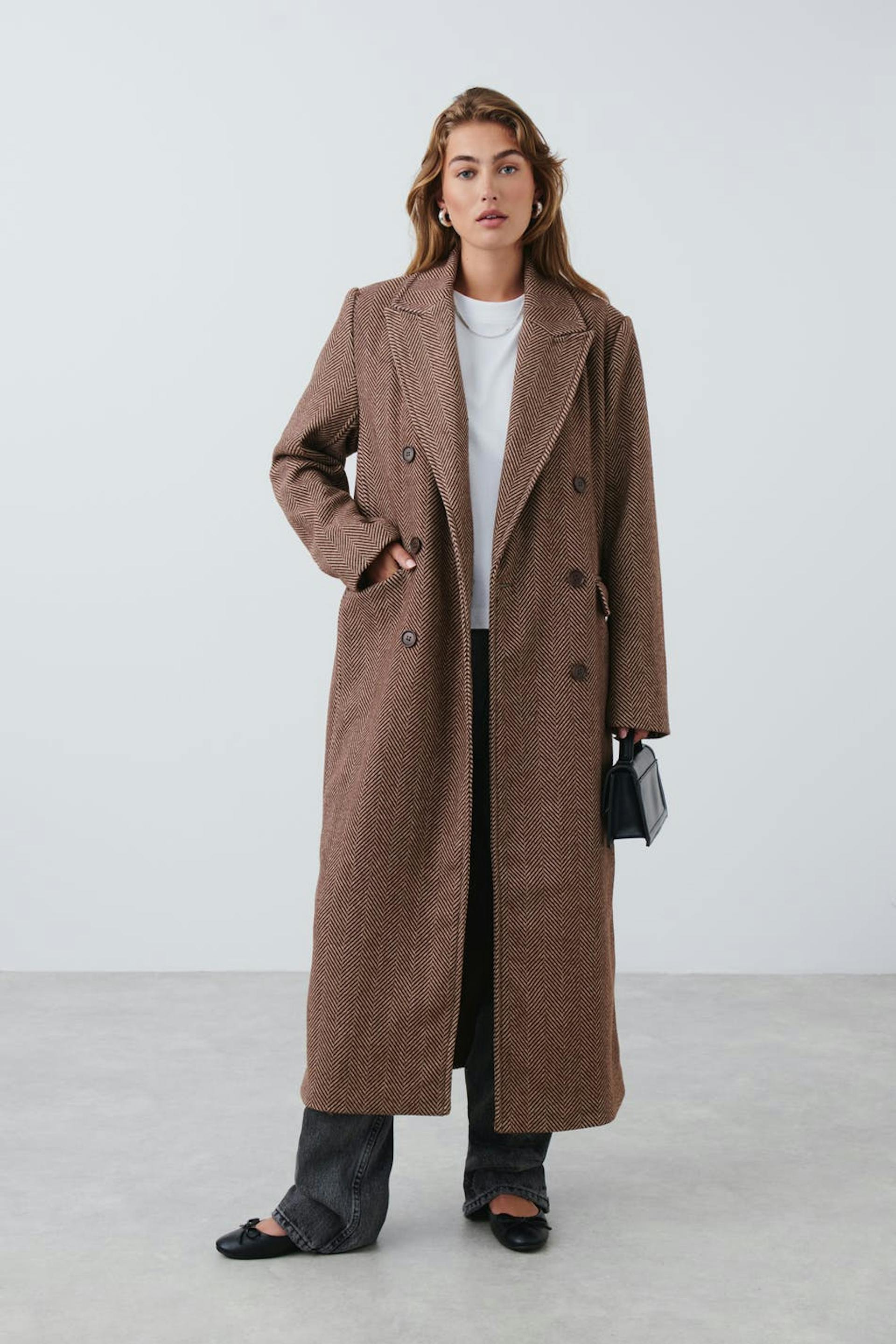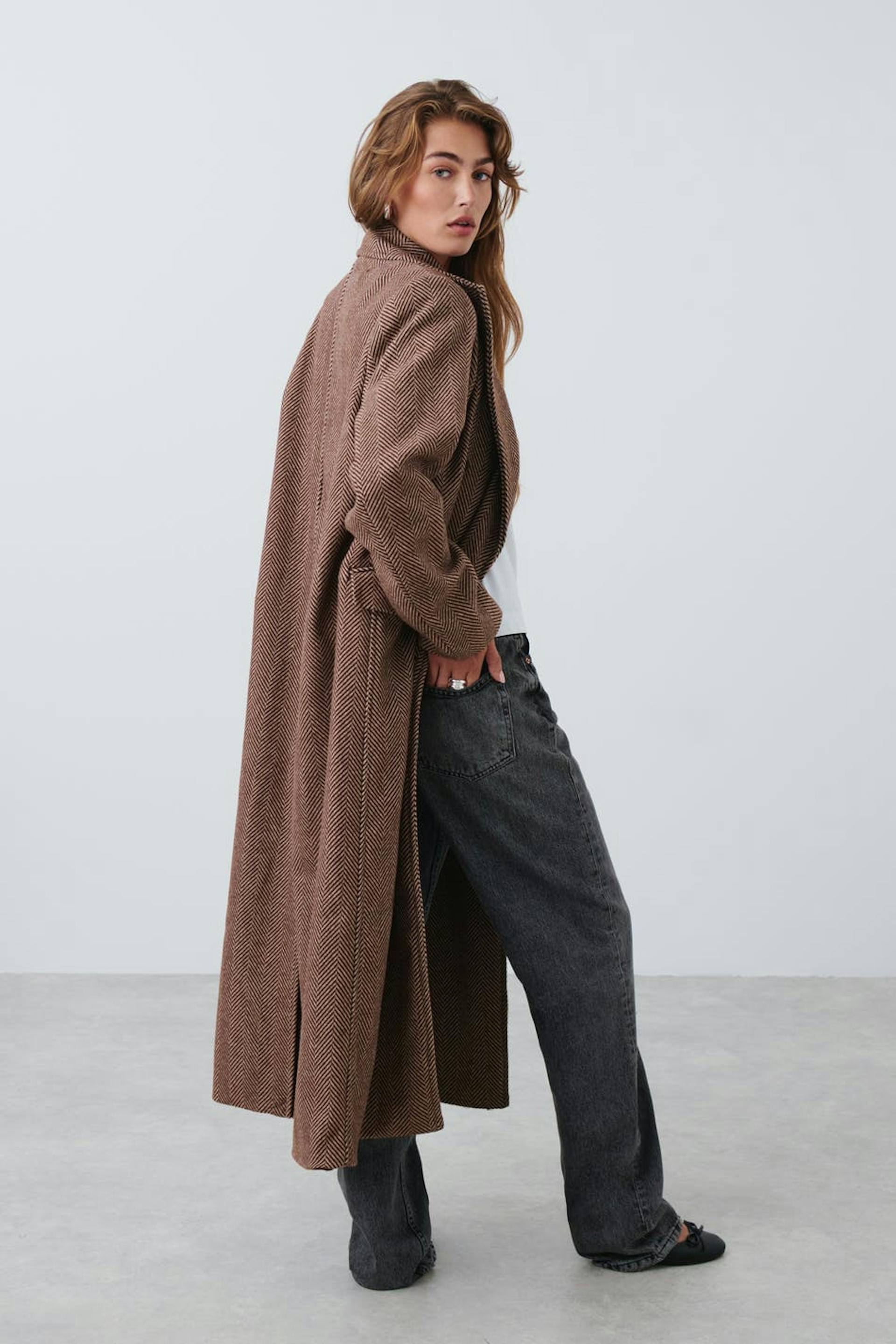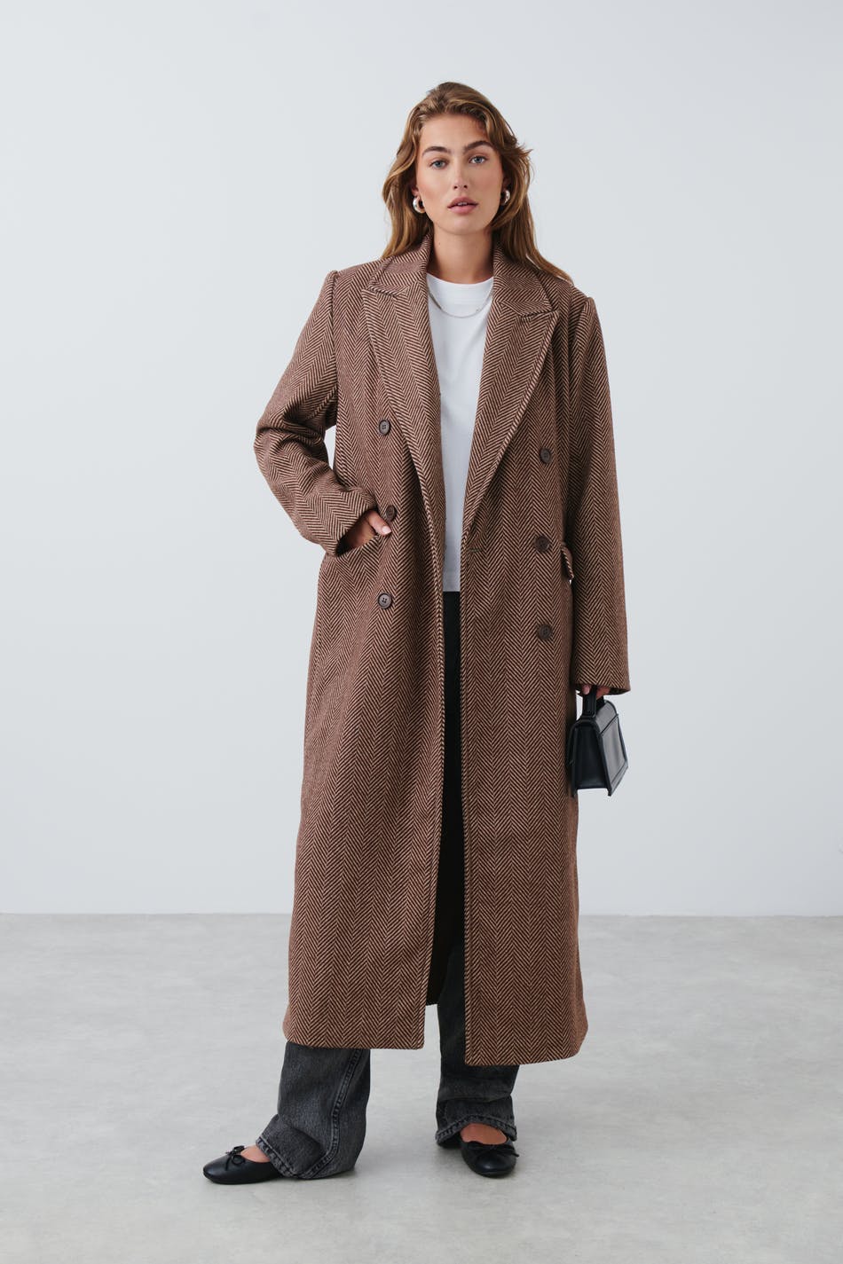 Long coat in wool blend with herringbone pattern. The coat is brown and has oversize fit. It has double button closure at the front, flap pockets in the sides, collar with lapels, inner pockets and slit at the back.