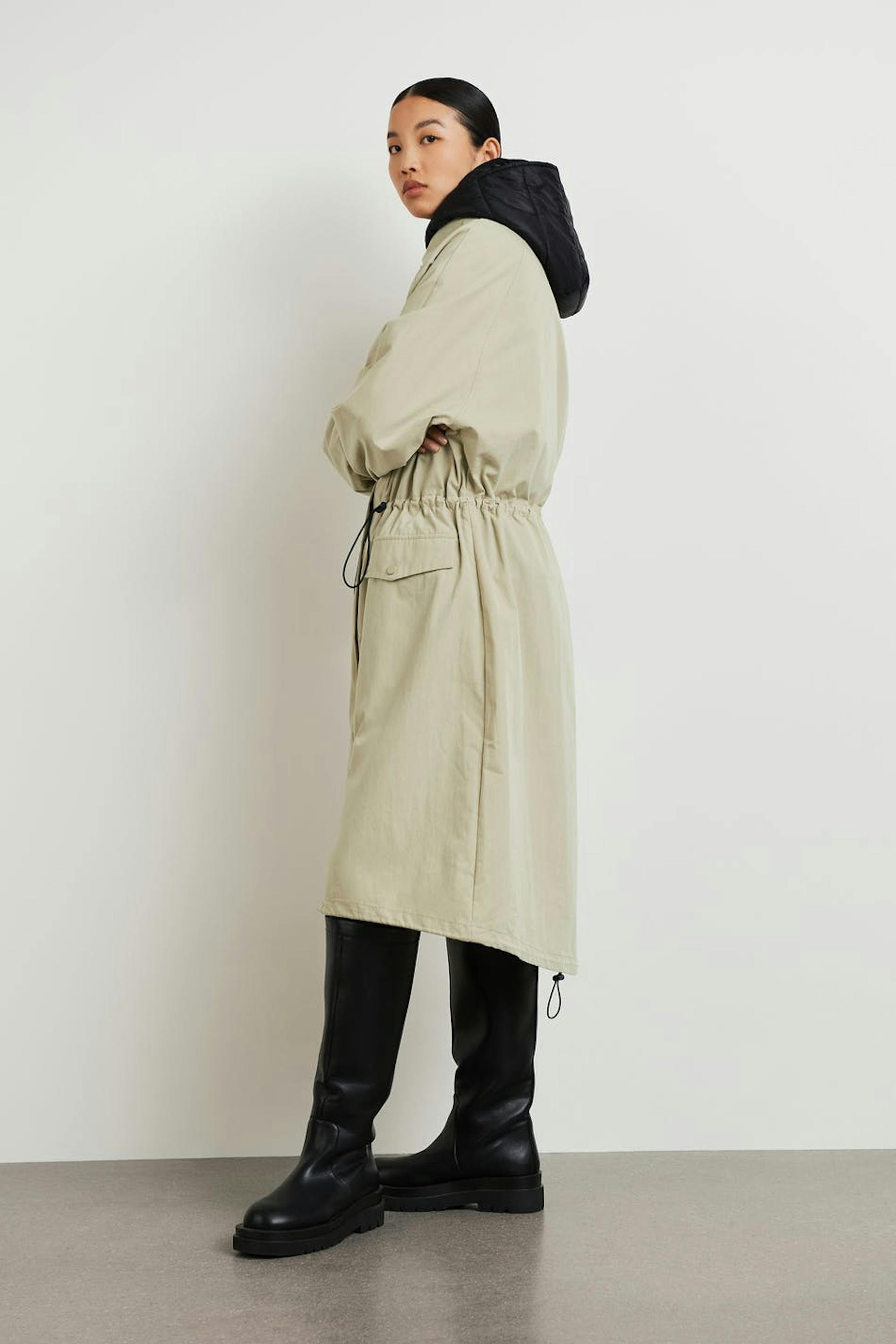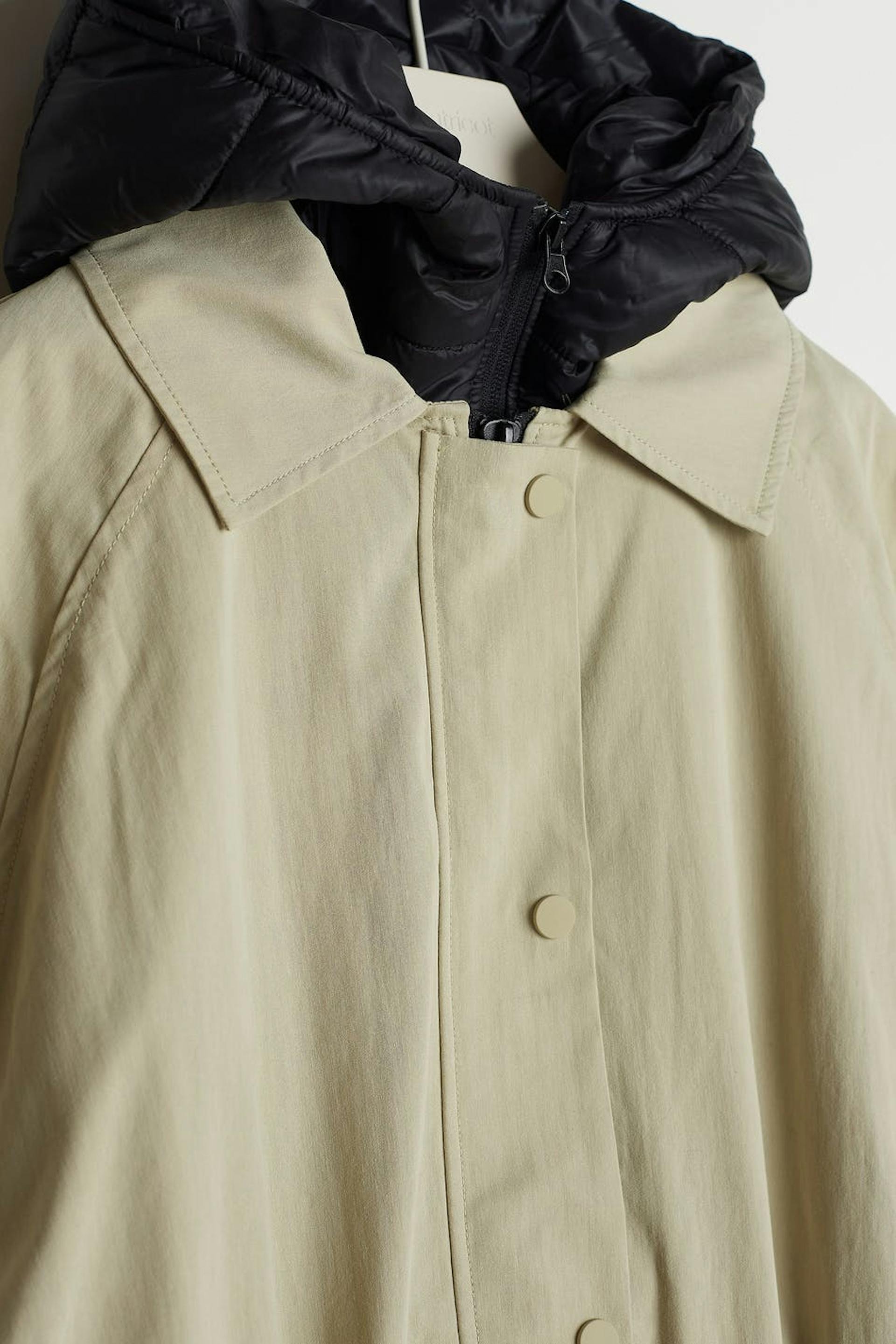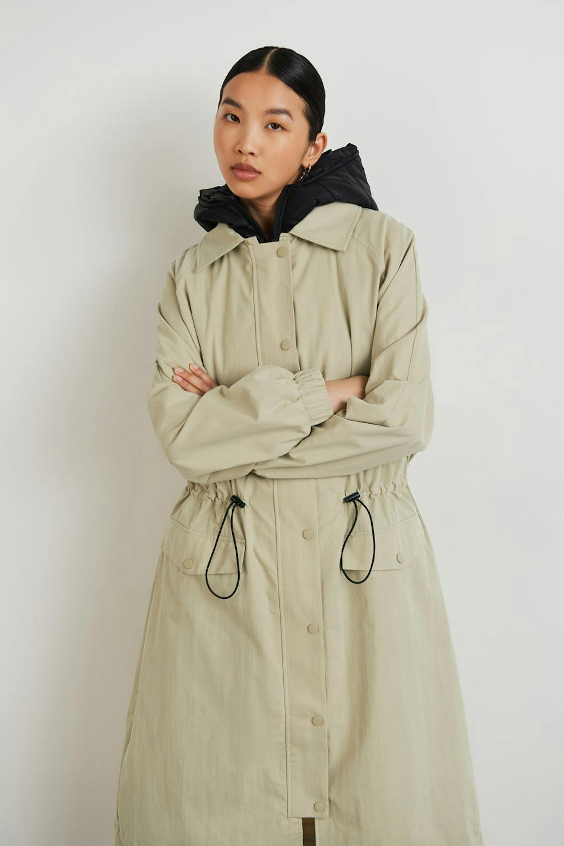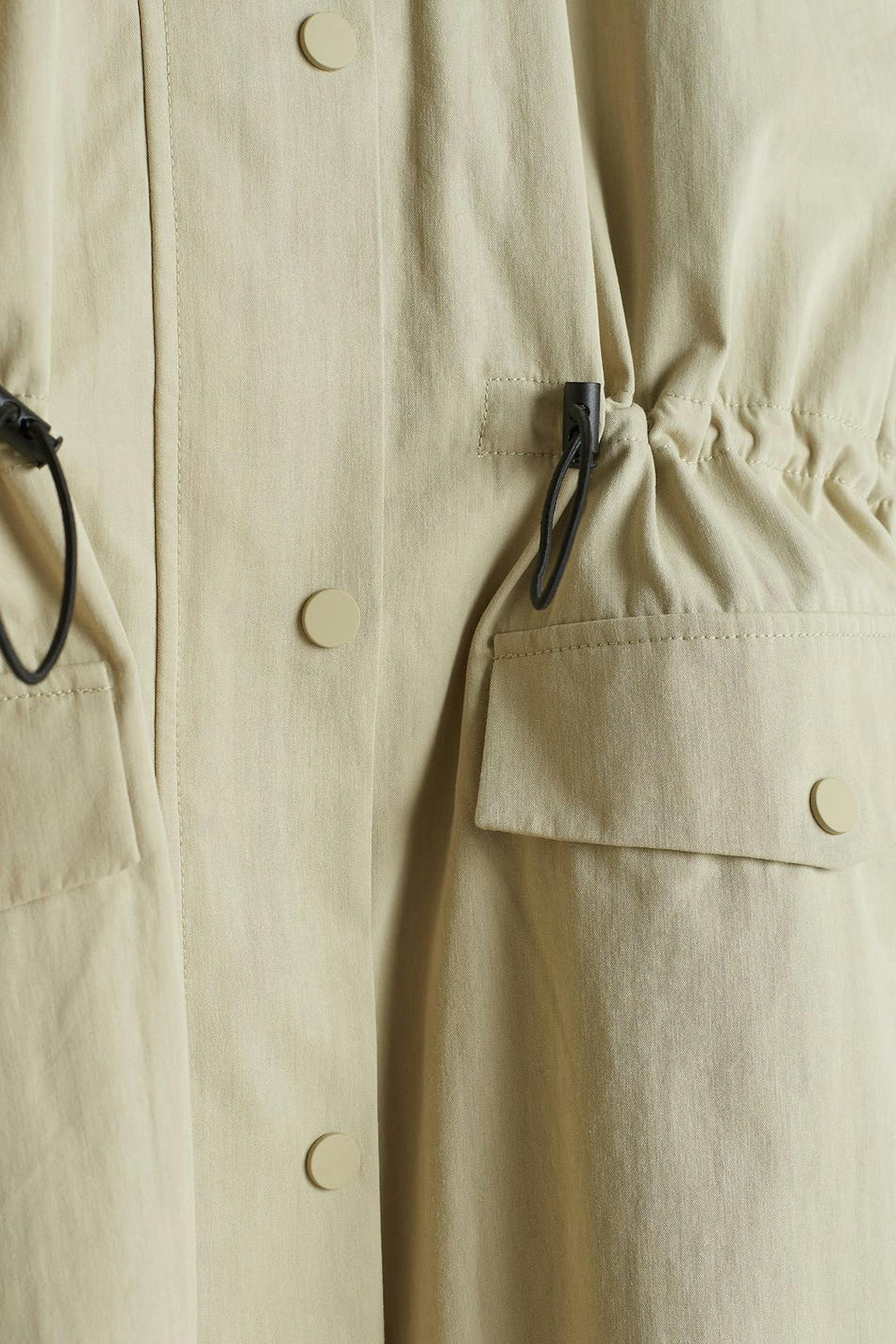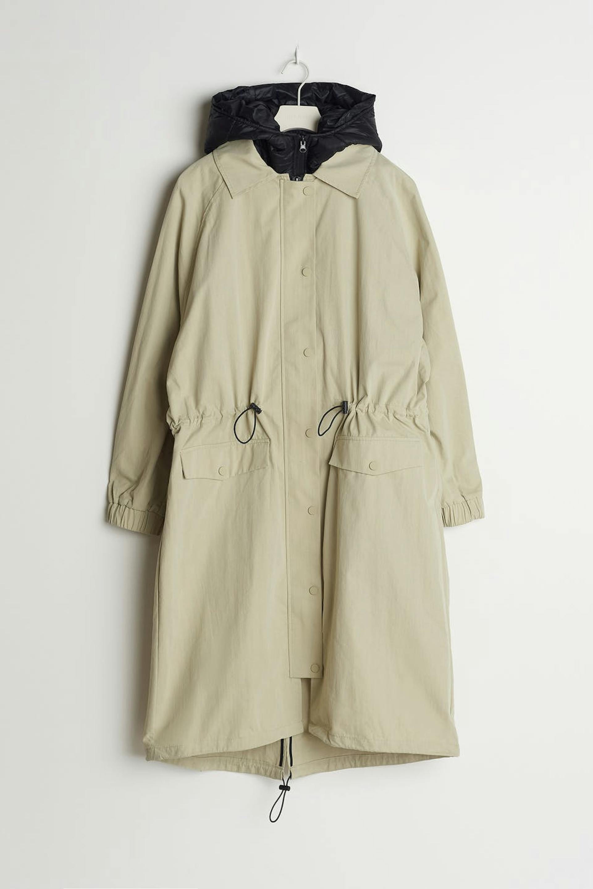 Long coat with an oversize fit. The coat is beige and has a drawstring at the waist. It has pockets on the sides, a quilted waistcoat under, a zip and snap buttons at the front.
