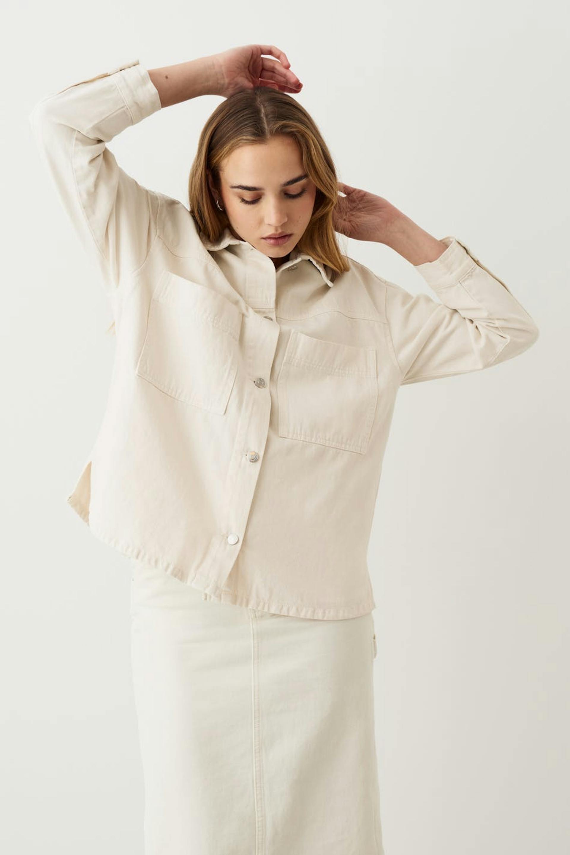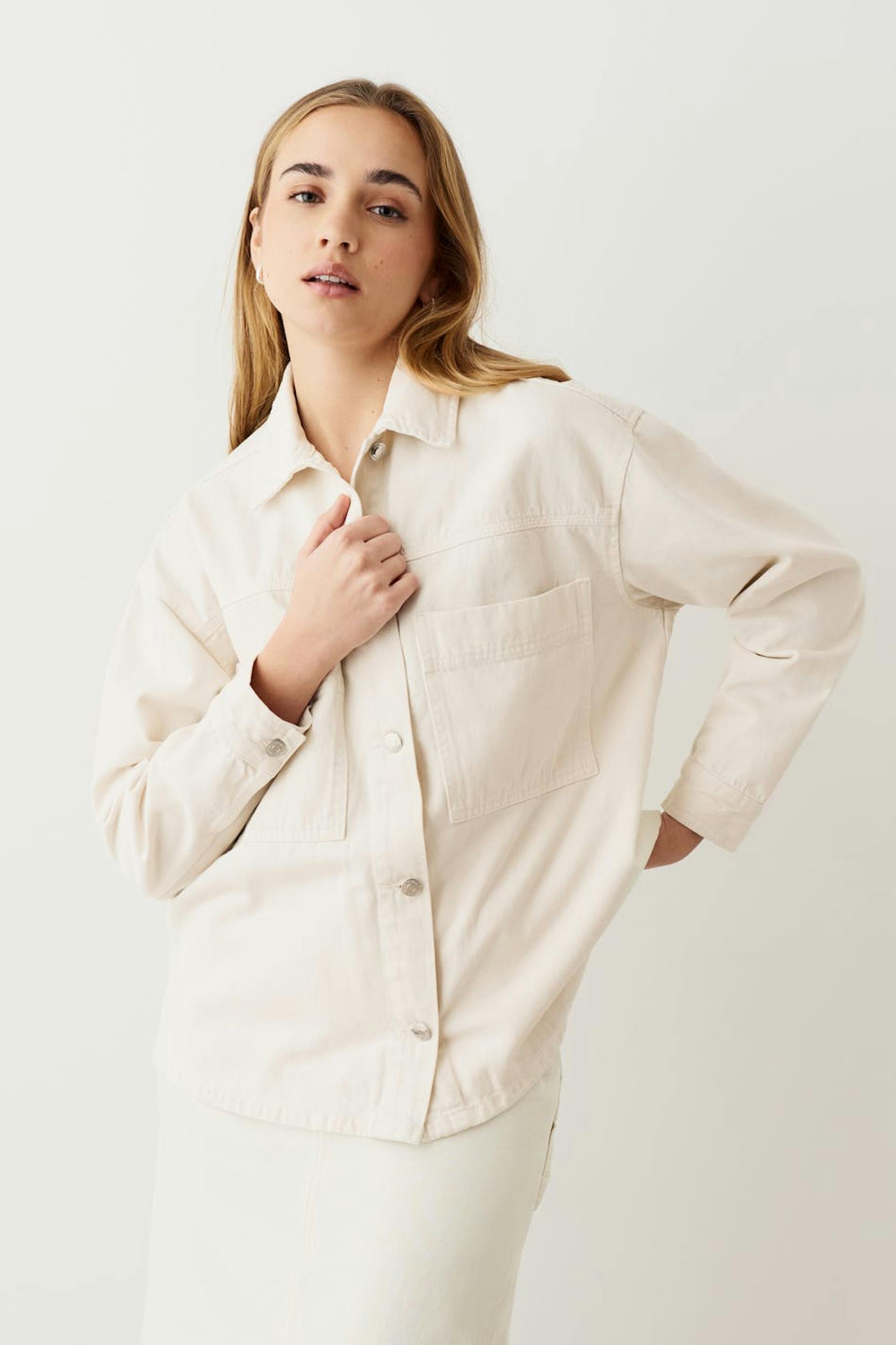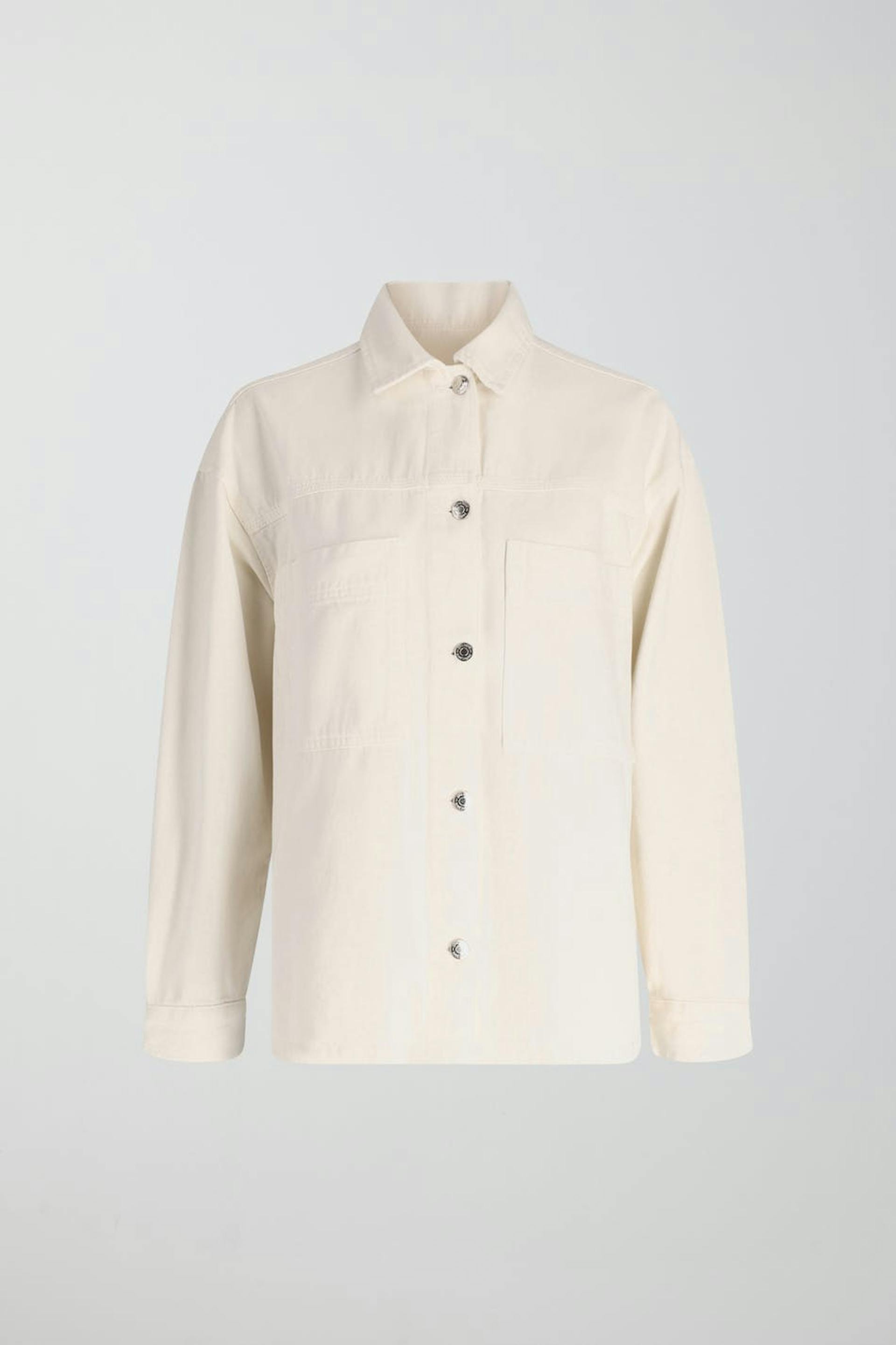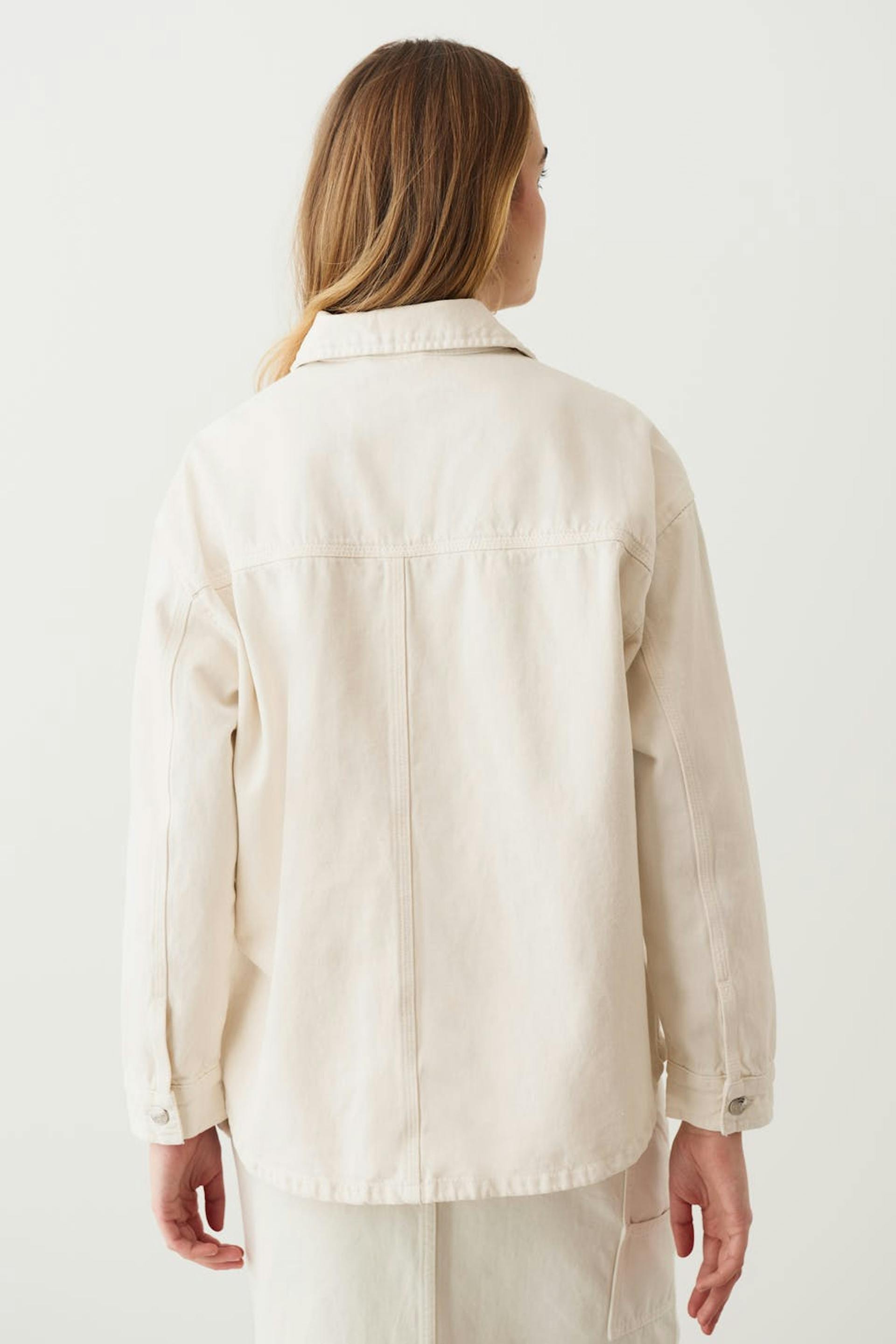 Oversized denim jacket with chest pockets. The jacket is white and has button placket at the front. It has collar, vent in the sides and button on the sleeve ends.