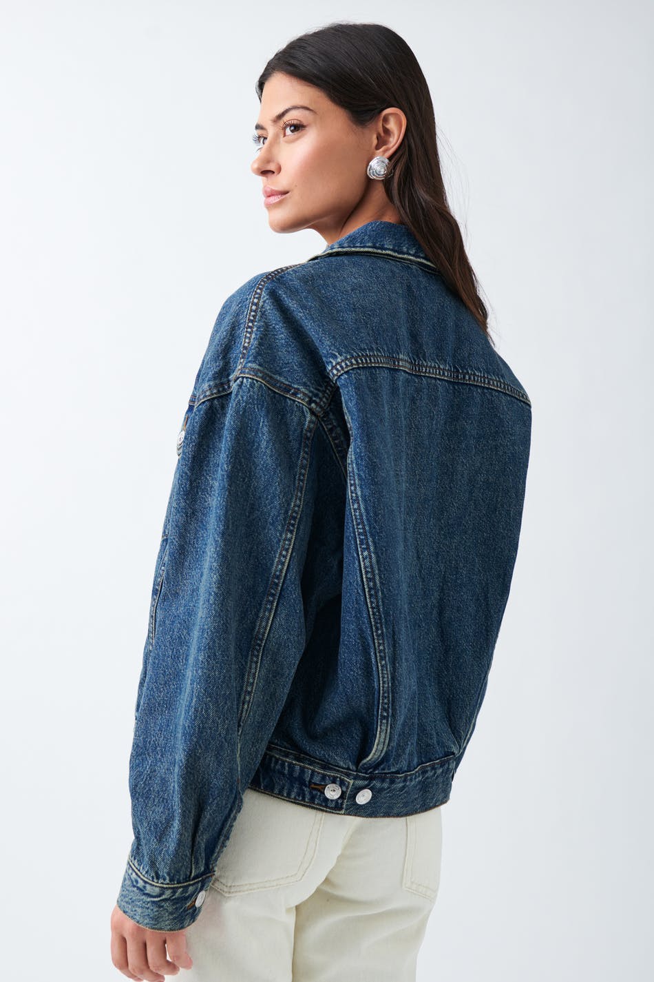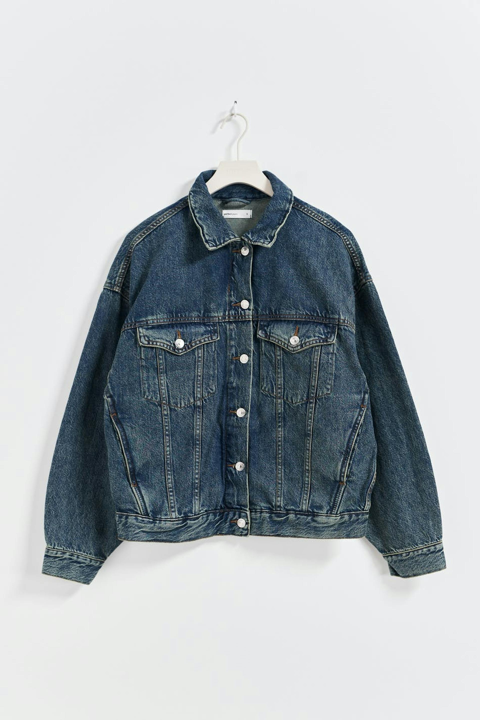 Oversized denim jacket with vintage look. The jacket is blue and has buttoning at the front. It has dropped shoulder, chest pockets with flaps, collar, adjustable tab with button in the sides and long sleeve with button and cuff.