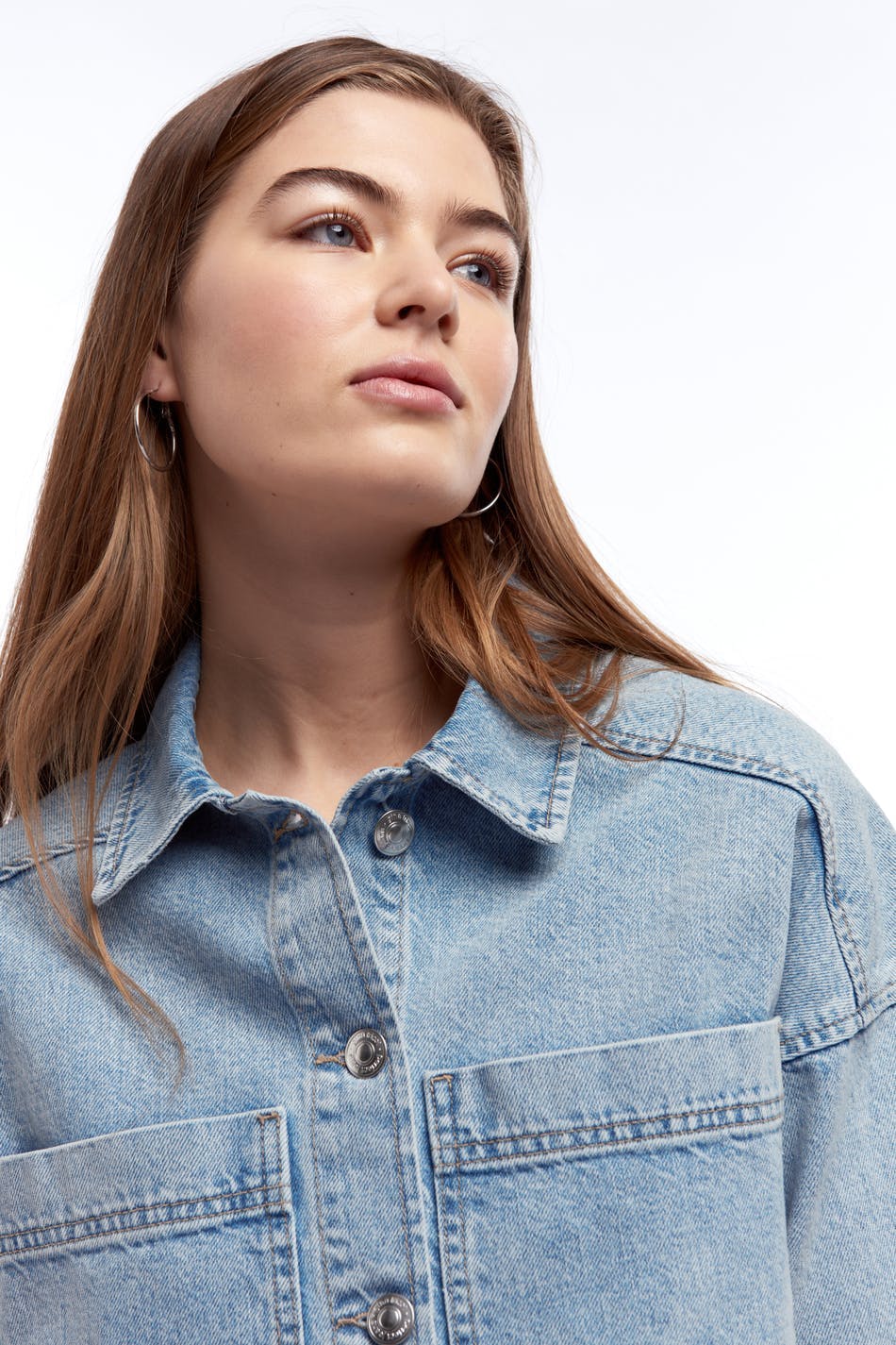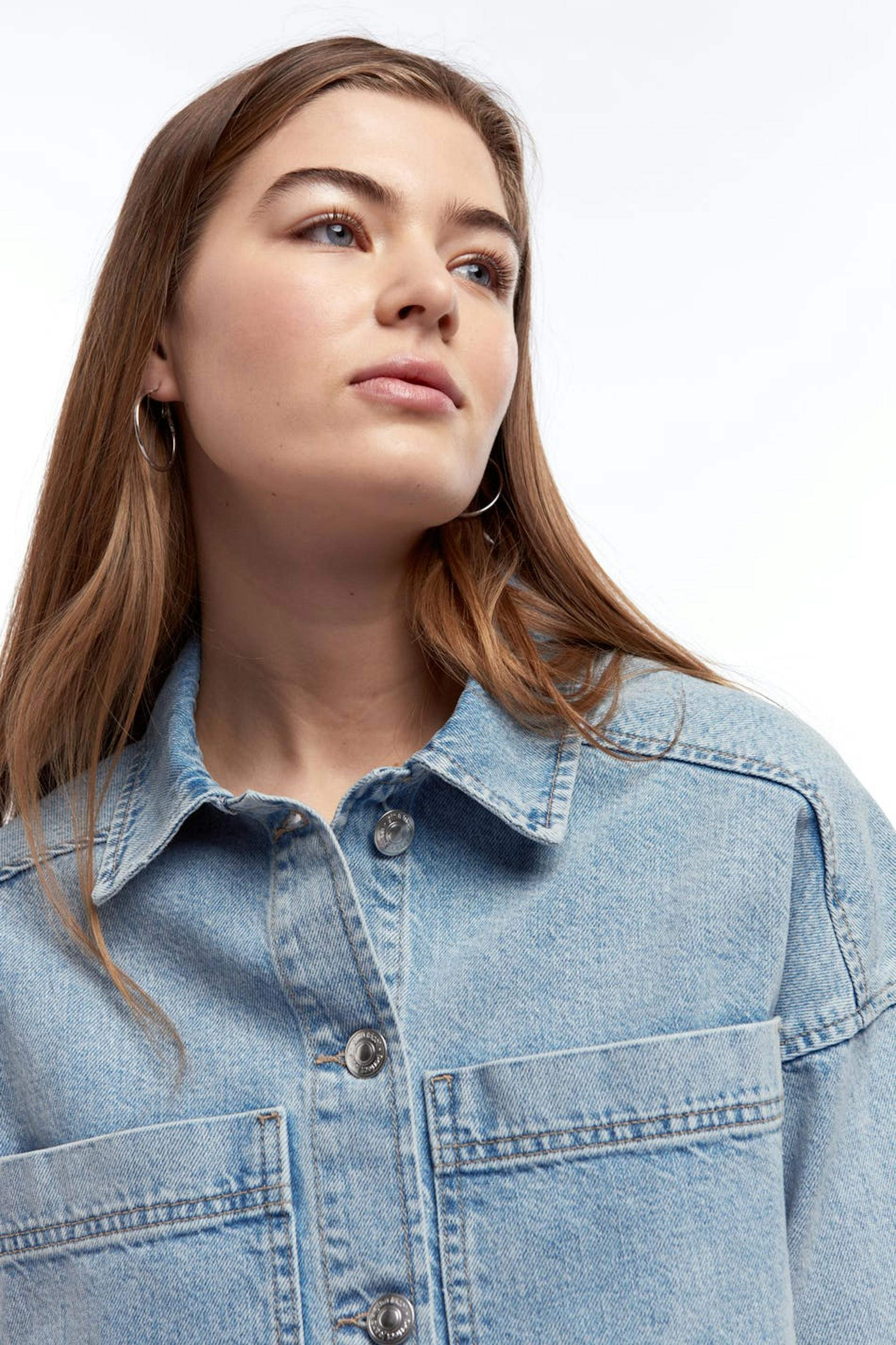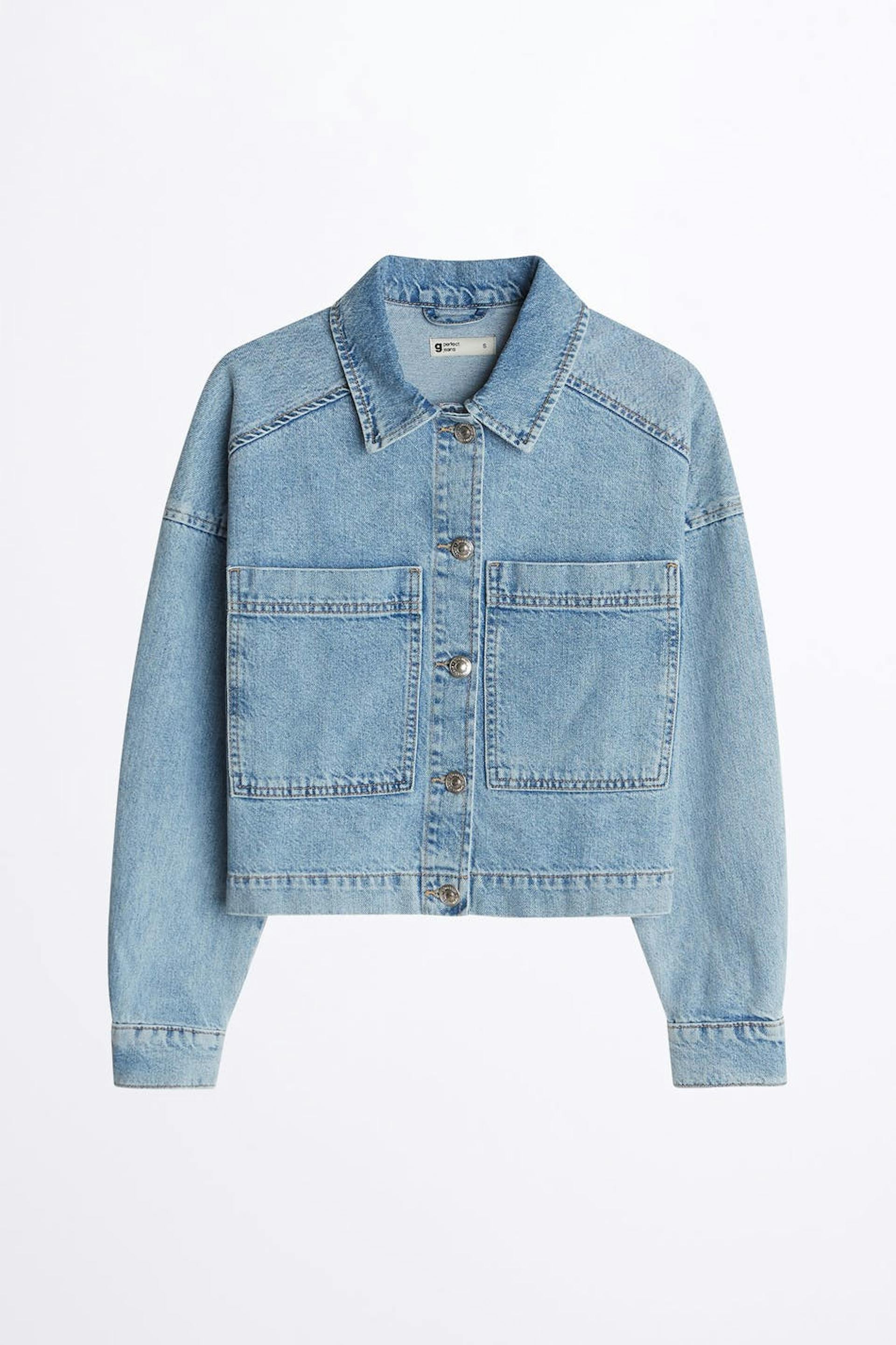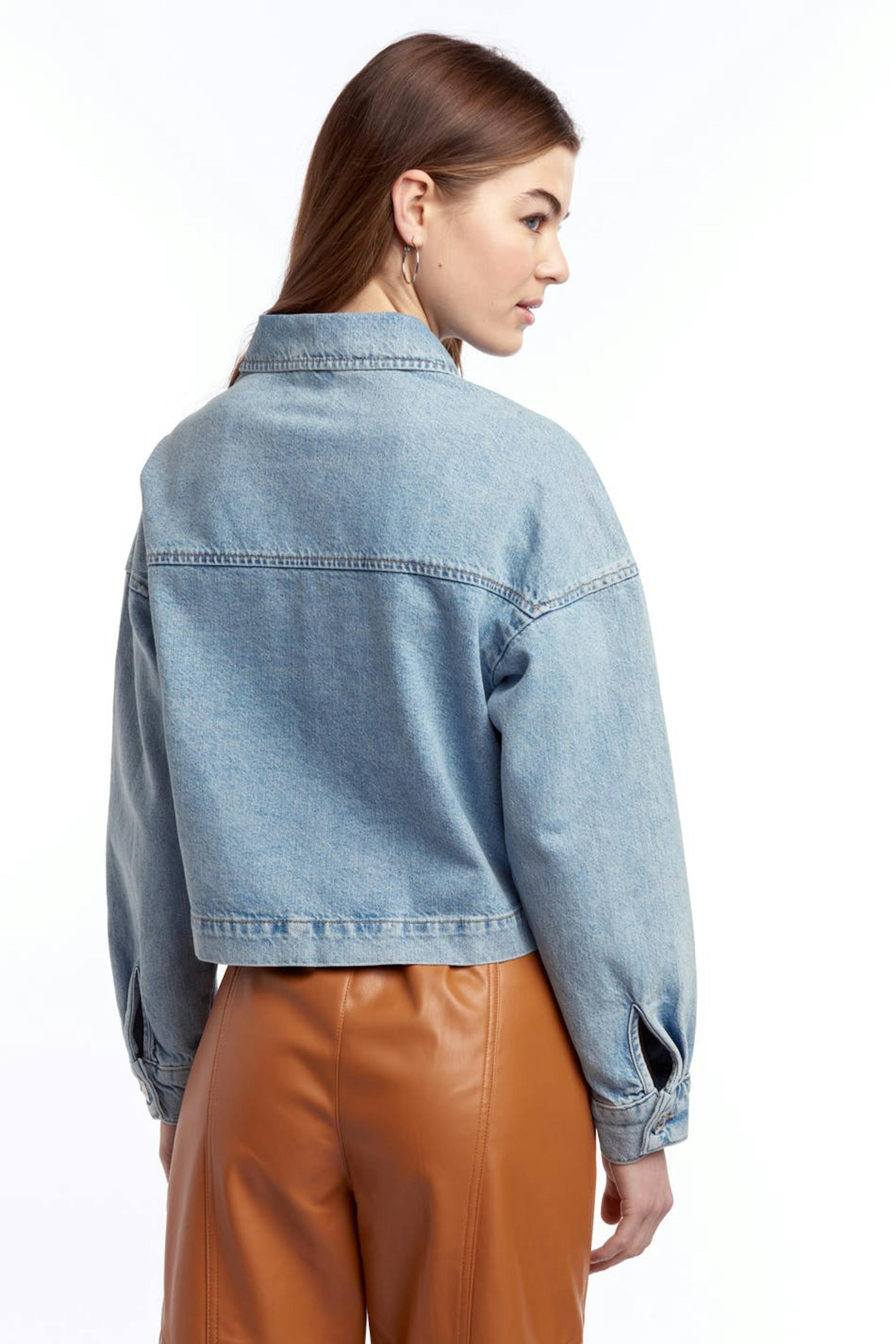 Short denim jacket with an oversize fit. The jacket is light-blue and non-stretch and has pockets at the front. It is made of denim.