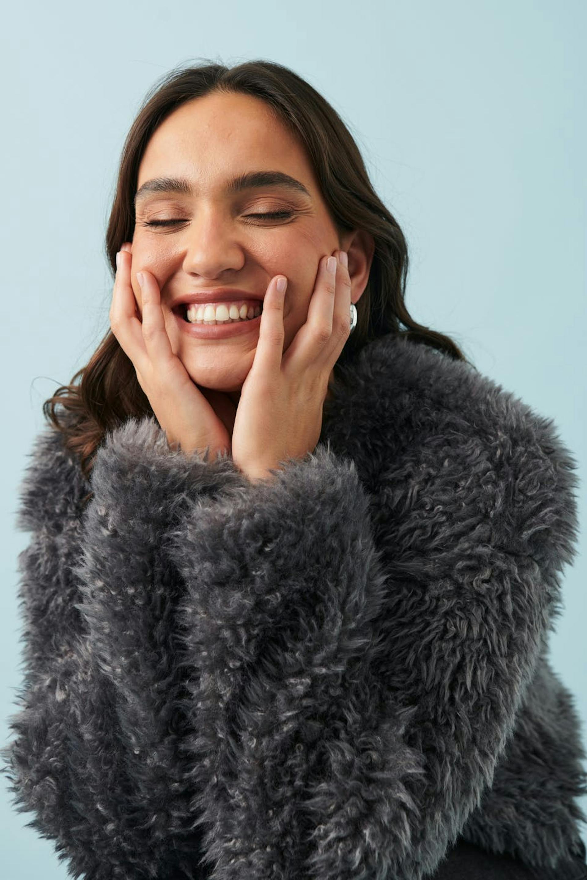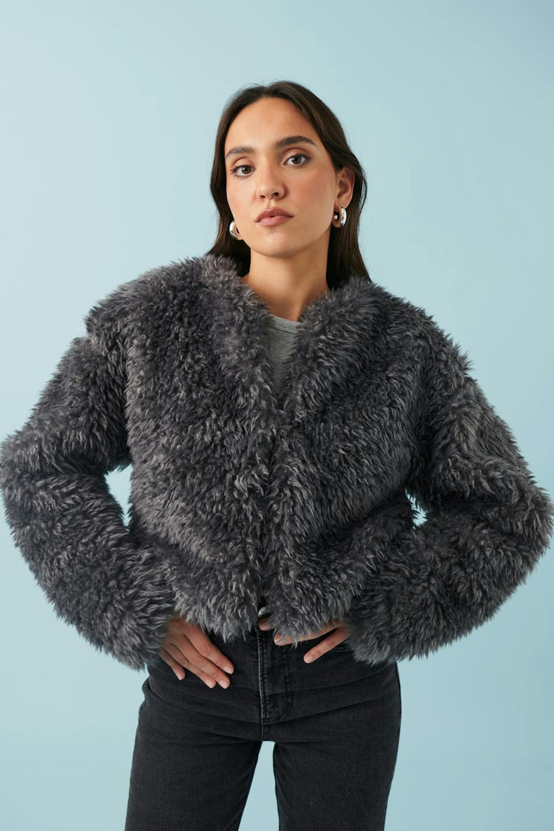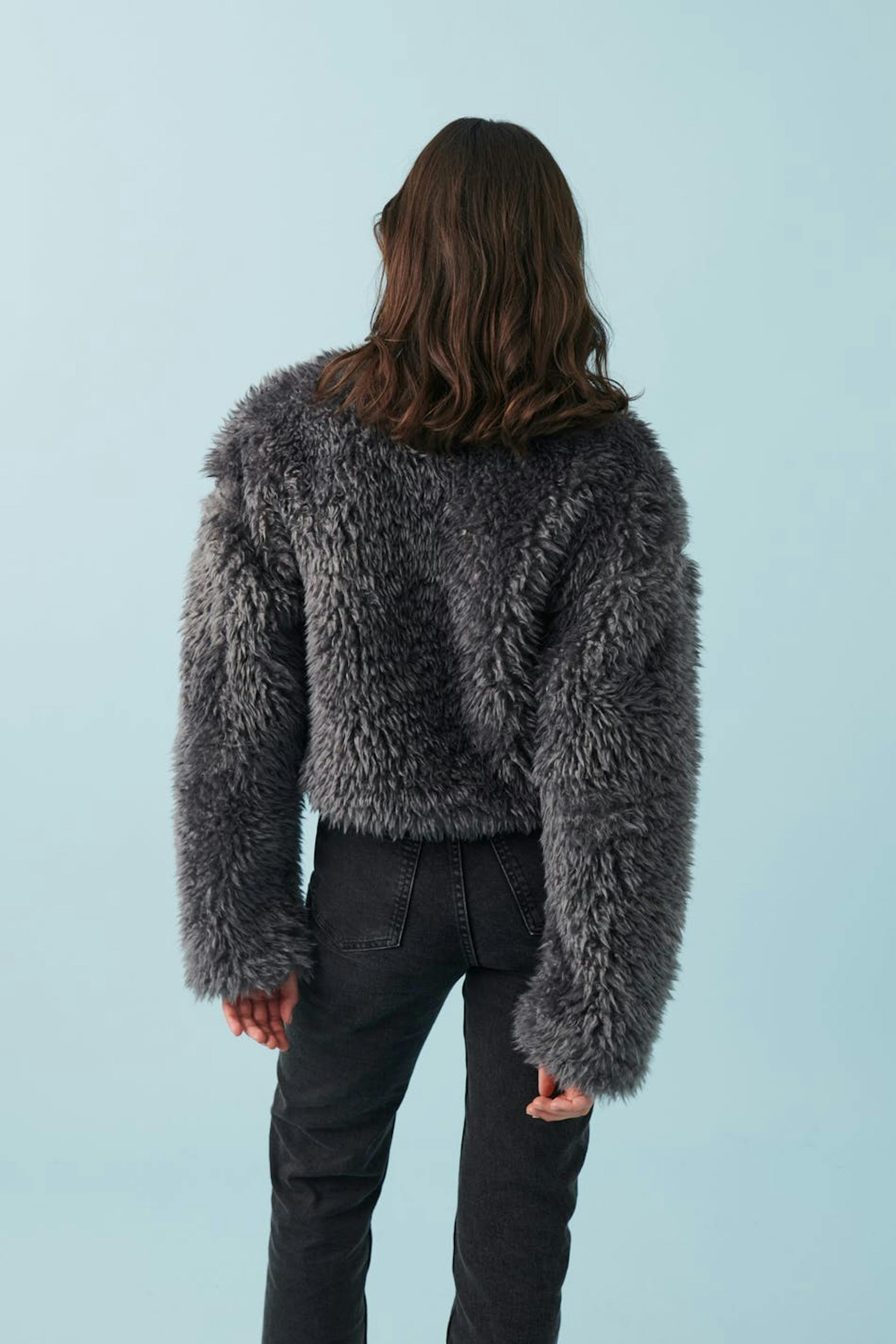 Short jacket in faux fur with oversize fit. The jacket is grey and lined and has hook-and-eye closure at the front.