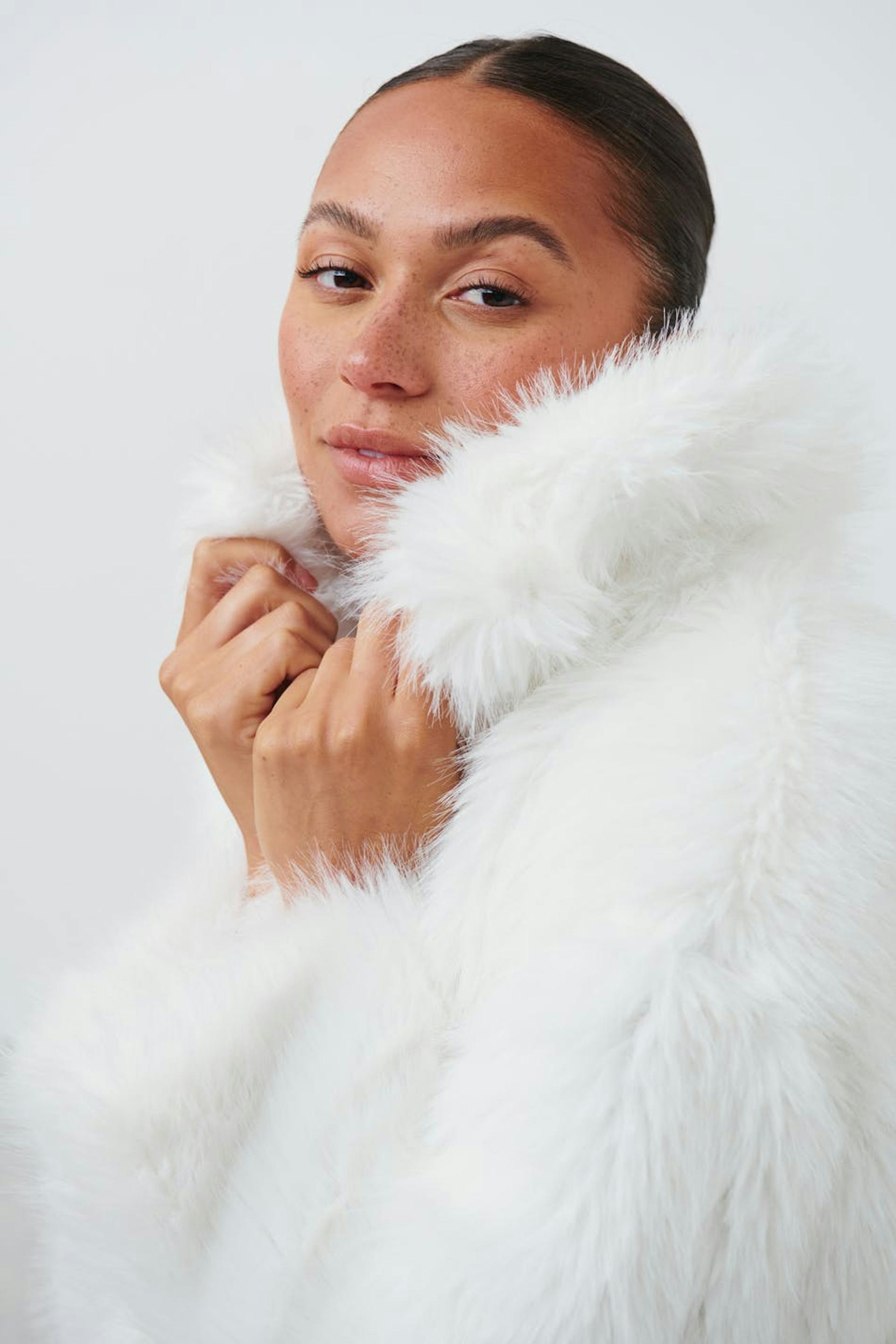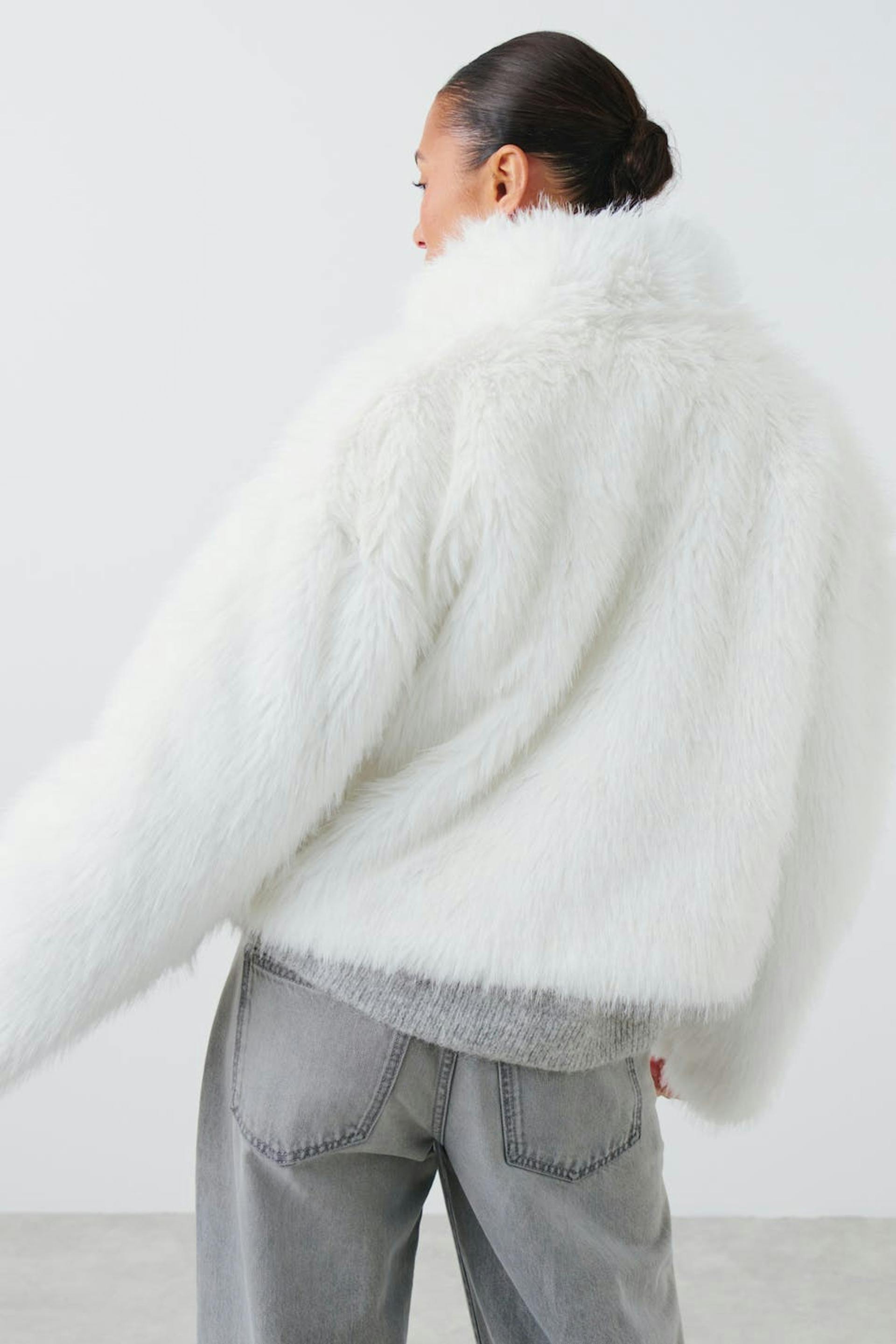 Short jacket in faux fur with high collar. The jacket is white, fluffy and lined. It has hidden pocket at the side and oversize fit.