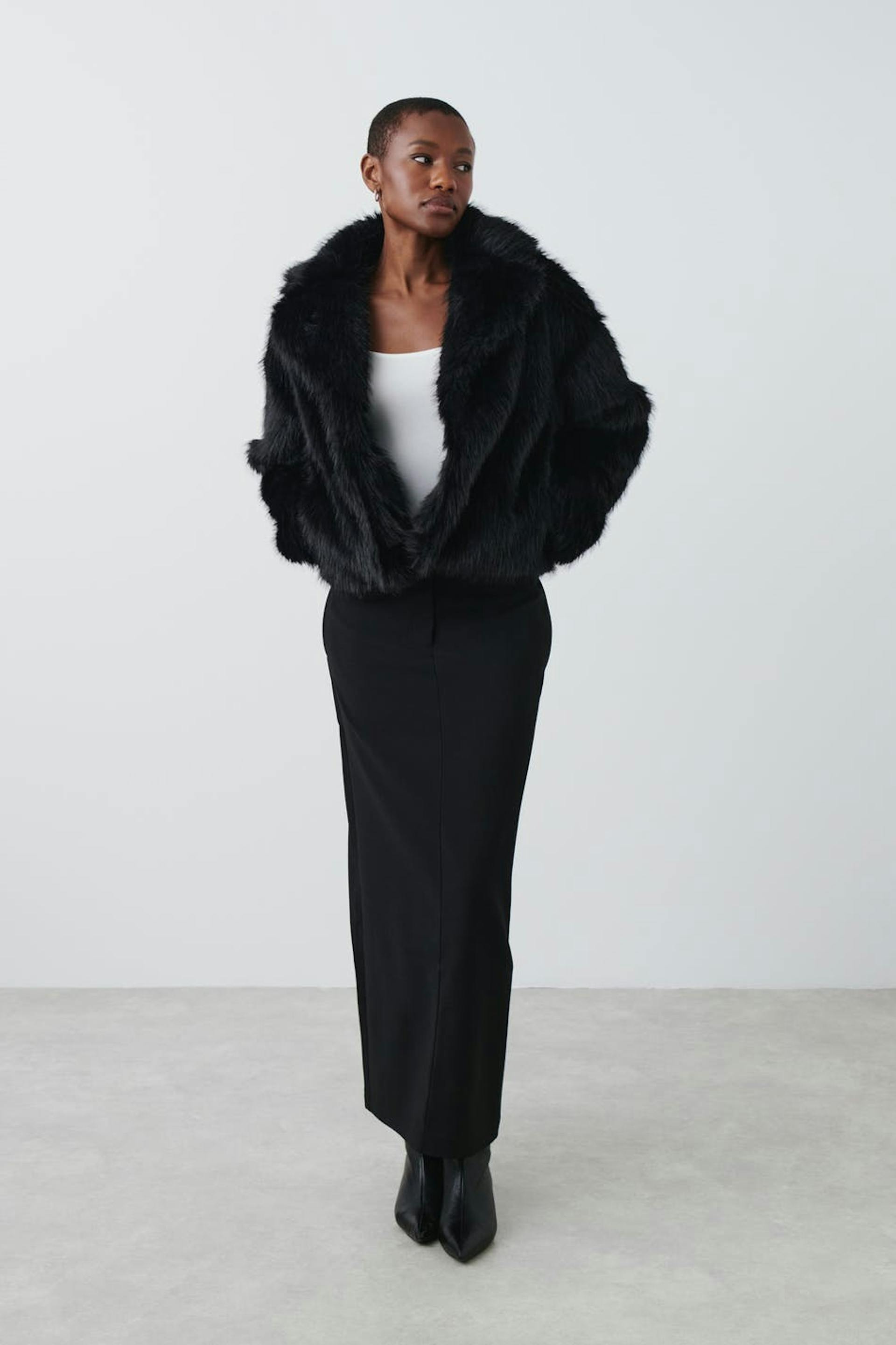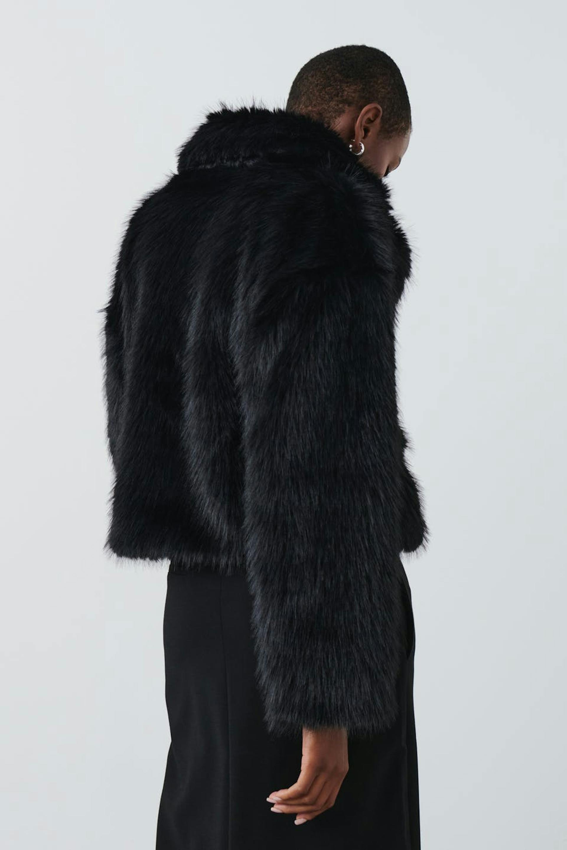 Short jacket in faux fur with high collar. The jacket is black, fluffy and lined. It has hidden pocket at the side and oversize fit.