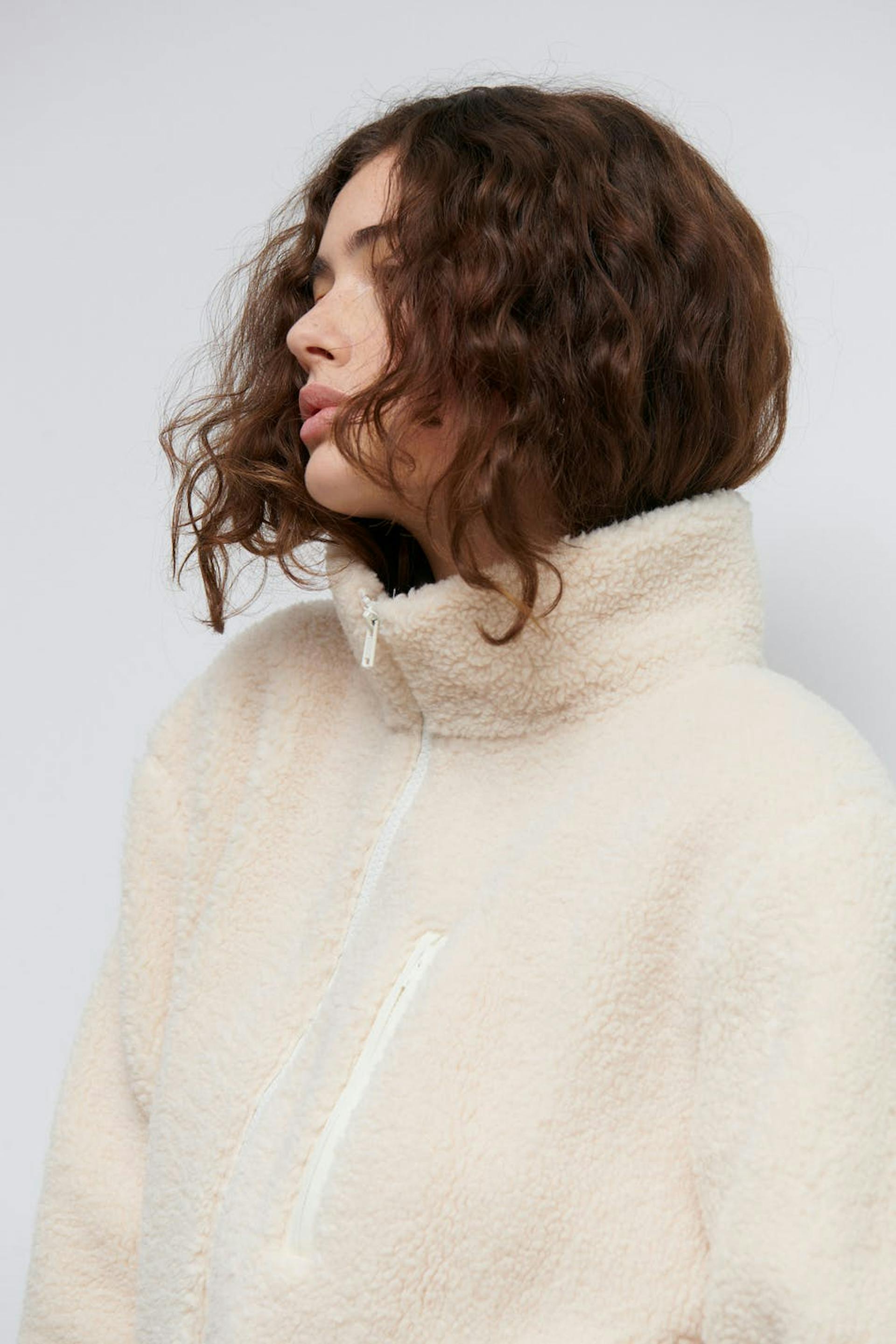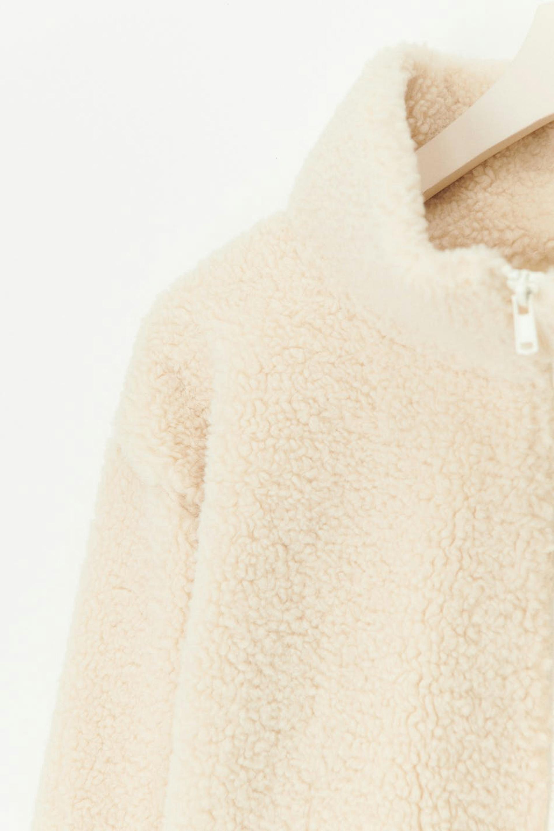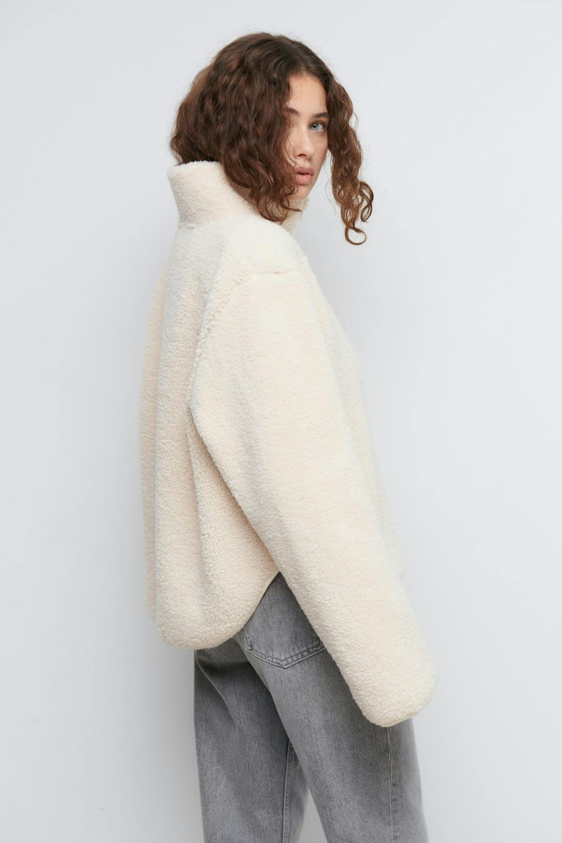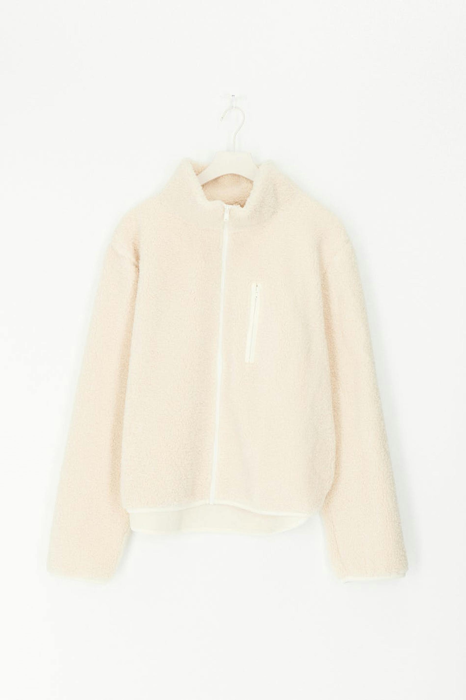Teddy jacket with oversize fit. The teddy jacket is white and has high collar. It has zip closure in front and chest pocket on the left side.