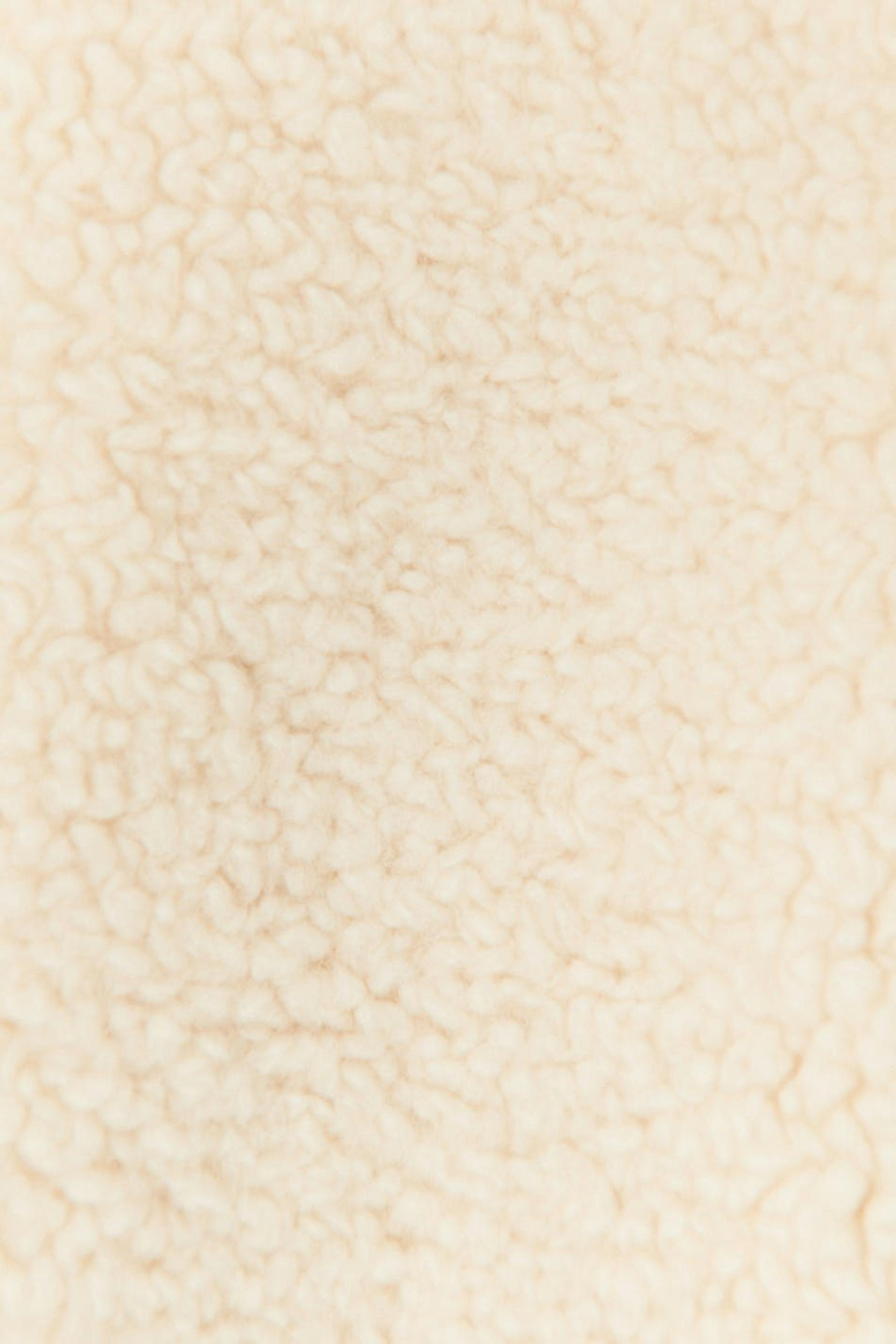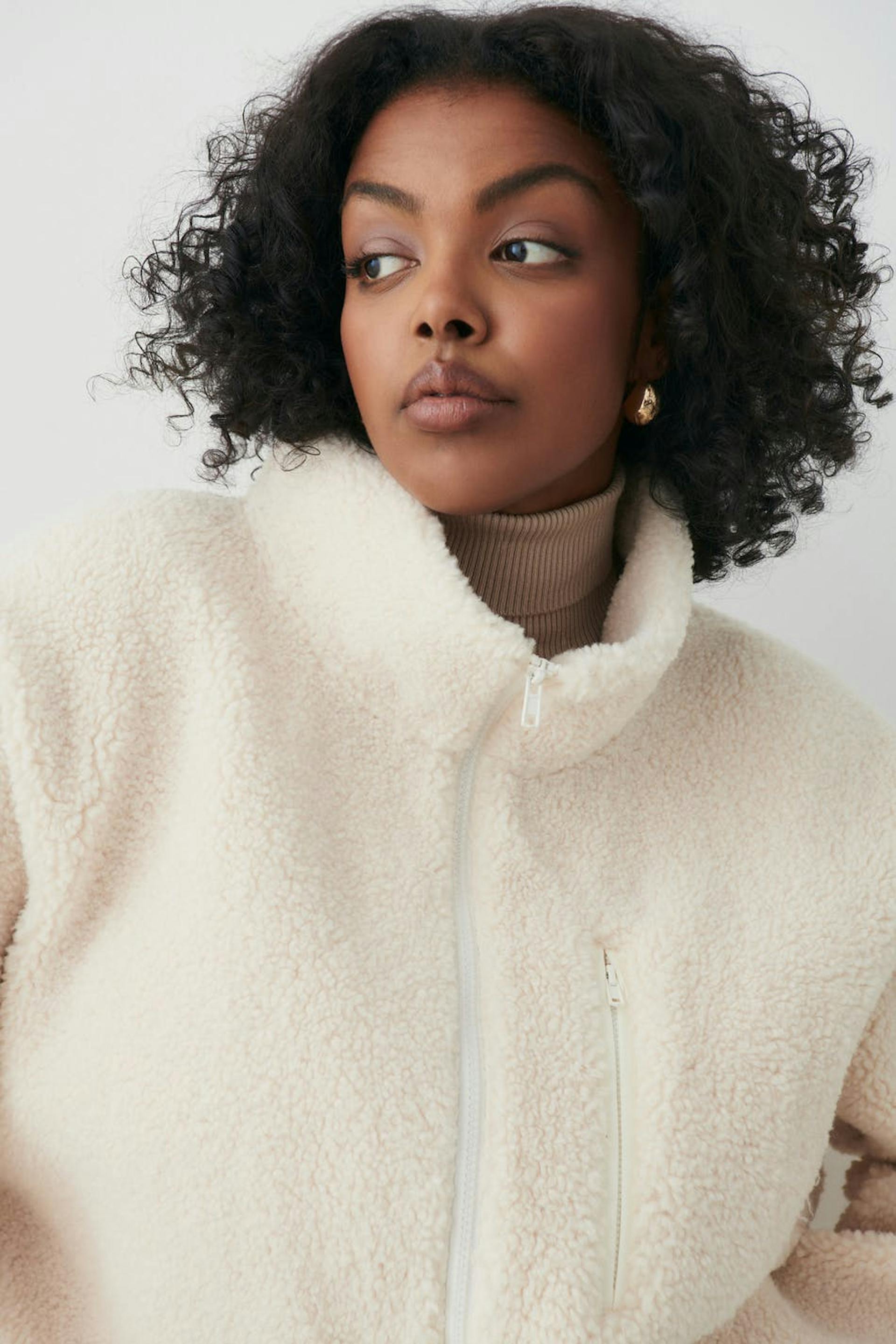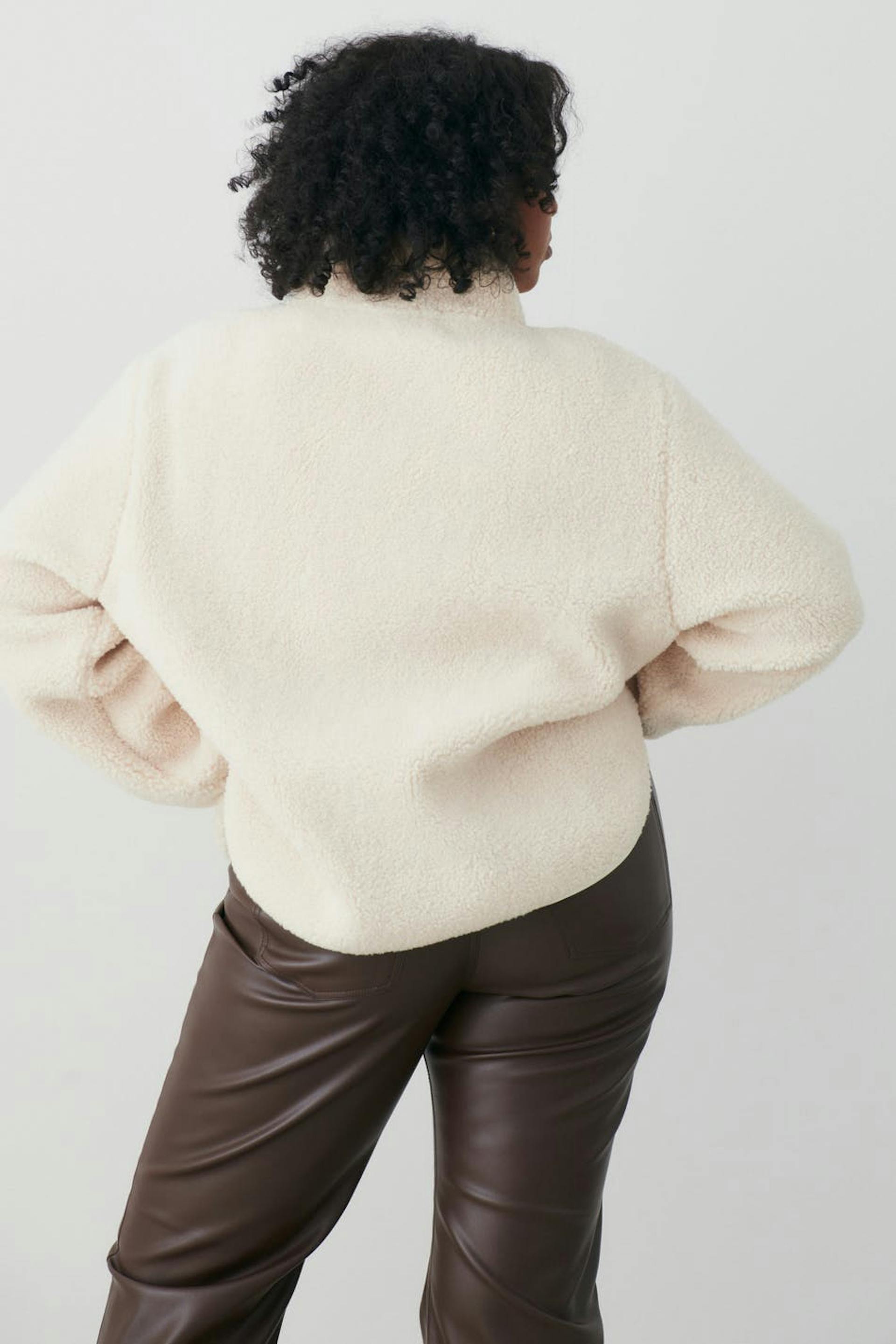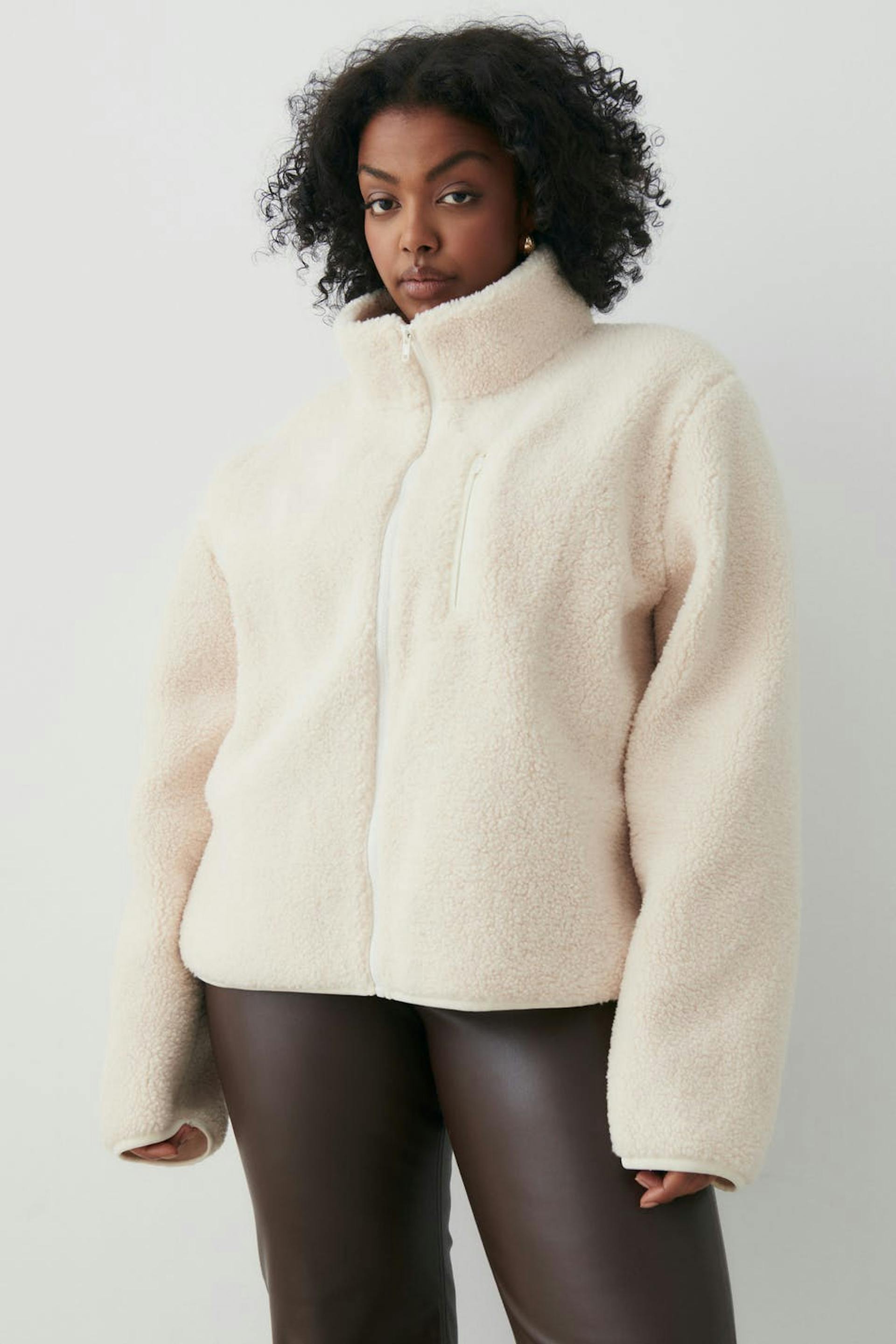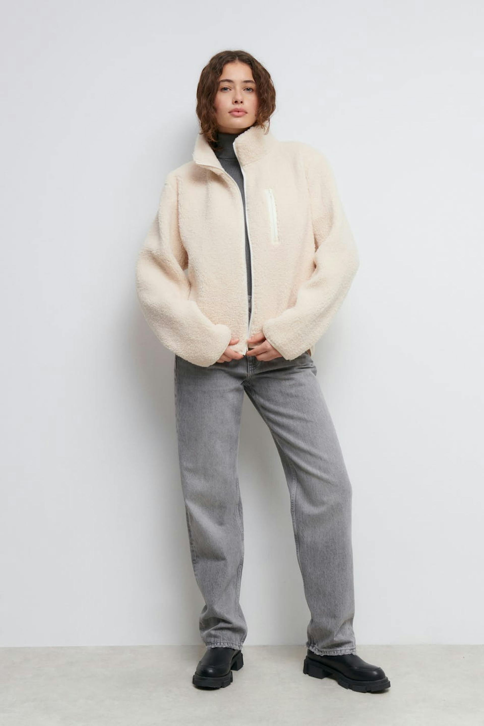 Teddy jacket with oversize fit. The teddy jacket is white and has high collar. It has zip closure in front and chest pocket on the left side.