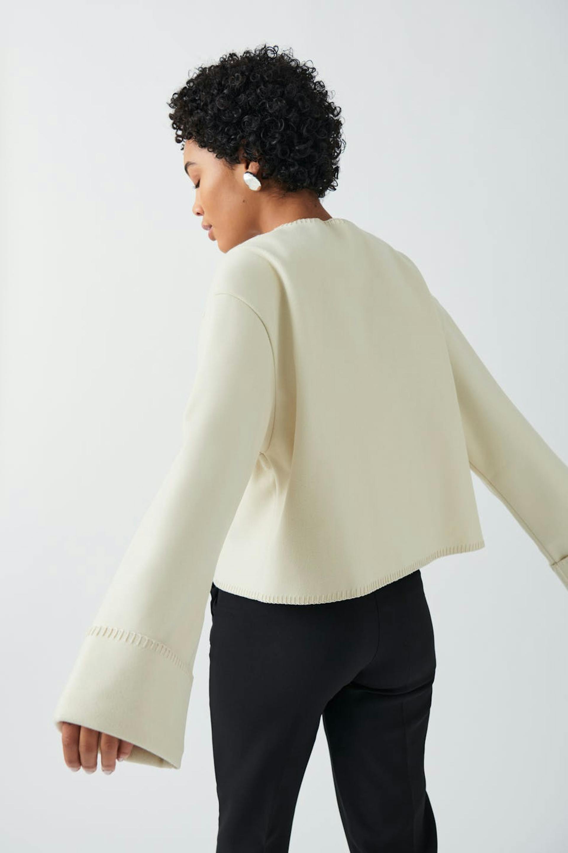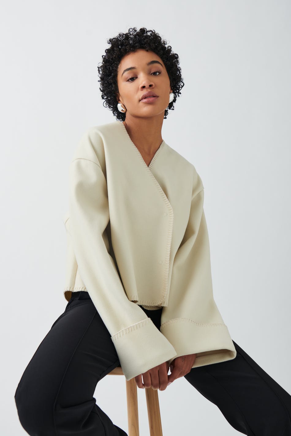 Short jacket in jersey with an oversize fit. The jacket is beige and has V-neck. It has snap button closure in front and wide sleeve.