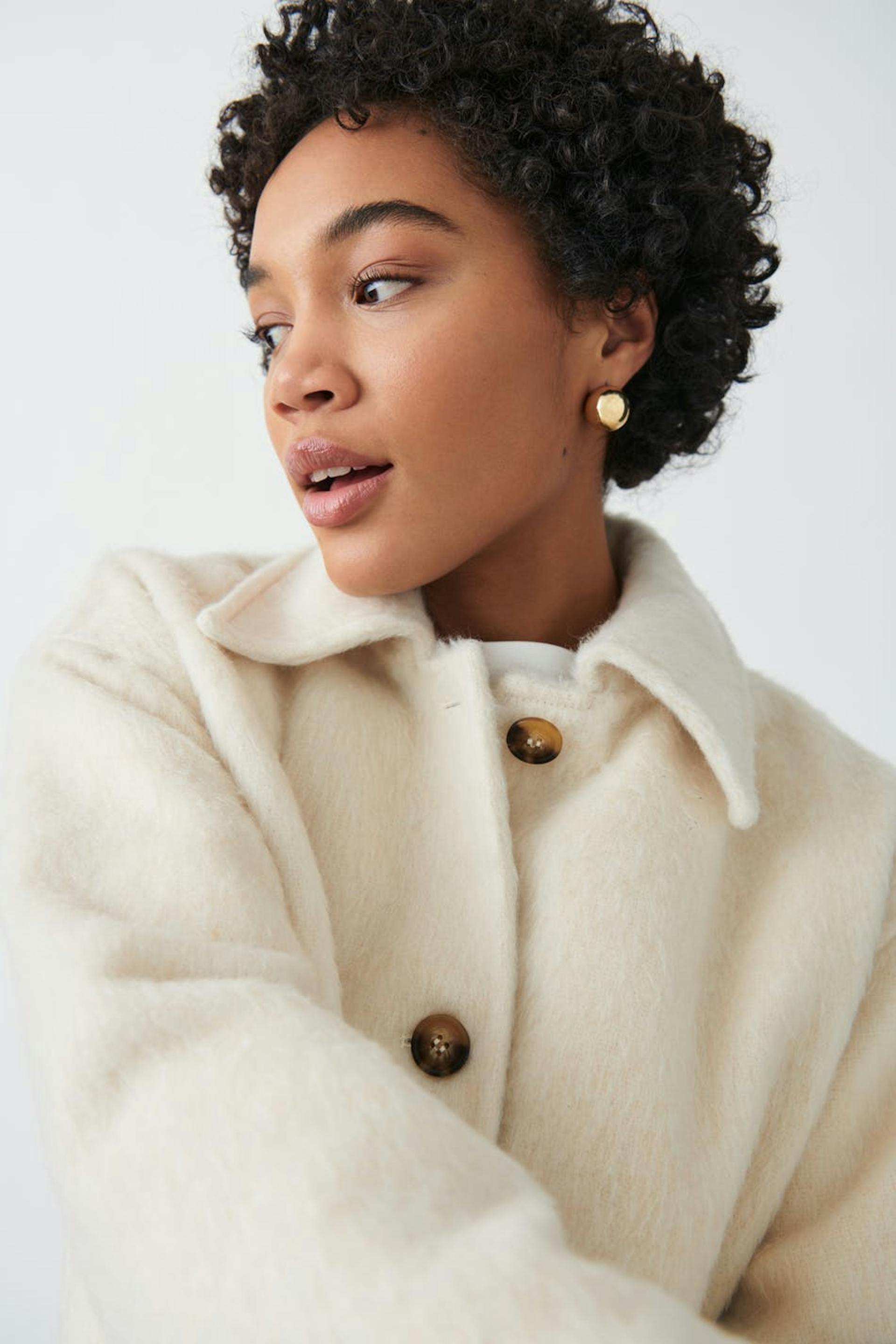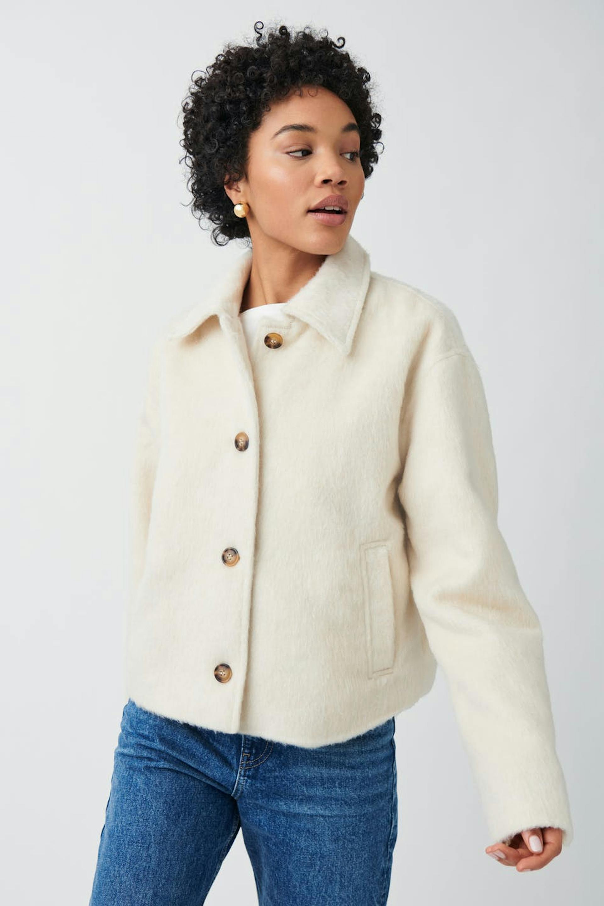Short jacket with boxy fit. The jacket is white and has buttoning at the front. It has woven quality, collar and pockets in the sides.