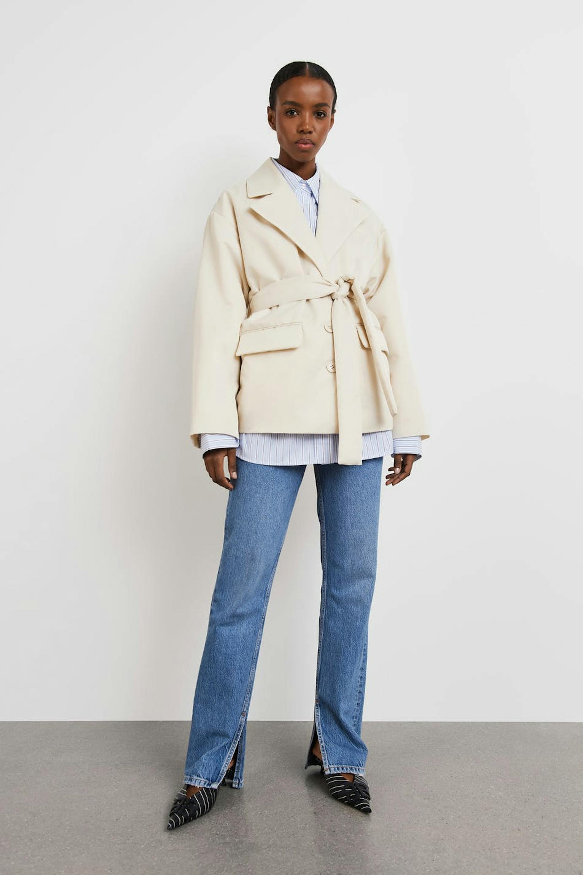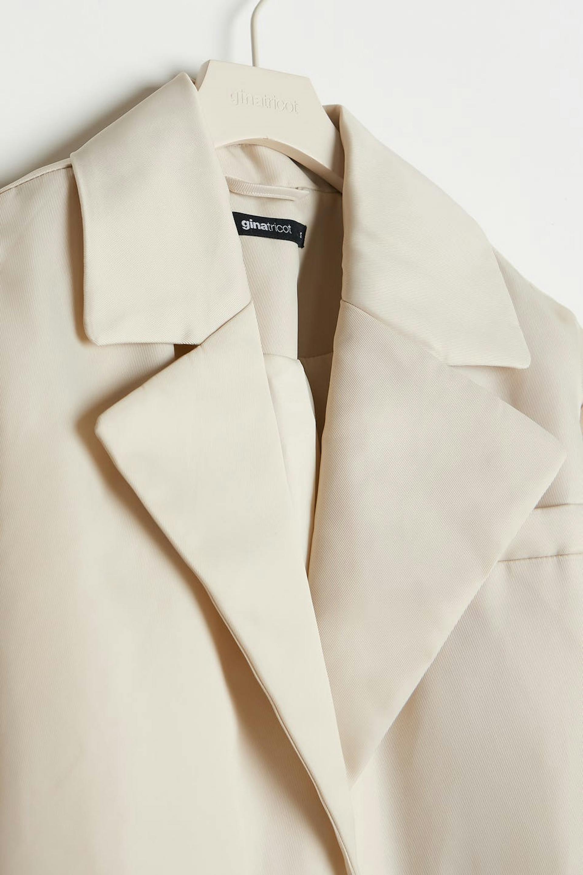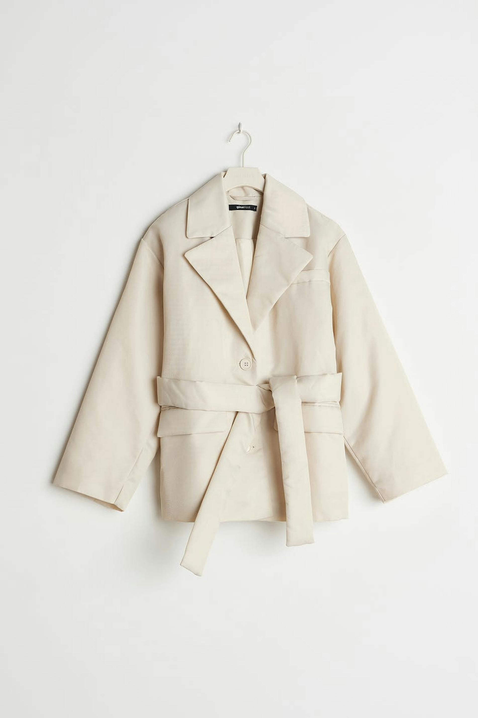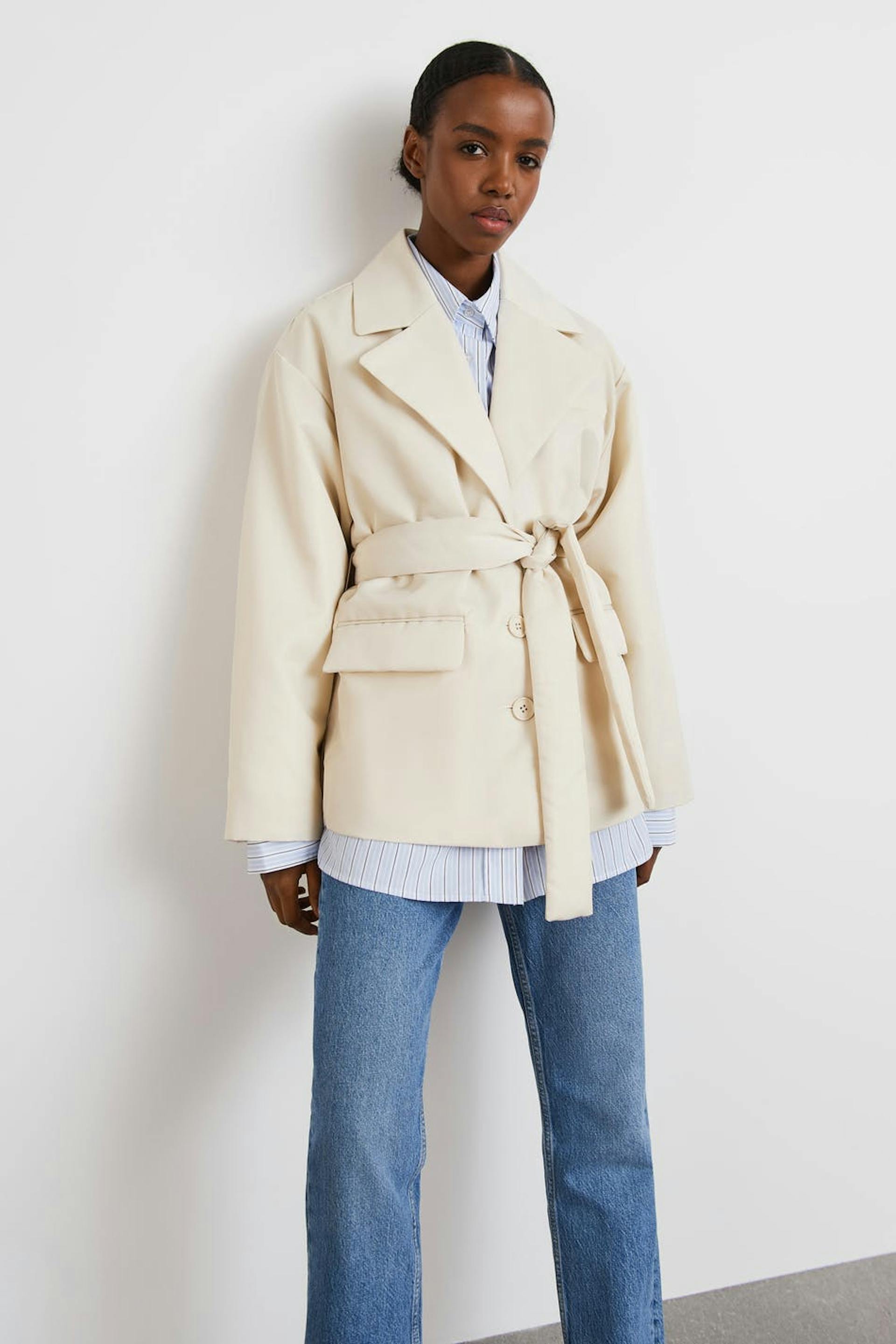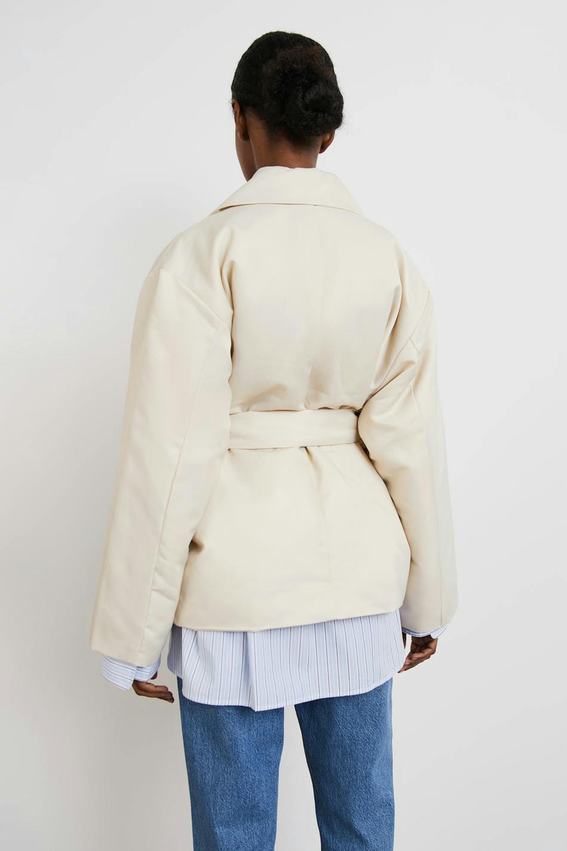 Padded jacket with a belt tie at the waist. The jacket is white and has a collar. It has flap pockets on the sides and a button closure at the front.