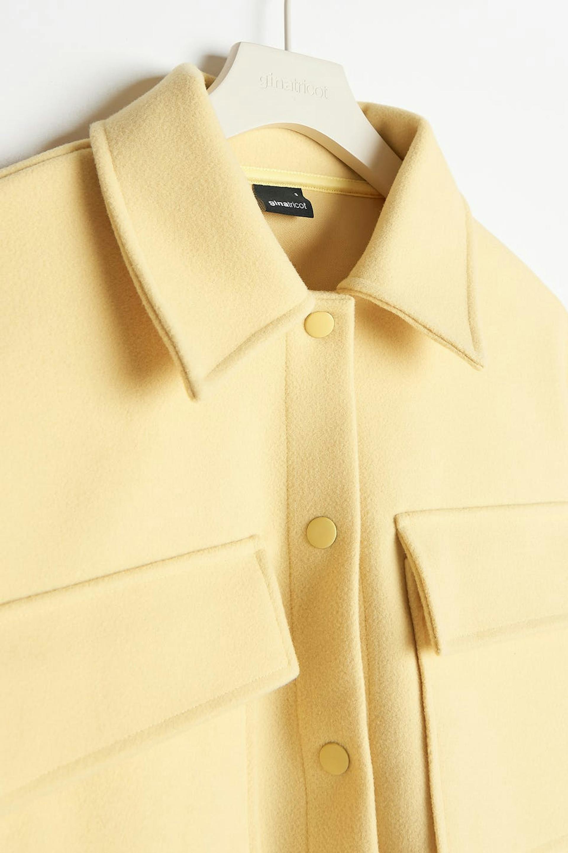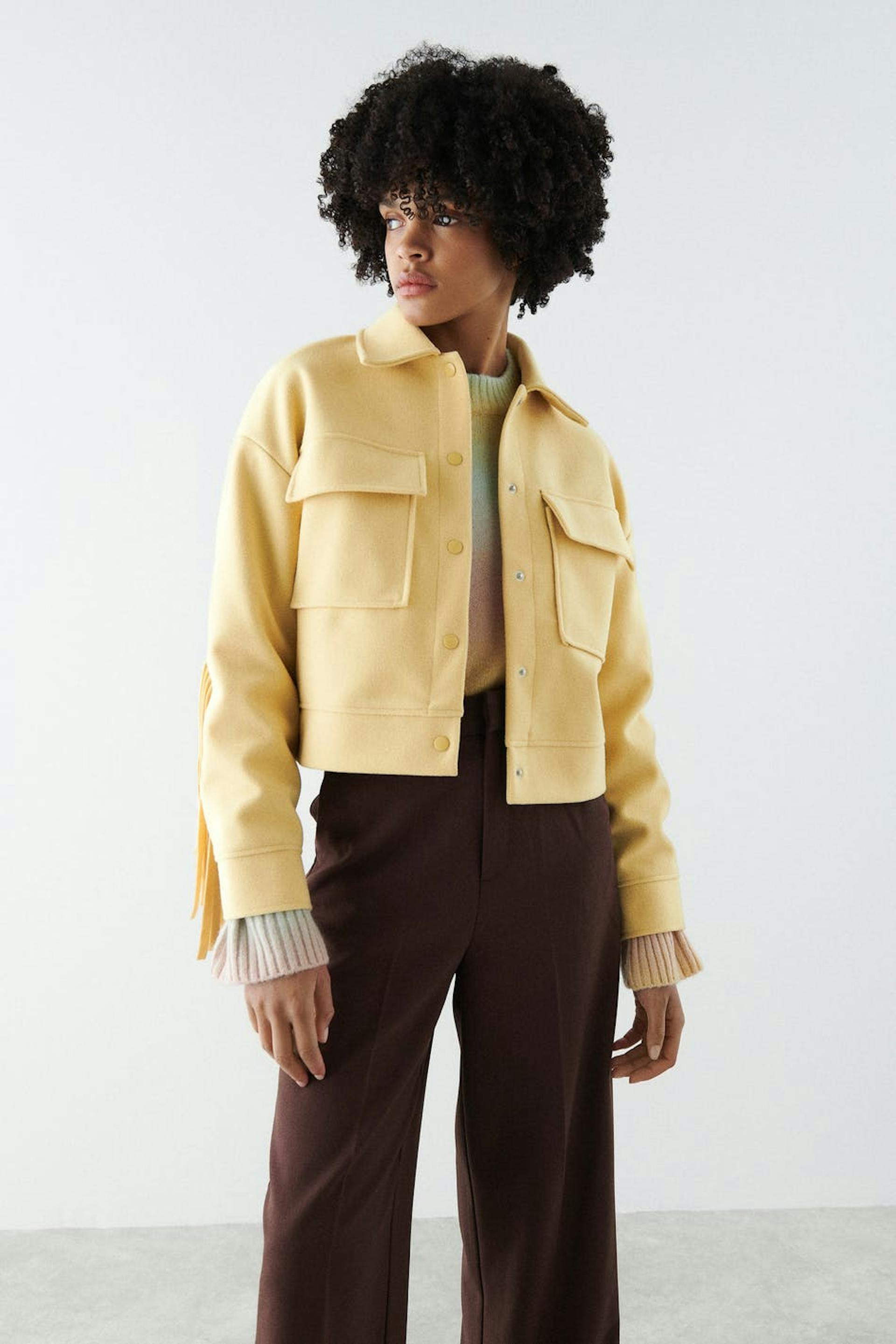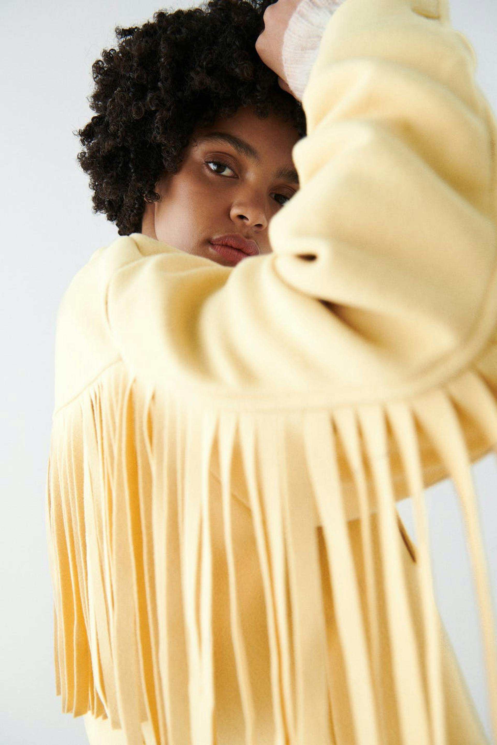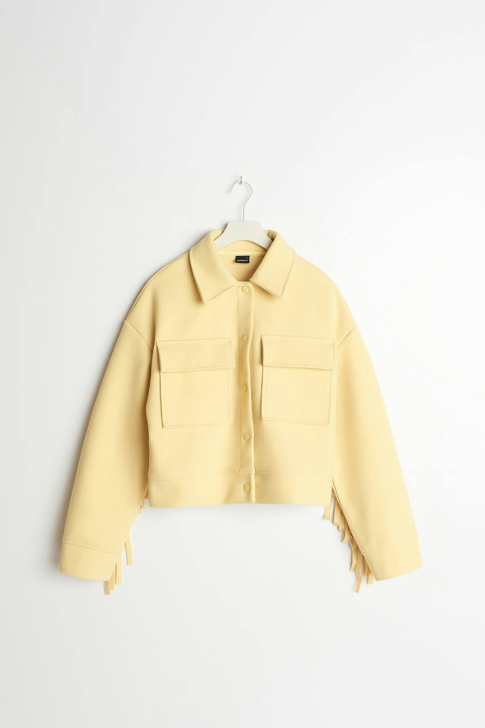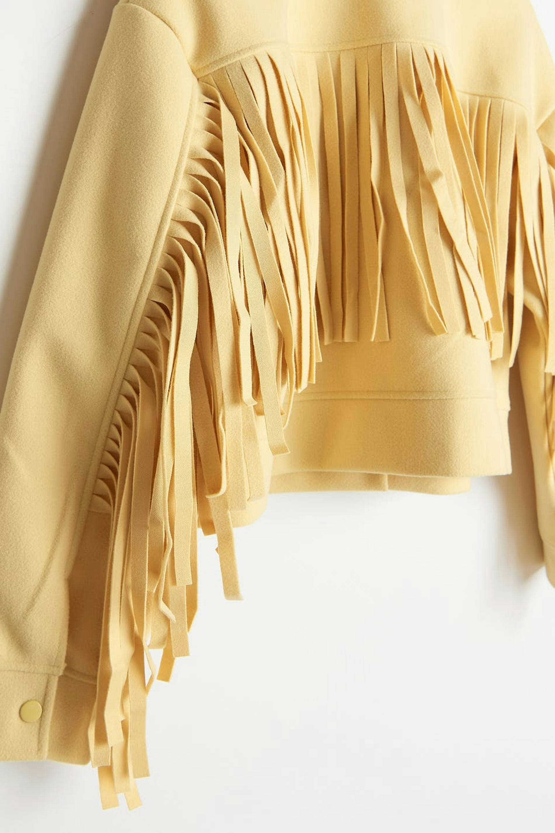Jacket with fringes in the back and along both sleeves. The jacket is yellow and has a felted fabric. It has a collar, push button fastening in front, chest pockets with lid and a short length.