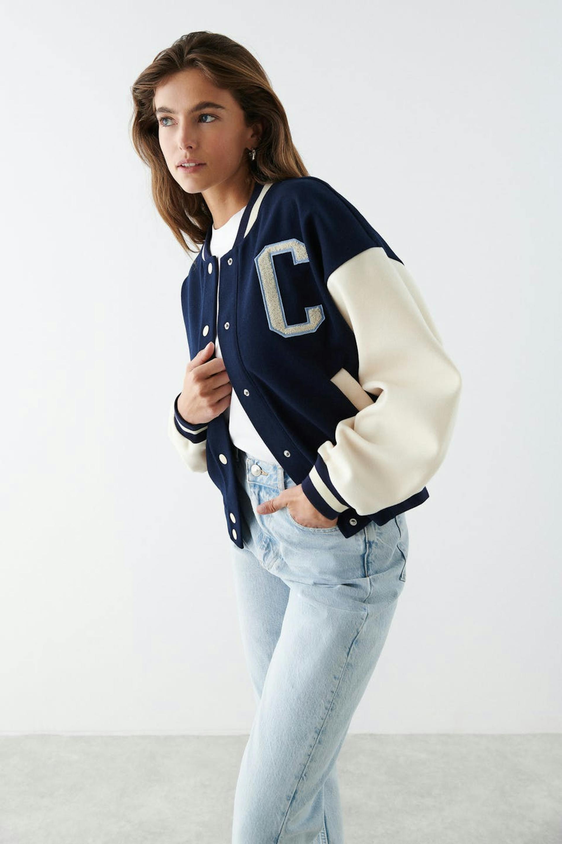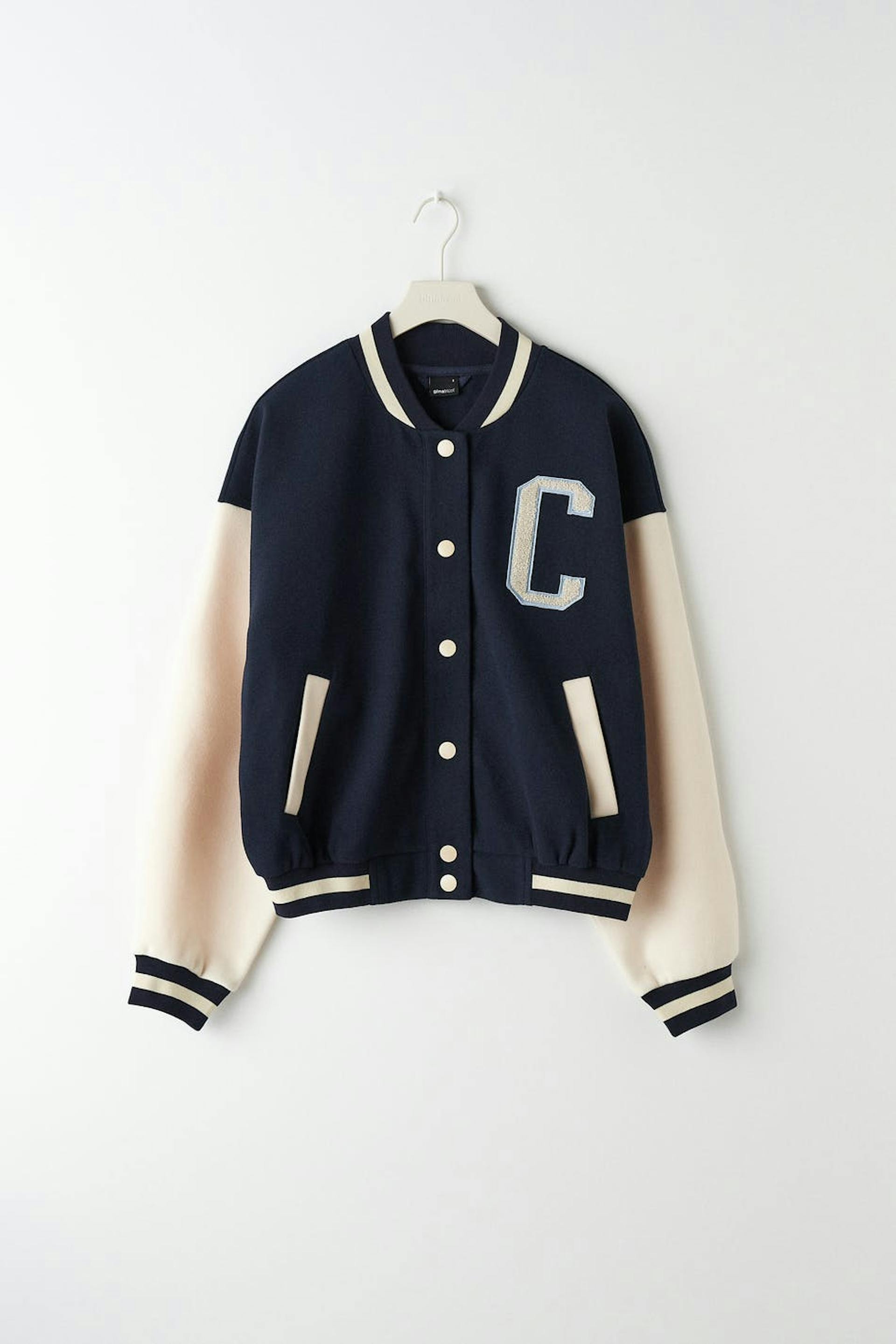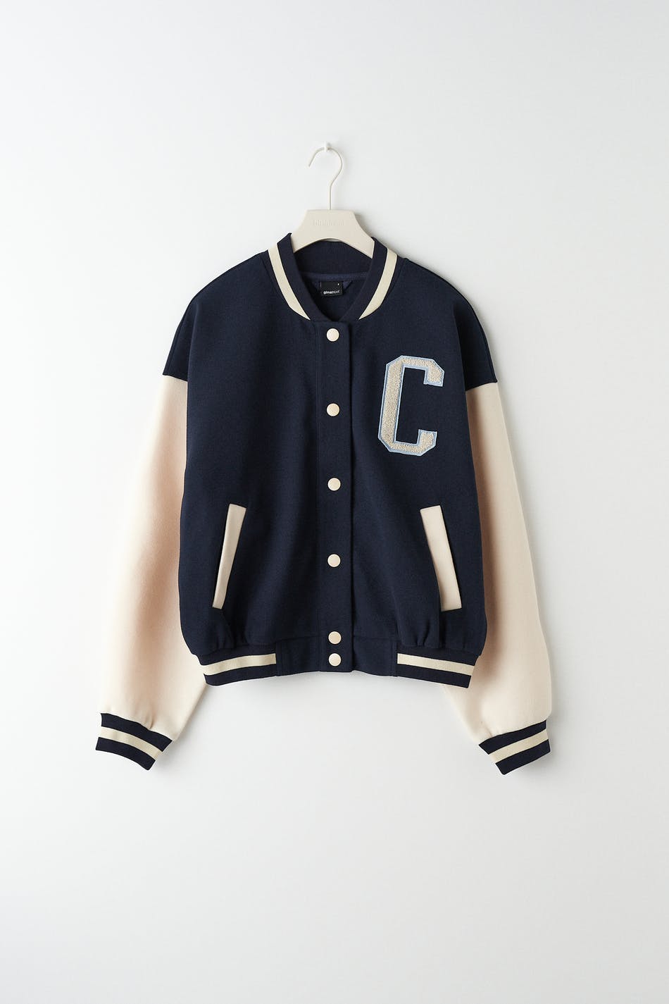 Block-coloured baseball jacket with an oversize fit. The jacket is blue and has a felted fabric. It has snap button closure in front, ribbed collar, pockets on the sides, an embroidered letter on the chest, embroidered text in the back and a striped, ribbed cuff at the bottom and on the sleeve ends.
