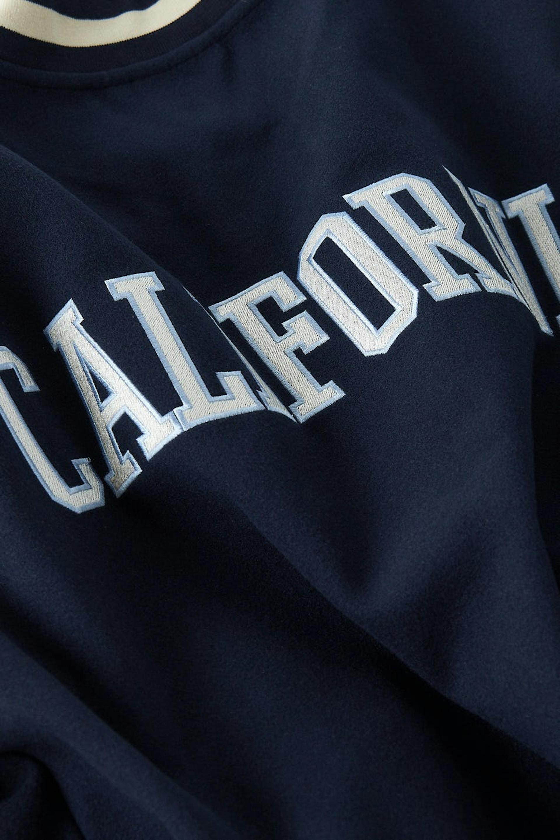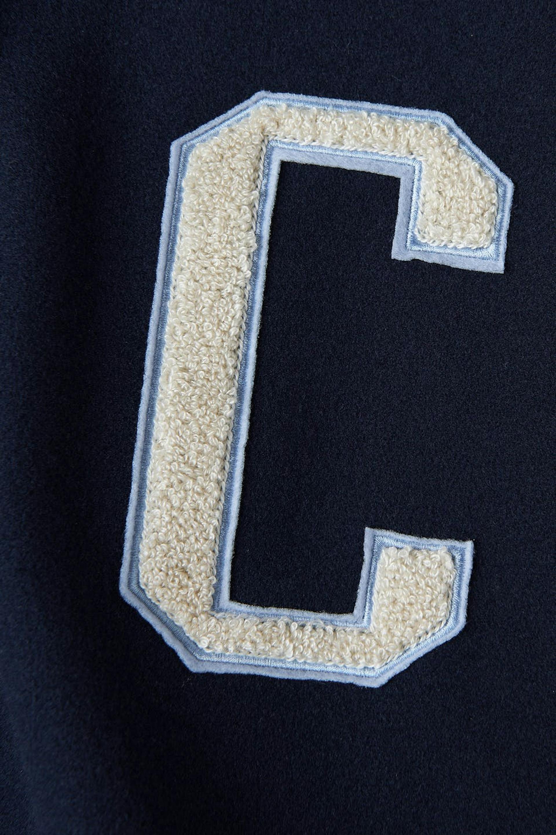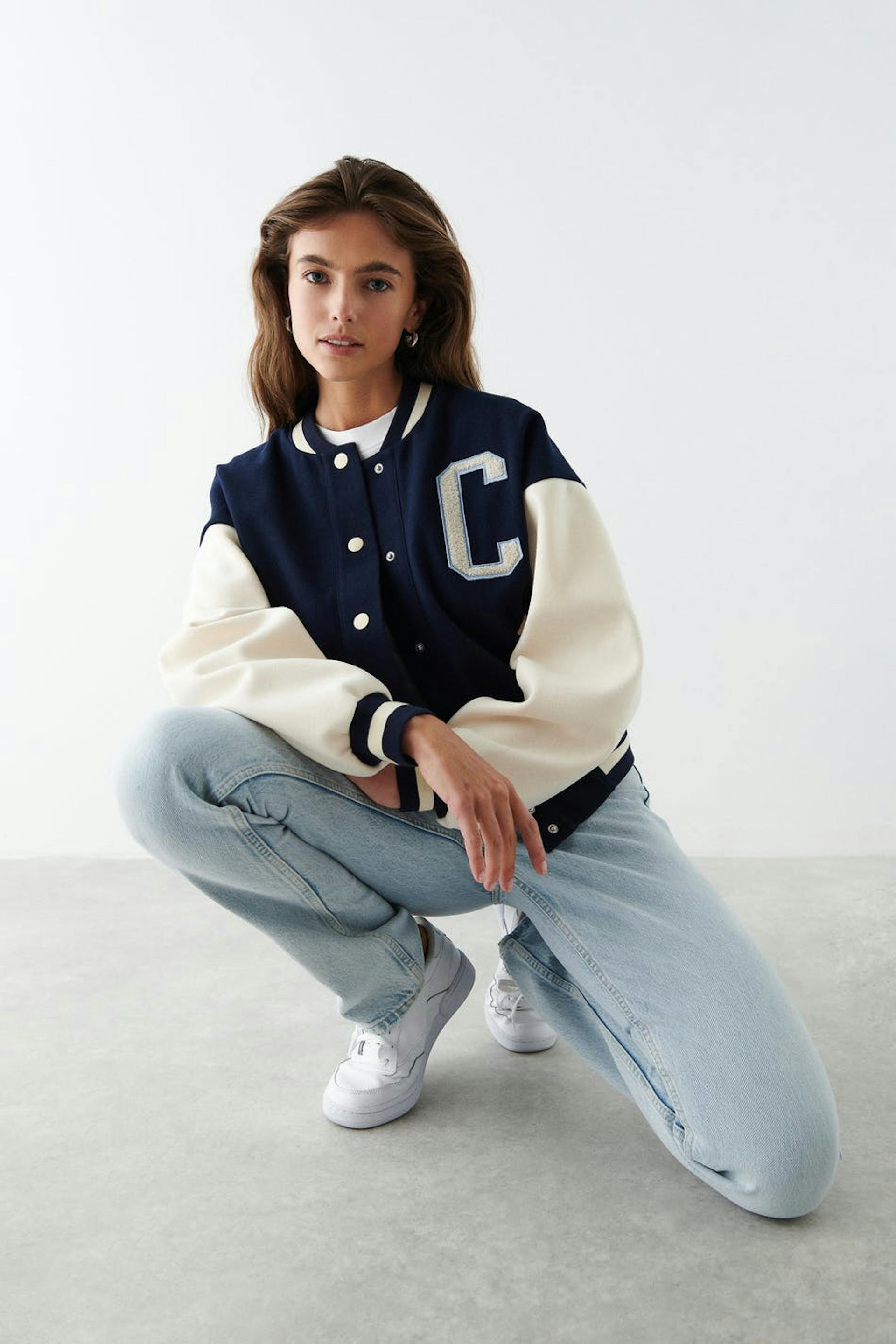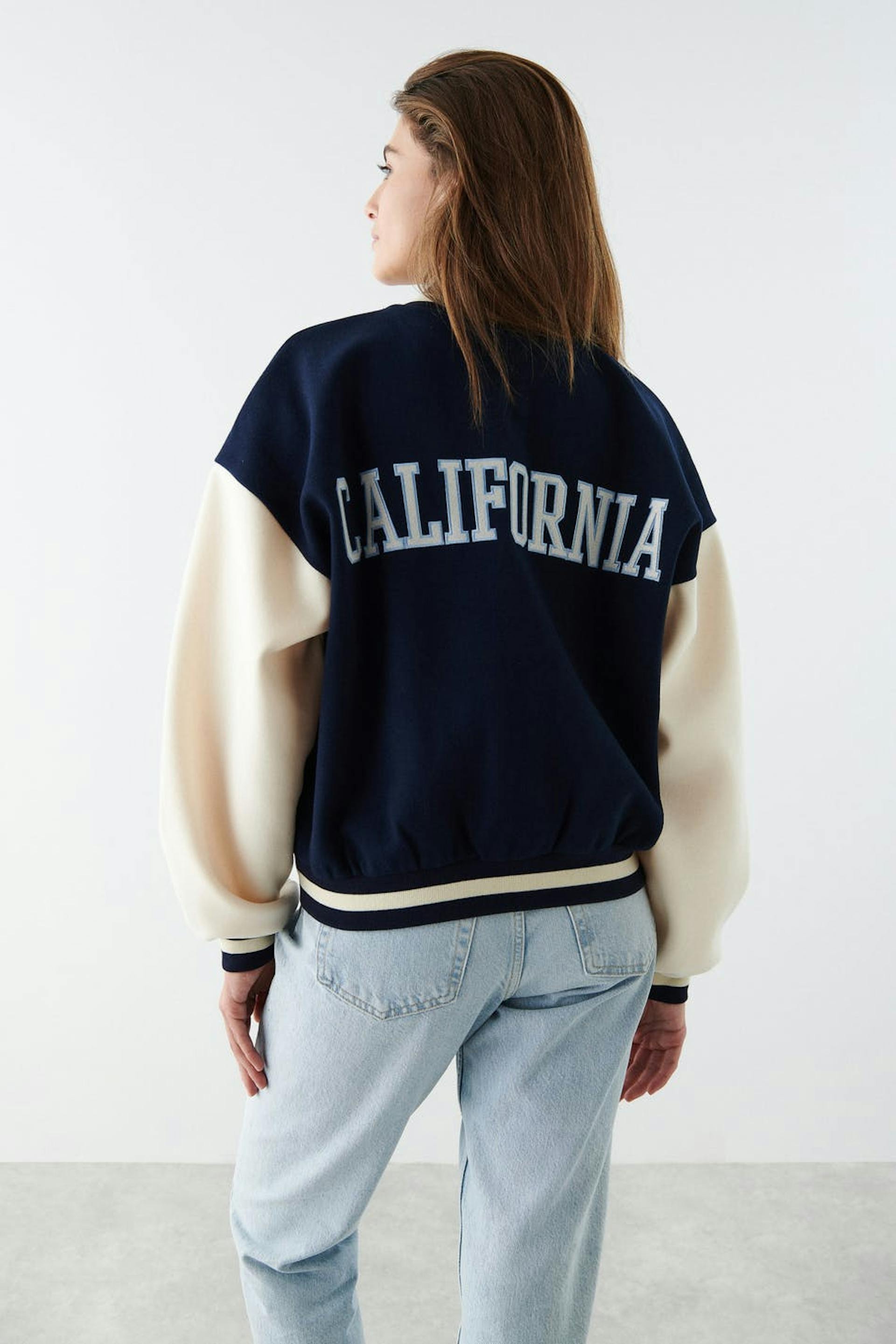 Block-coloured baseball jacket with an oversize fit. The jacket is blue and has a felted fabric. It has snap button closure in front, ribbed collar, pockets on the sides, an embroidered letter on the chest, embroidered text in the back and a striped, ribbed cuff at the bottom and on the sleeve ends.
