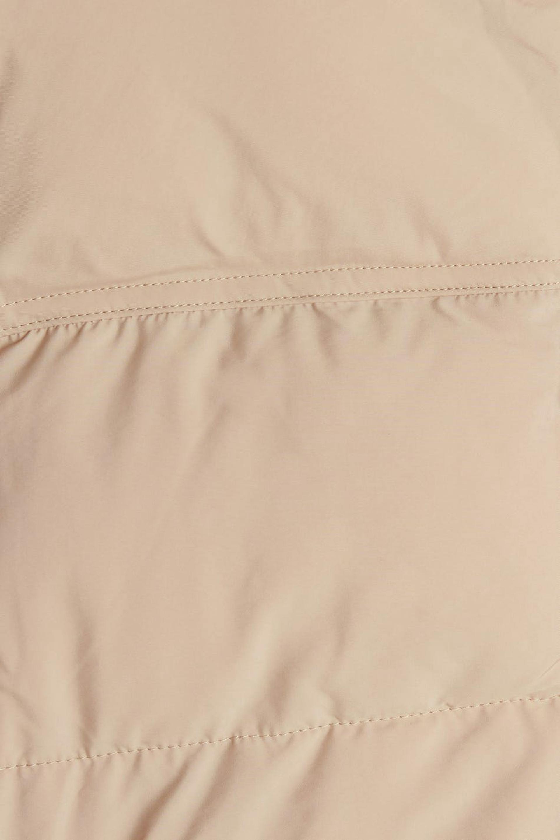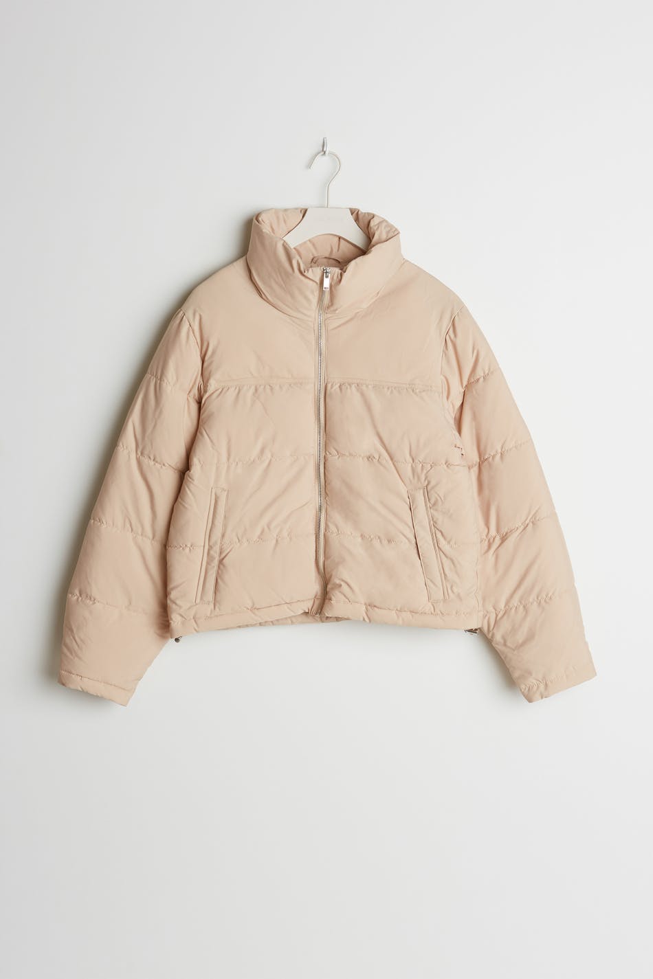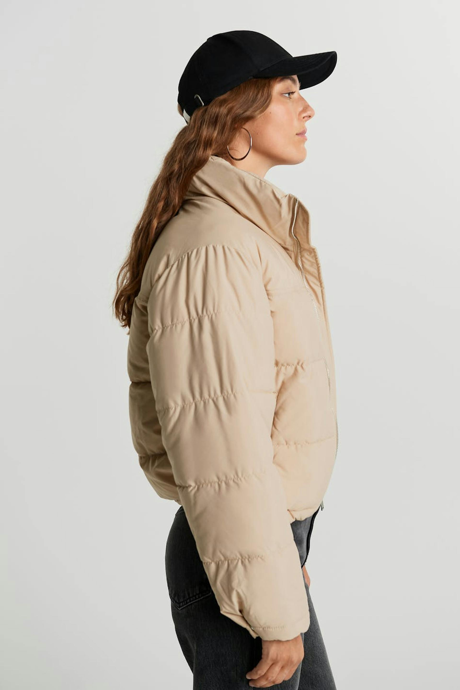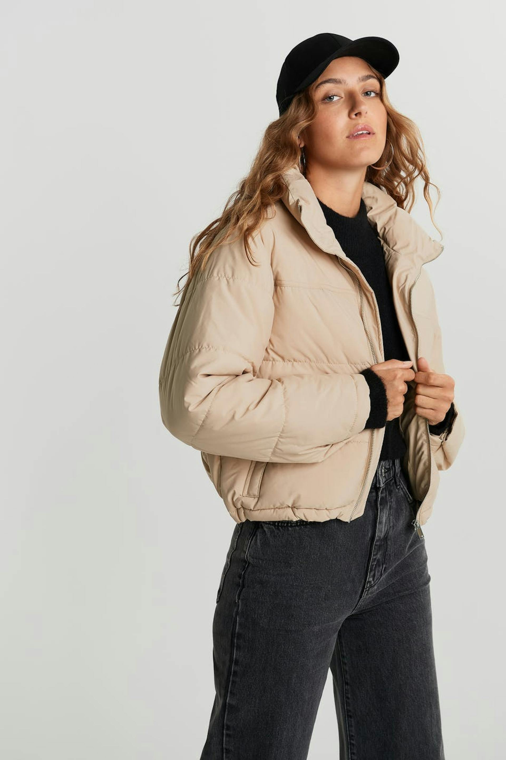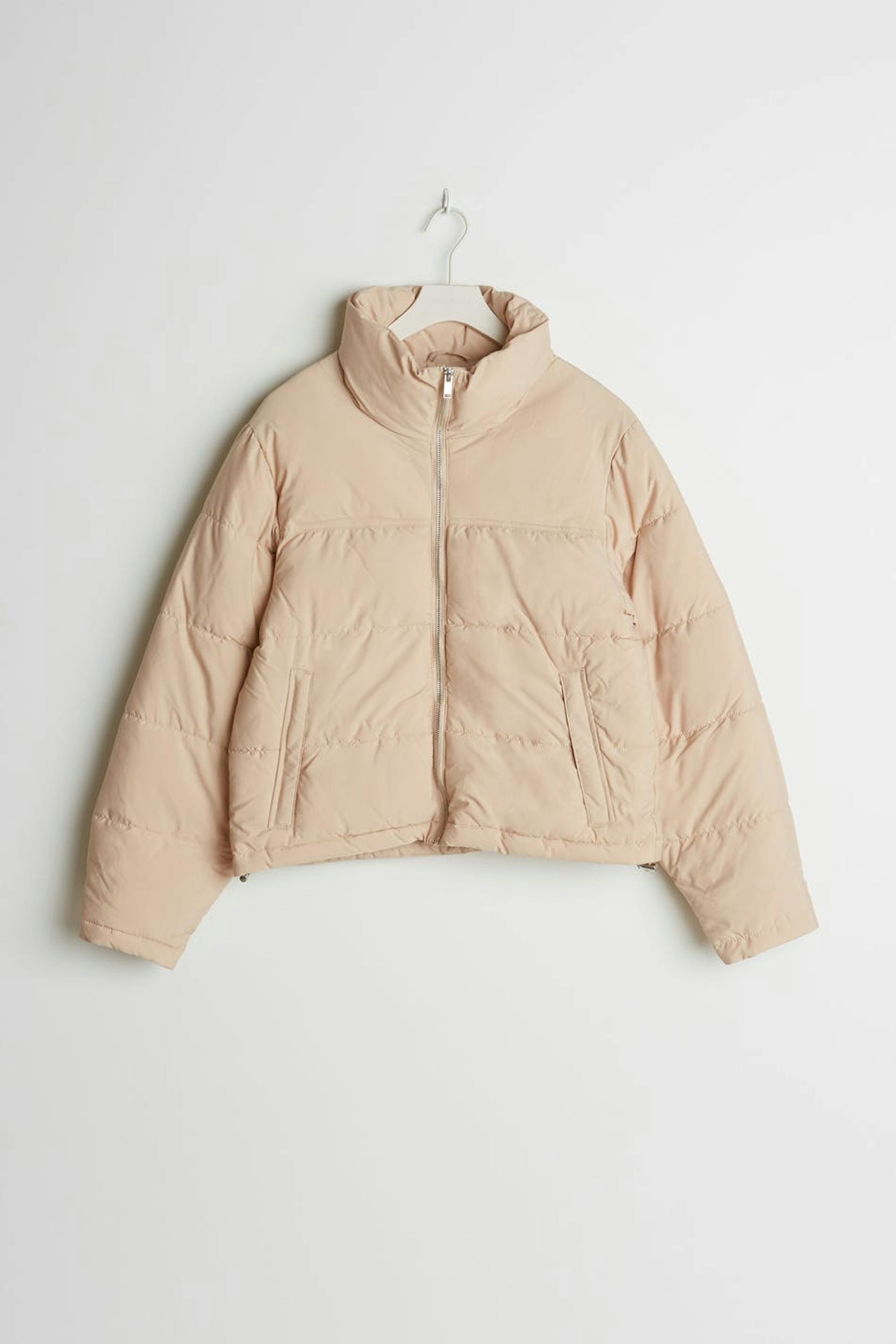 Short jacket with a high neck. The jacket is beige.