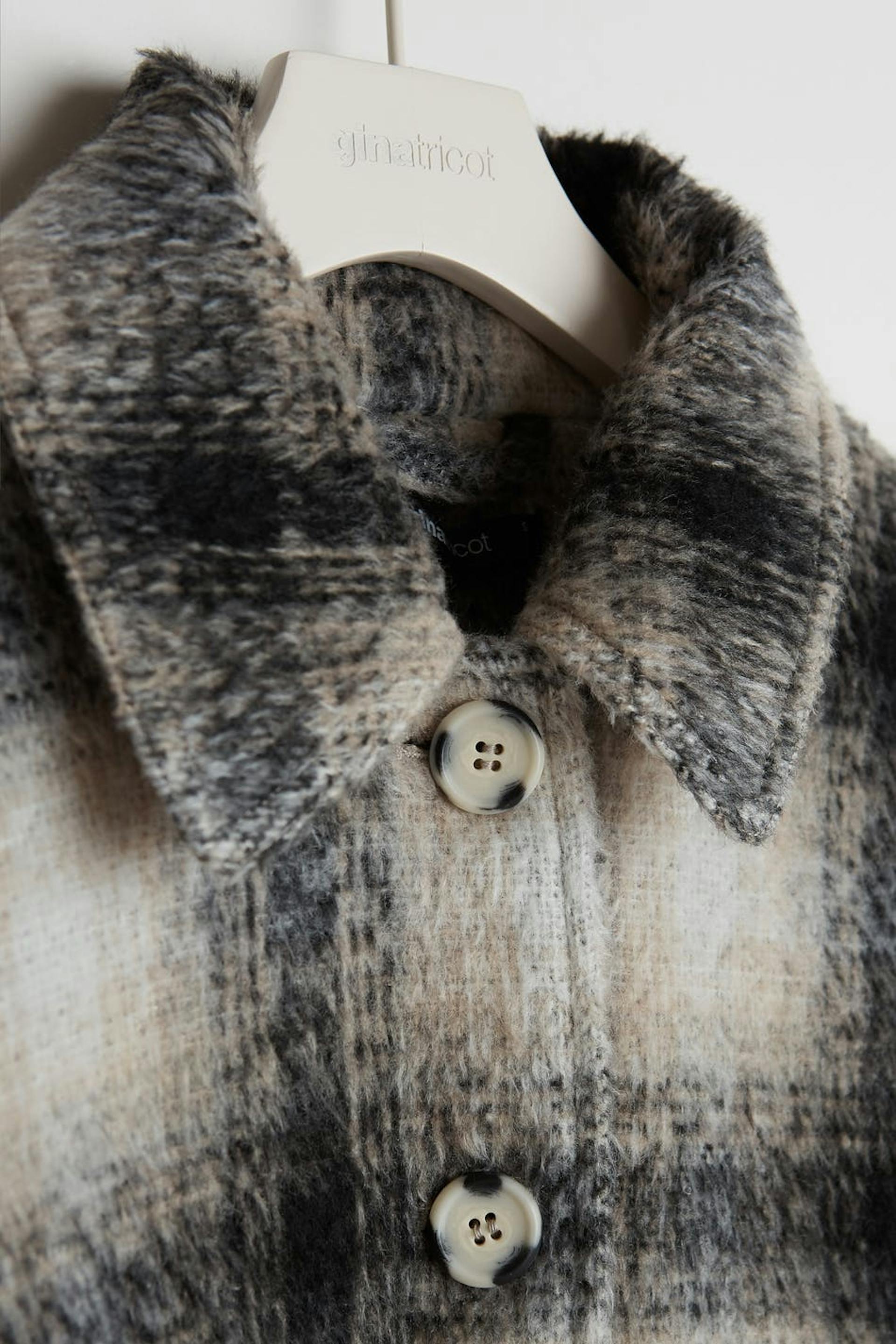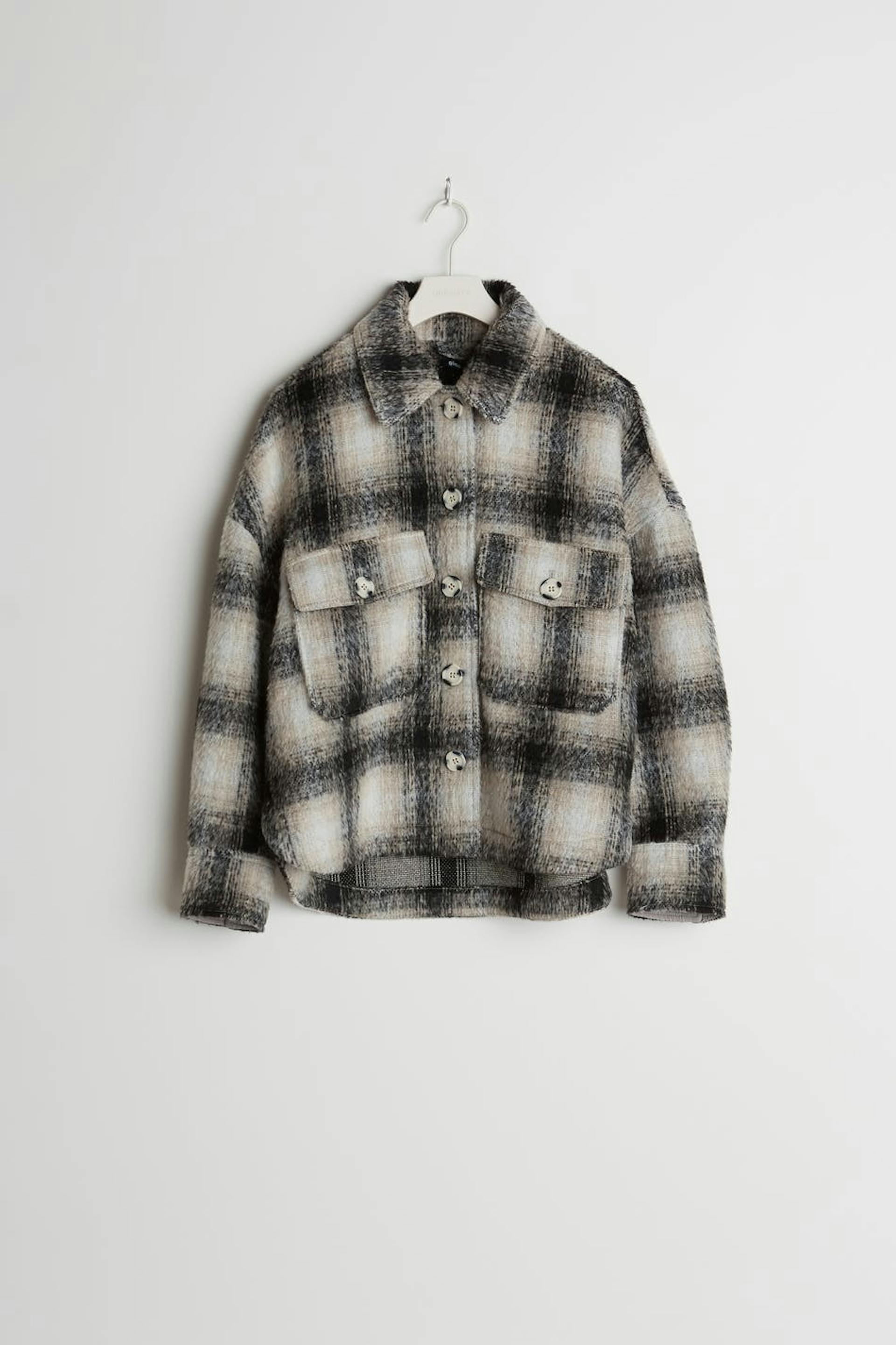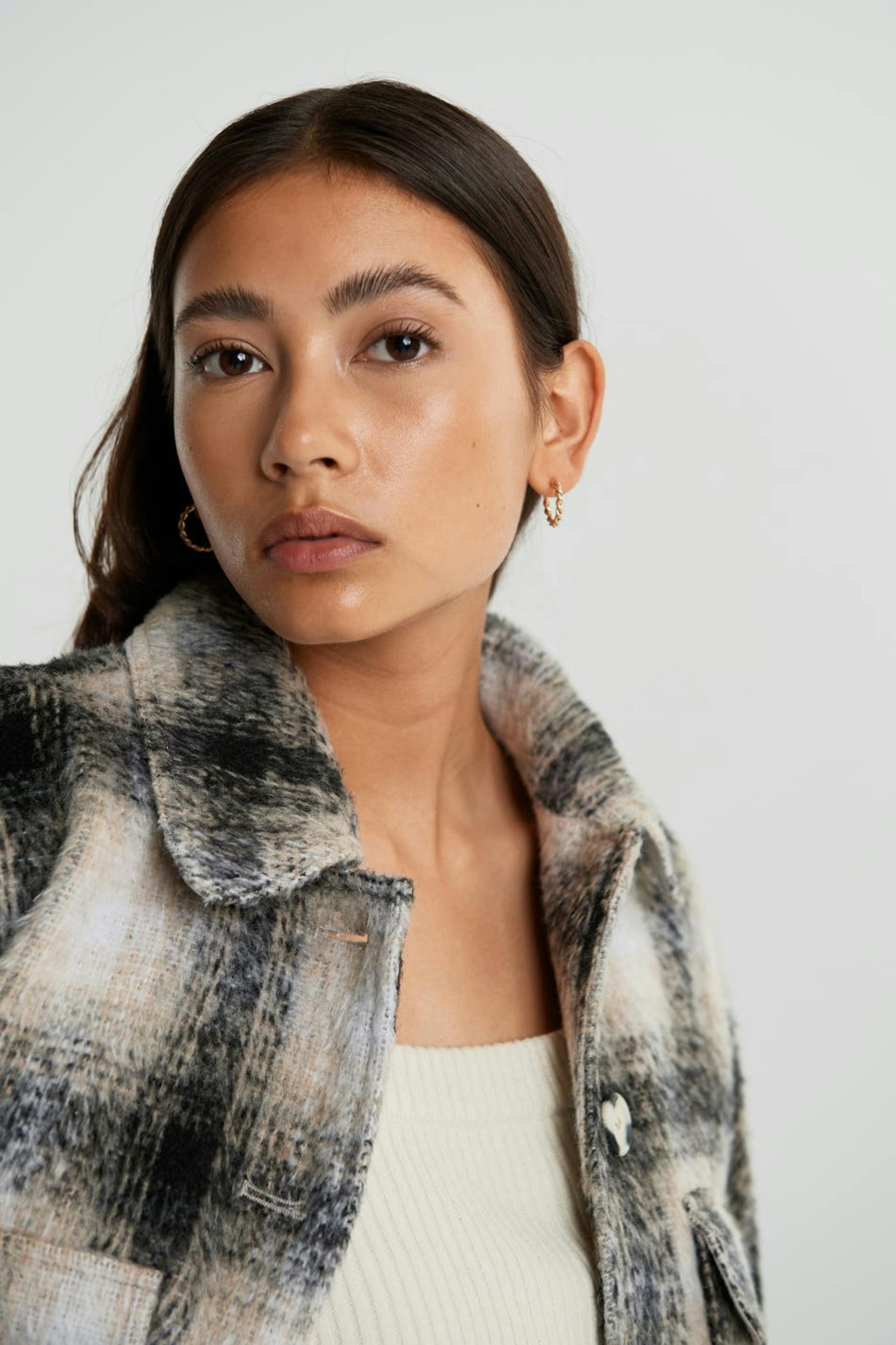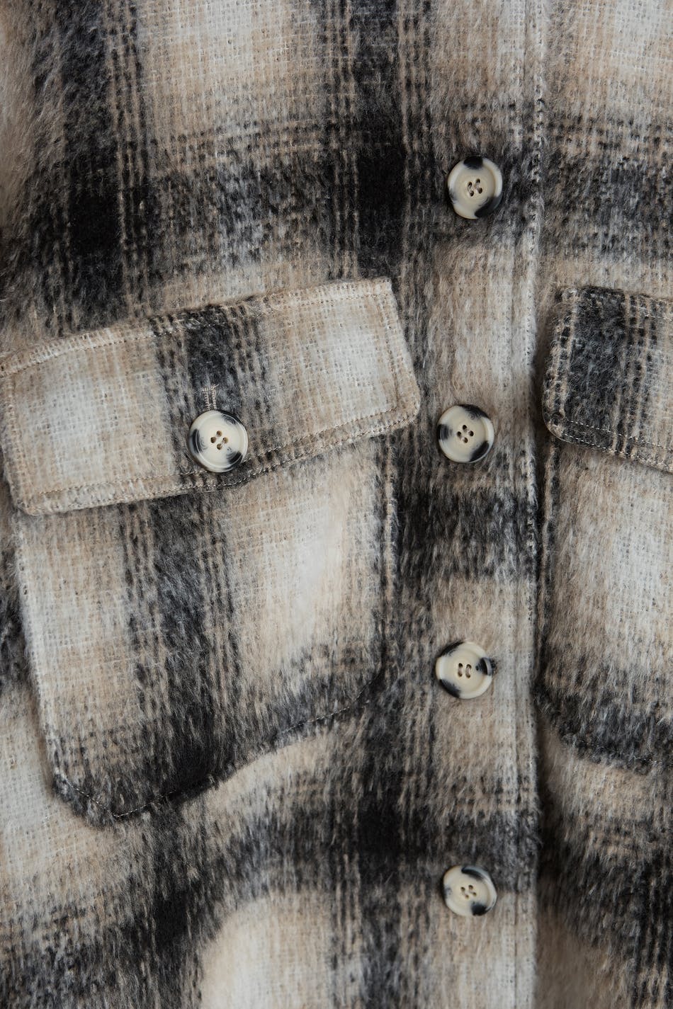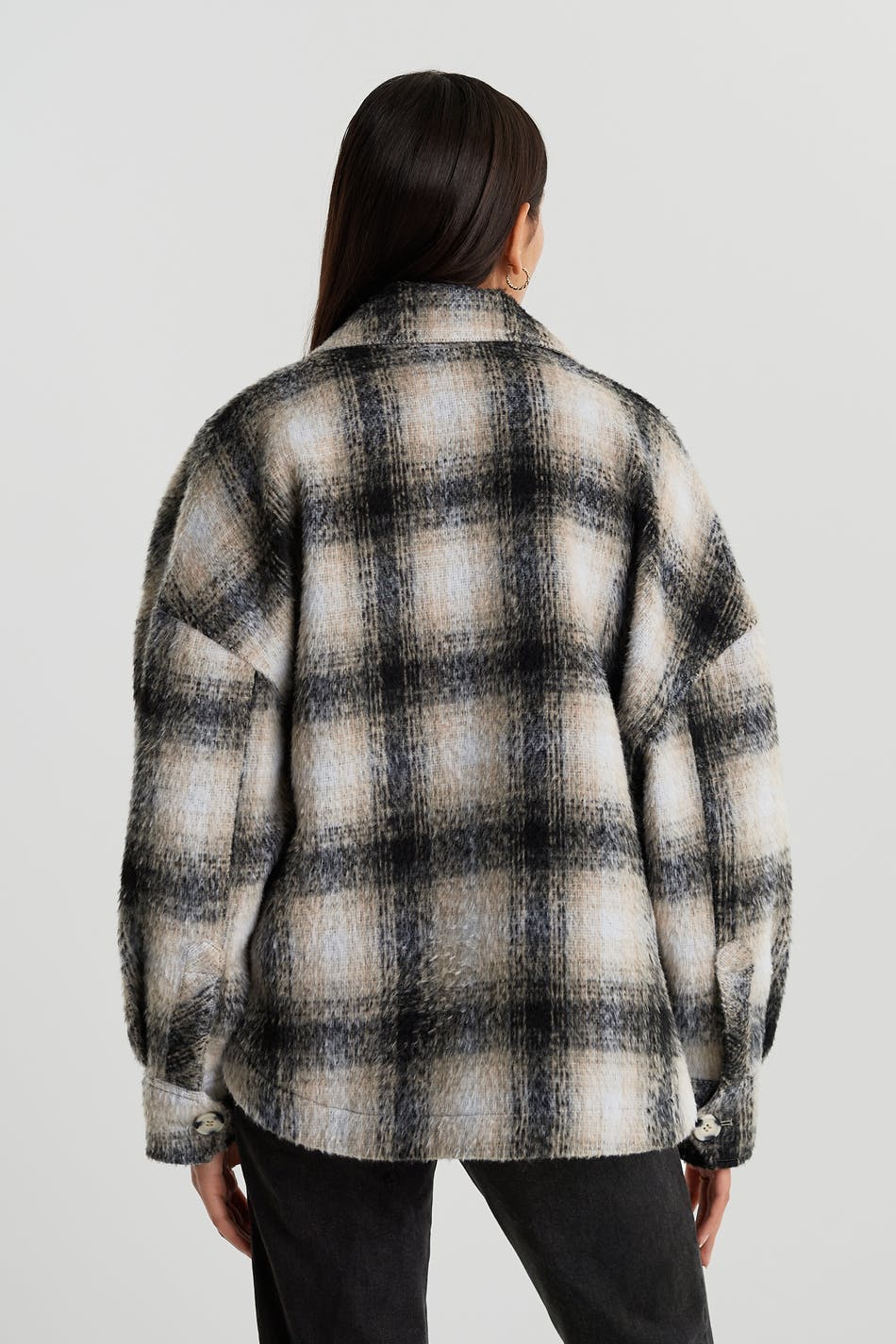 Checked shirt jacket with chest pockets. The shacket is oversize and has buttons at the front and on the pockets. It has a brushed material.
