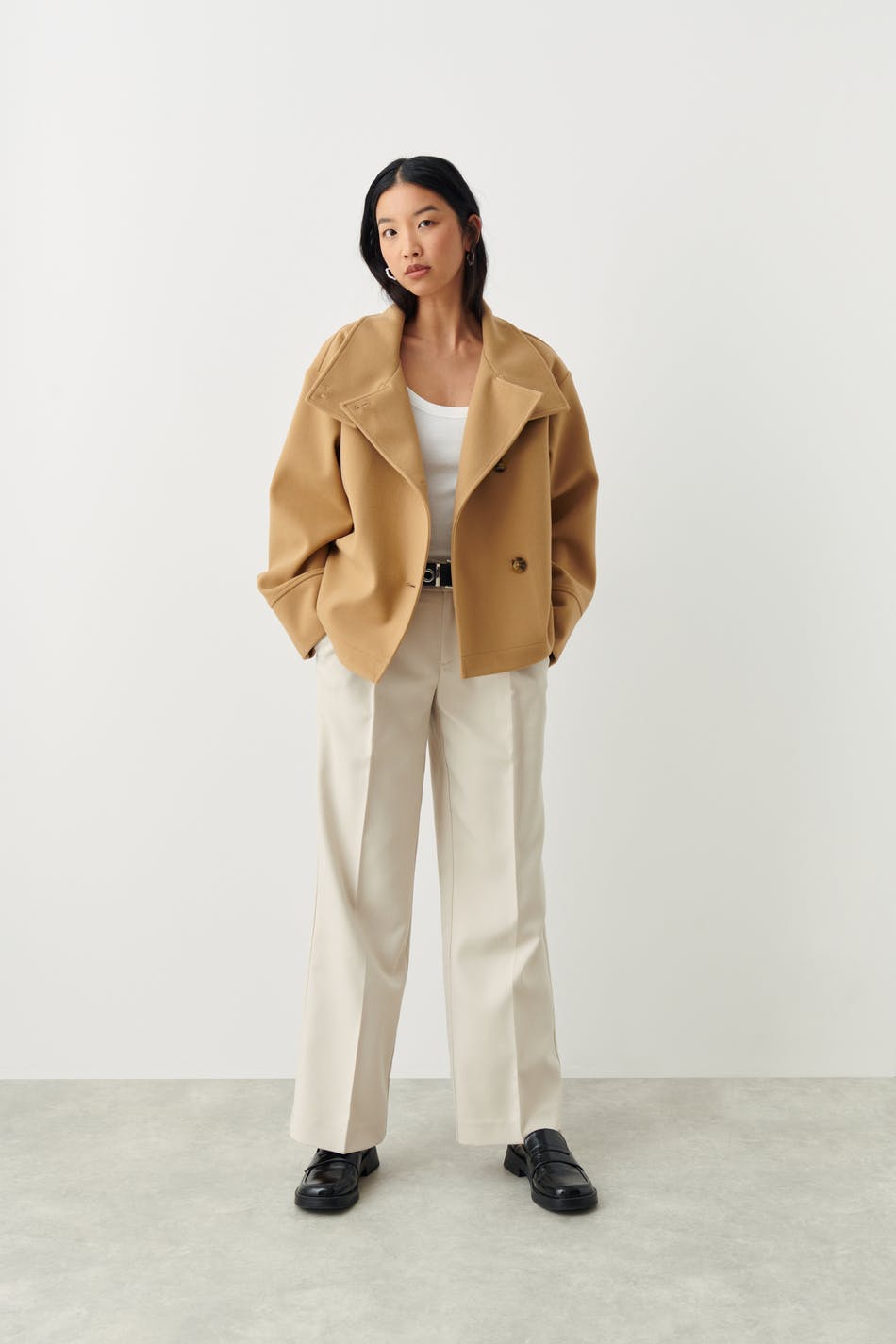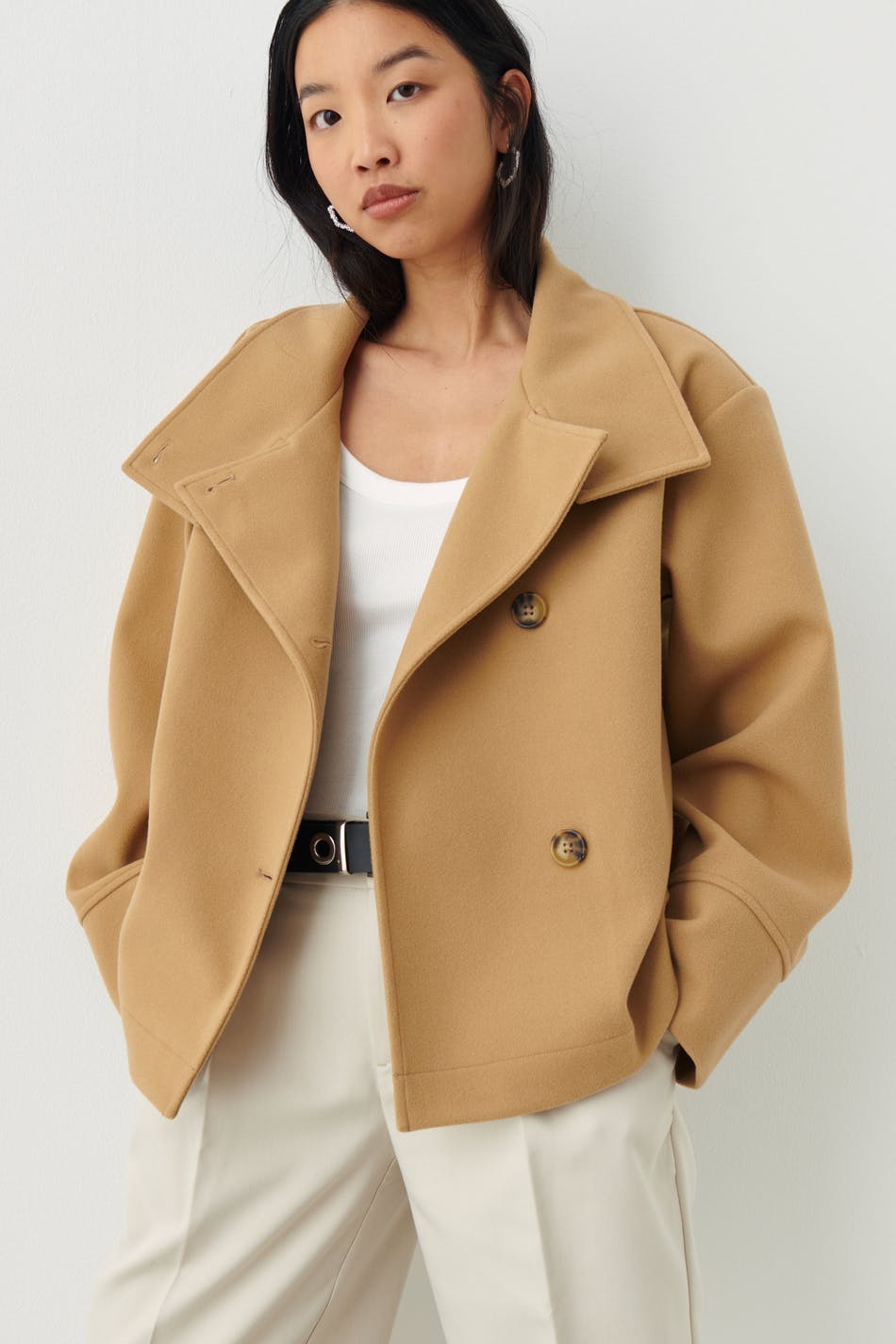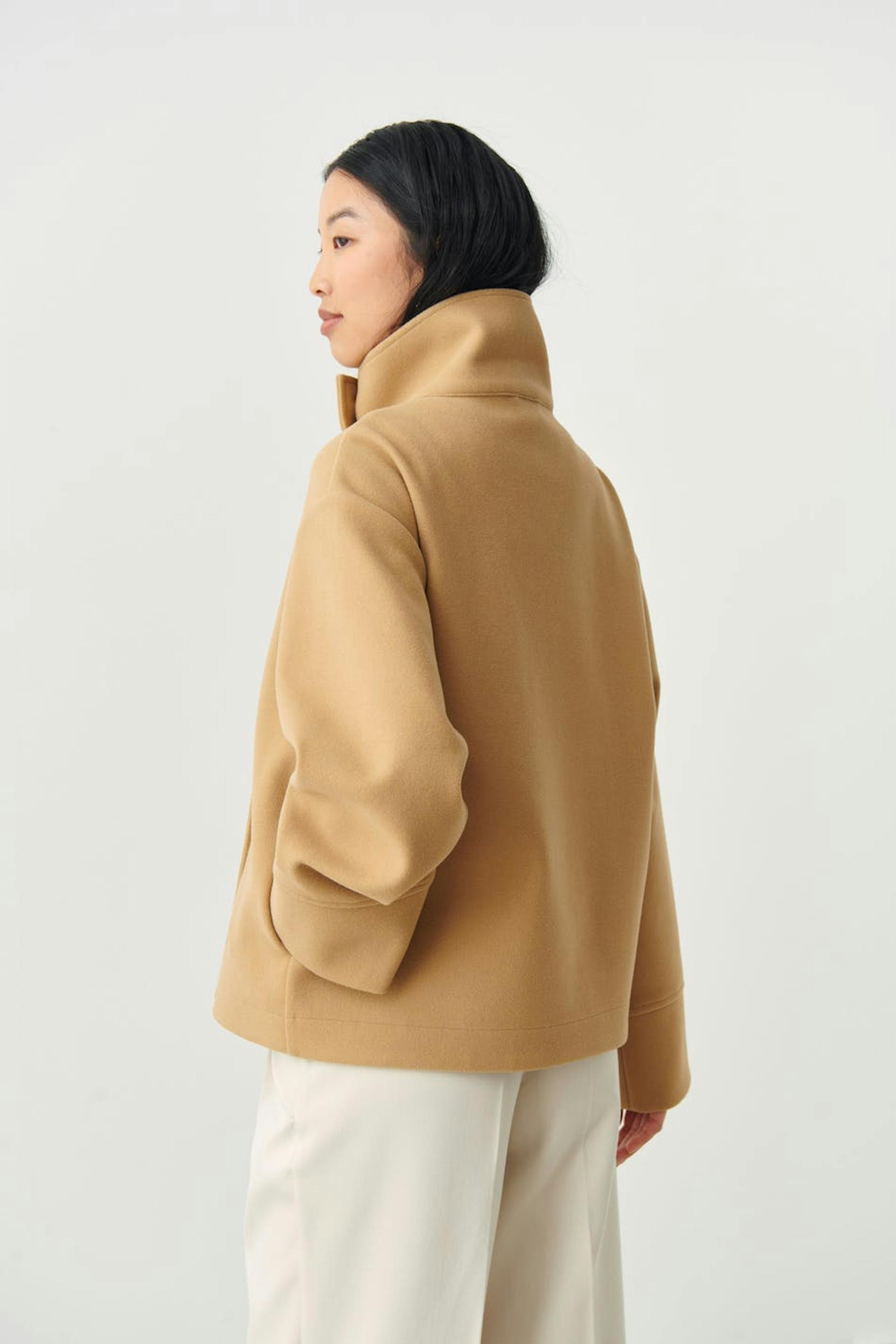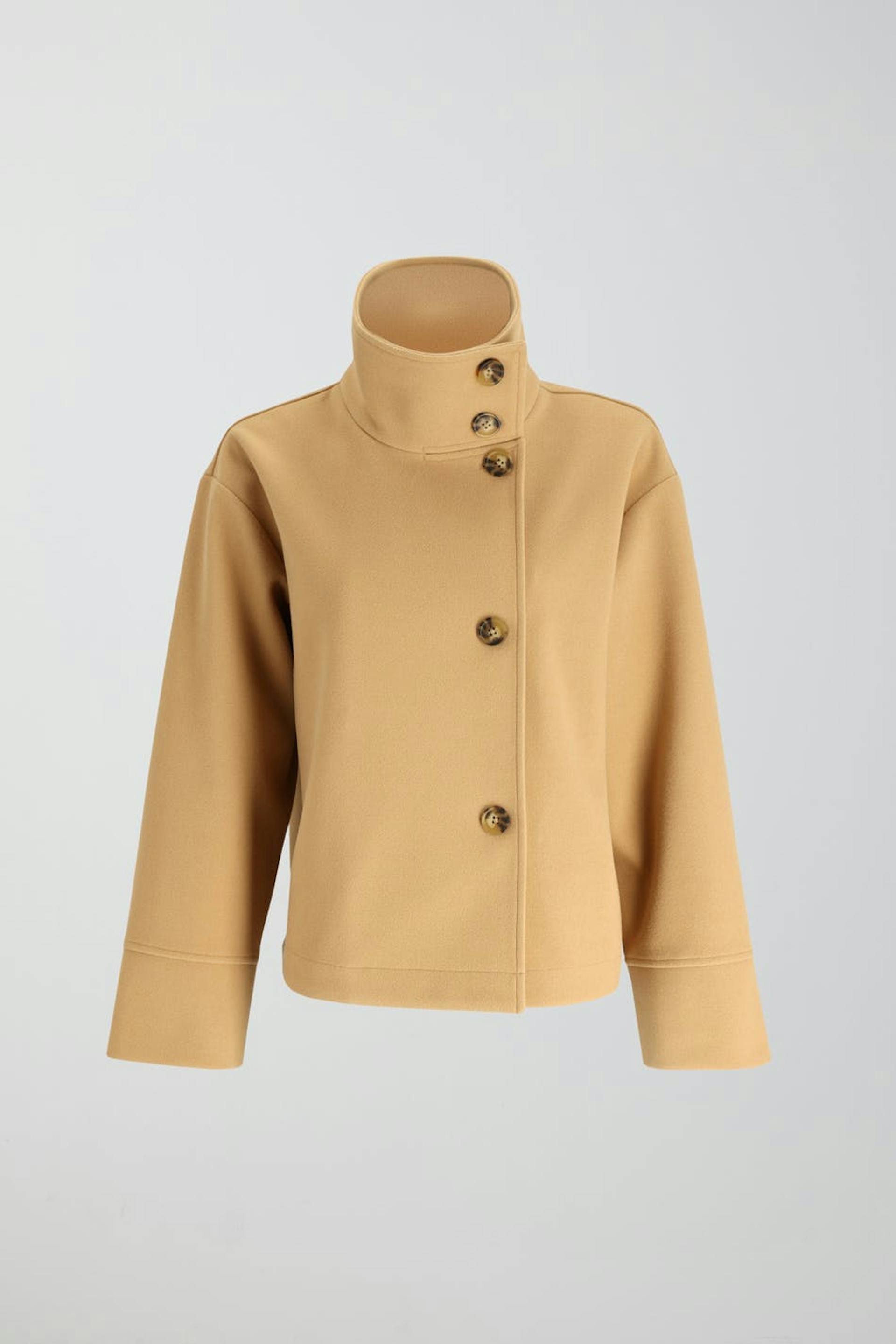 Short jacket with high neck. The jacket is beige and has oversize fit. It has button placket at the front, straight sleeves and wide lapels.