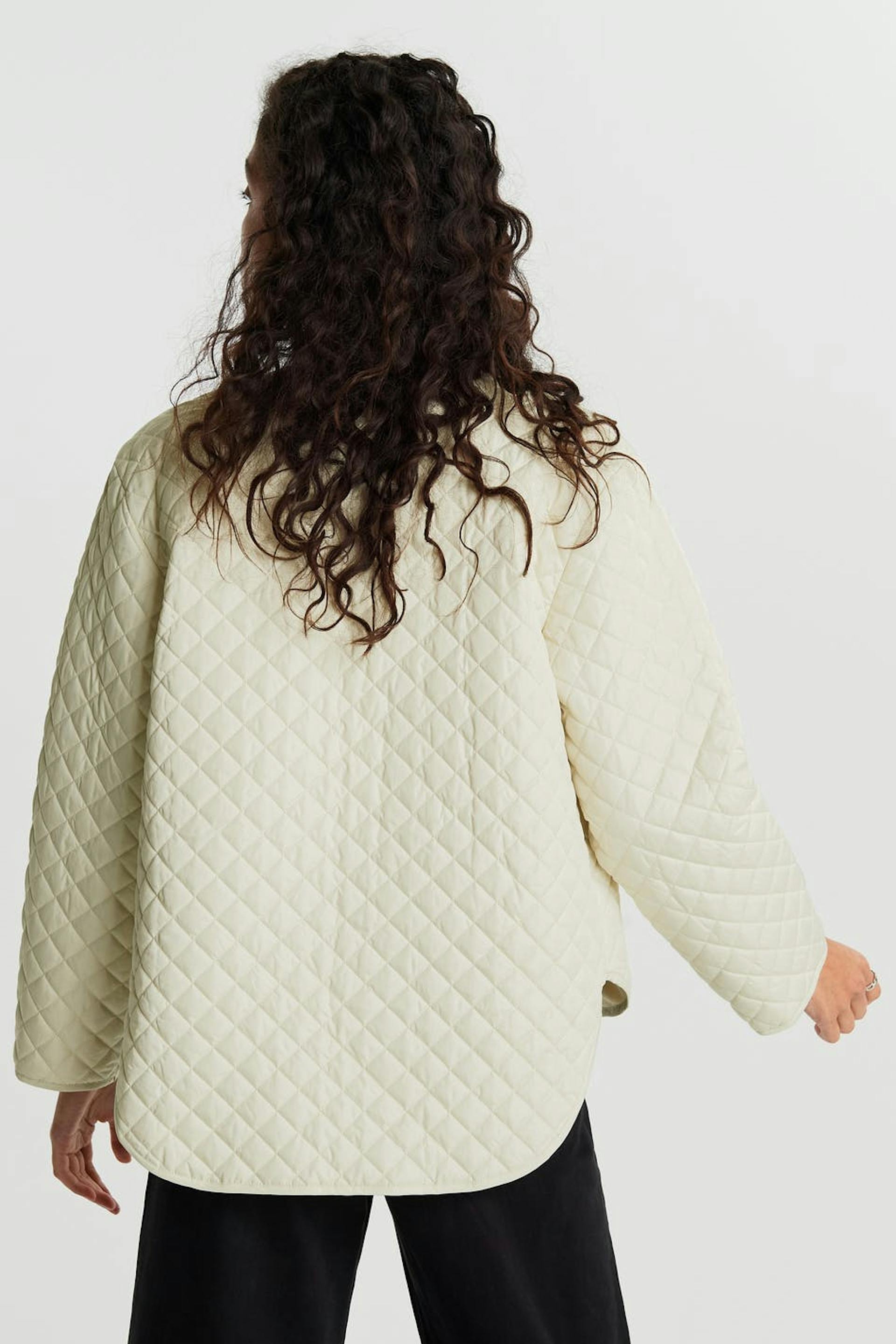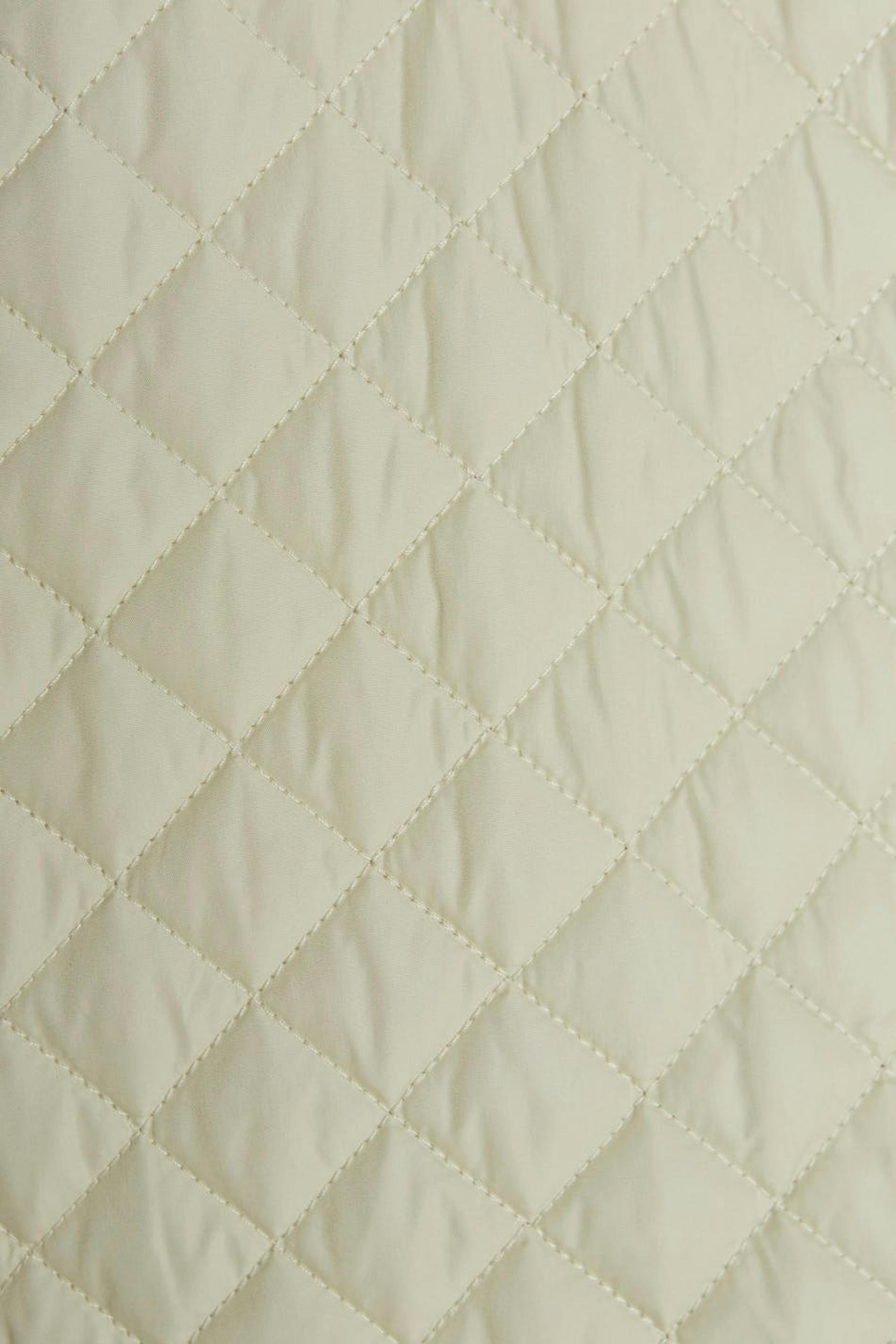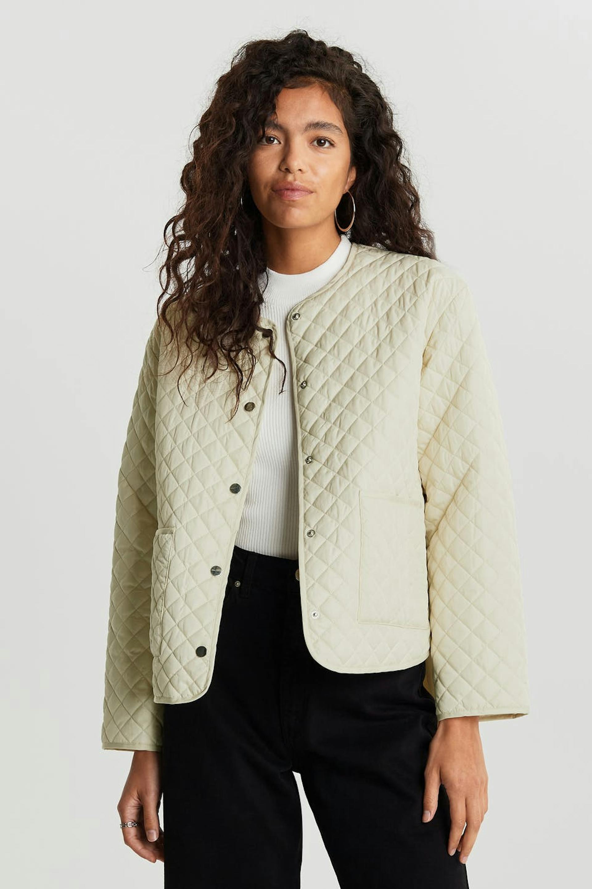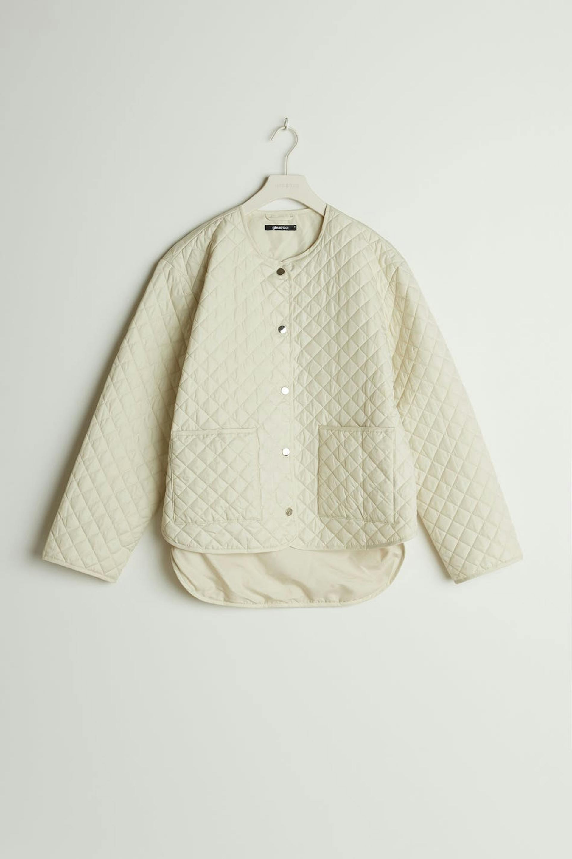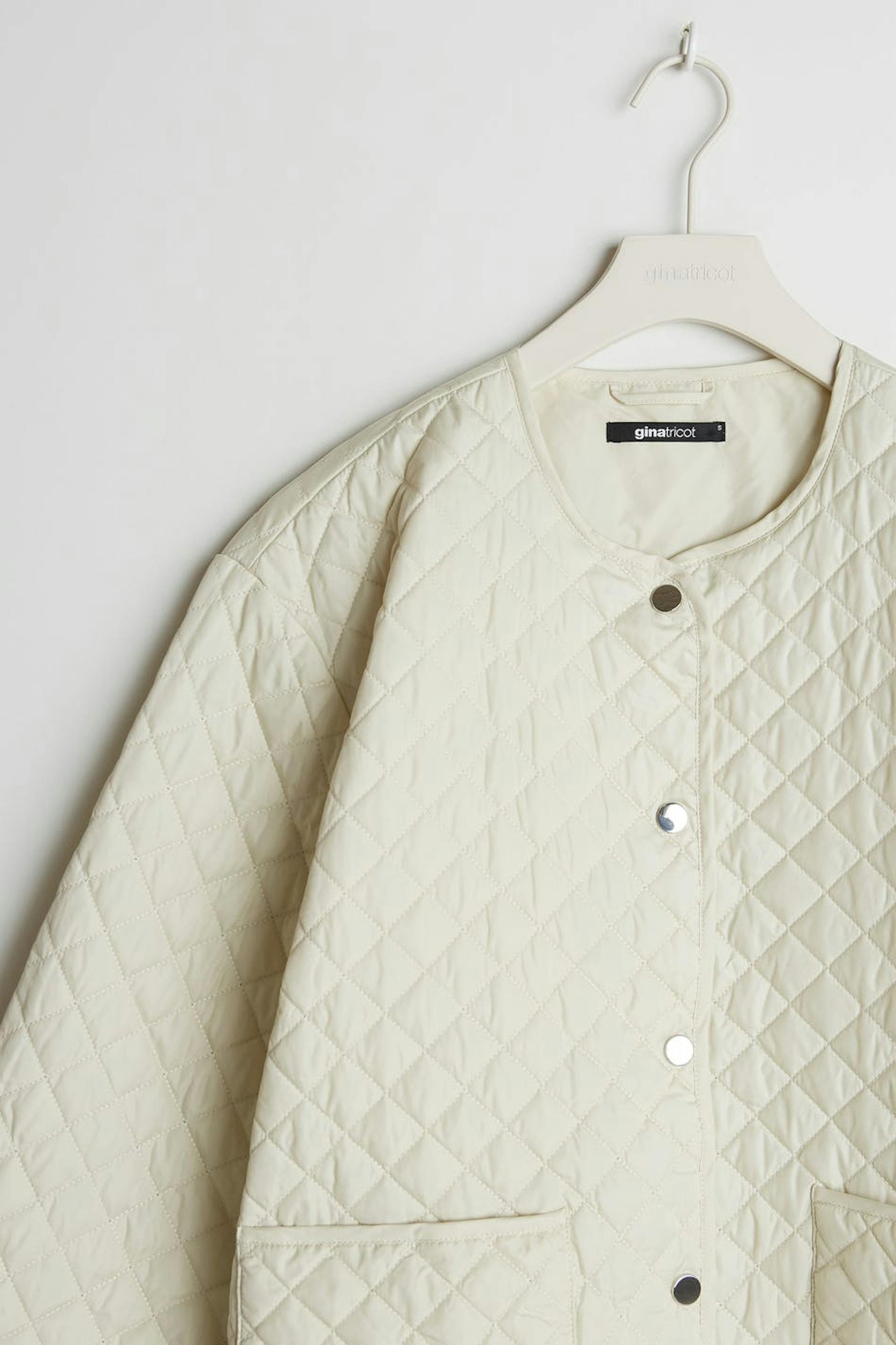 Quilted jacket with pockets. The jacket is beige and has snap buttons at the front.