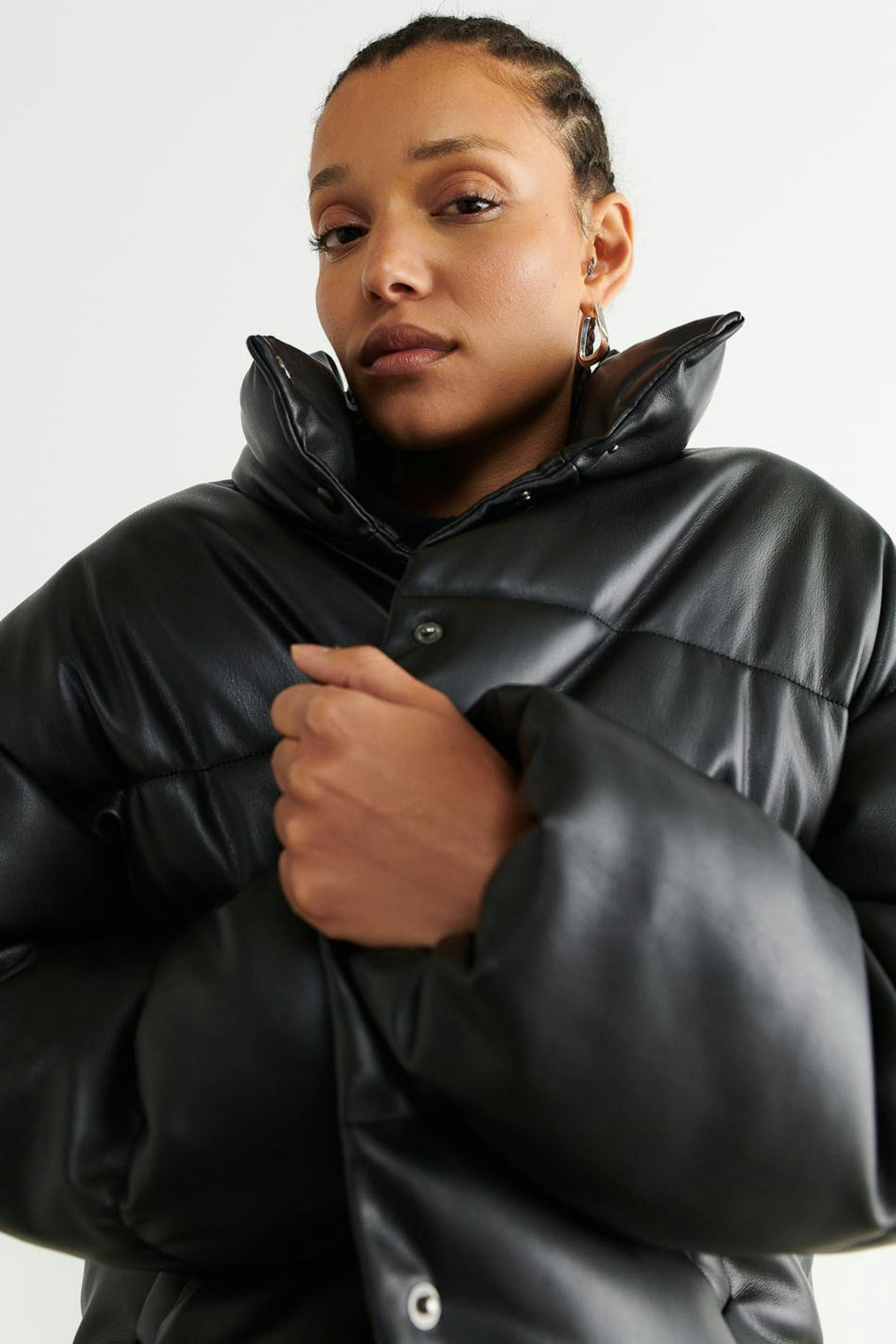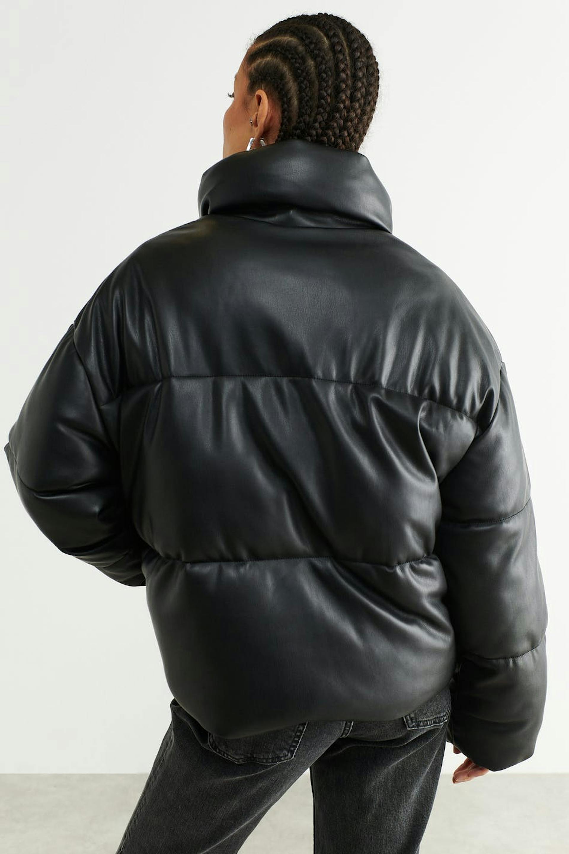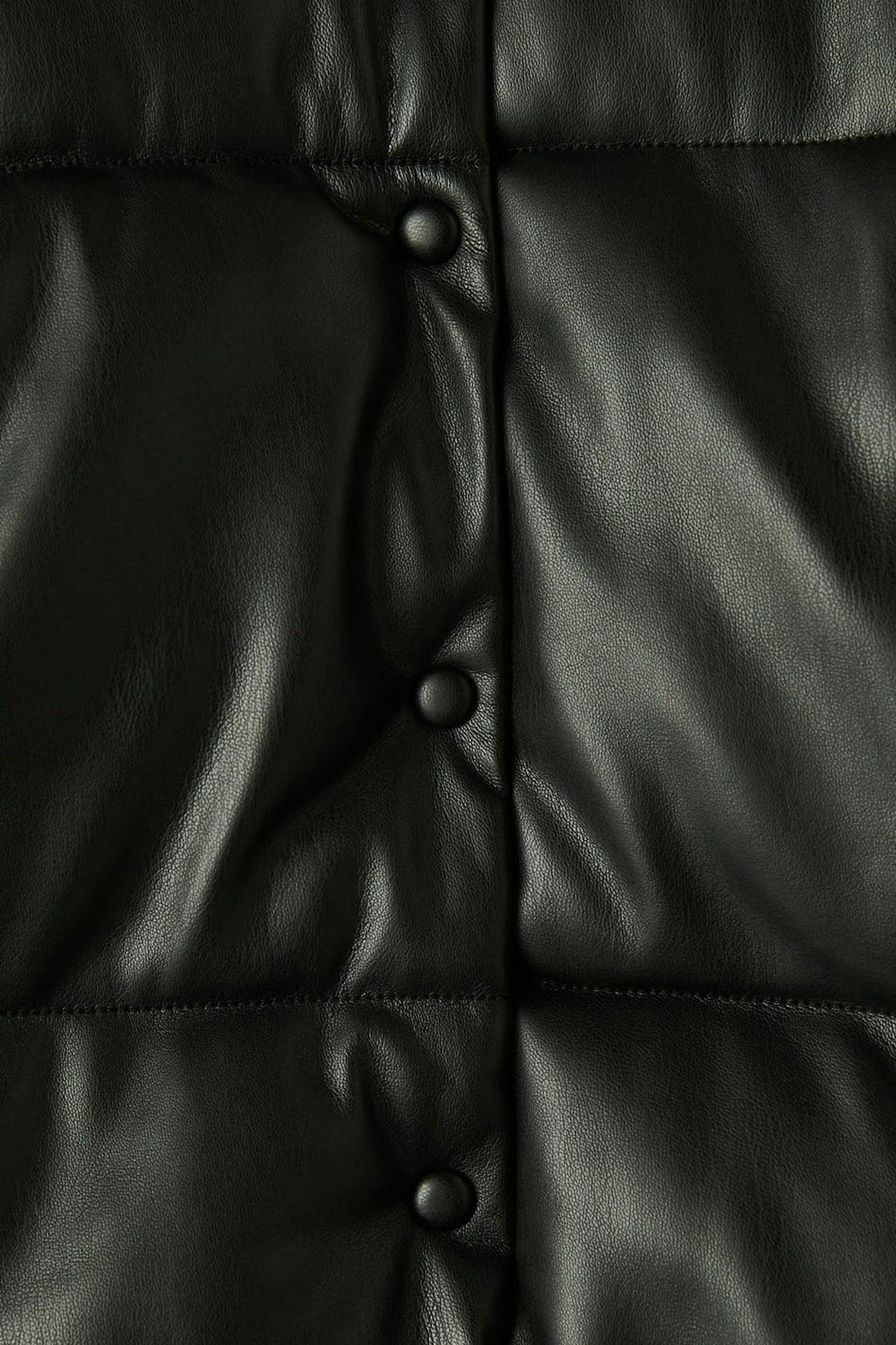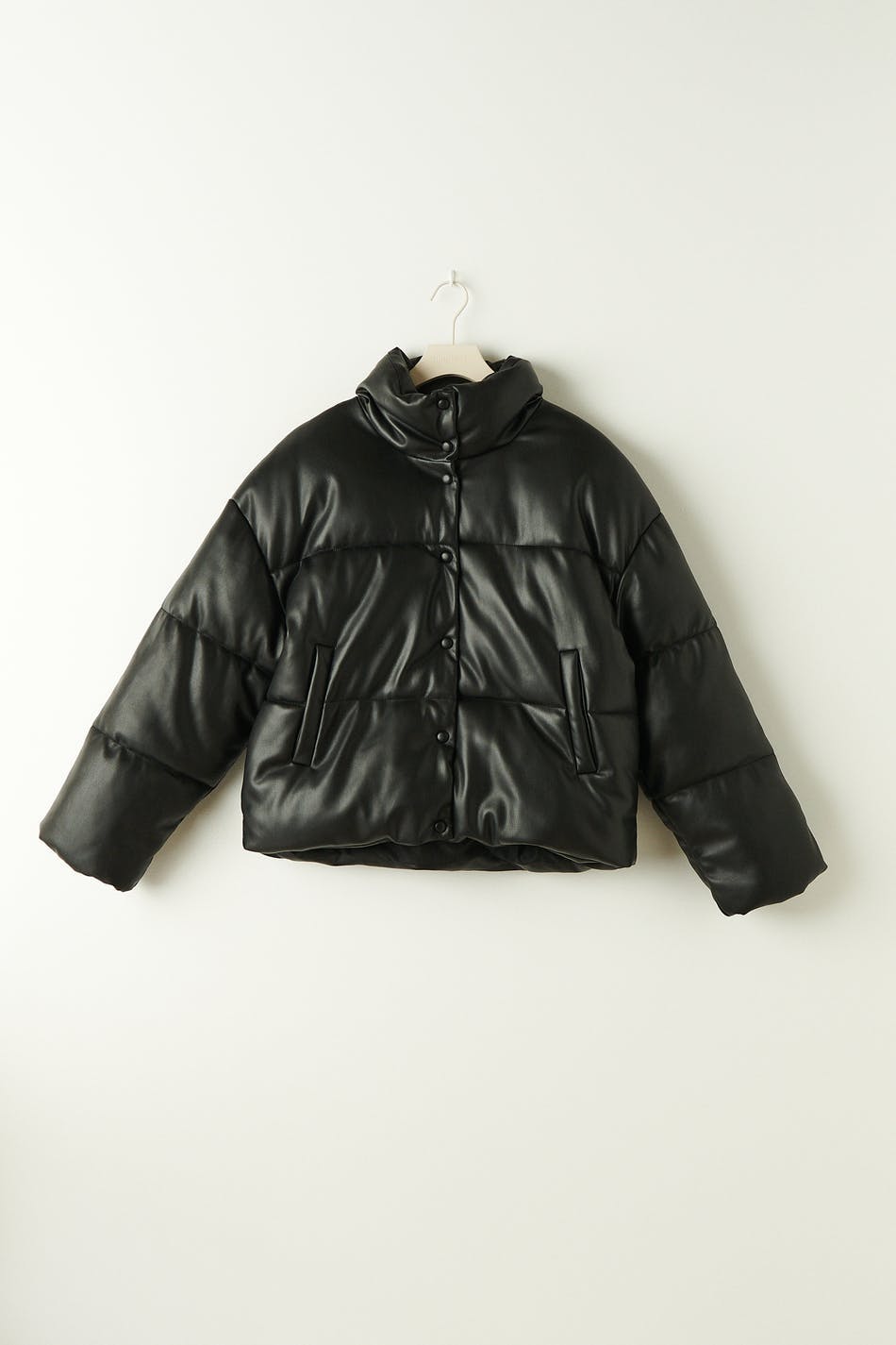 Padded jacket in PU with high collar. The jacket is black and has snap button closure in front. It has slant pockets in the sides.