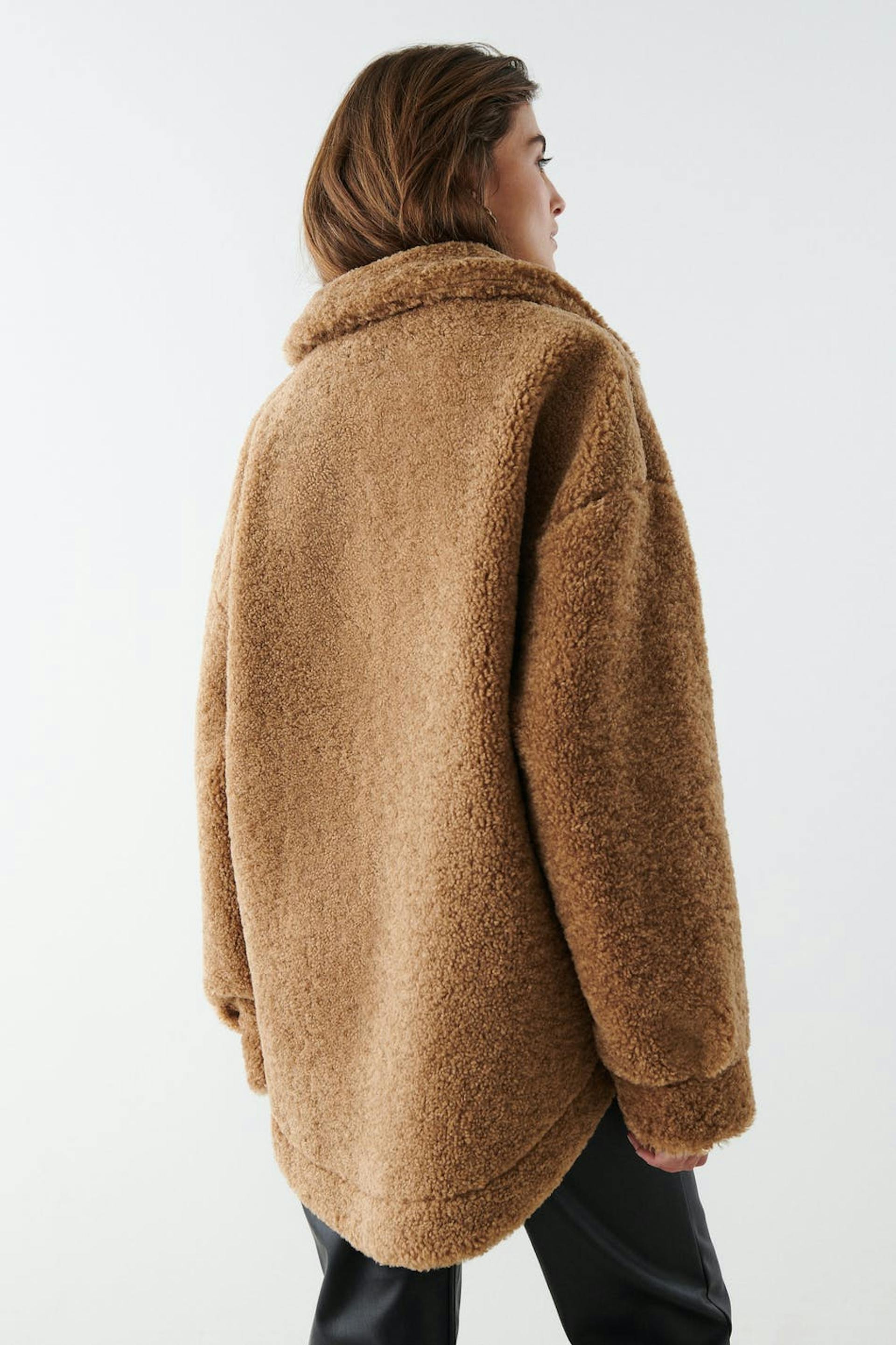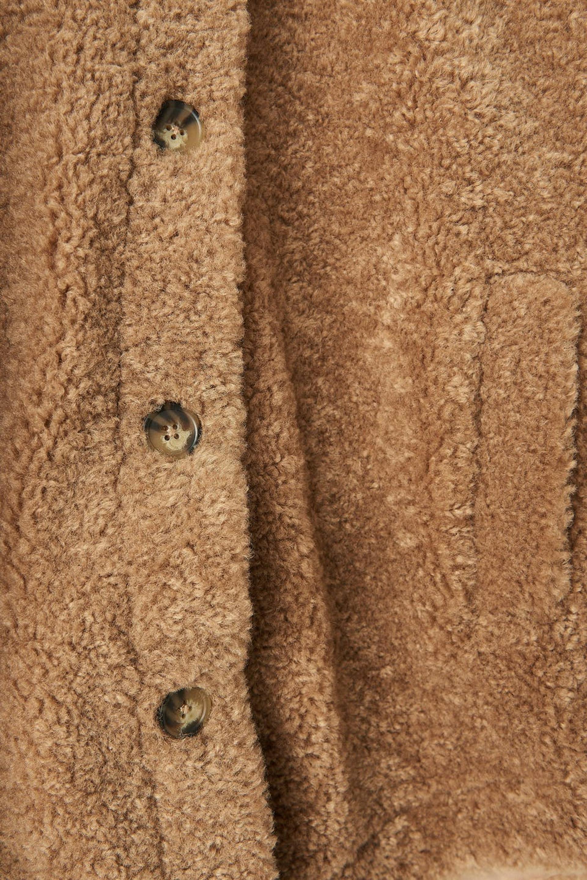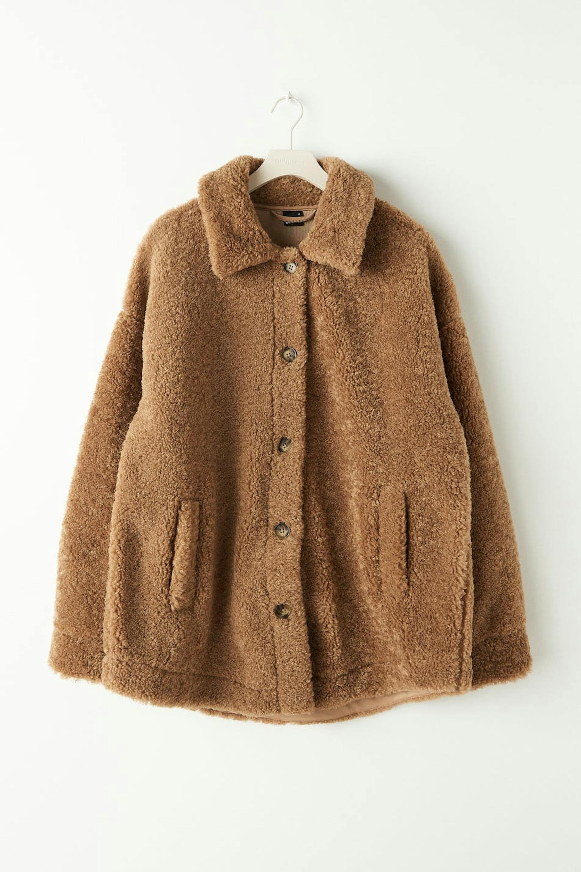 Teddy jacket with an oversize fit. The teddy jacket is brown and has a button placket in front. It has pockets and cuffs with button closures.