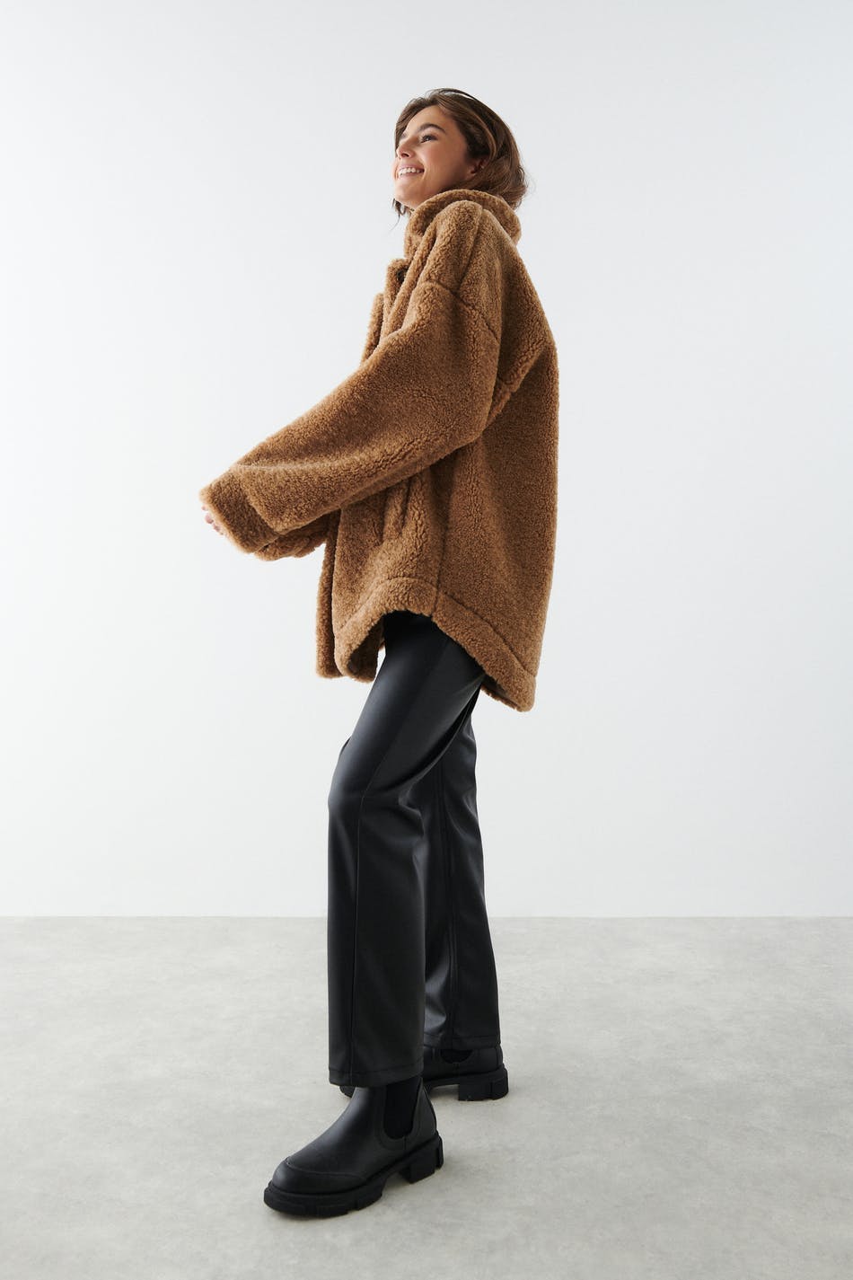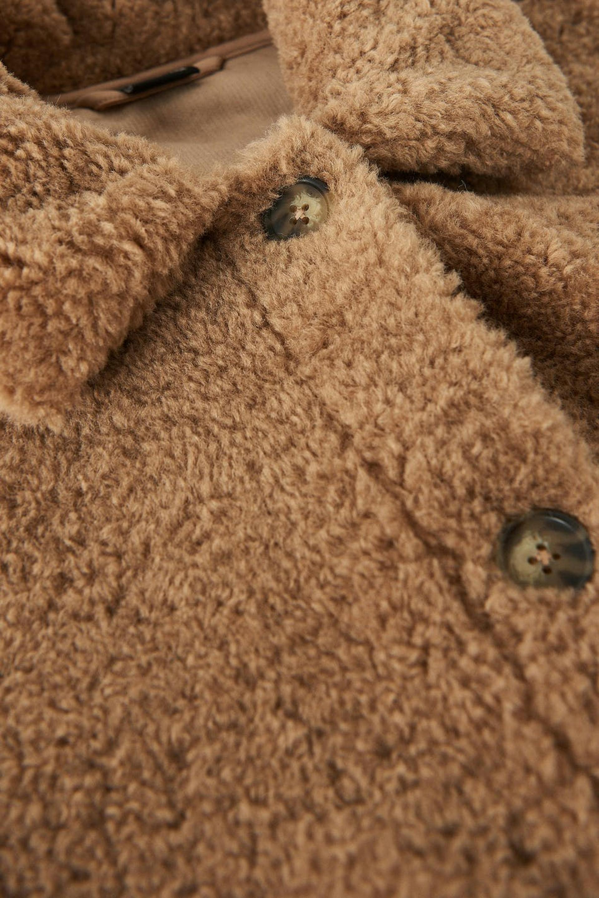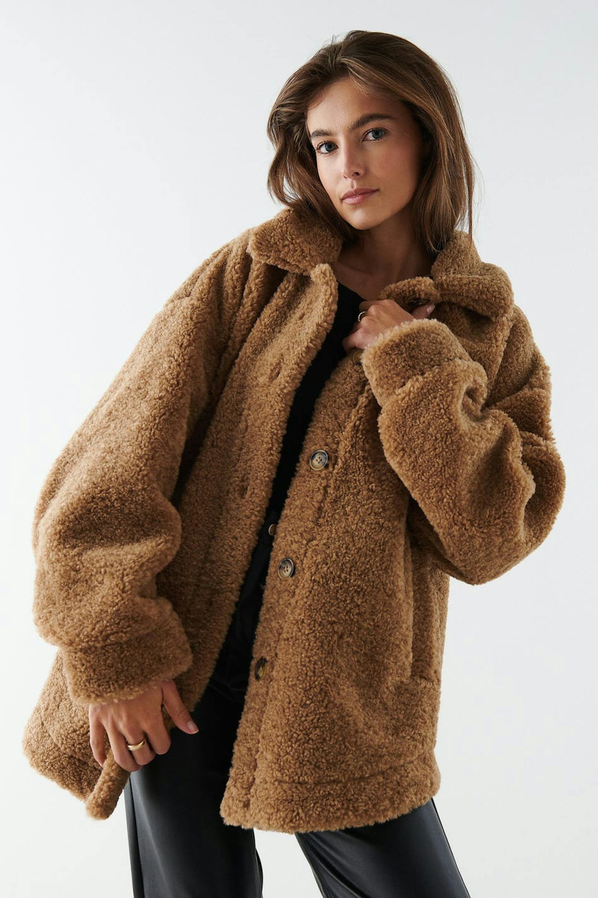 Teddy jacket with an oversize fit. The teddy jacket is brown and has a button placket in front. It has pockets and cuffs with button closures.