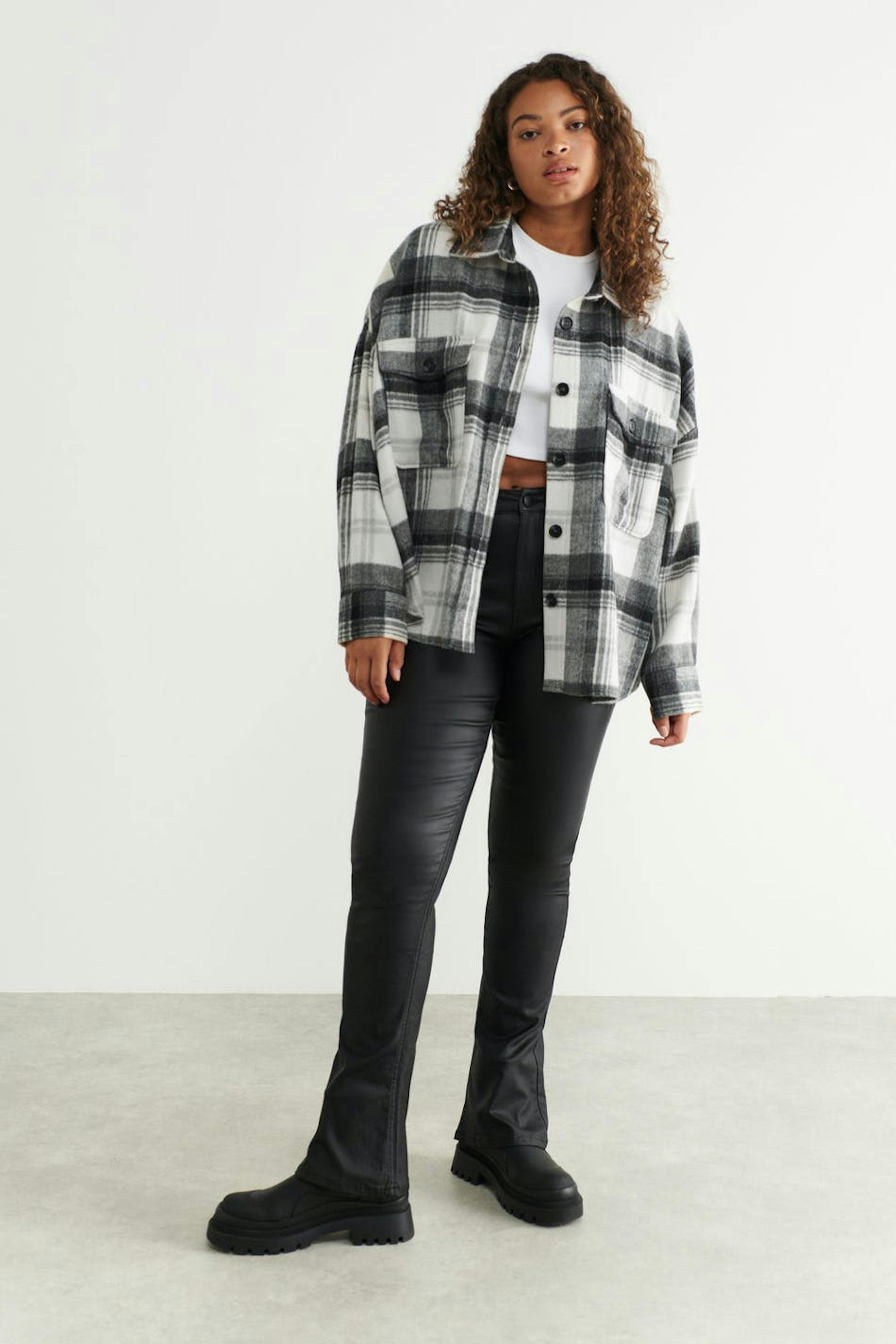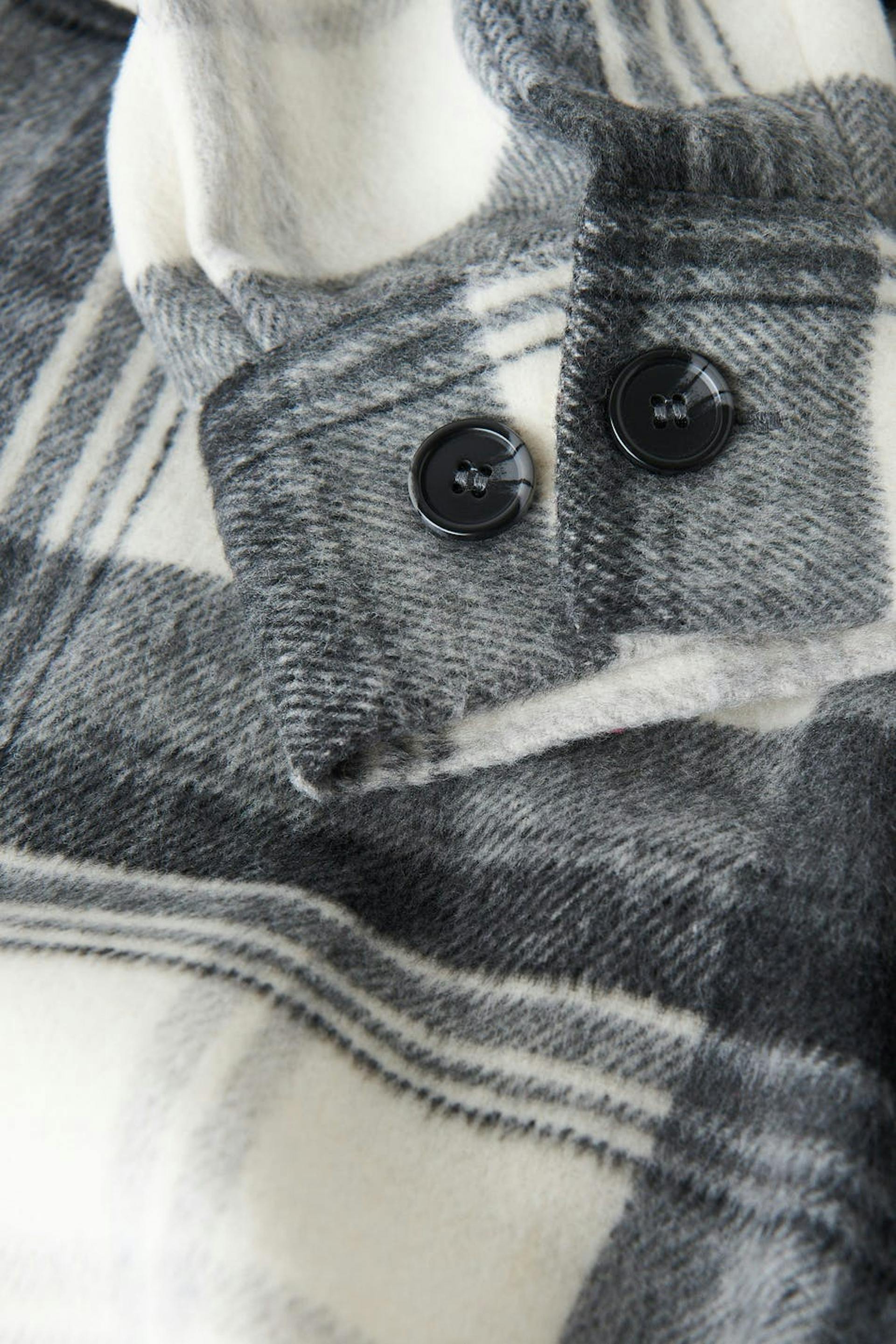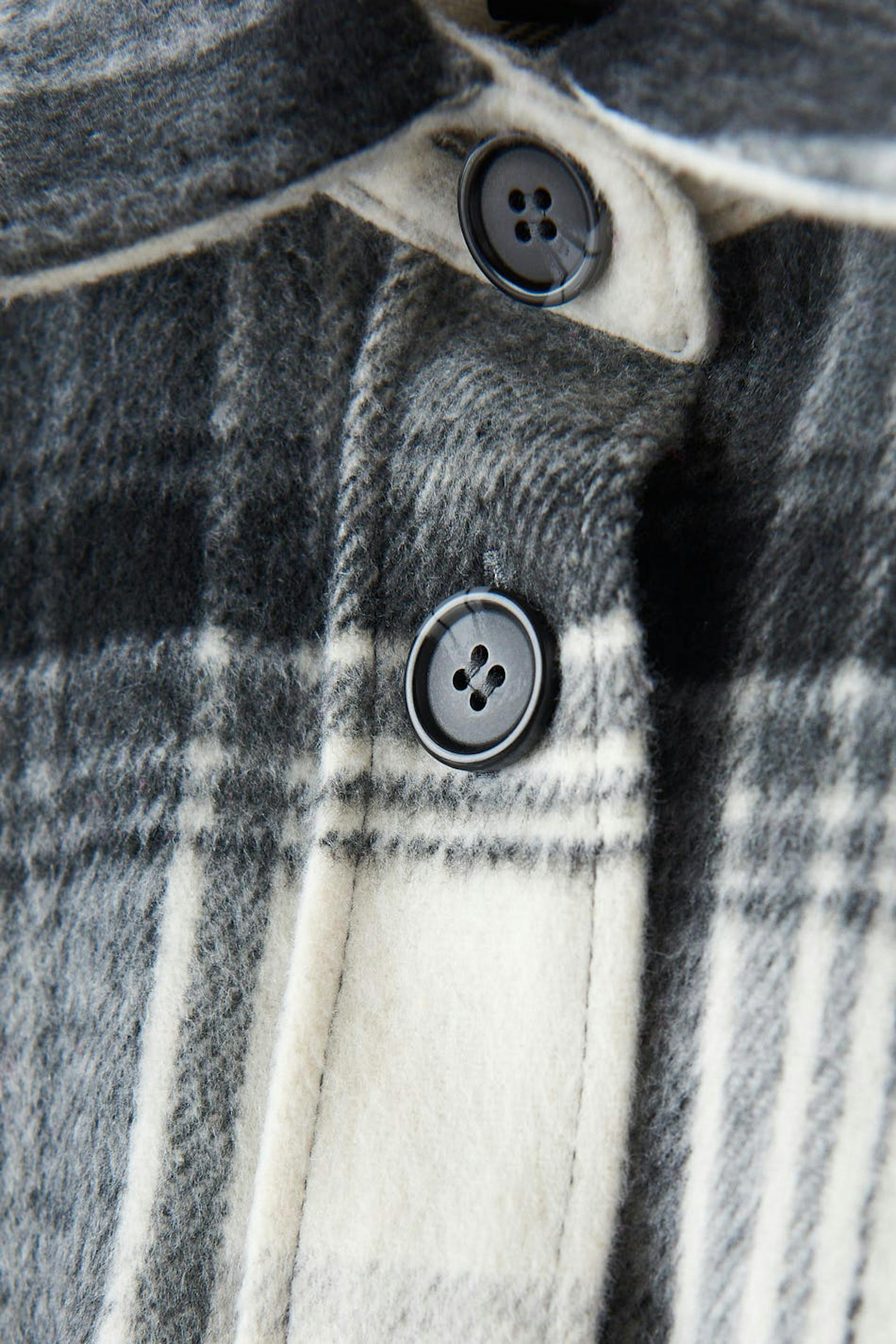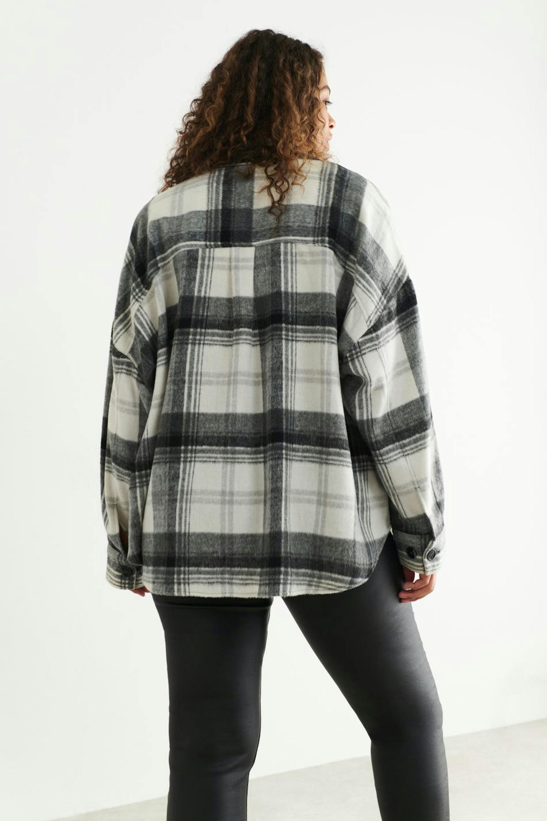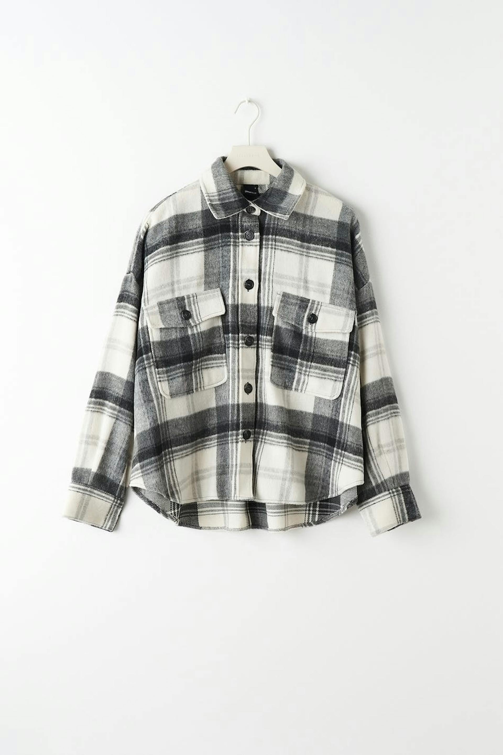 Checked shirt jacket in flannel with an oversize fit. The shacket is grey and has chest pockets. It has button placket in front, collar and yoke with crease at the back.