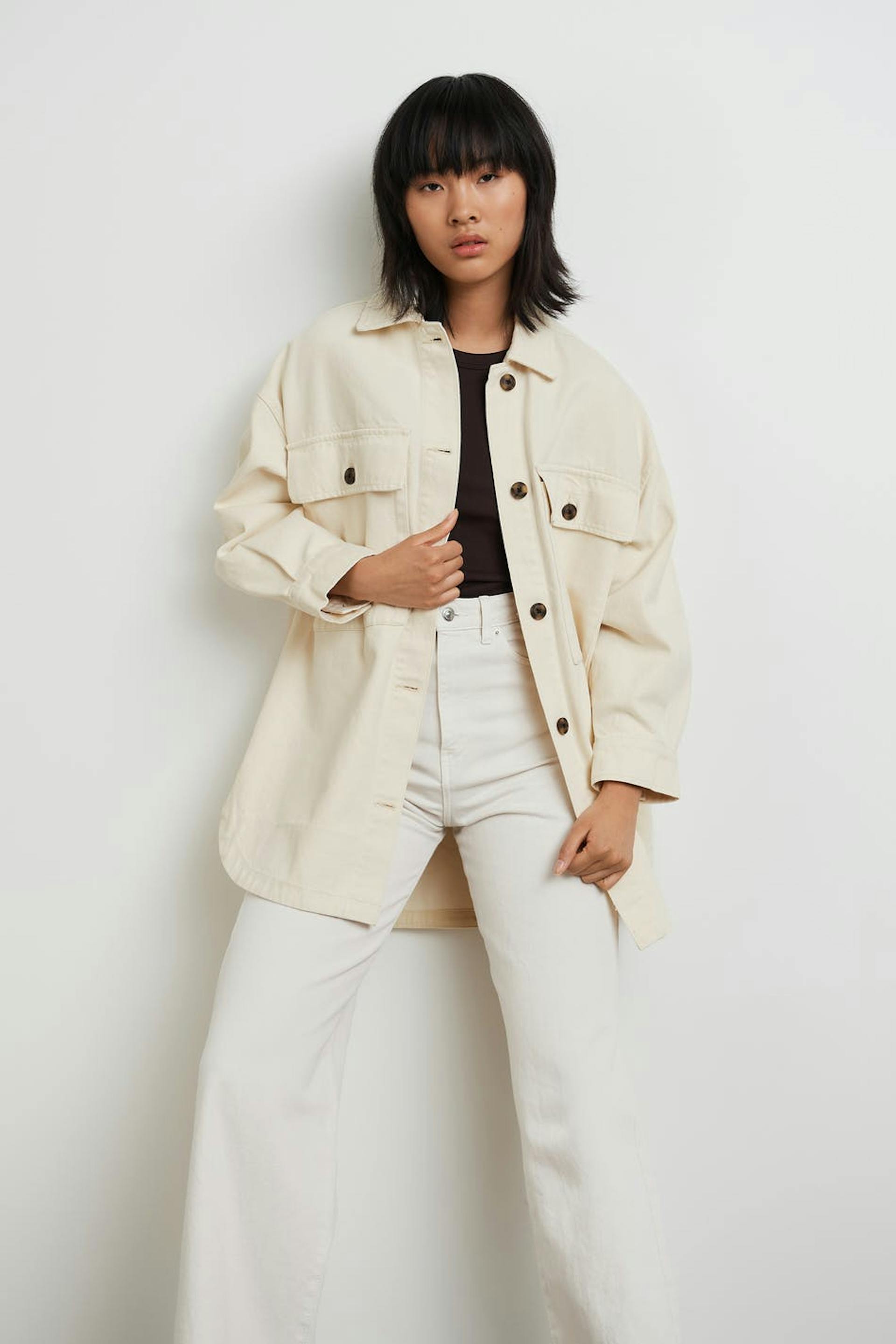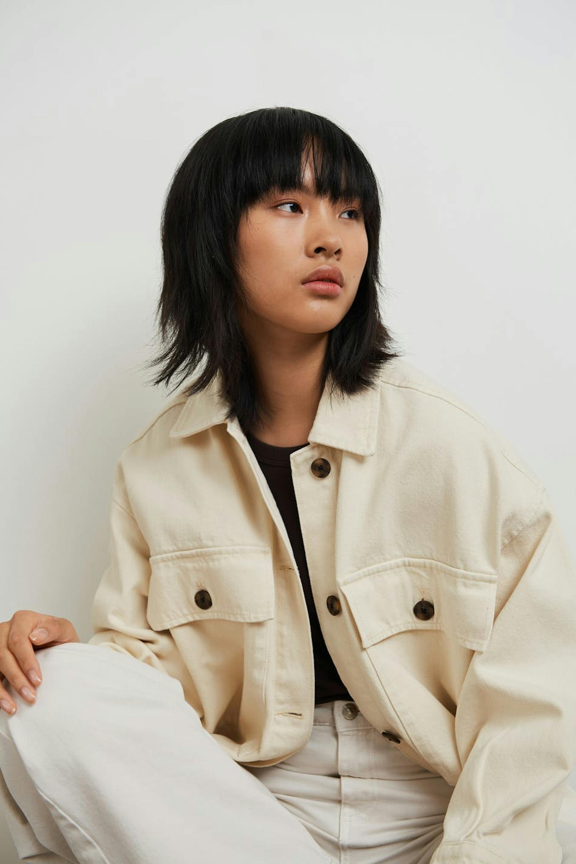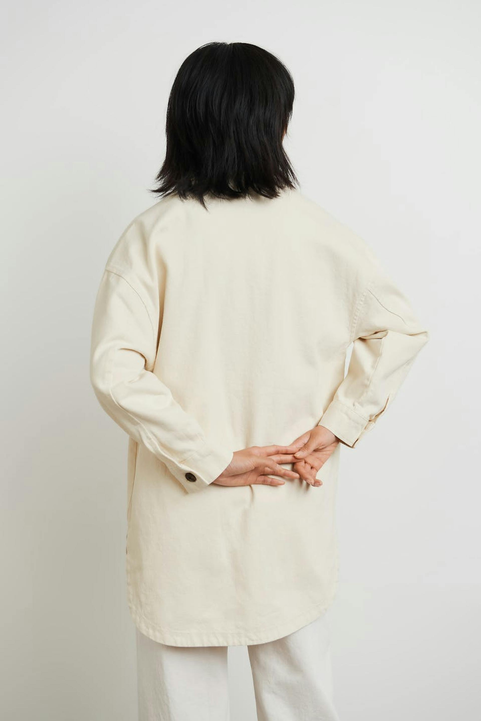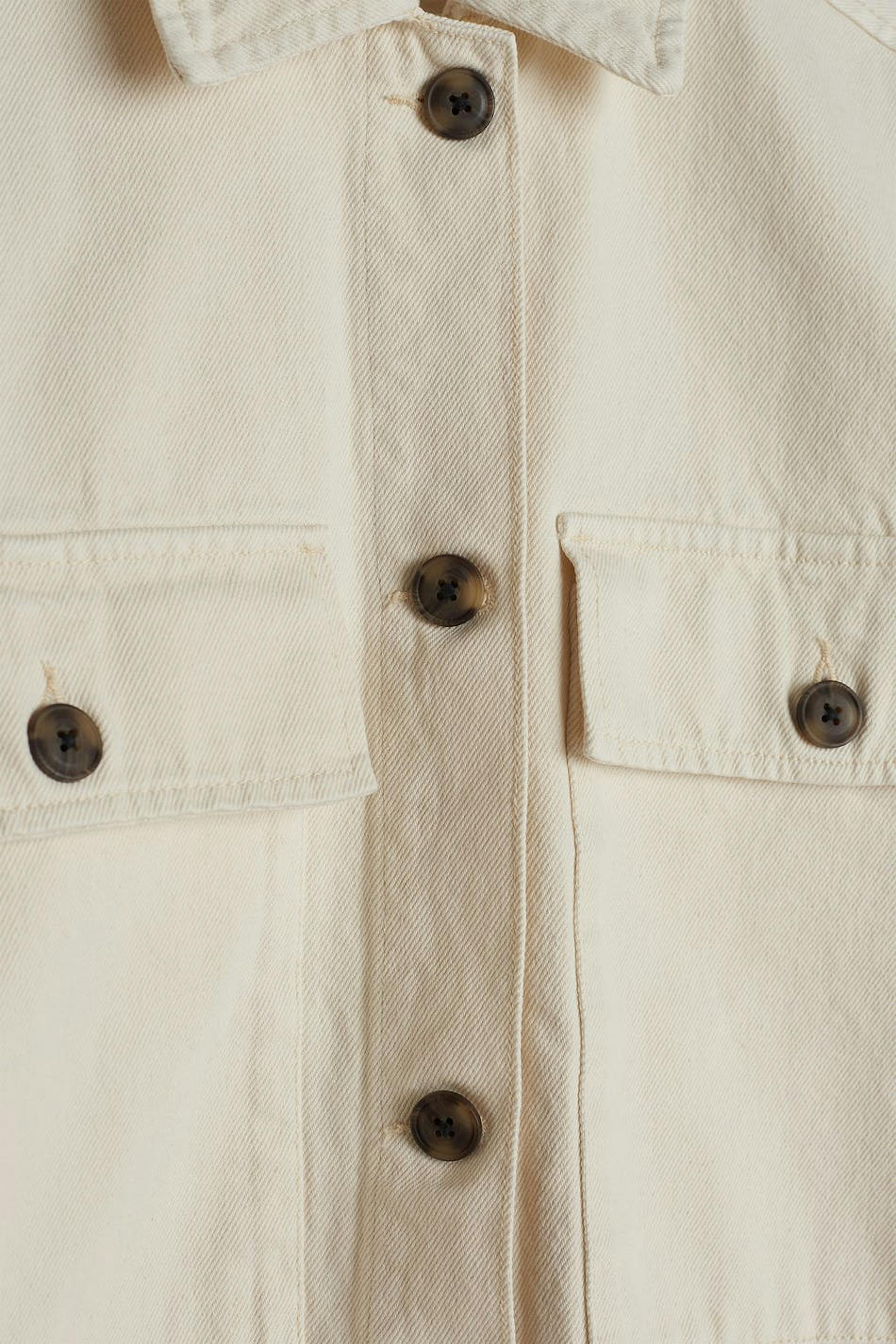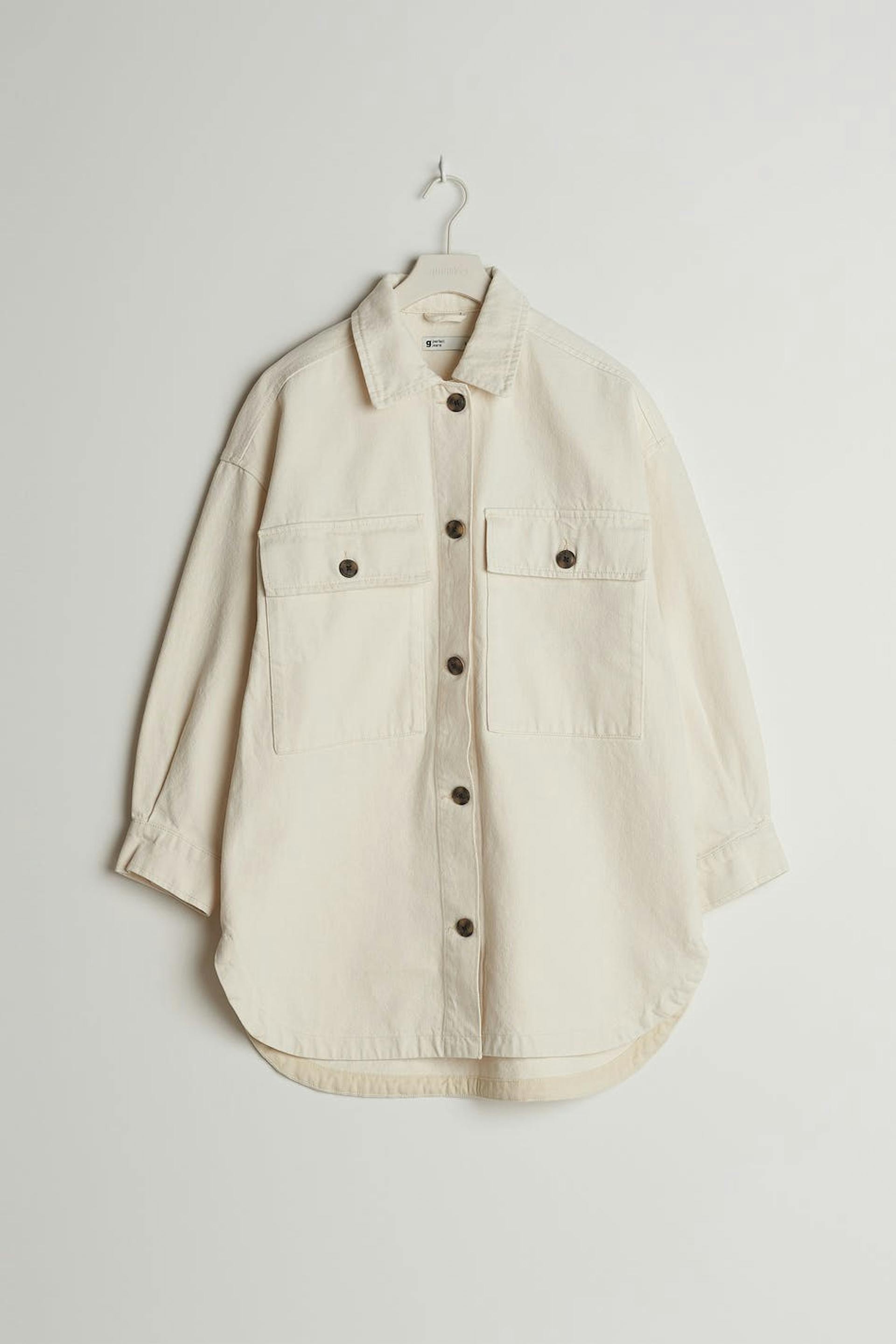 Shirt jacket in denim with an oversize fit. The jacket is white and has two chest pockets at the front. It has a collar, a decorative button on the sleeve ends and a button closure at the front.