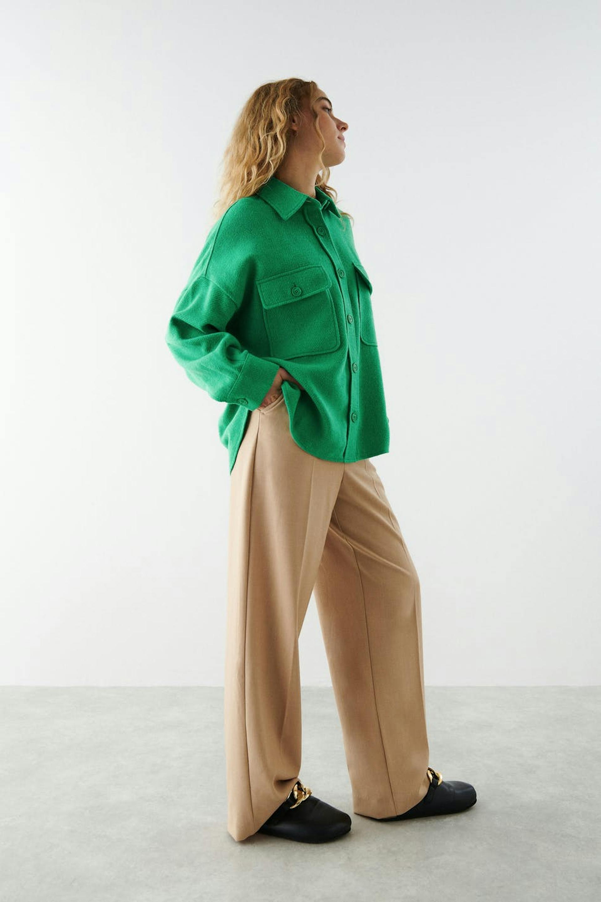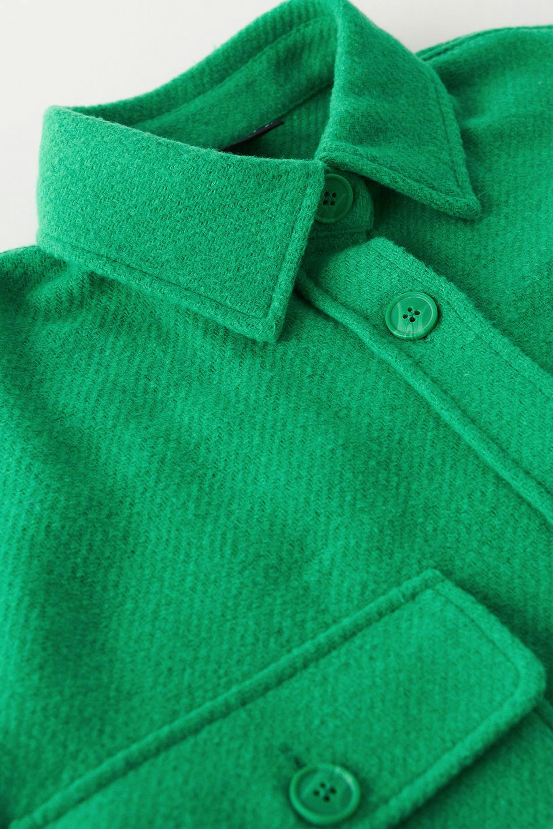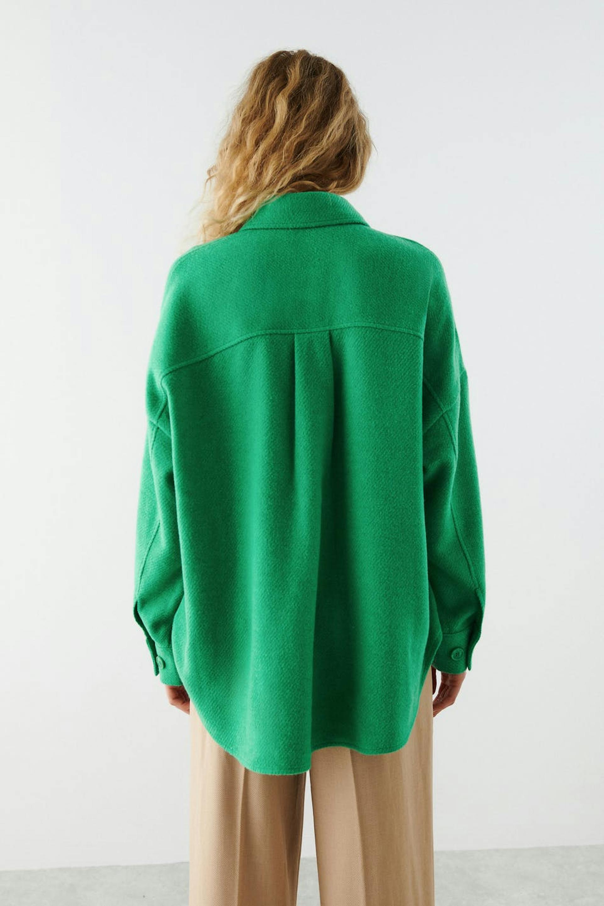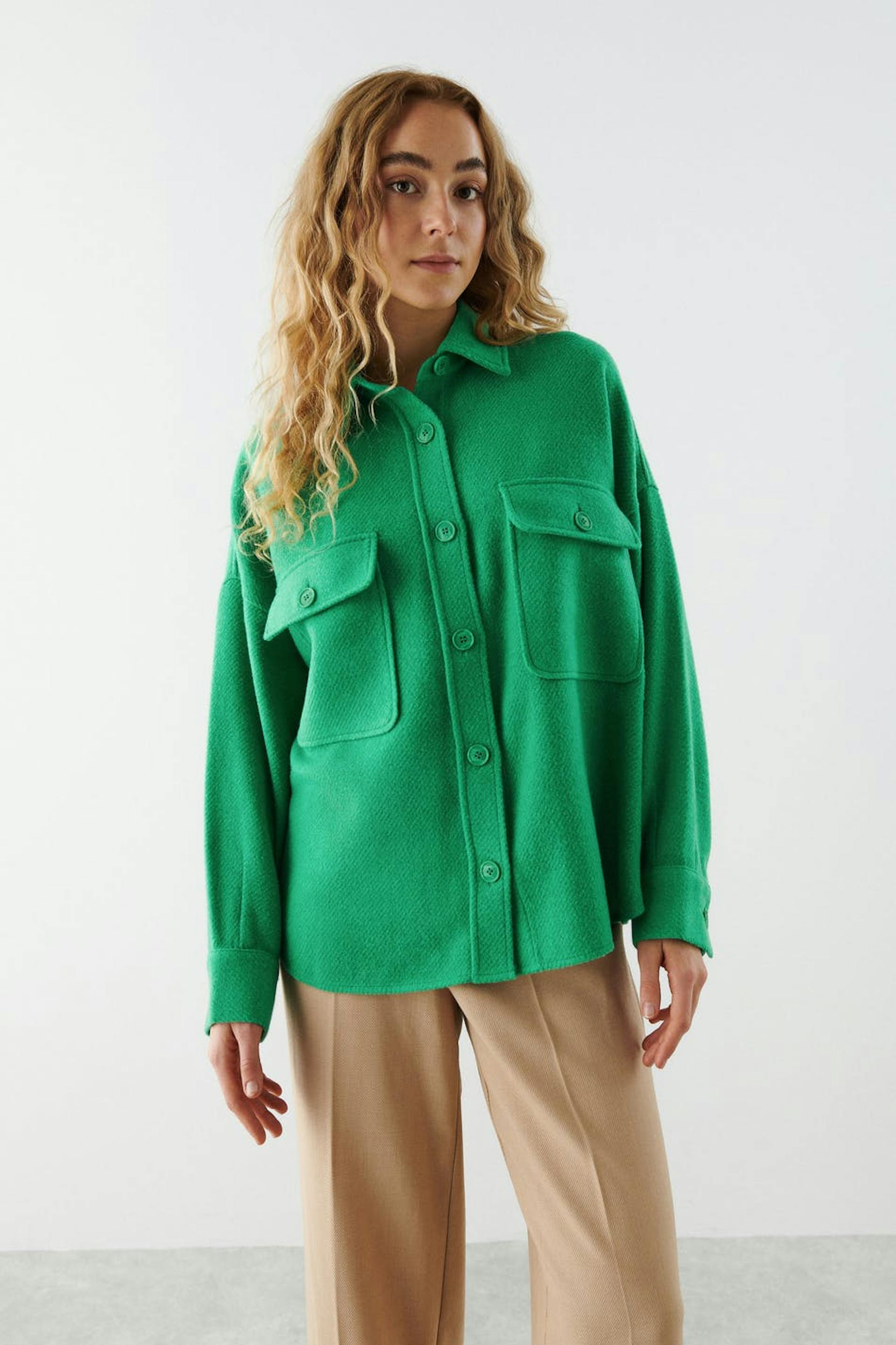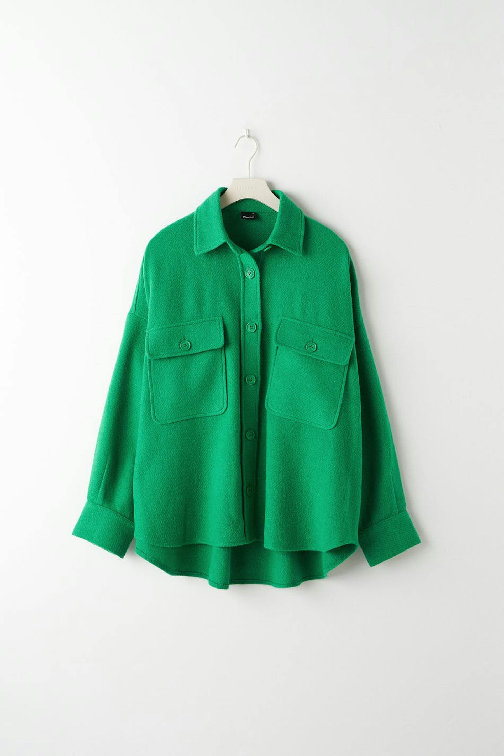 Shirt with chest pockets. The shirt is green and has a collar. It has button closure at the front and in front and buttons on the sleeve ends.