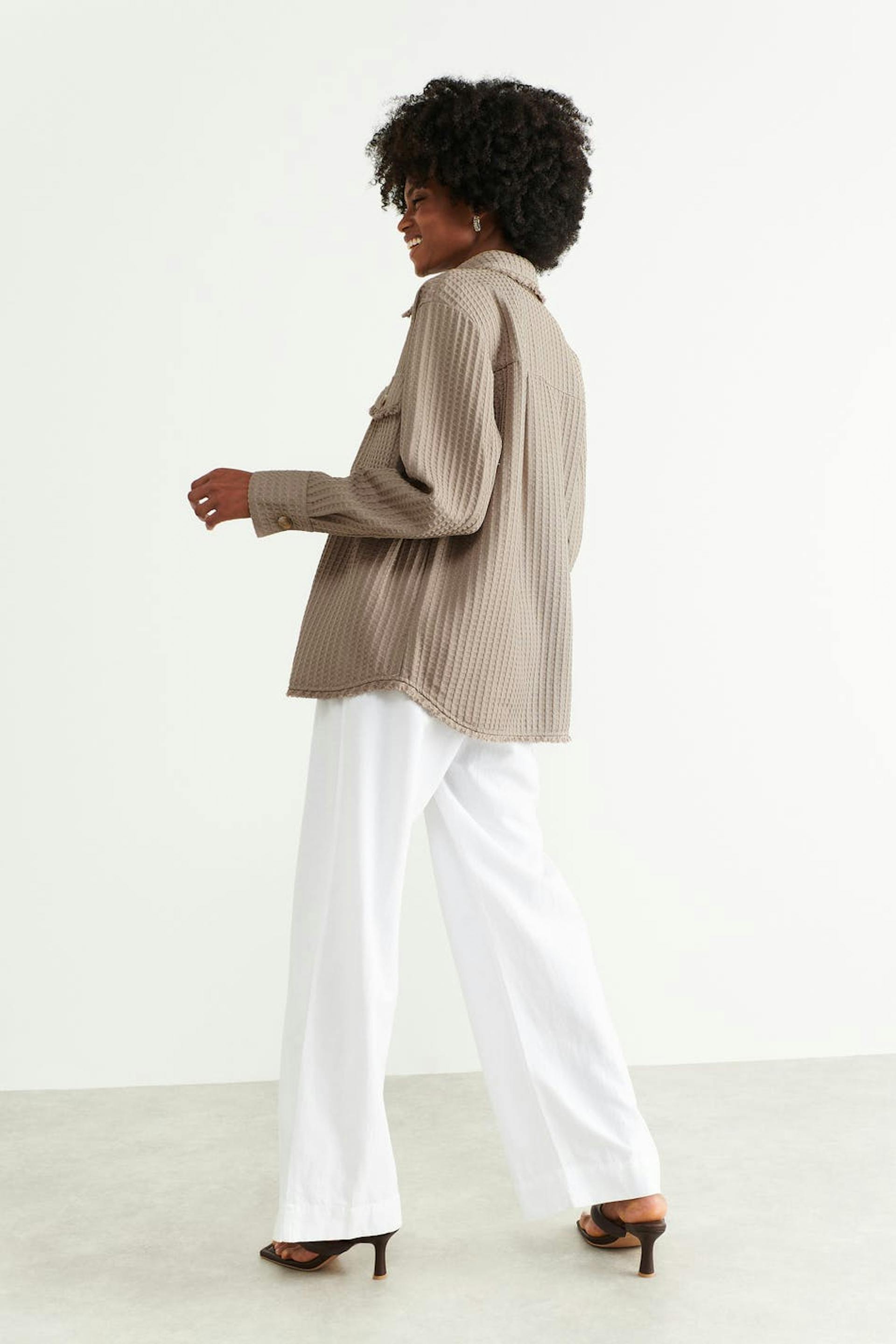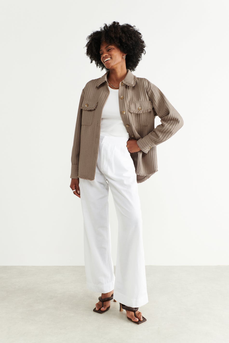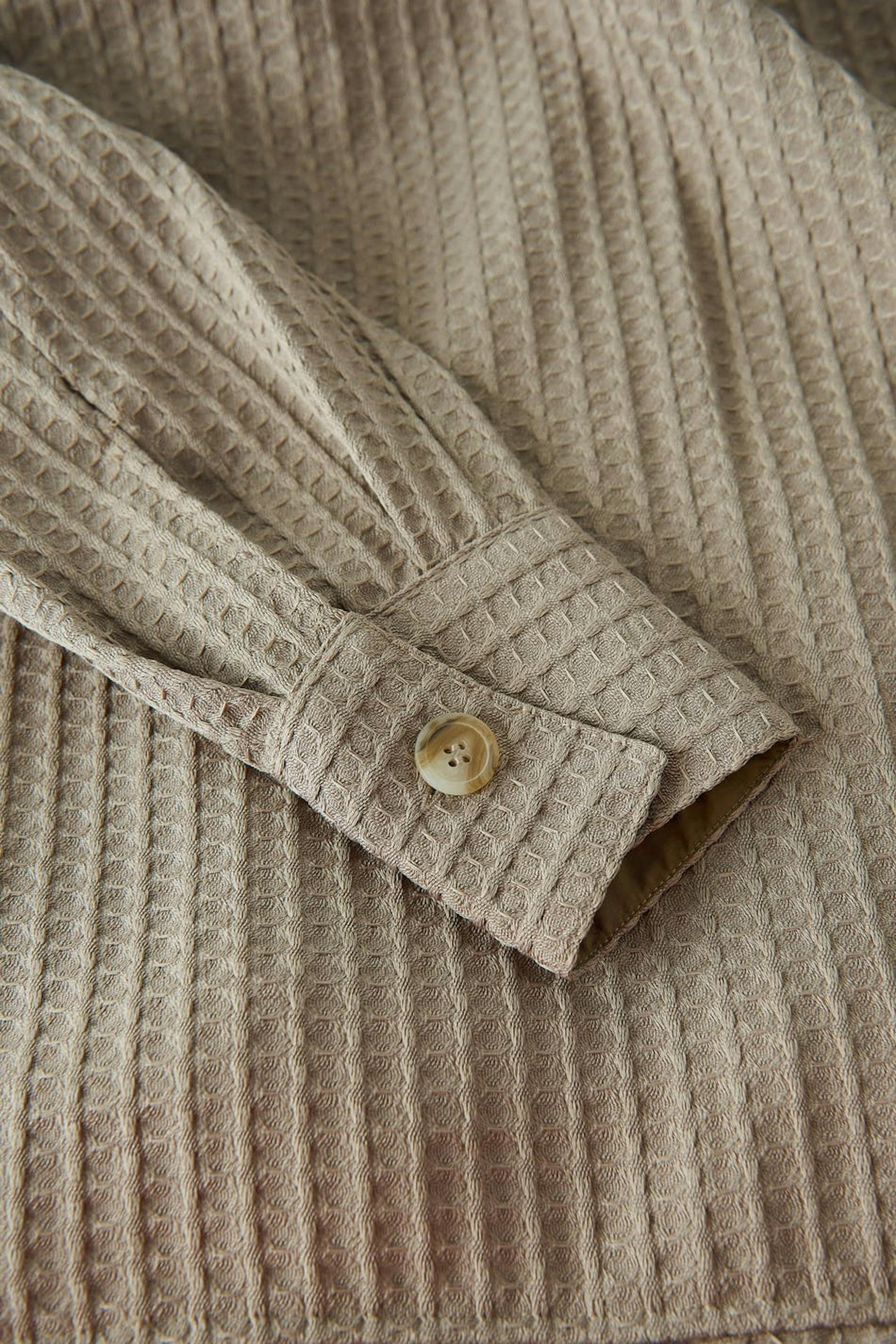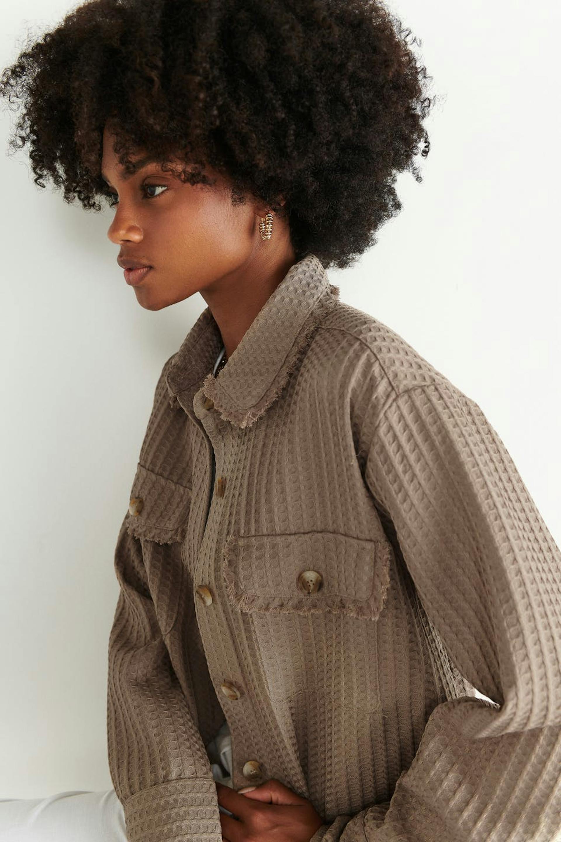 Waffle weave shirt jacket with loose-fitting style. The shacket is beige and has button placket in front. It has chest pockets, collar and raw edges.