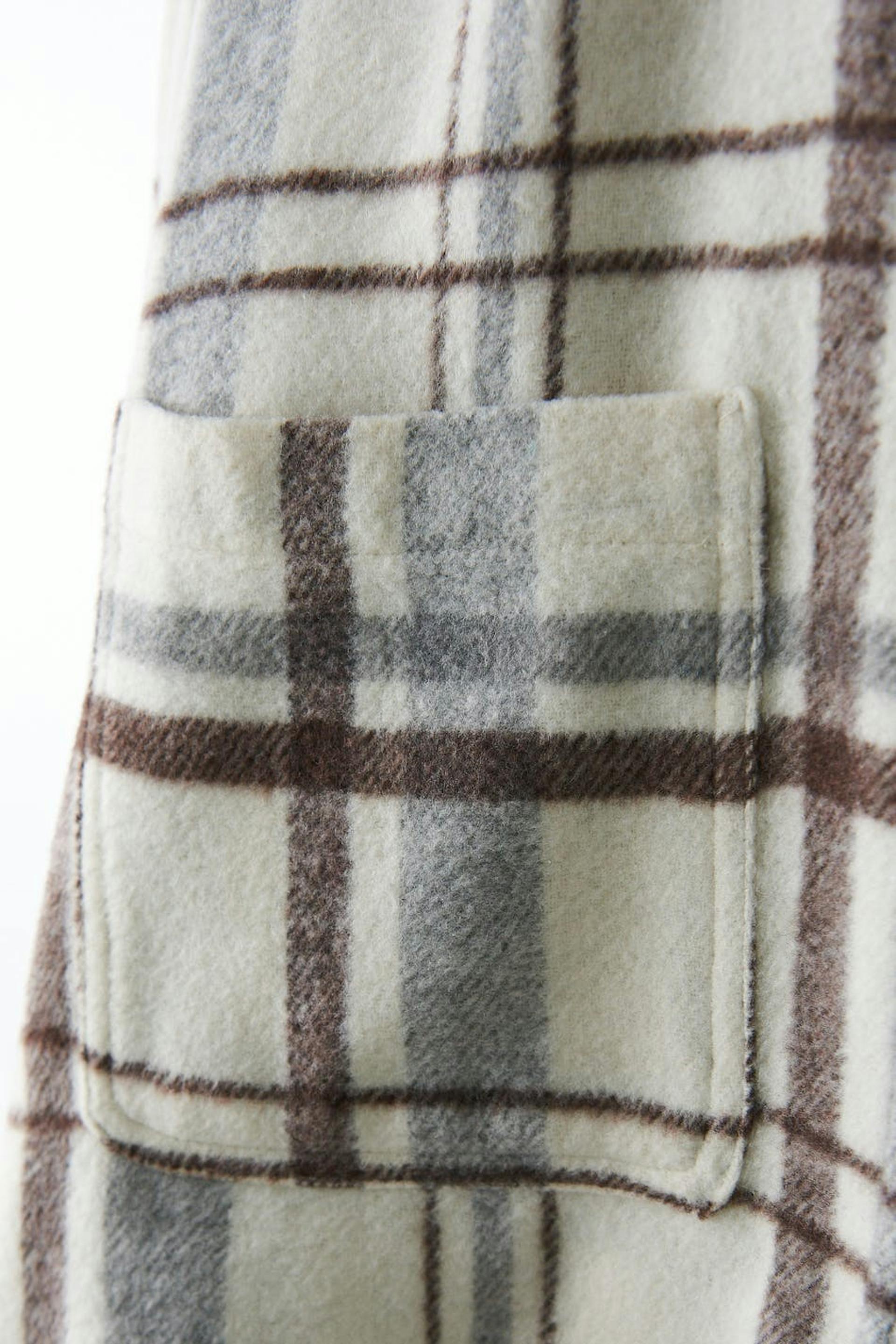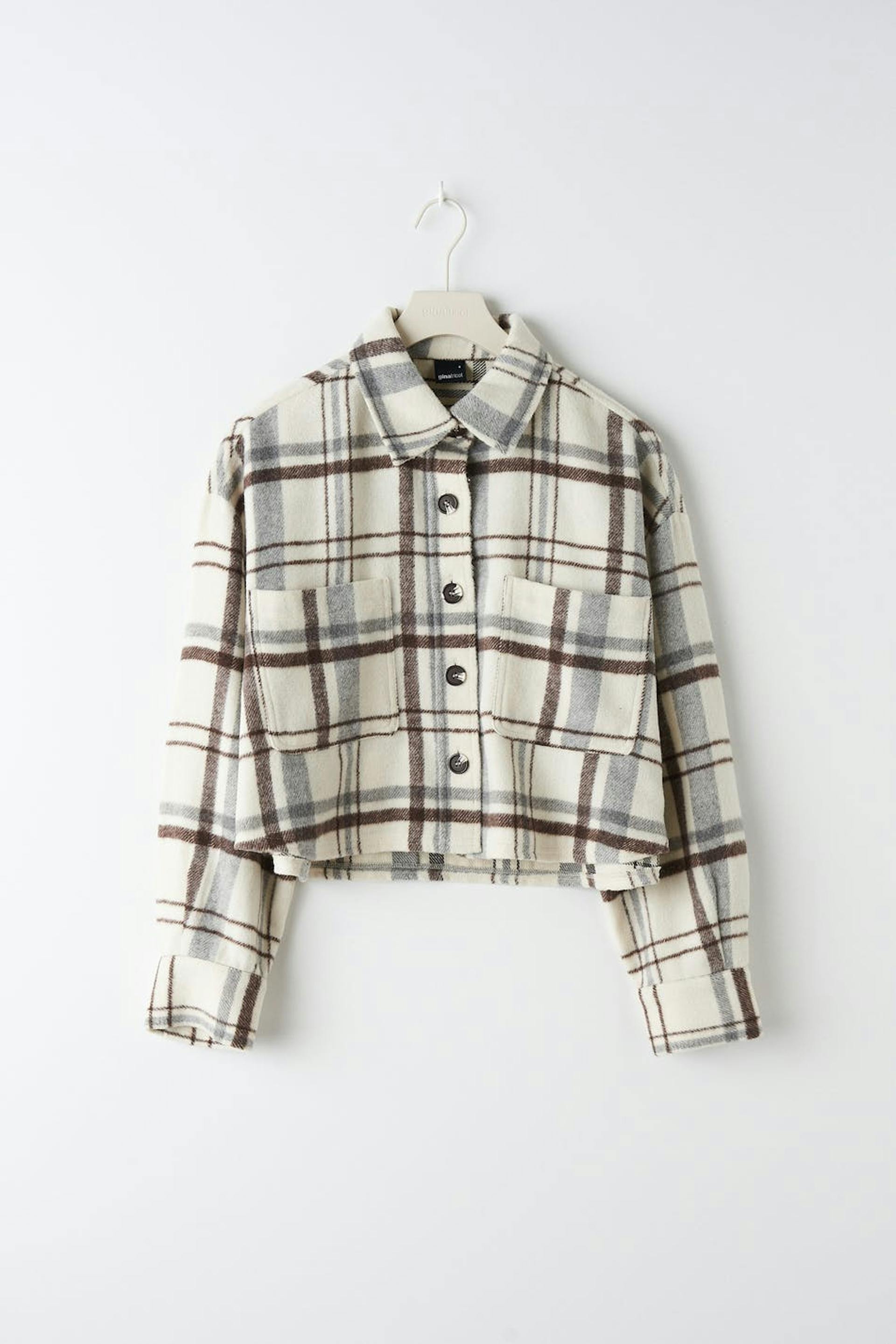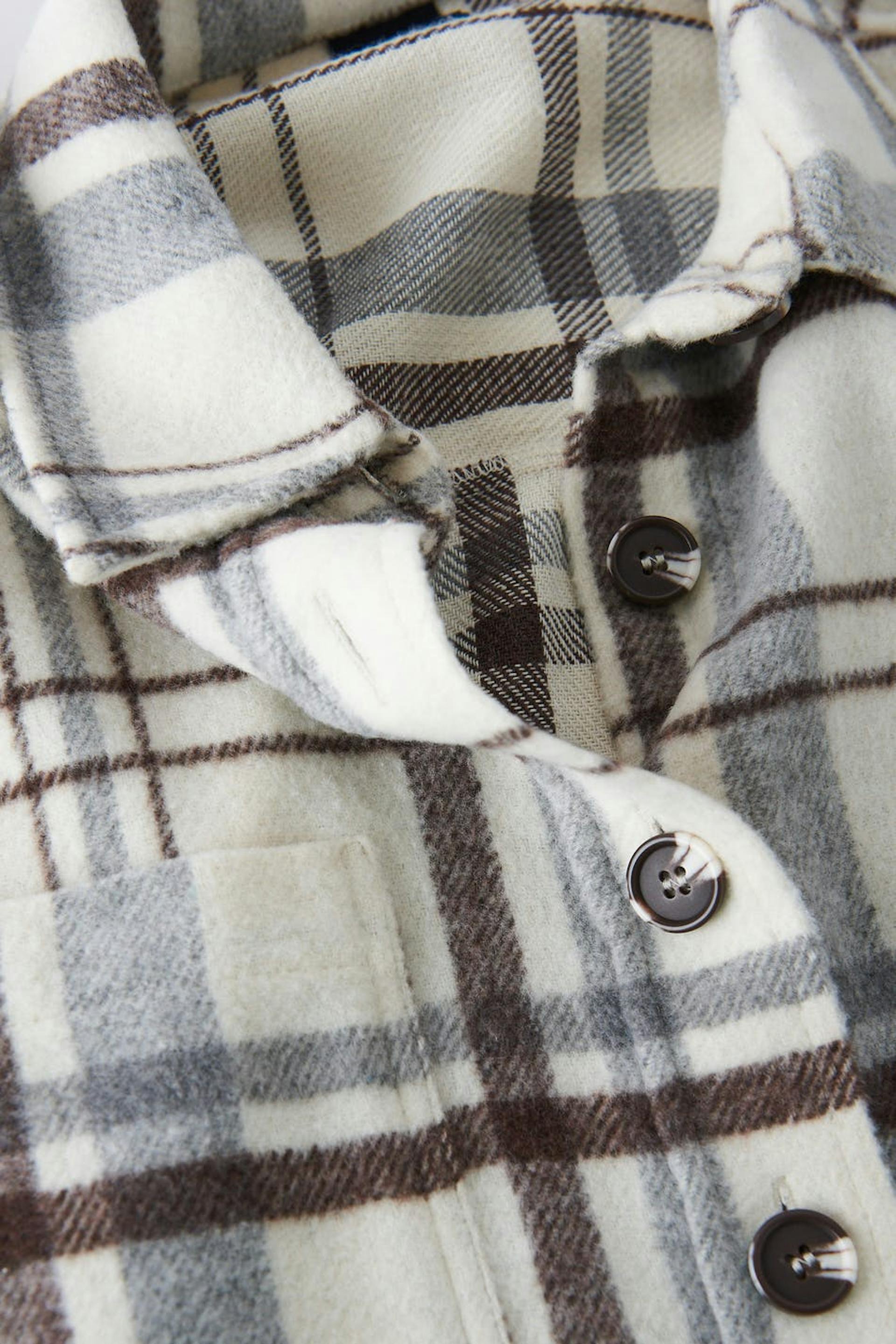 Checked shirt jacket in flannel with an oversize fit. The shacket is brown, white and short. It has button placket in front, collar, chest pockets and yoke with pleats at the back.