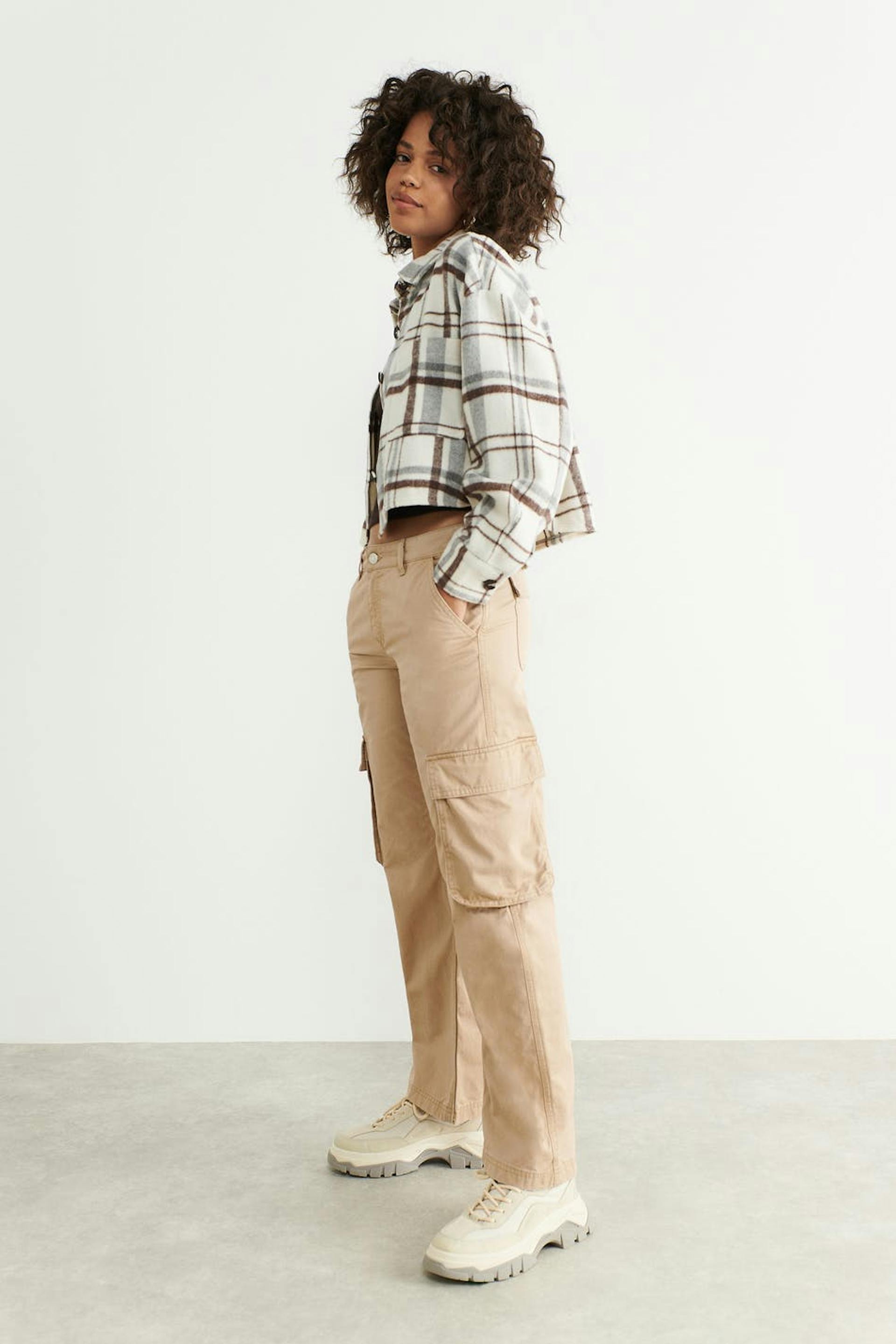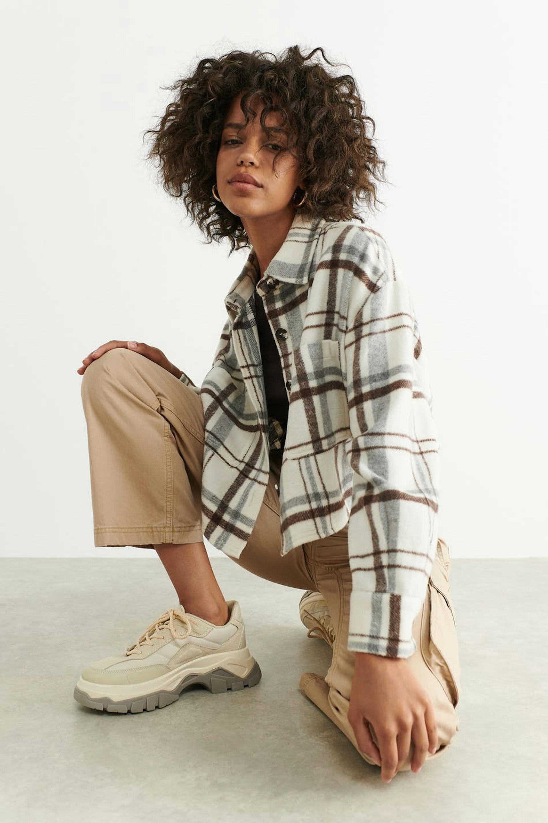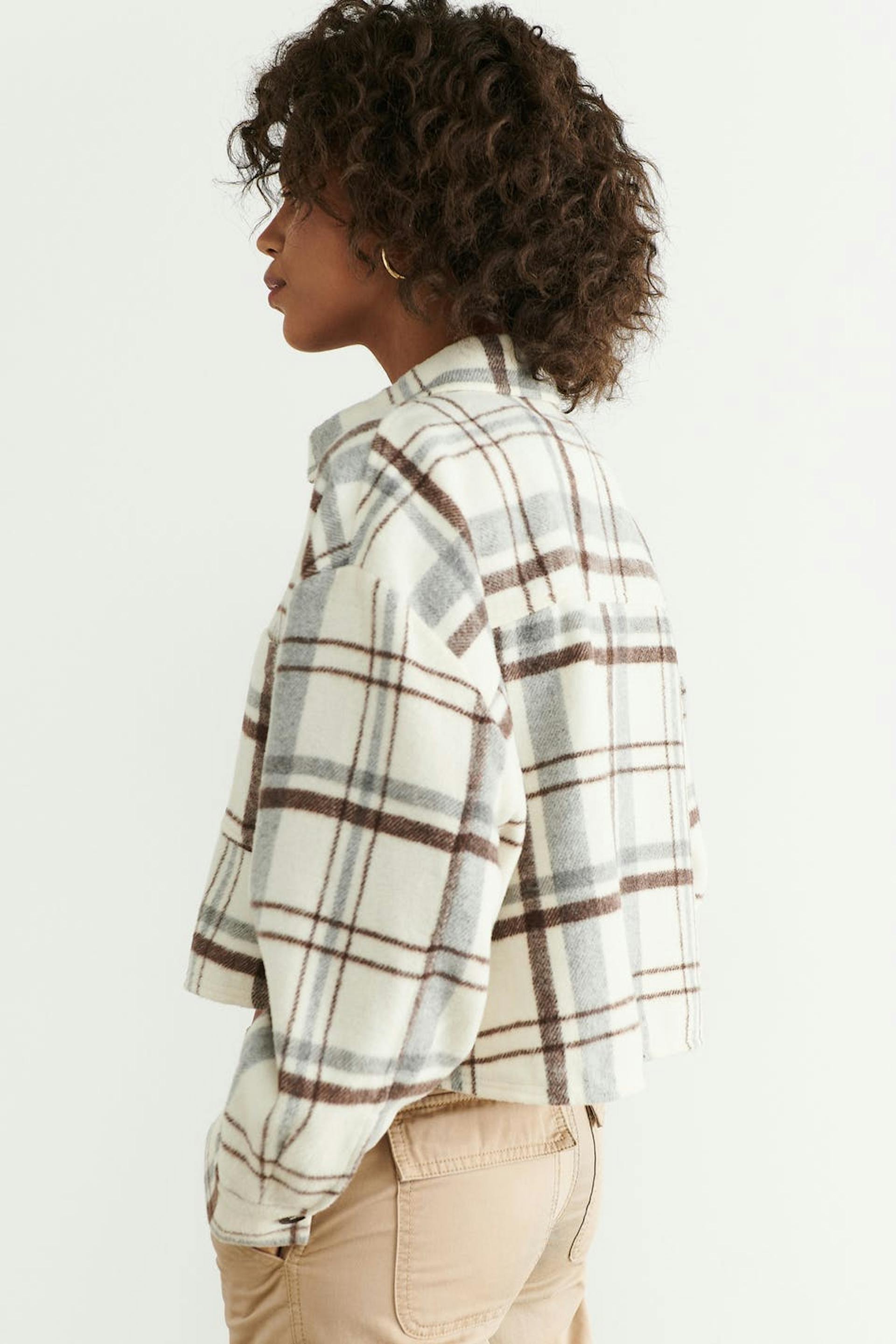 Checked shirt jacket in flannel with an oversize fit. The shacket is brown, white and short. It has button placket in front, collar, chest pockets and yoke with pleats at the back.
