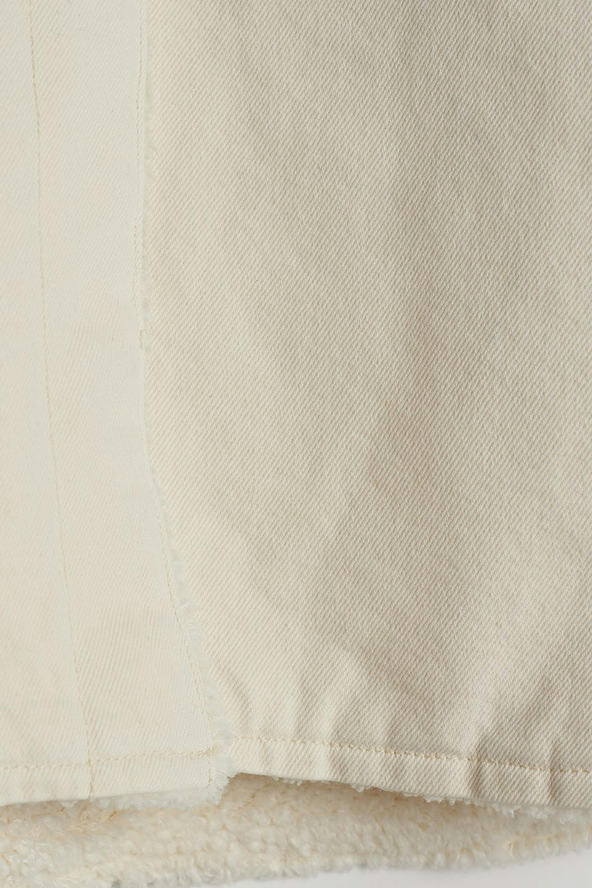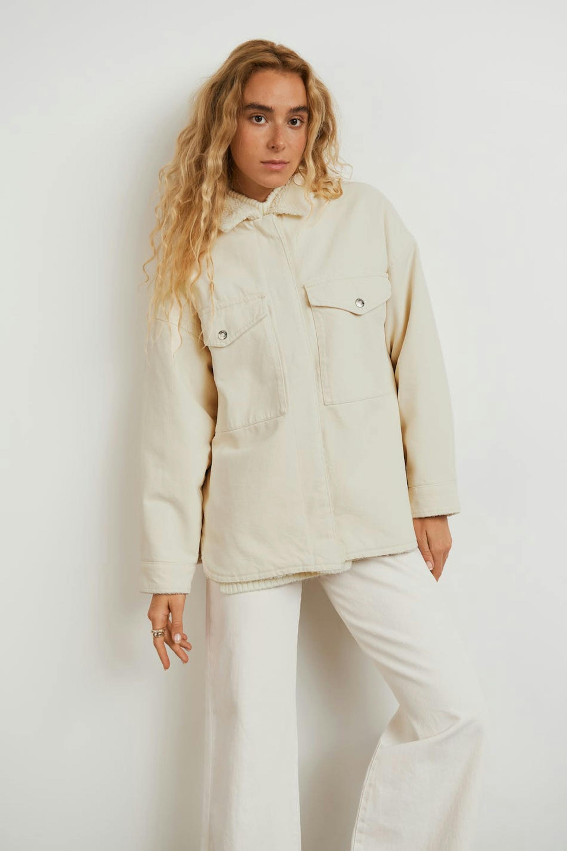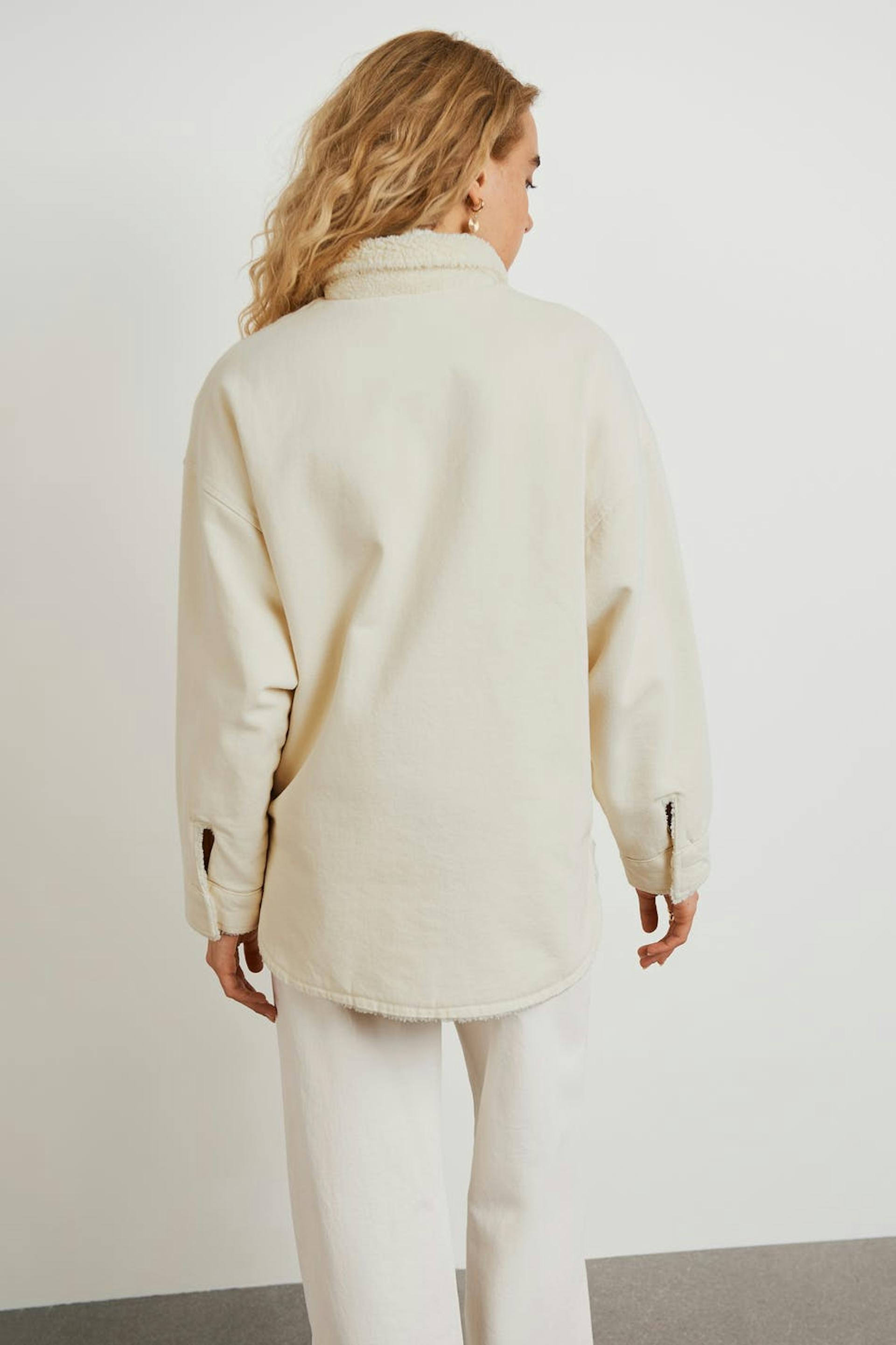 Lined shirt jacket in denim with an oversize fit. The jacket is beige and has a lining in teddy fleece. It has a collar and two big pockets at the front.