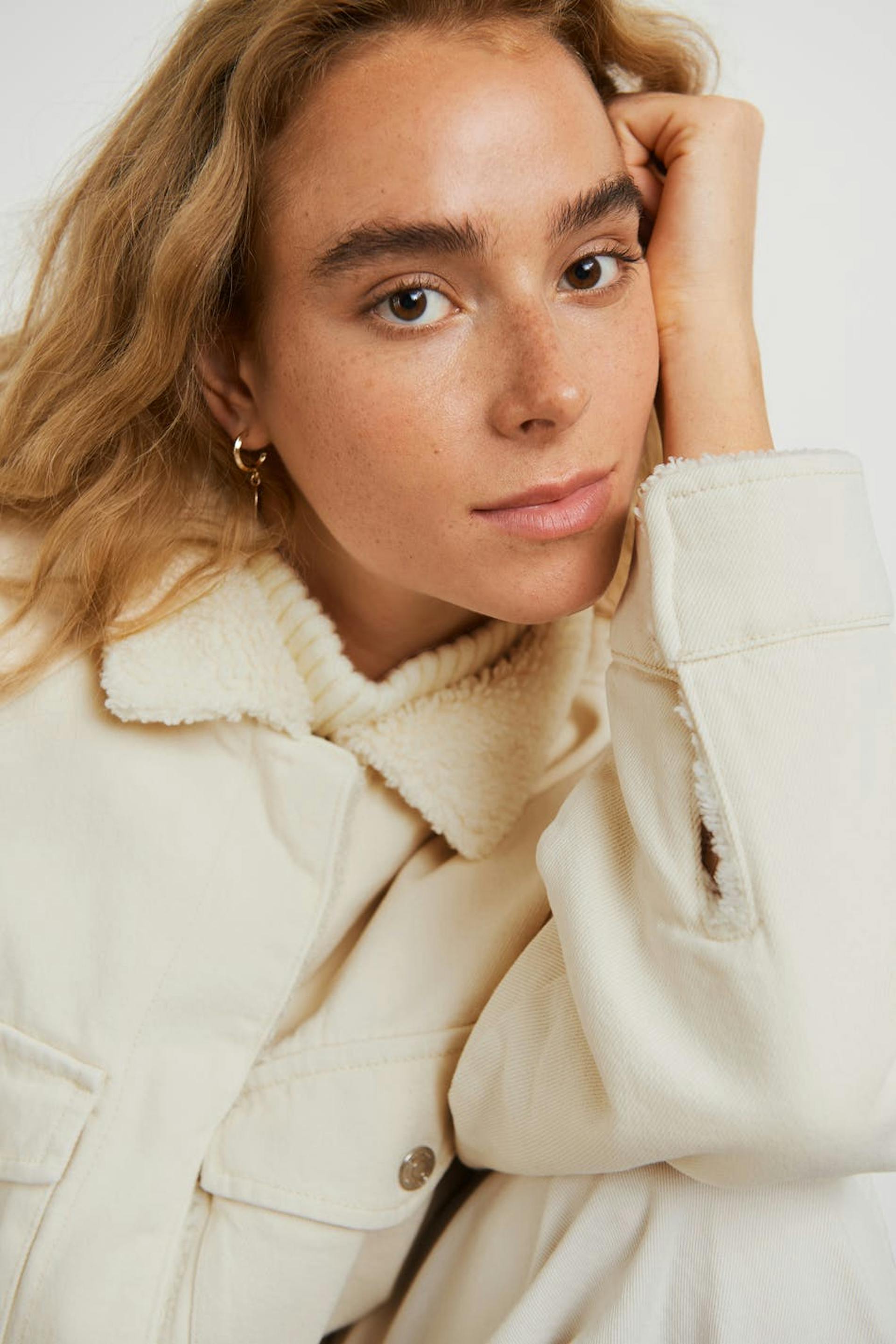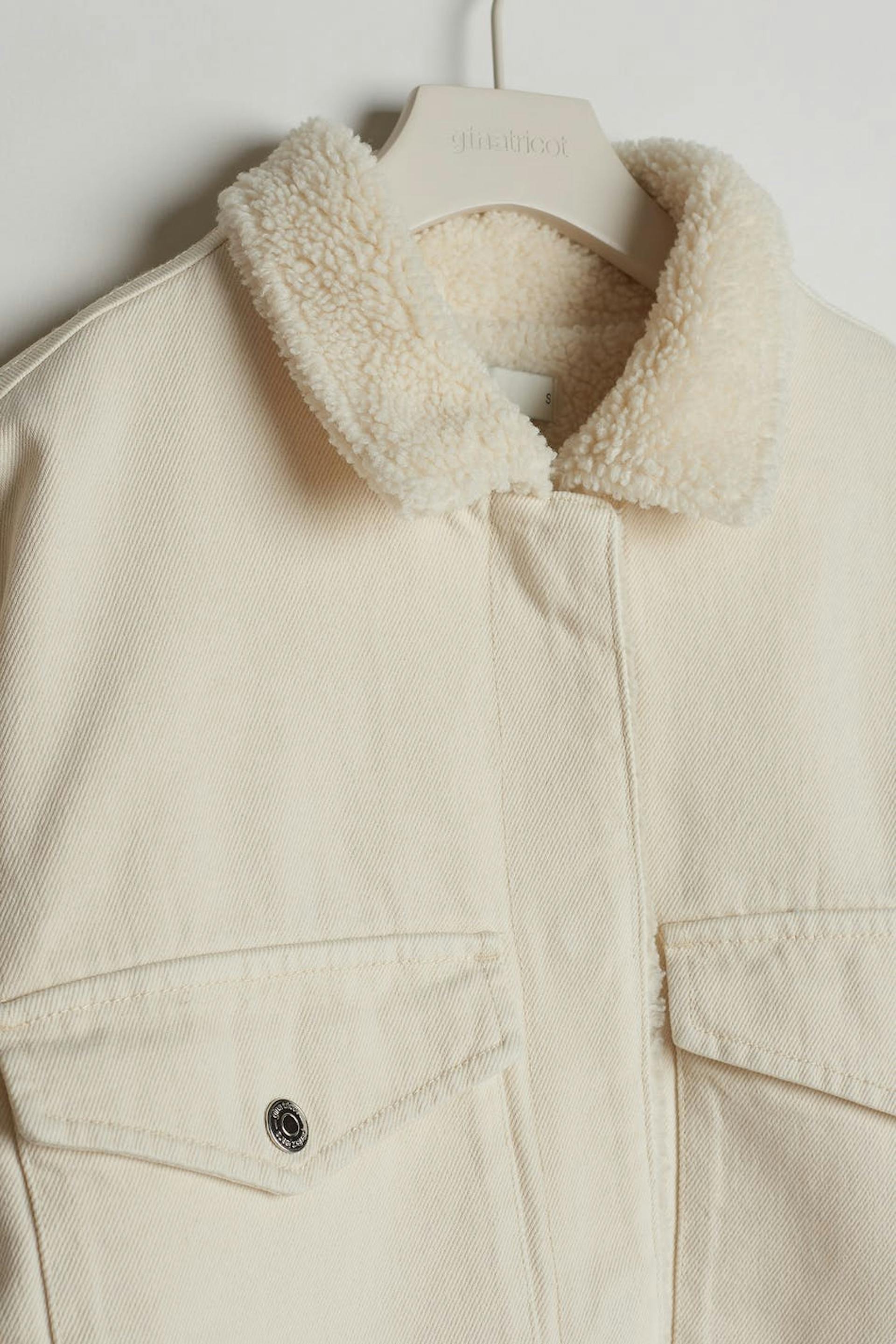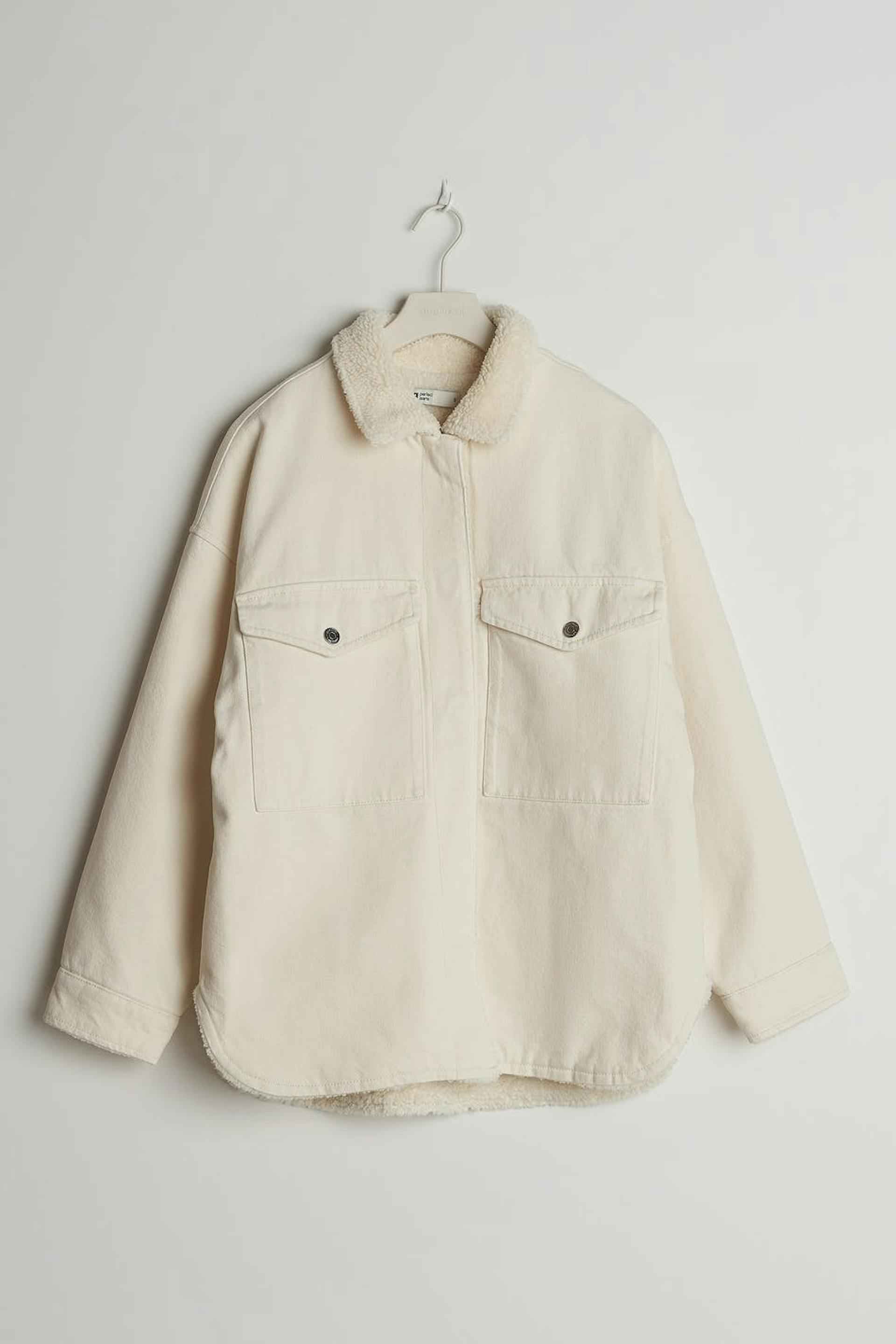 Lined shirt jacket in denim with an oversize fit. The jacket is beige and has a lining in teddy fleece. It has a collar and two big pockets at the front.