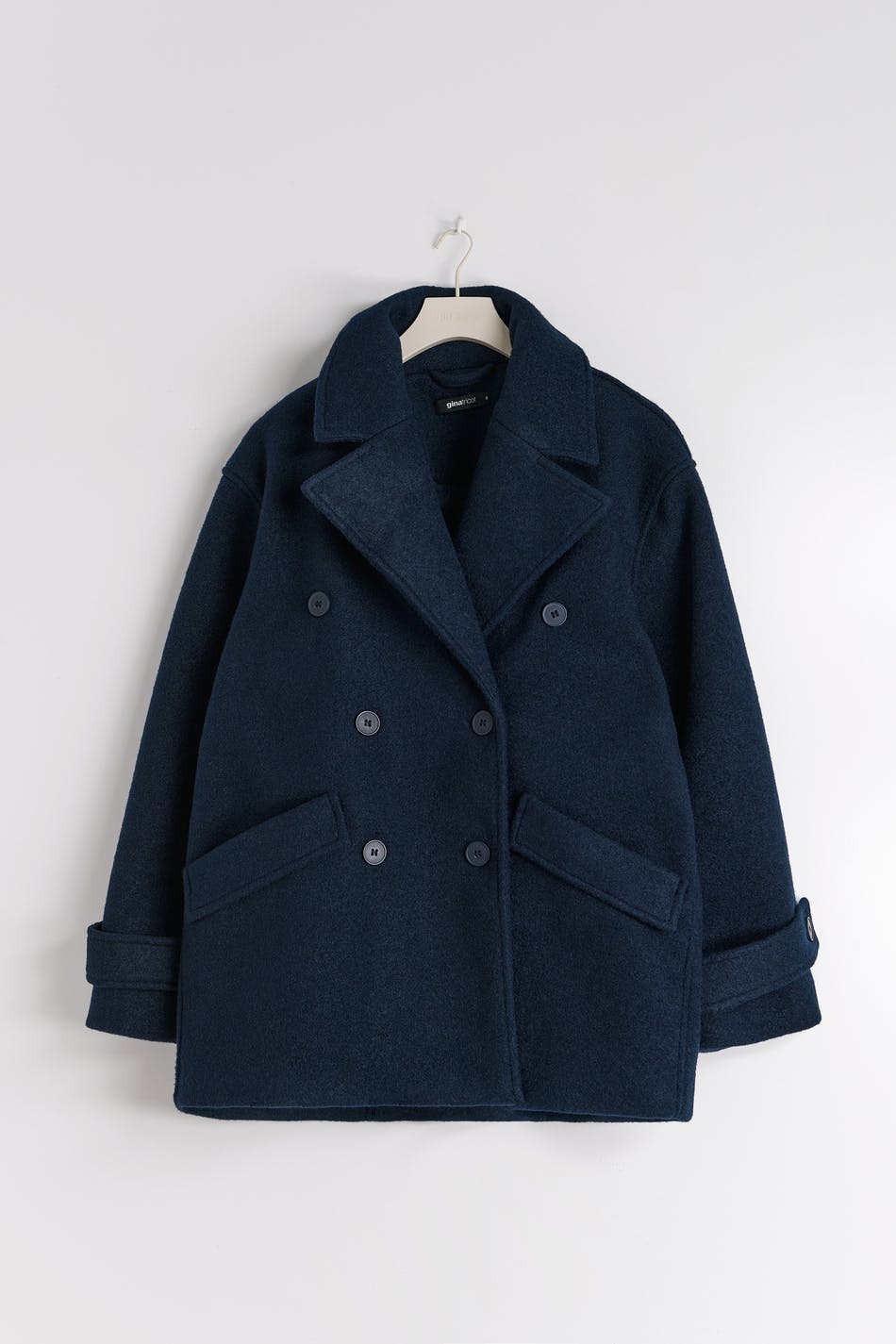 Short coat with double button closure at the front. The coat is blue and has collar with wide lapels. It has pockets in the sides and strap with button at sleeve ends.