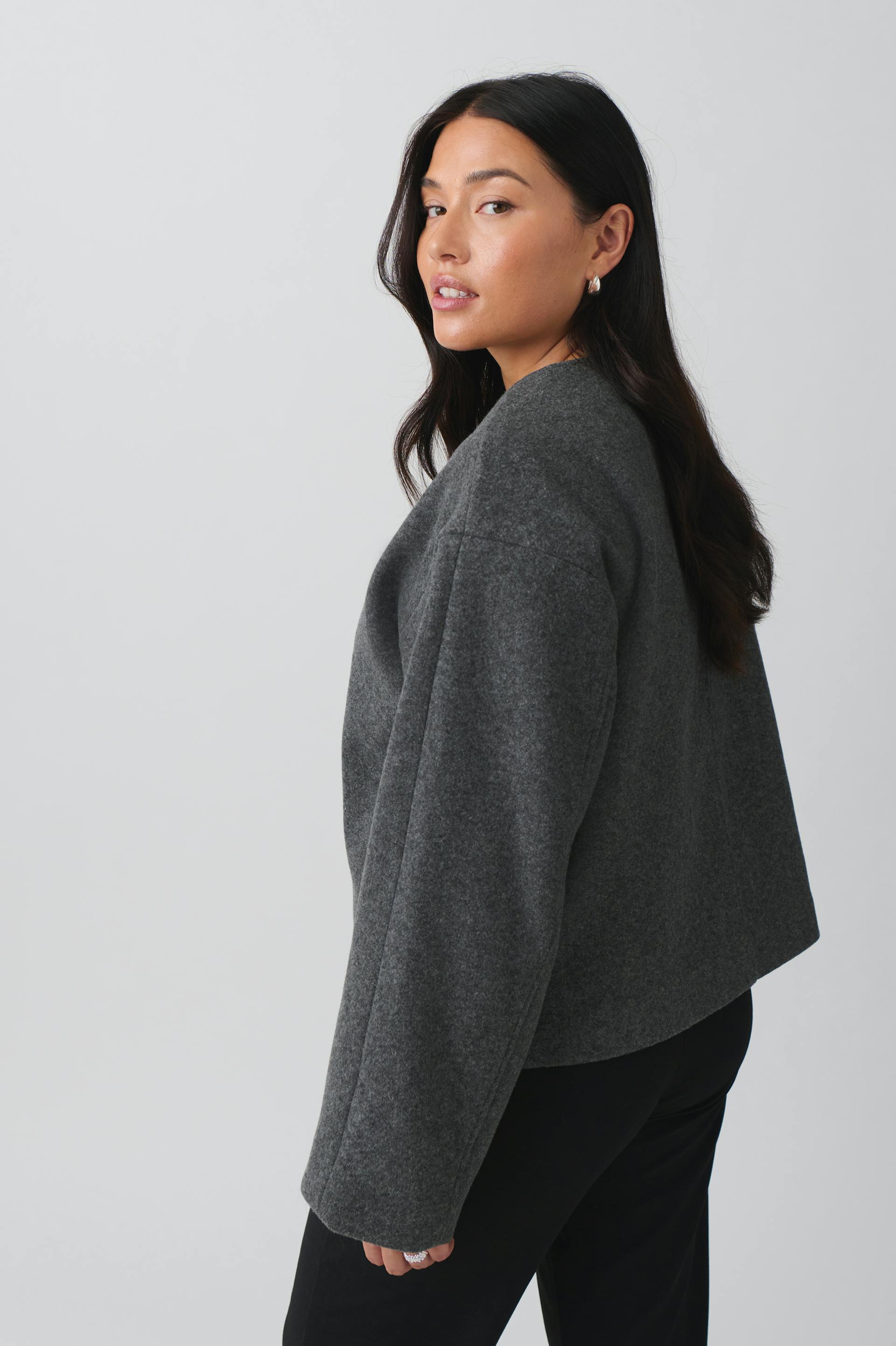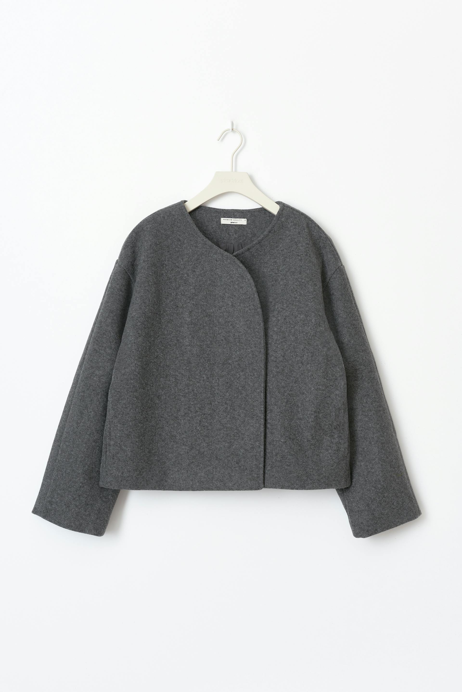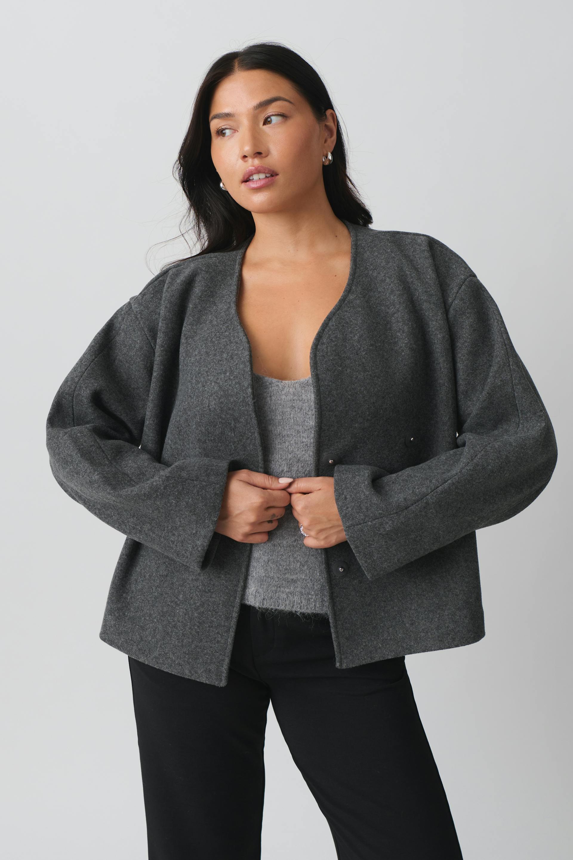 Short jacket with round neckline. The jacket is grey and has hidden buttoning at the front. It has pockets in the sides and long sleeve. Lined.