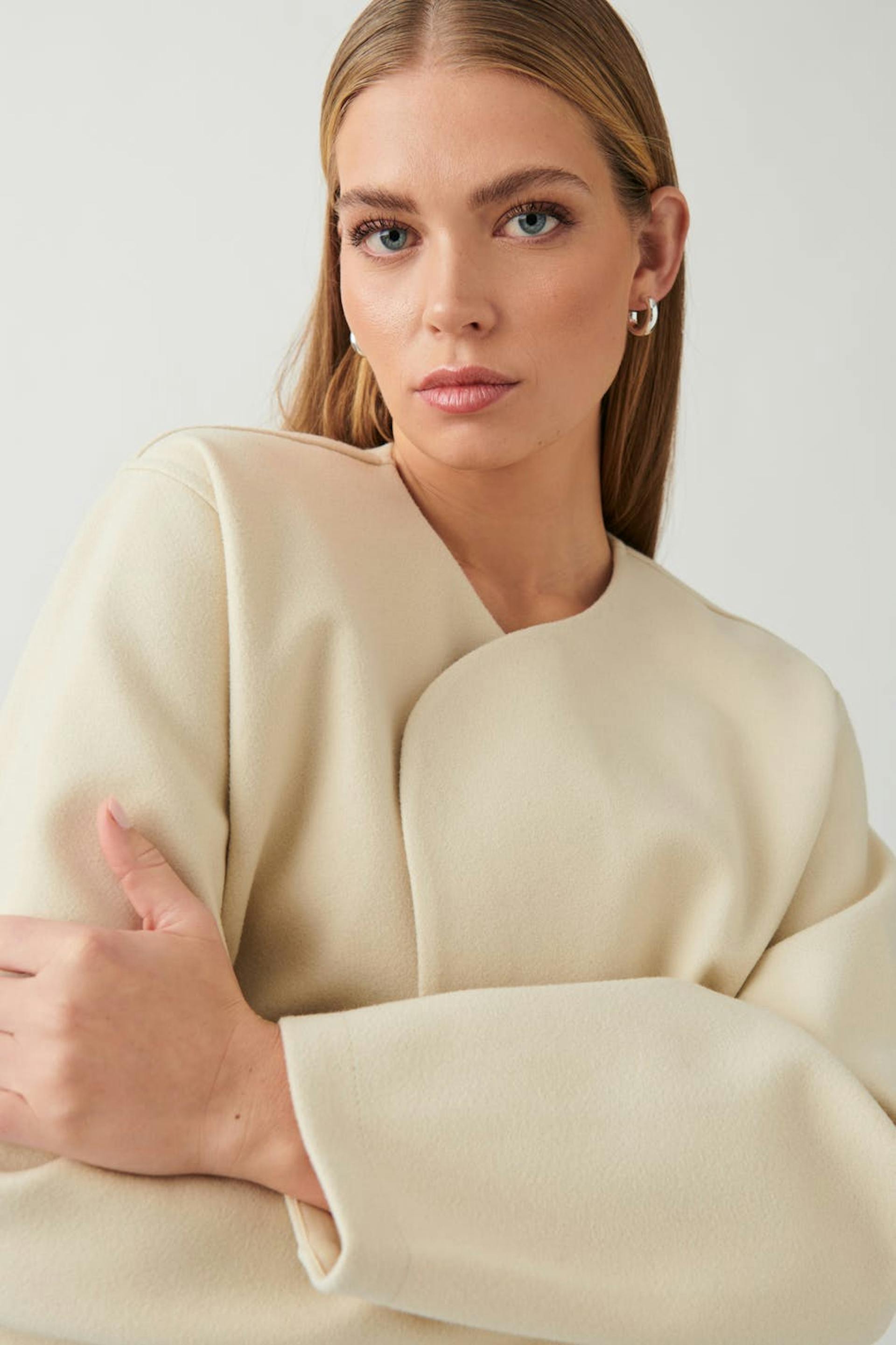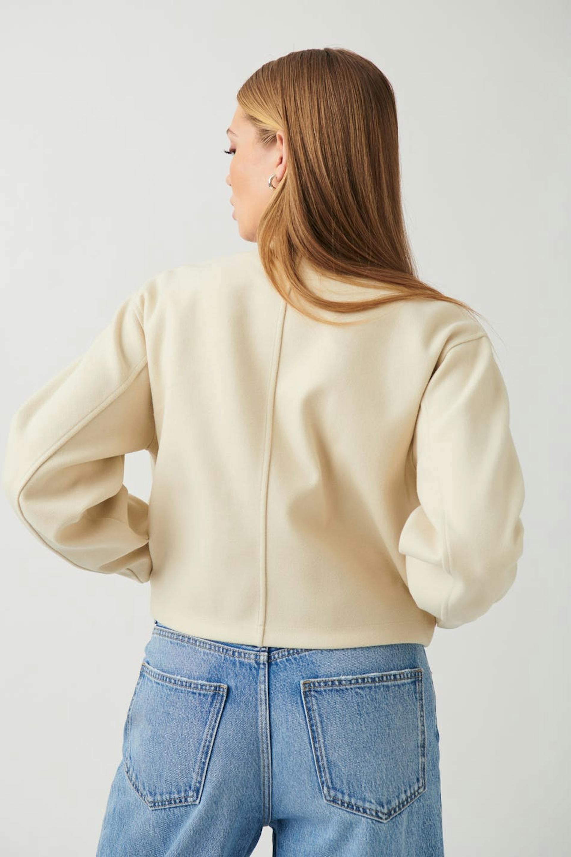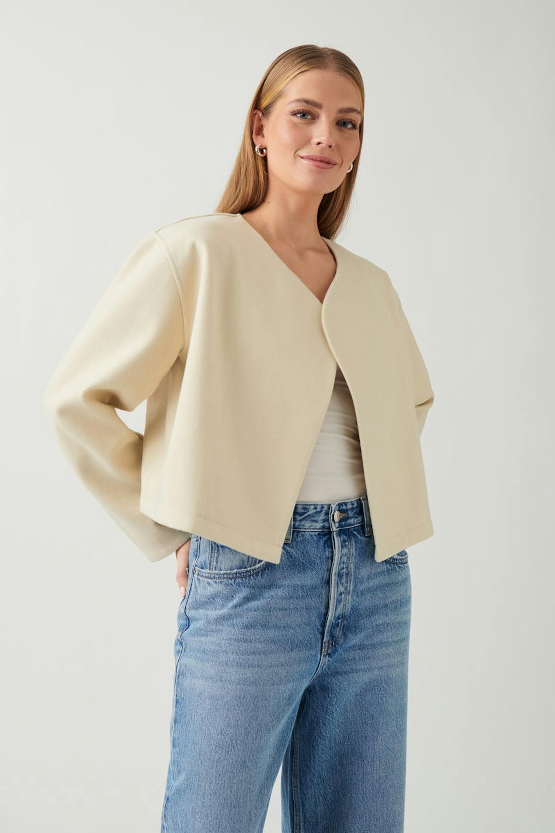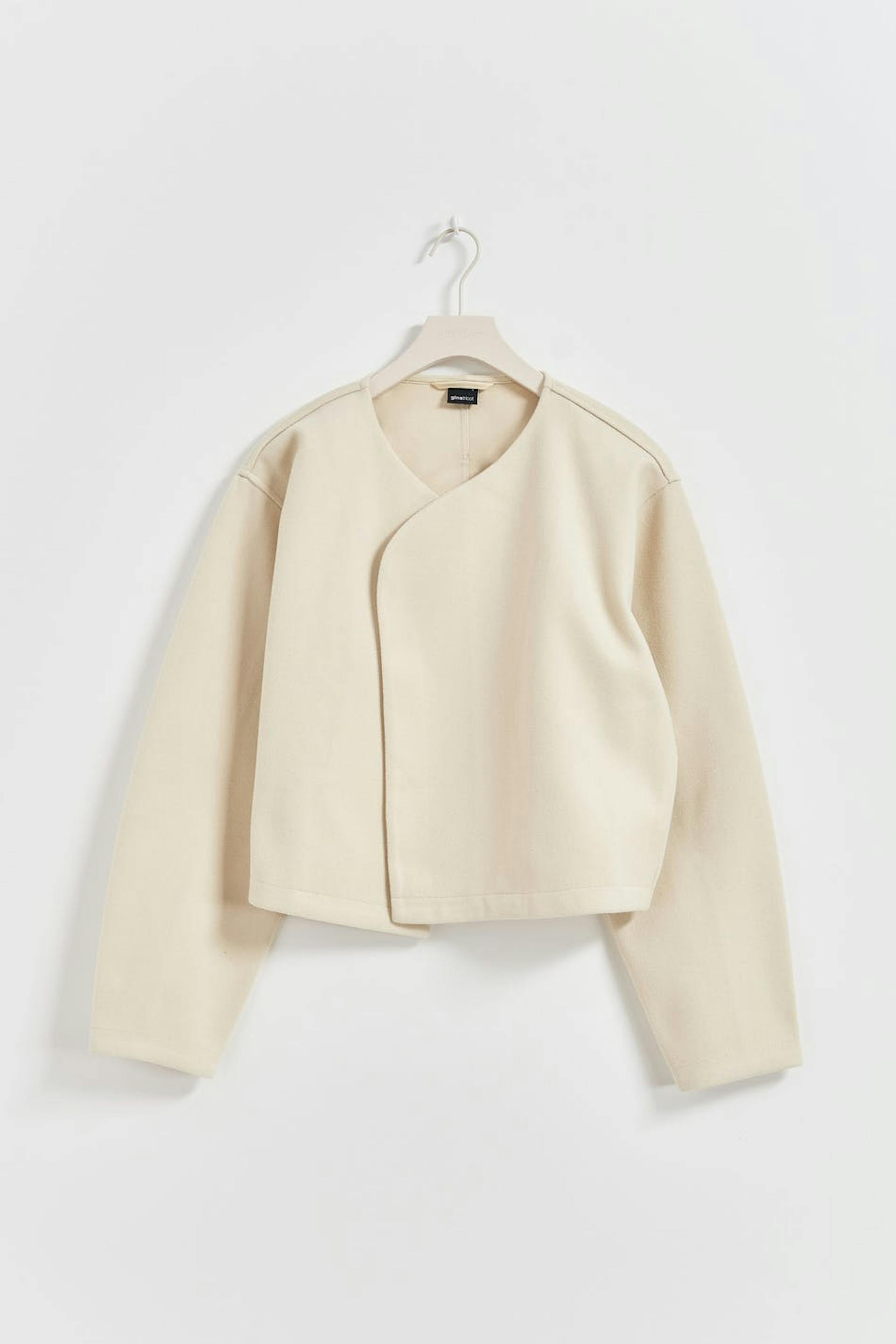 Short jacket with a wrapover. The jacket is perfect for spring, beige and short. It has wrapover at the front, long sleeve, V-neck and decorative seam details at the back and on the sleeves. No buttons. Match with Blanket stitch scarf for a complete look.