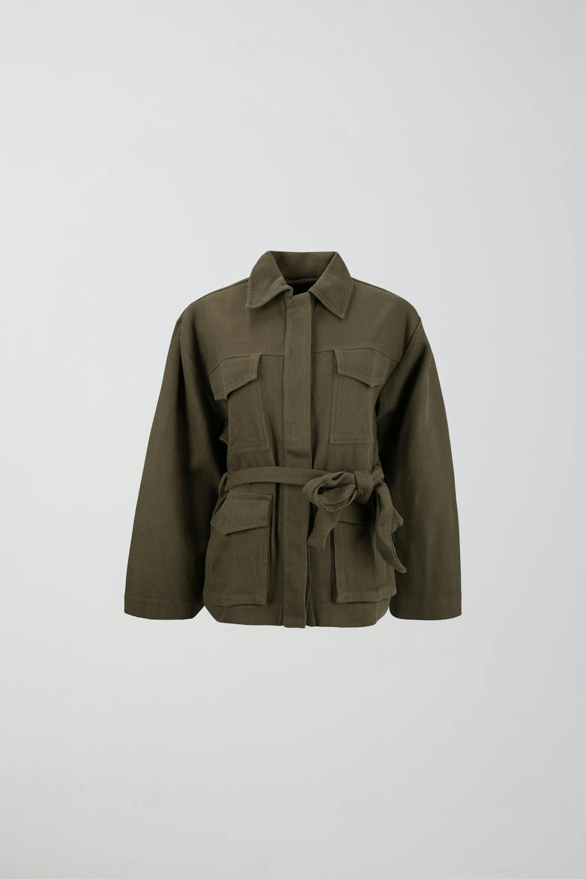 Shirt jacket with tie belt at the waist. The shacket is green and has loose-fitting style. It has chest pockets, a hidden button closure at the front and flap pockets in the sides.
