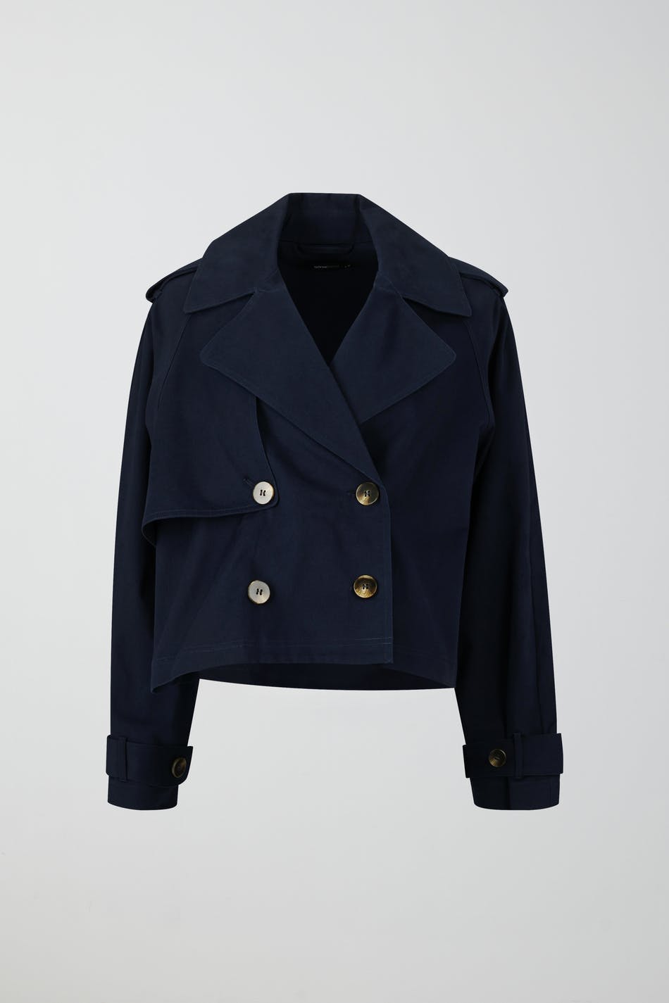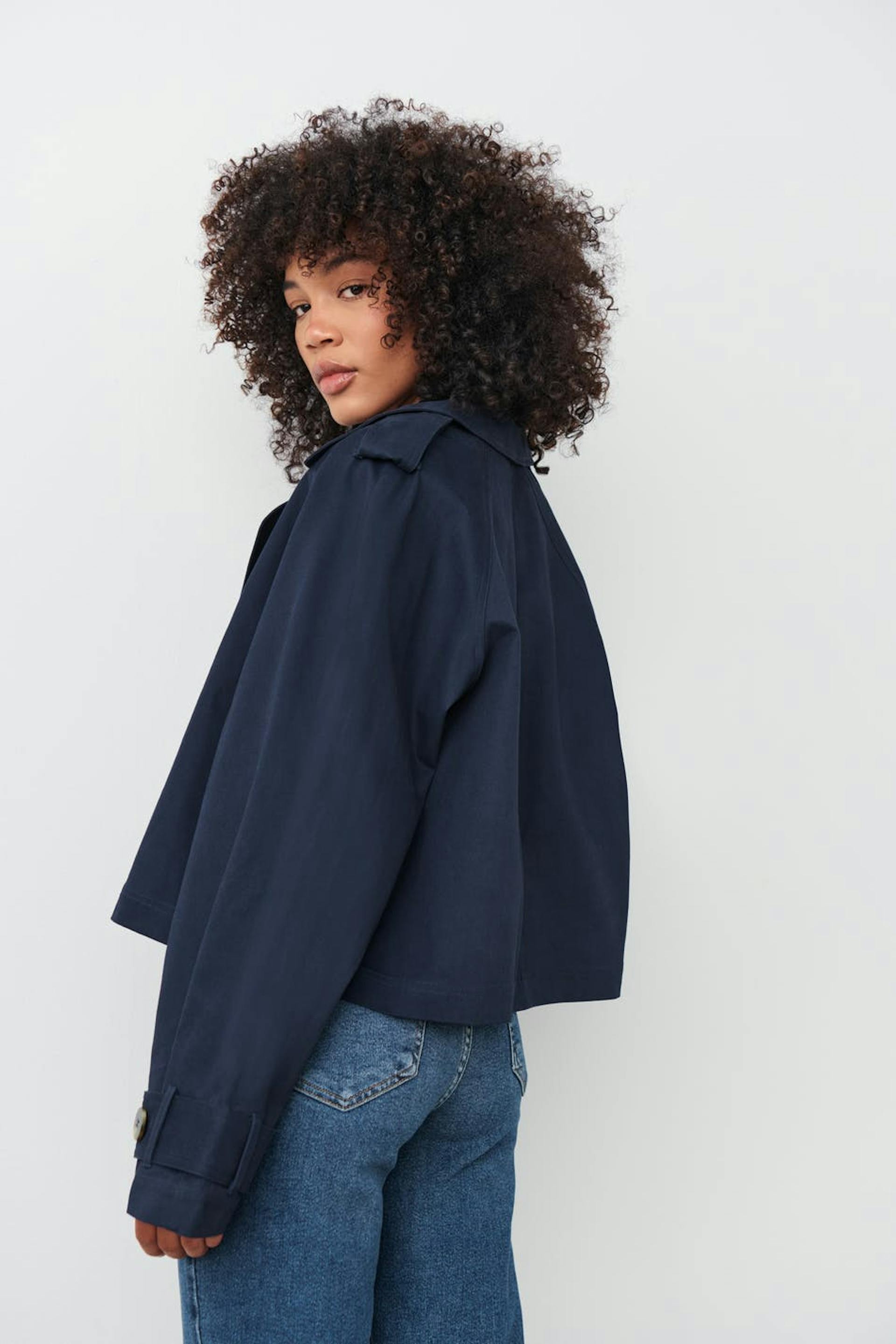 Short trenchcoat in cotton twill with relaxed fit. The coat is navy and has double button closure at the front. It has collar with lapel, shoulder tabs and adjustable tab with buttons at sleeve ends.