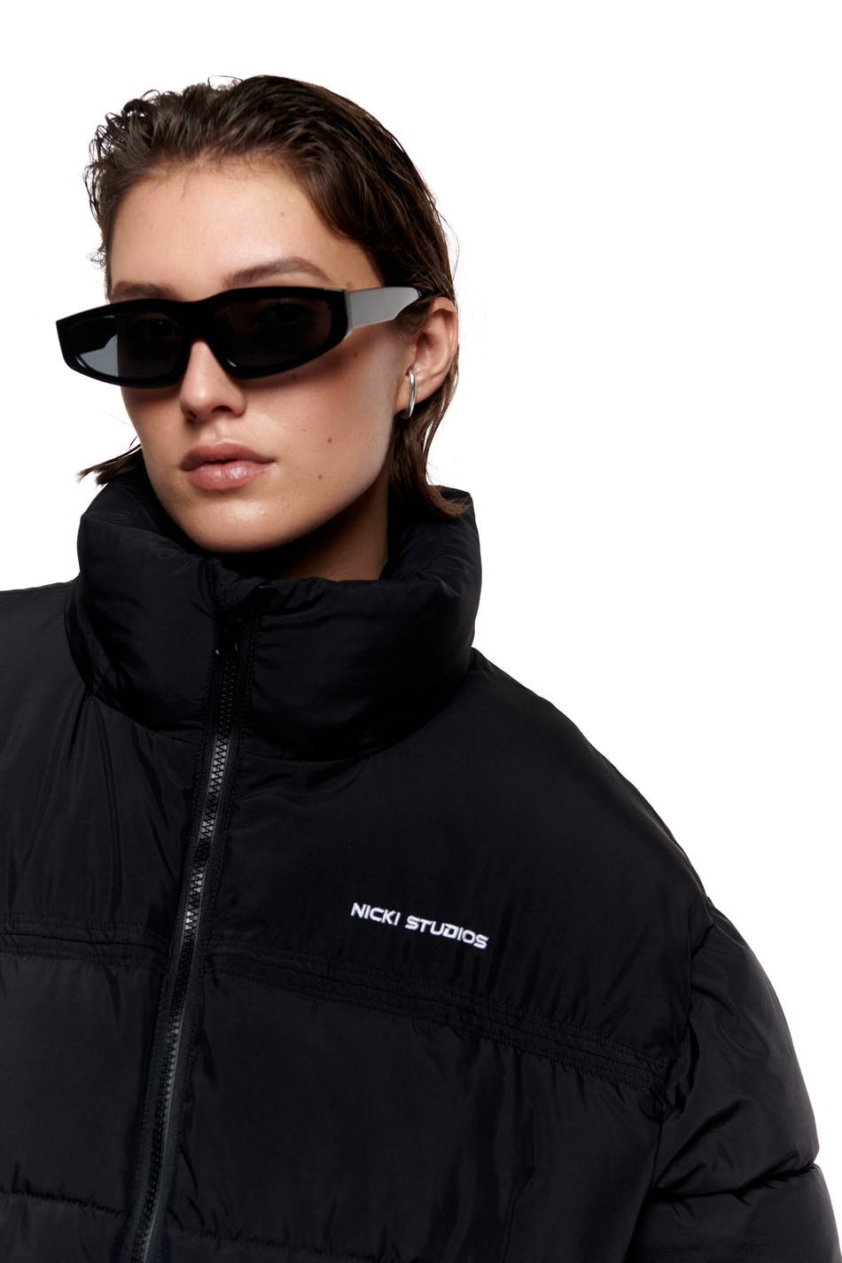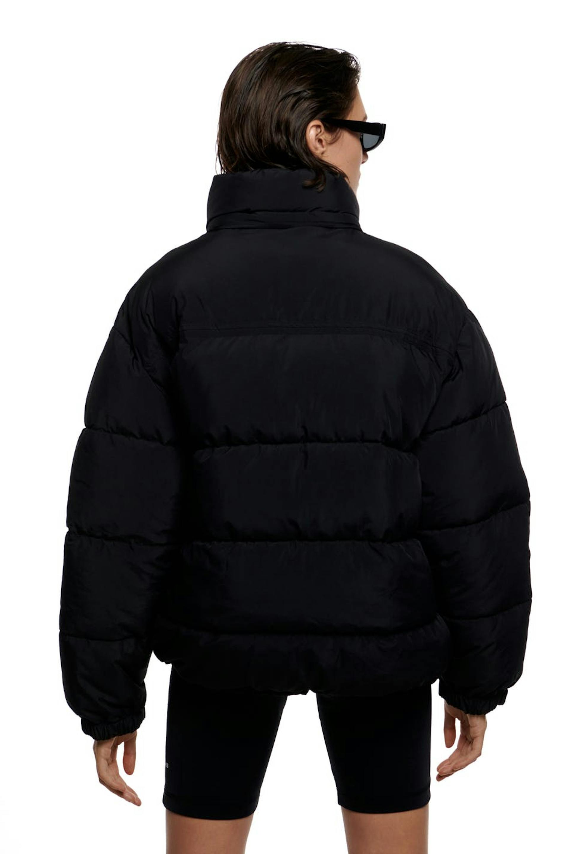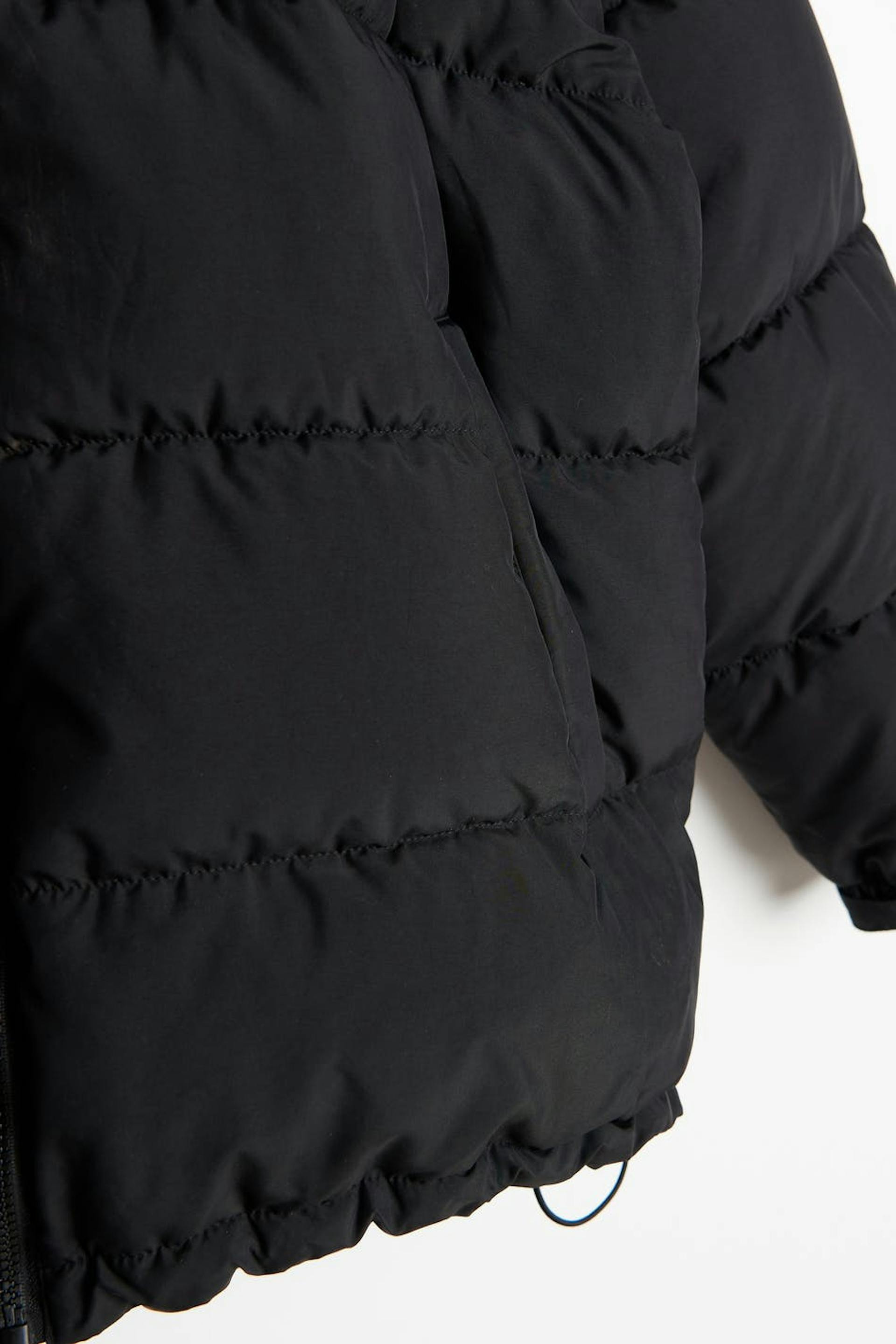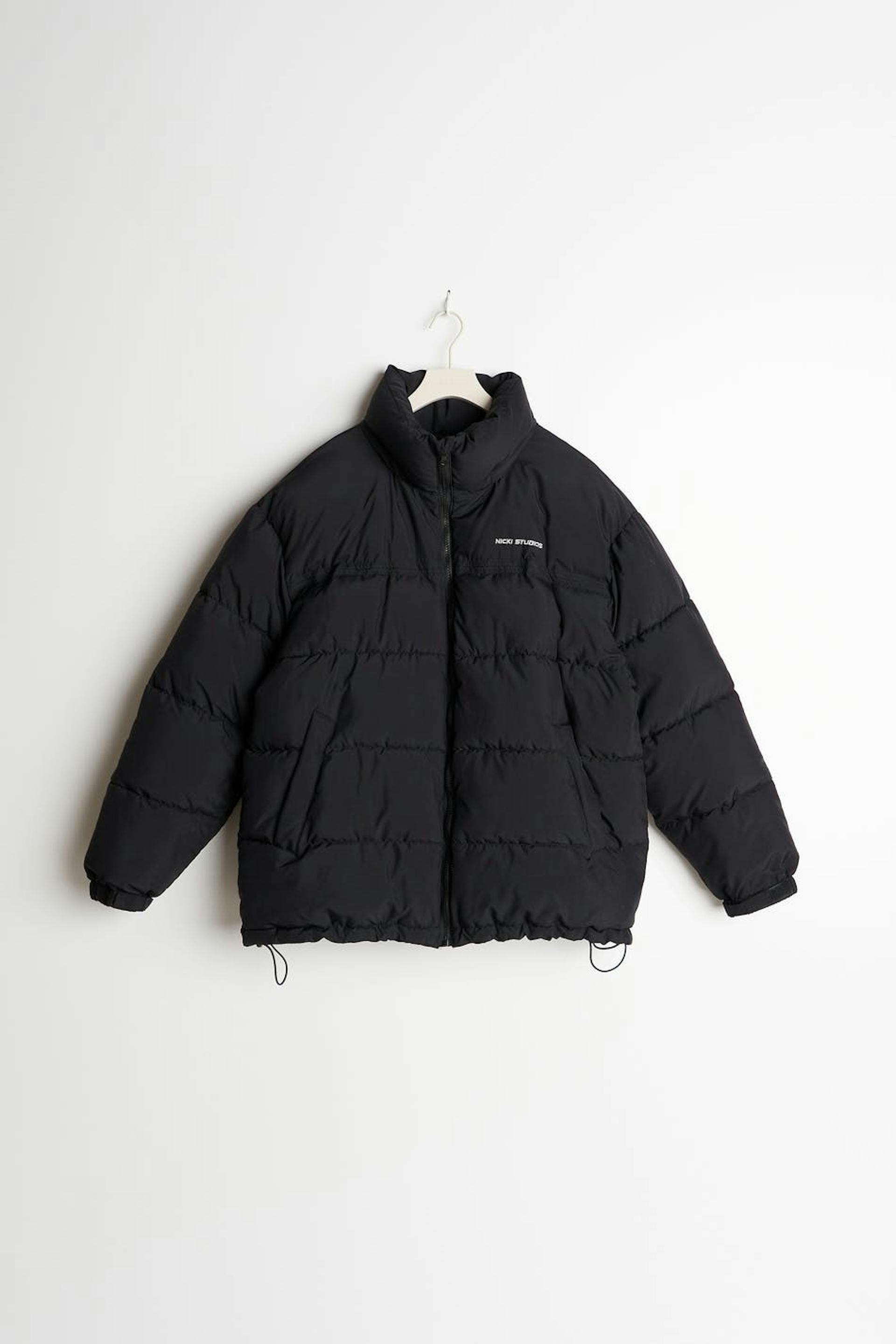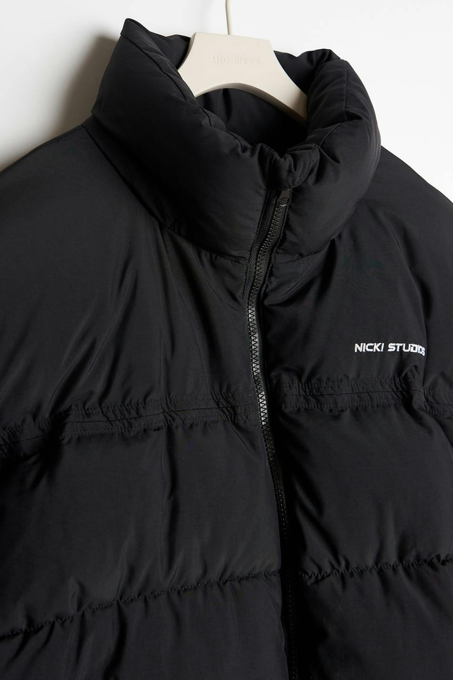 Nicki Studios X Gina Tricot. Short puffer jacket with an oversize fit. The jacket is padded, black and lined. It has brand embroidery on the chest, pockets on the sides, zip closure in front, an elasticized drawstring at the bottom hem, a hidden hood inside the collar and elasticized cuffs with velcro strap.