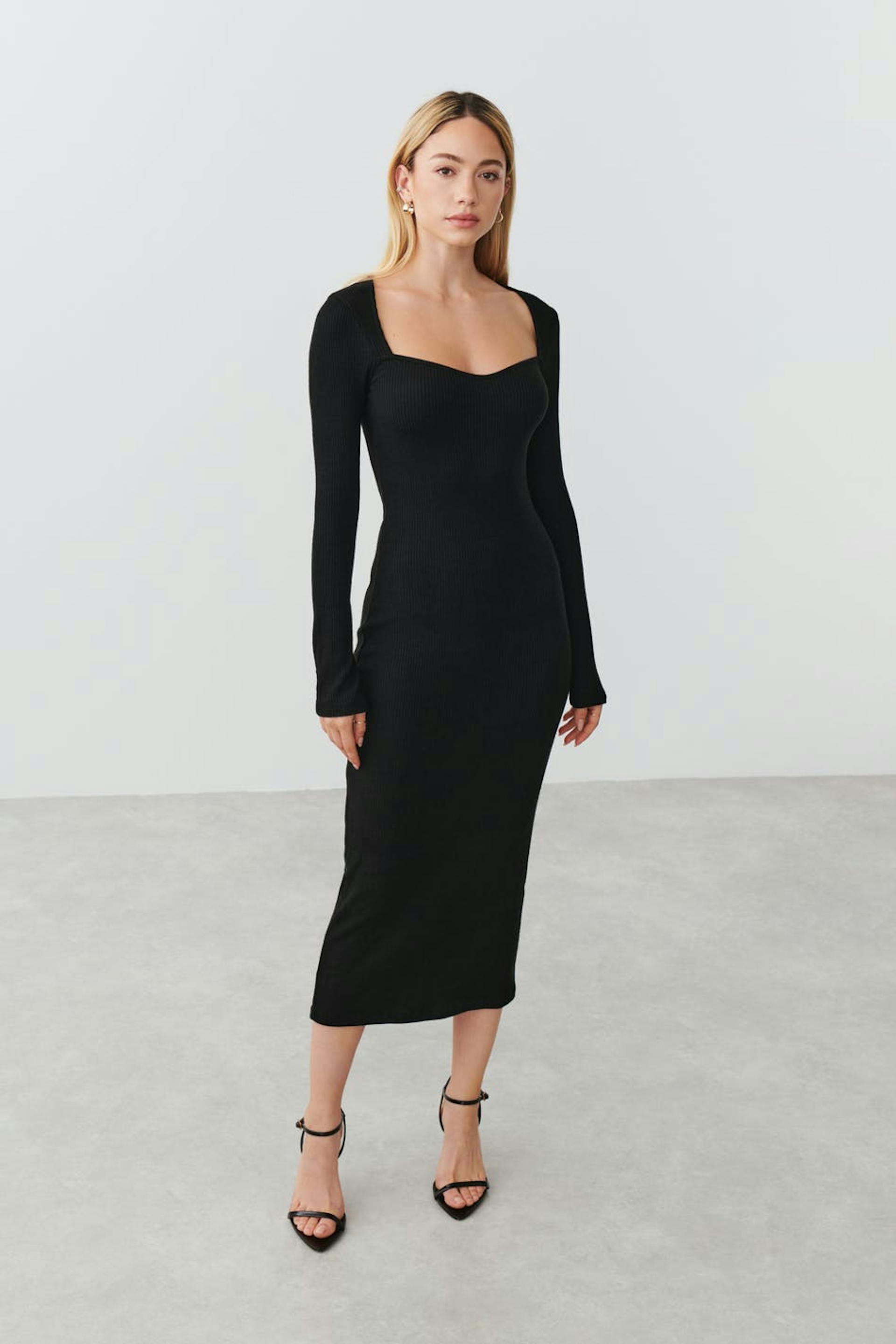 Ribbed dress in jersey with long sleeves. The dress is black and has a heart-shaped neckline. It has a slit at the side.