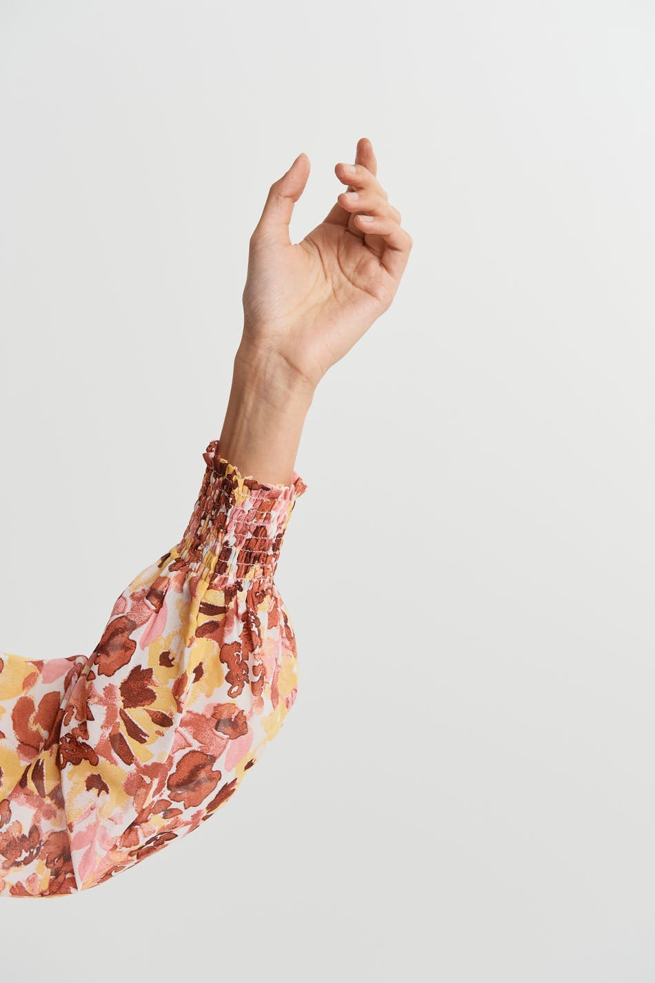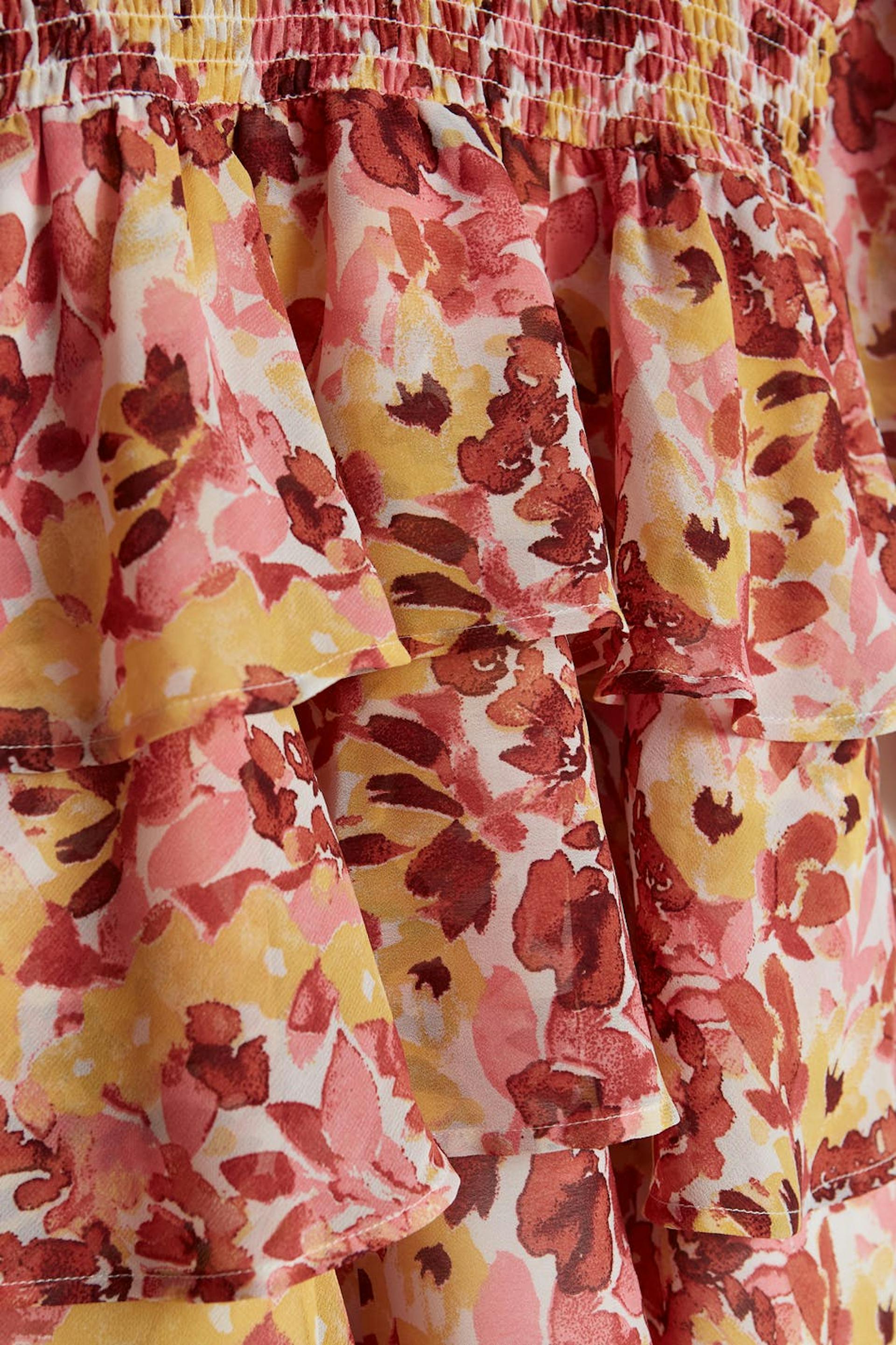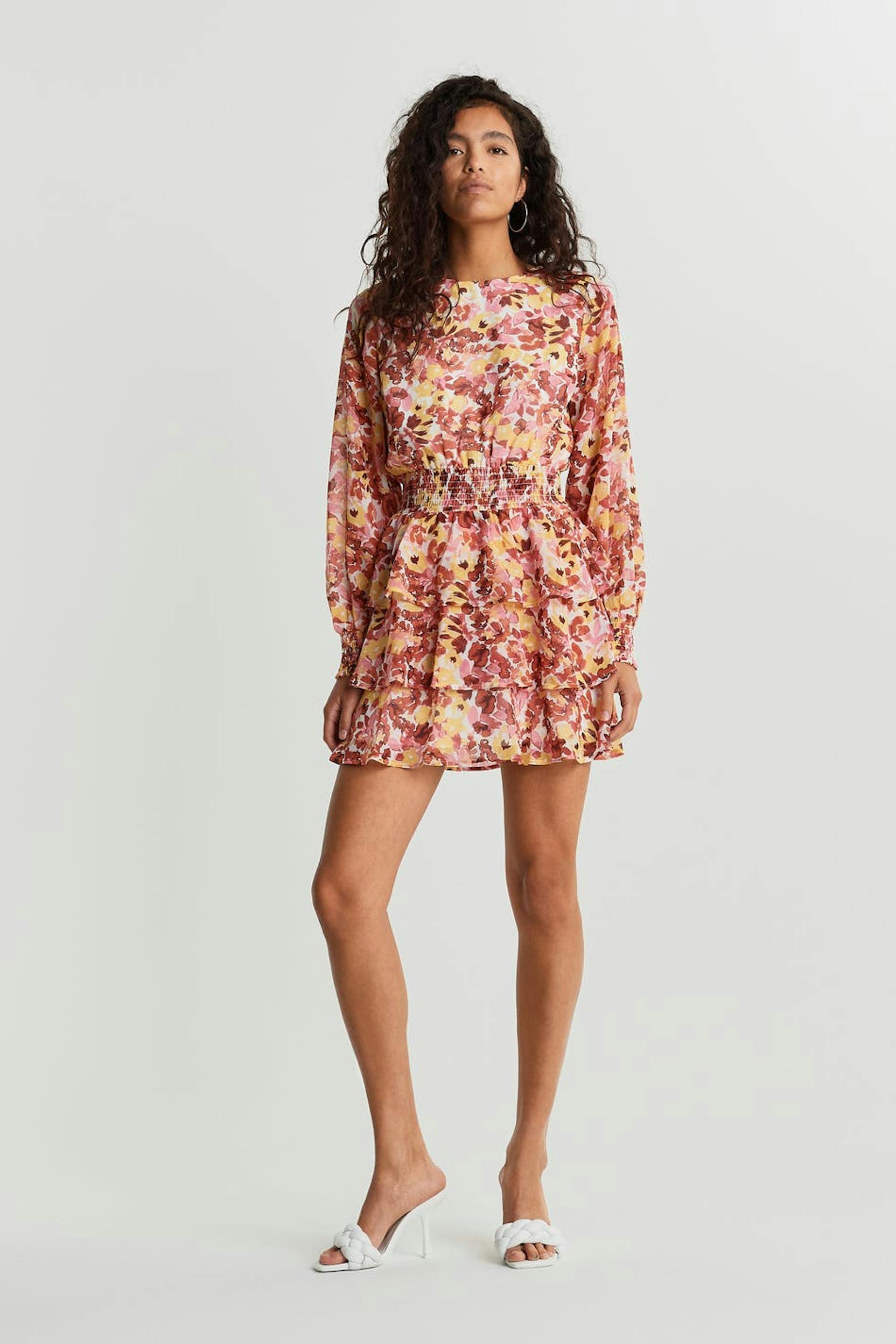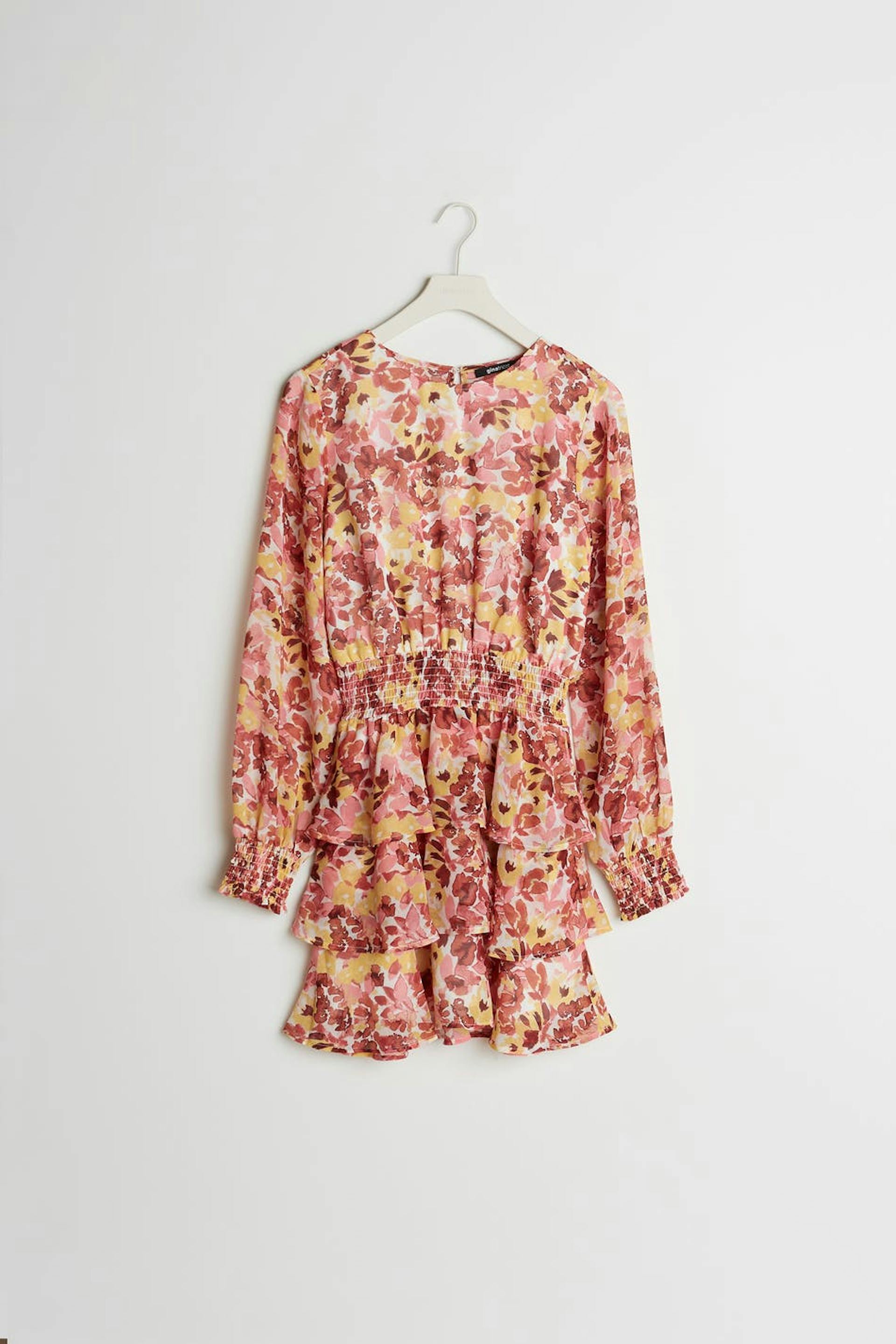 Dress with a flower pattern and a frill skirt. The dress is long-sleeved and has a detail with smocking at the waist and on the sleeve ends. It is made of chiffon and has a button at the neck.